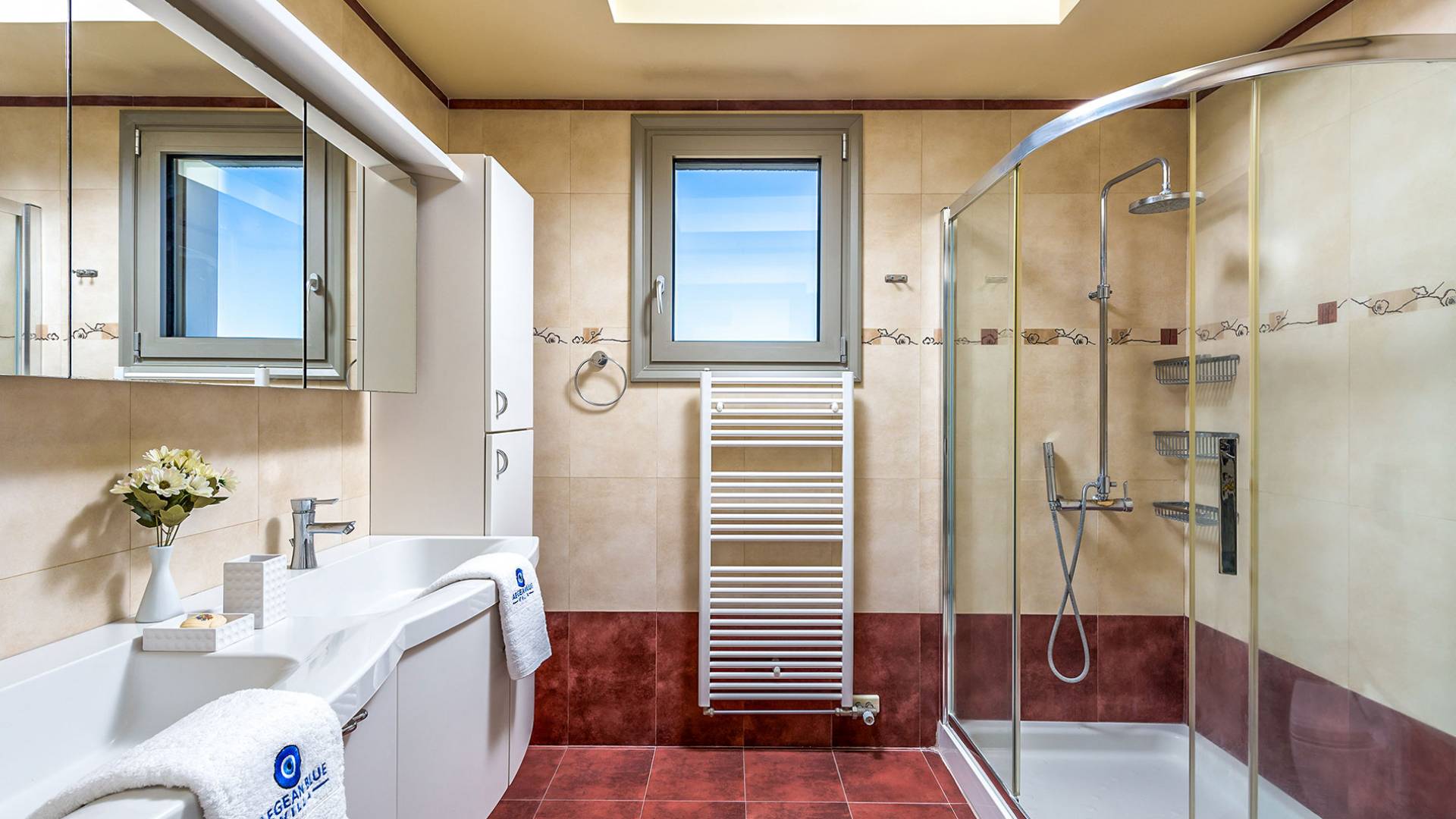 Στον δεύτερο όροφο θα βρείτε το δεύτερο κύριο υπνοδωμάτιο με κρεβάτι king size (1,80μ.) και μπάνιο με ντους, συμπεριλαμβανομένου ενός μίνι μπαρ για να διατηρείτε ανά πάσα στιγμή κρύο νερό και φρούτα. Στον ίδιο όροφο υπάρχει ένα πλυντήριο, το οποίο περιλαμβάνει ντουλάπες και όλες τις απαραίτητες ανέσεις, όπως πλυντήριο και στεγνωτήριο. Αυτή η νέα βίλα είναι μια απόλαυση αισθήσεων. Η πόλη και η θέα στη θάλασσα είναι απεριόριστη και μπορείτε να την απολαύσετε τόσο μέσα όσο και έξω από το σπίτι. Η Aegean Blue Villa είναι η τέλεια επιλογή για οικογένειες και παρέες, που αναζητούν μια ιδιωτική, ξεκούραστη αλλά συναρπαστική διαμονή στο όμορφο νησί της Ρόδου.