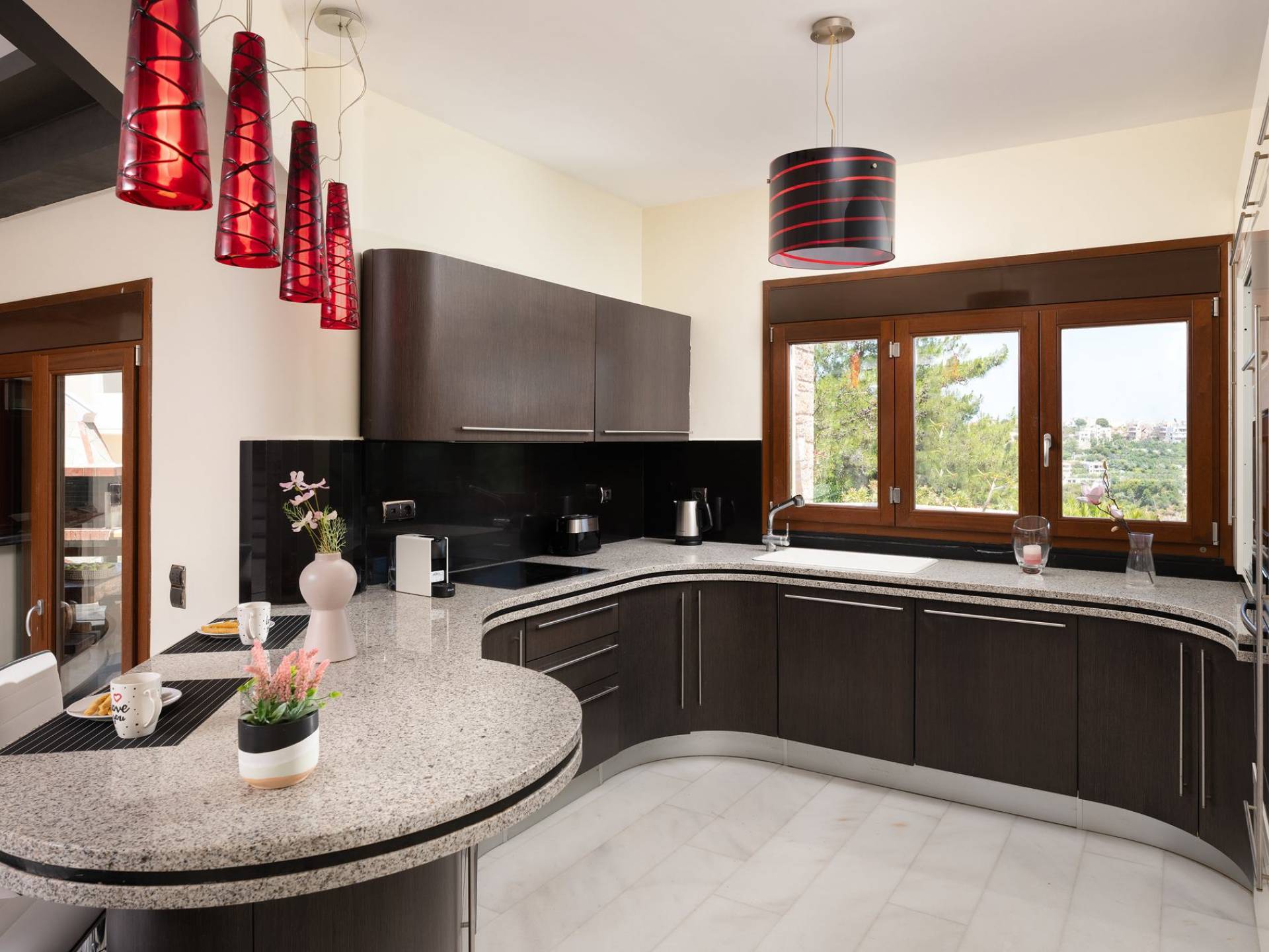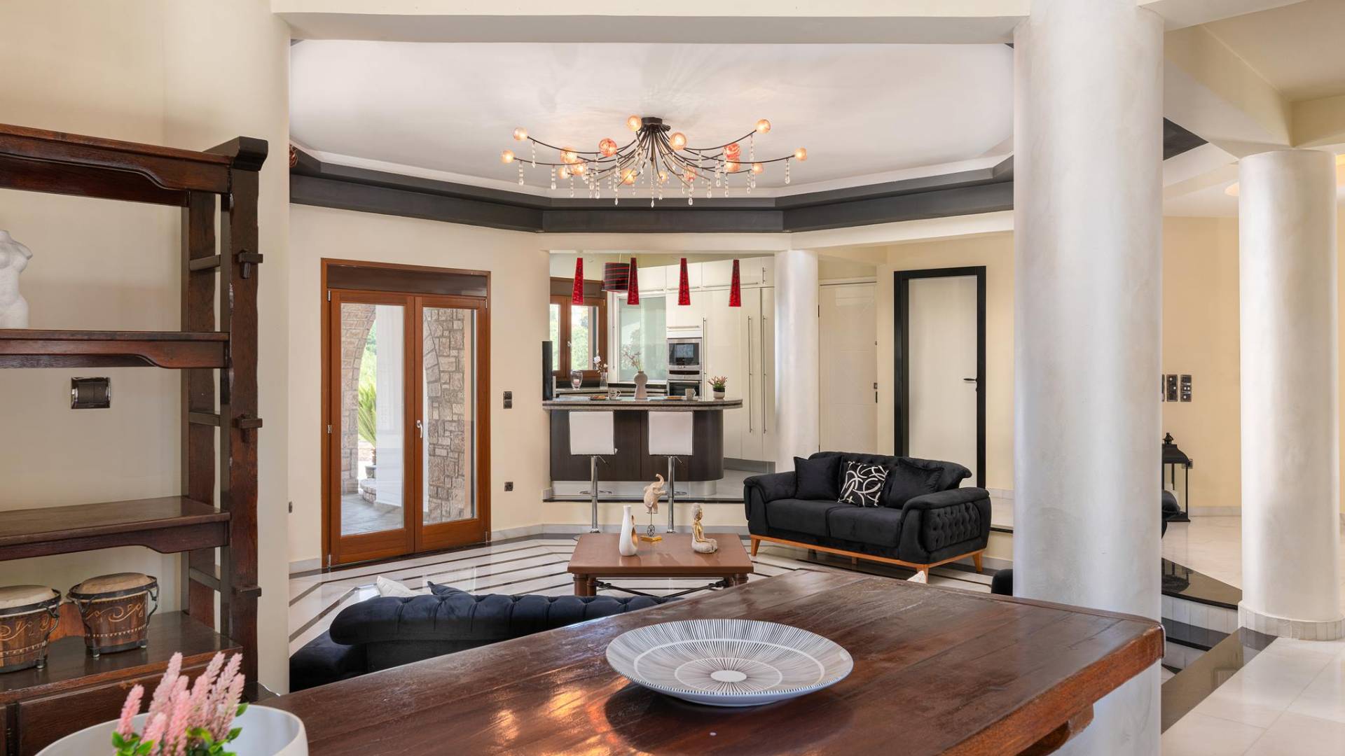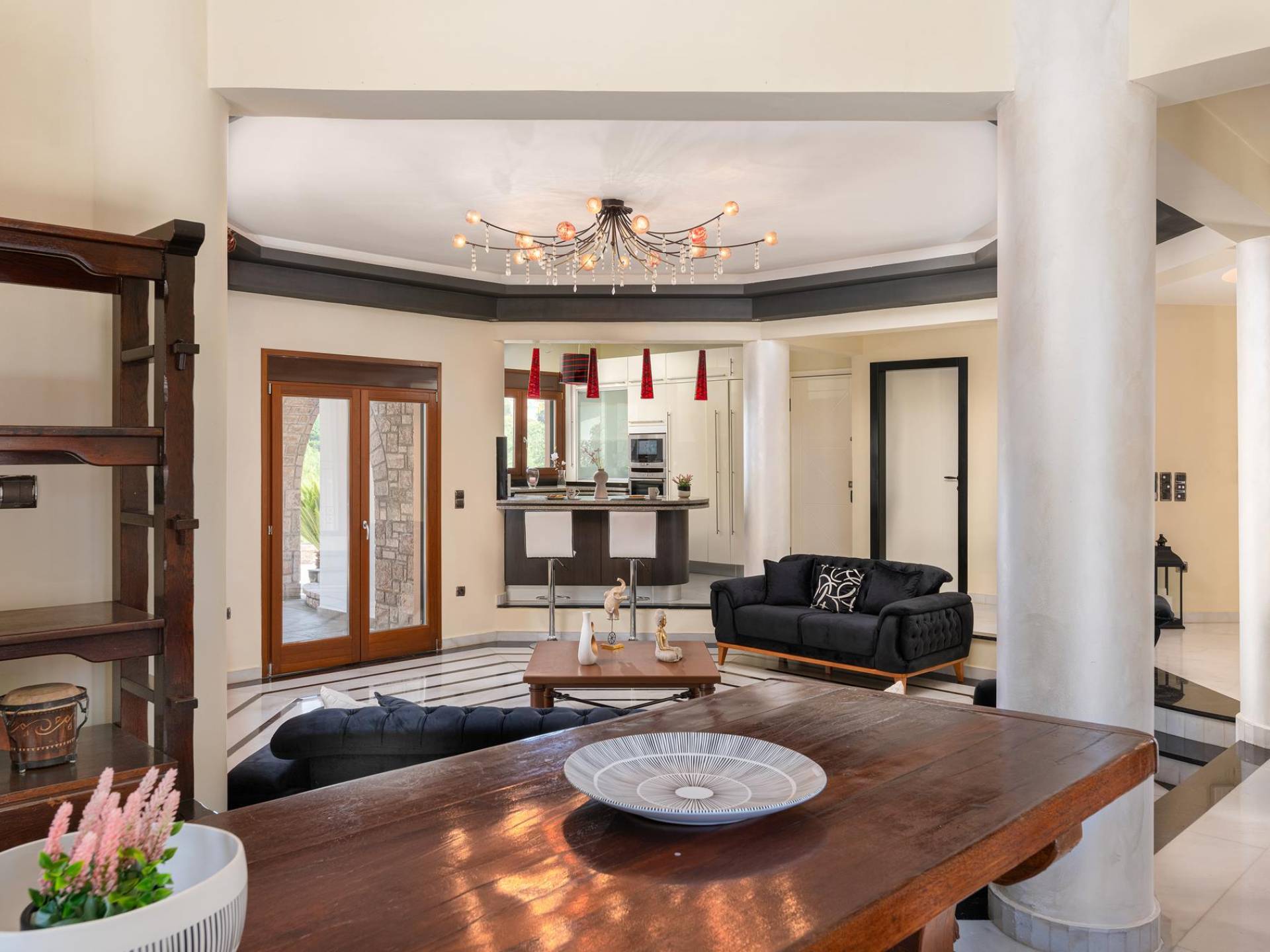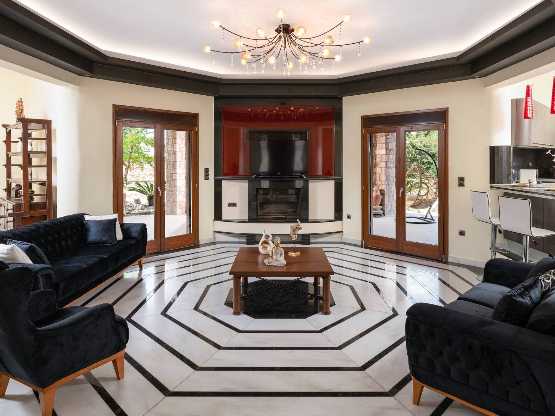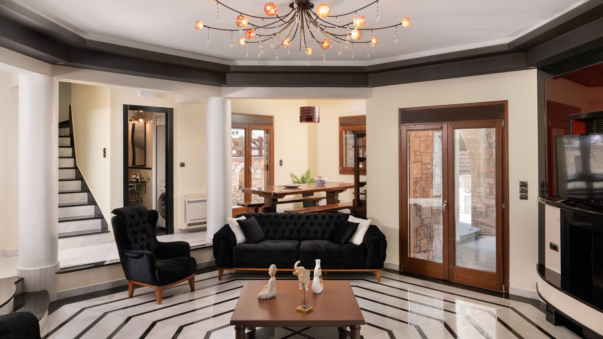 Η Villa Nefeli διαθέτει ένα φιλόξενο, οικείο καθιστικό με ανοιχτό σχέδιο, συμπεριλαμβανομένης μιας κουζίνας, τραπεζαρίας και σαλόνι. Αυτή η διάταξη δημιουργεί μια κοινωνική ατμόσφαιρα, ιδανική για να απολαύσετε χρόνο μαζί κατά τη διάρκεια της διαμονής σας. Ο χώρος αισθάνεται ελαφρύ και ευάερο, με ένα γοητευτικό μαρμάρινο τζάκι, μεγάλους καναπέδες, τηλεόραση επίπεδης οθόνης και τραπεζαρία με καρέκλες. Η σύγχρονη κουζίνα είναι πλήρως εξοπλισμένη για να προετοιμάσει νόστιμα ελληνικά γεύματα, με ένα μεγάλο παράθυρο που προσφέρει θέα στους γύρω λόφους και το χωριό Koskinou.