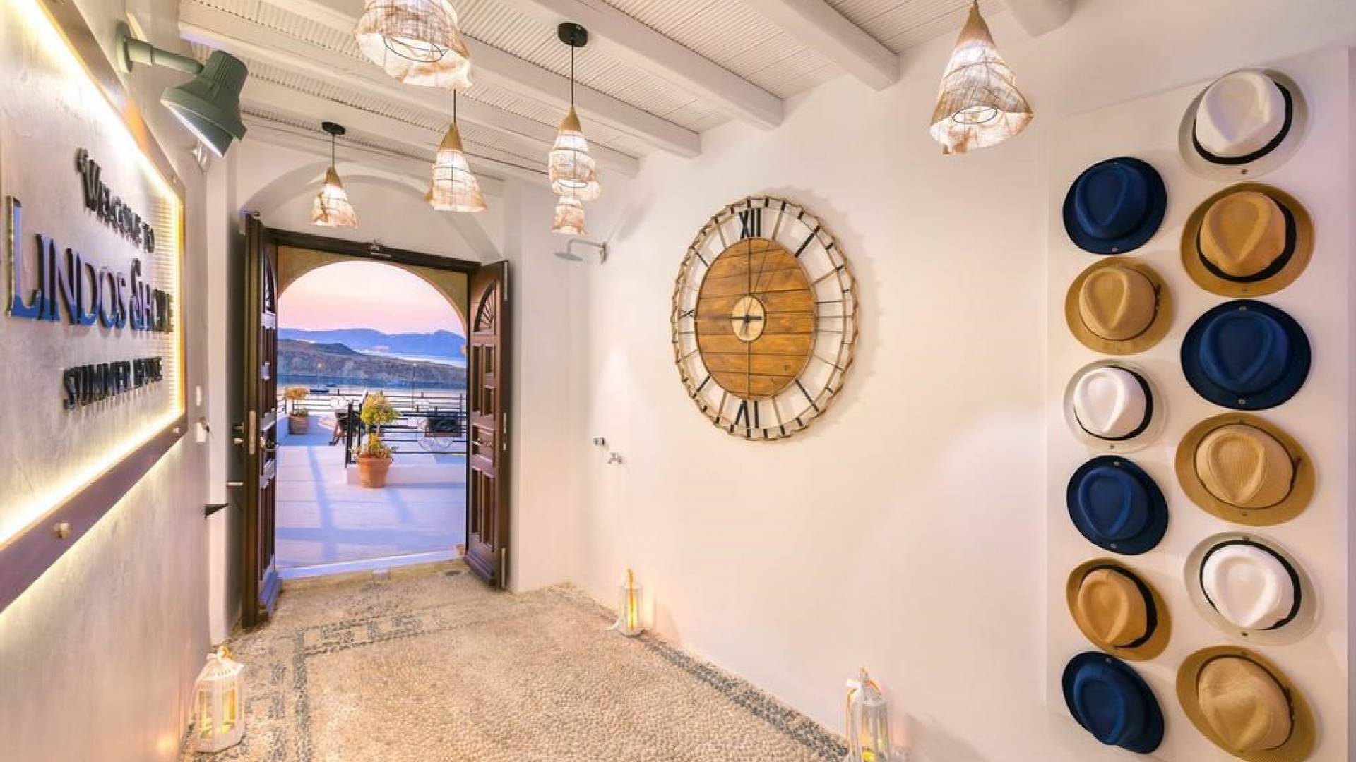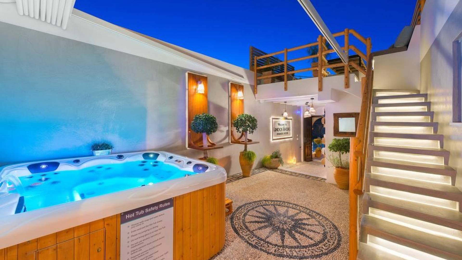 Εξωτερικά υπάρχει μια ασβεστολιθική μεγάλη πόρτα. Καθώς μπαίνετε στη βίλα, υπάρχει μια μαγευτική είσοδος που οδηγεί στην ευρύχωρη κύρια λινδιακή βοτσαλωτή αυλή με ένα μεγάλο πενταθέσιο τζακούζι και πίδακες υδρομασάζ, ένα εξωτερικό ντους και ένα αυτόματο θόλο ανοίγματος-κλεισίματος με τηλεχειριστήριο. Το Entrance Level διαθέτει μια πλήρως εξοπλισμένη κουζίνα τελευταίας τεχνολογίας στα αριστερά σας, ένα μικρό καθιστικό στα δεξιά σας με έναν καναπέ που μπορεί να φιλοξενήσει ένα επιπλέον άτομο, μια κυρτή τηλεόραση Samsung 40 ιντσών και ένα μπάνιο. Στο ίδιο επίπεδο υπάρχει ένα υπνοδωμάτιο king-size με ανεξάρτητη είσοδο και δικό του ιδιωτικό μπάνιο.