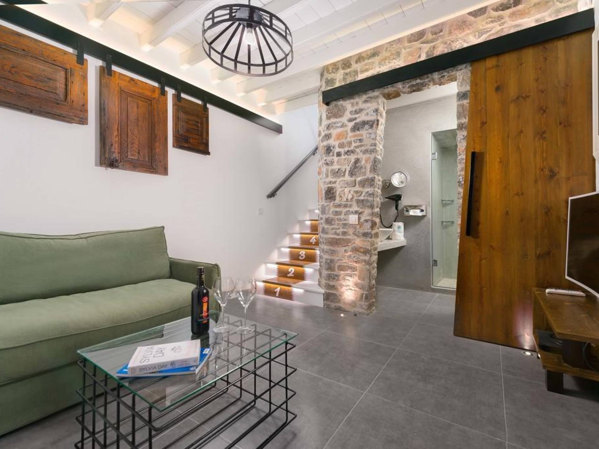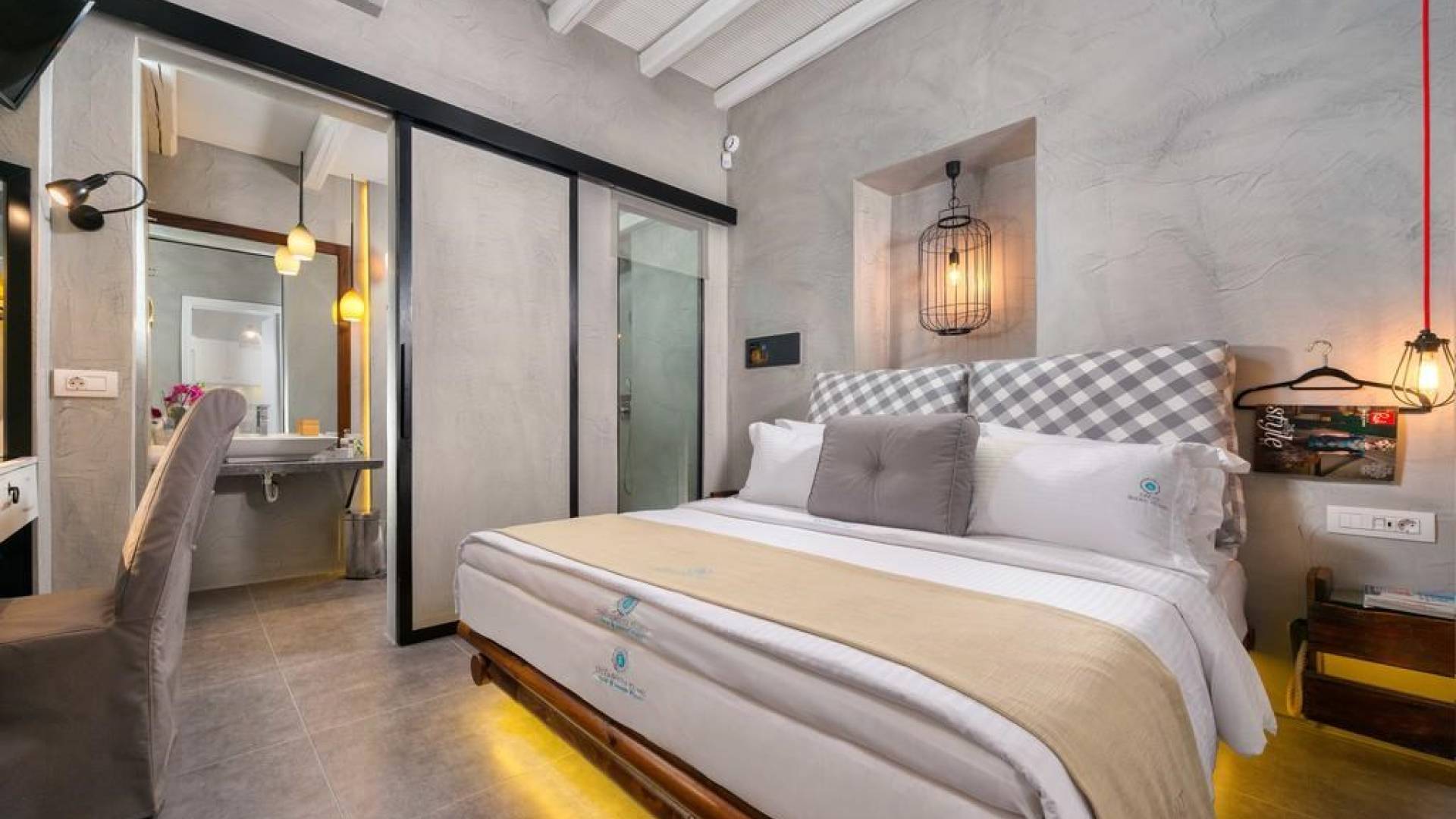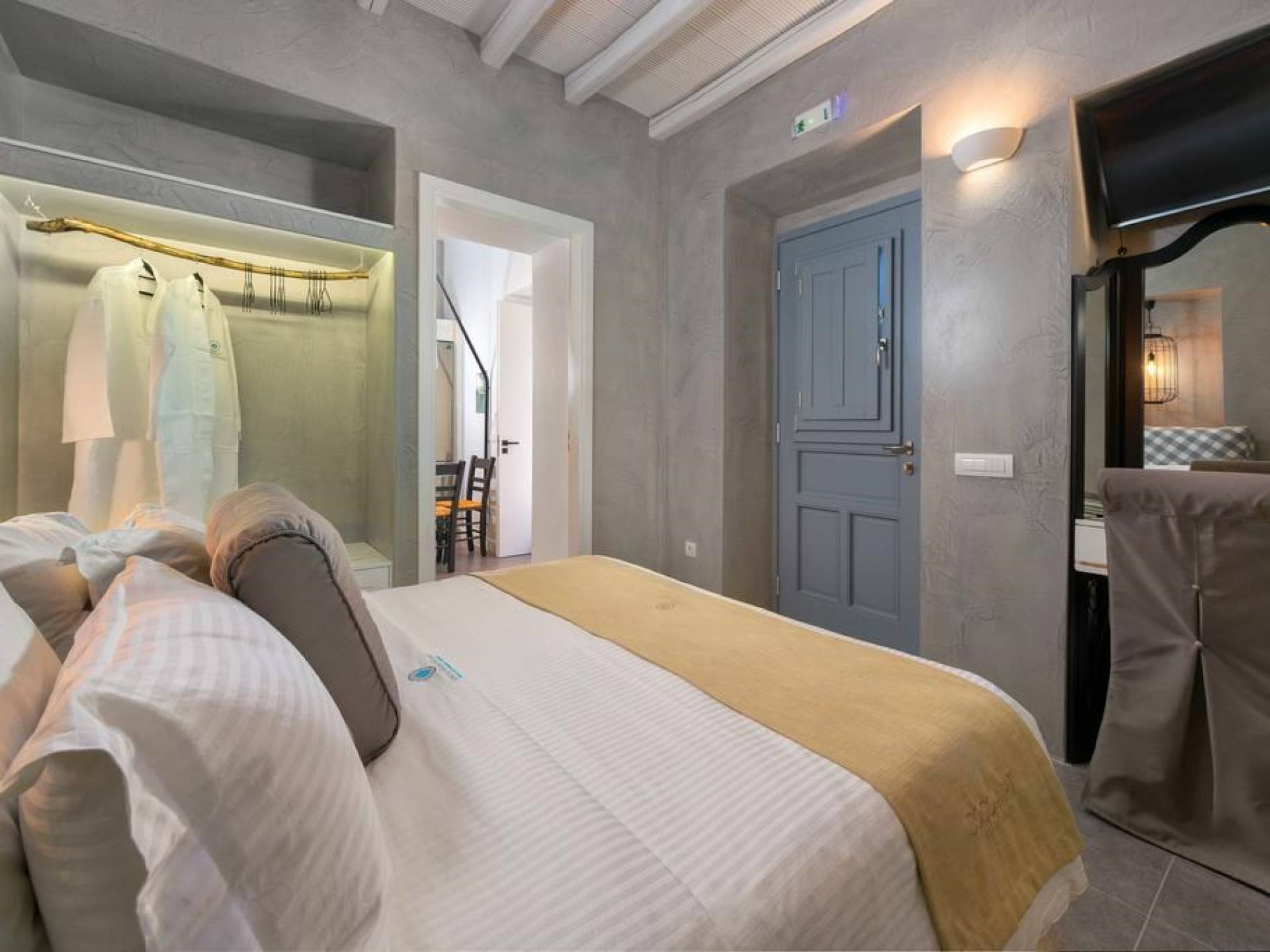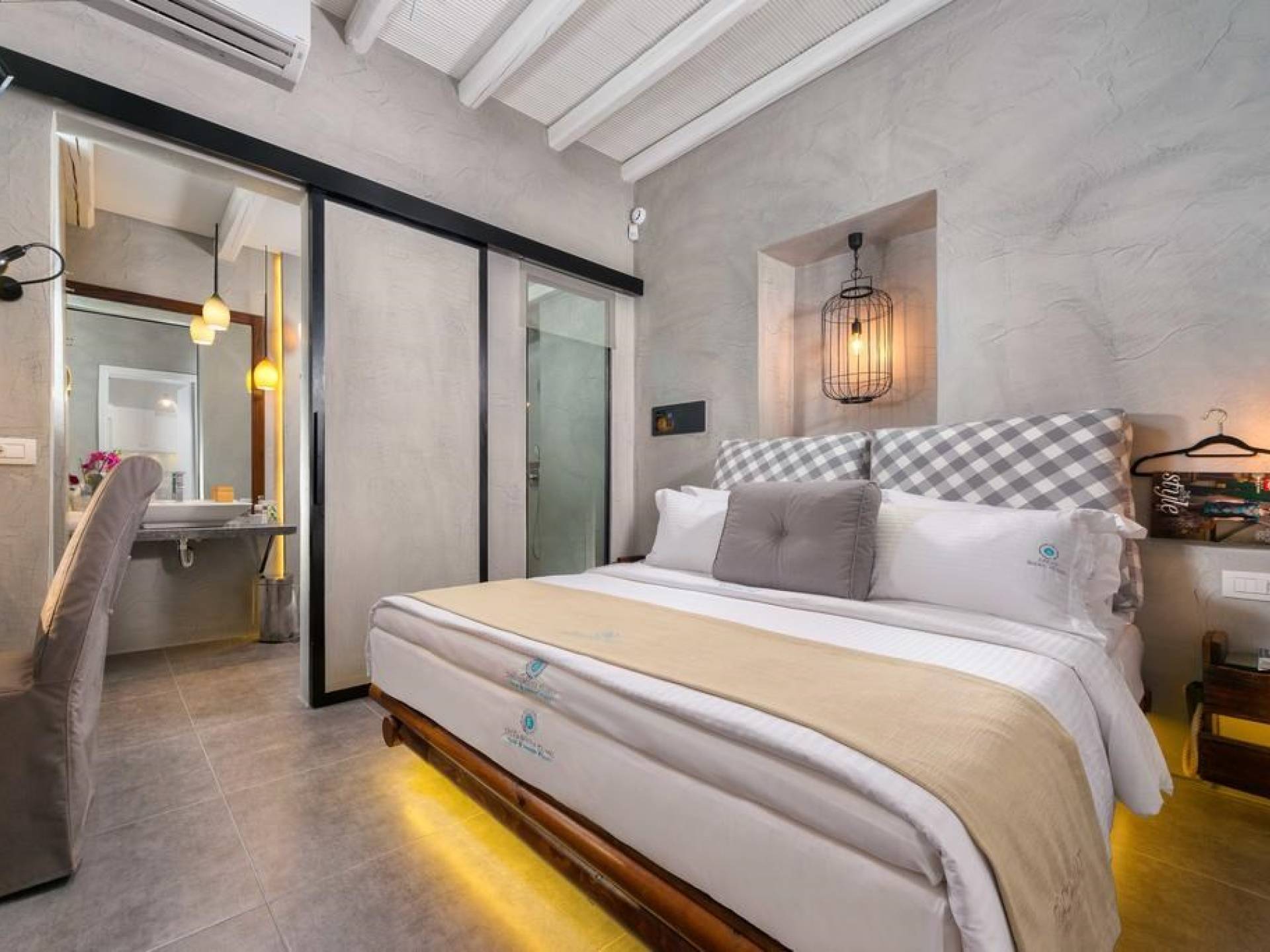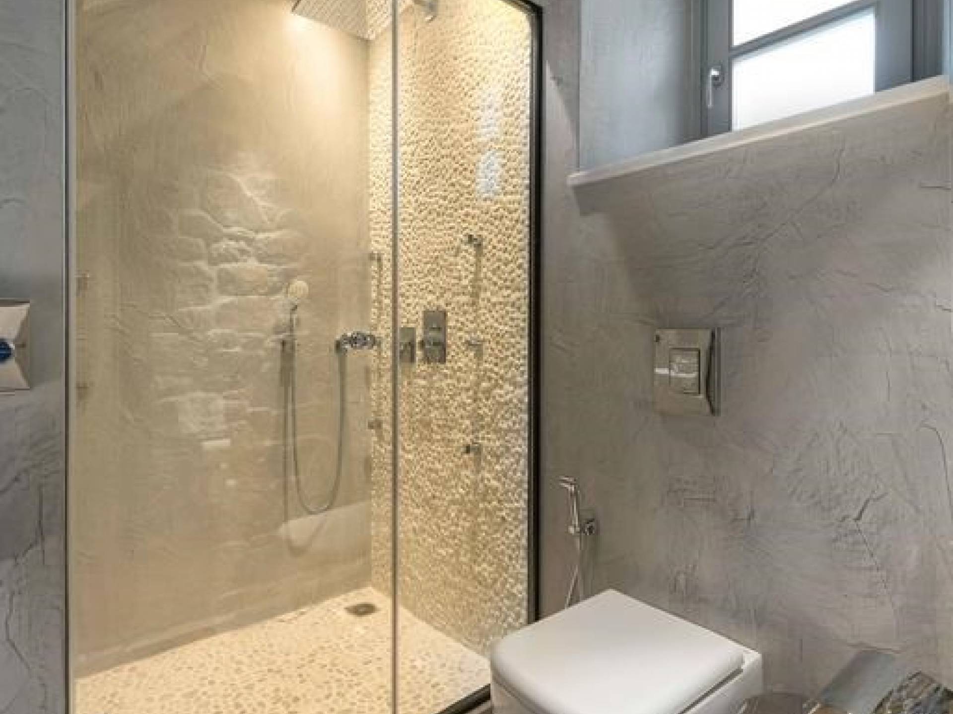 Το χτύπημα είναι τα υπέροχα μπάνια που περιλαμβάνουν μια καμπίνα ντους ελεύθερης τοποθέτησης με ένα σετ πίδακες μασάζ. Προσφέρει βιολογικά προϊόντα μπάνιου Κορρές και πολλά άλλα, όπως στεγνωτήρα μαλλιών, μαλακές βαμβακερές πετσέτες, πετσέτες θαλάσσης επίσης coco-mat. Παρέχονται επίσης μπουρνούζια και παντόφλες. Μια καταπληκτική ξύλινη σκάλα φωτισμένη από led σας οδηγεί στο επάνω επίπεδο όπου υπάρχει ένα δεύτερο μεγάλο υπνοδωμάτιο king-size με δύο παράθυρα με θέα στη θάλασσα και ένα μίνι μπαρ.