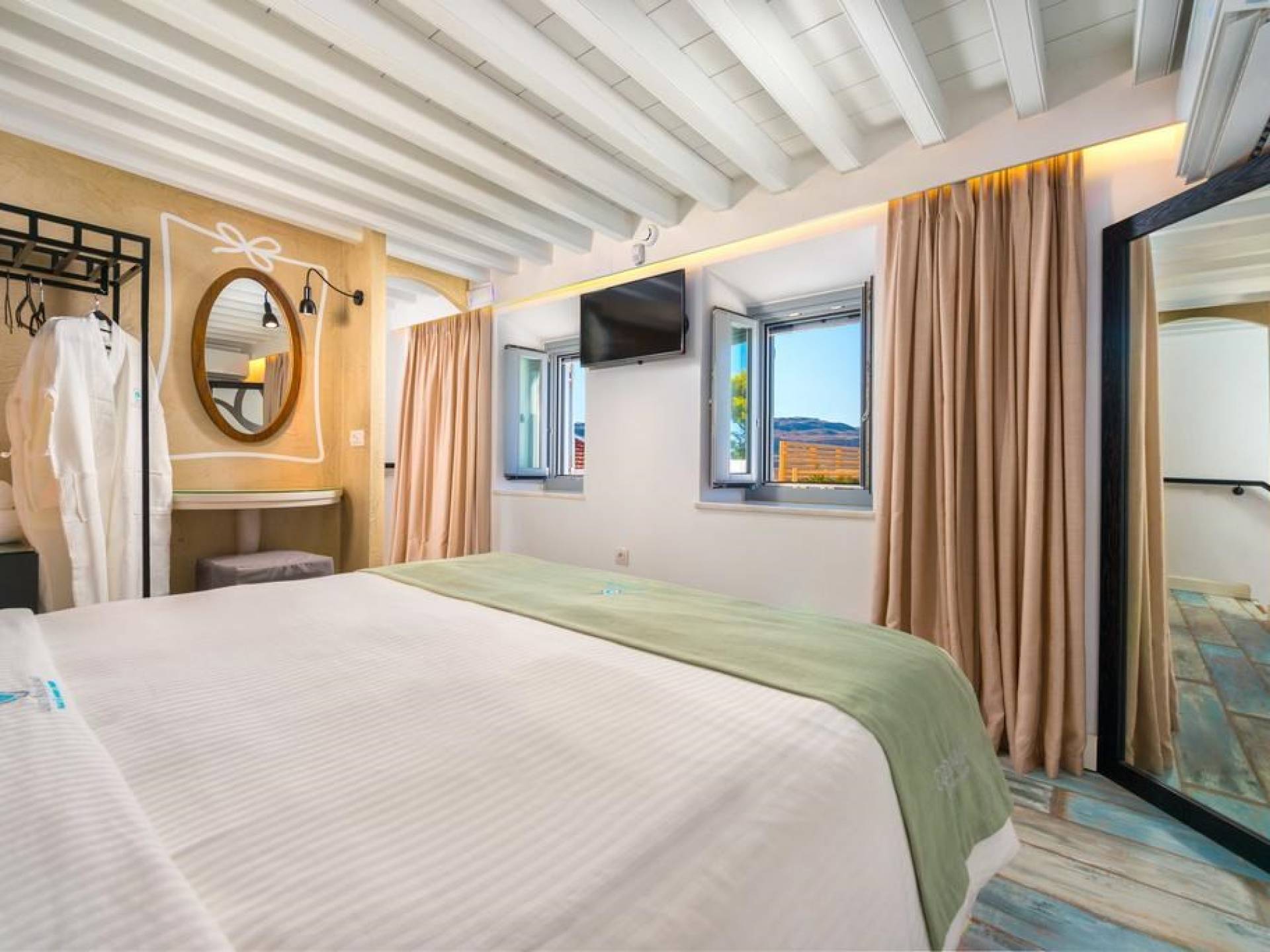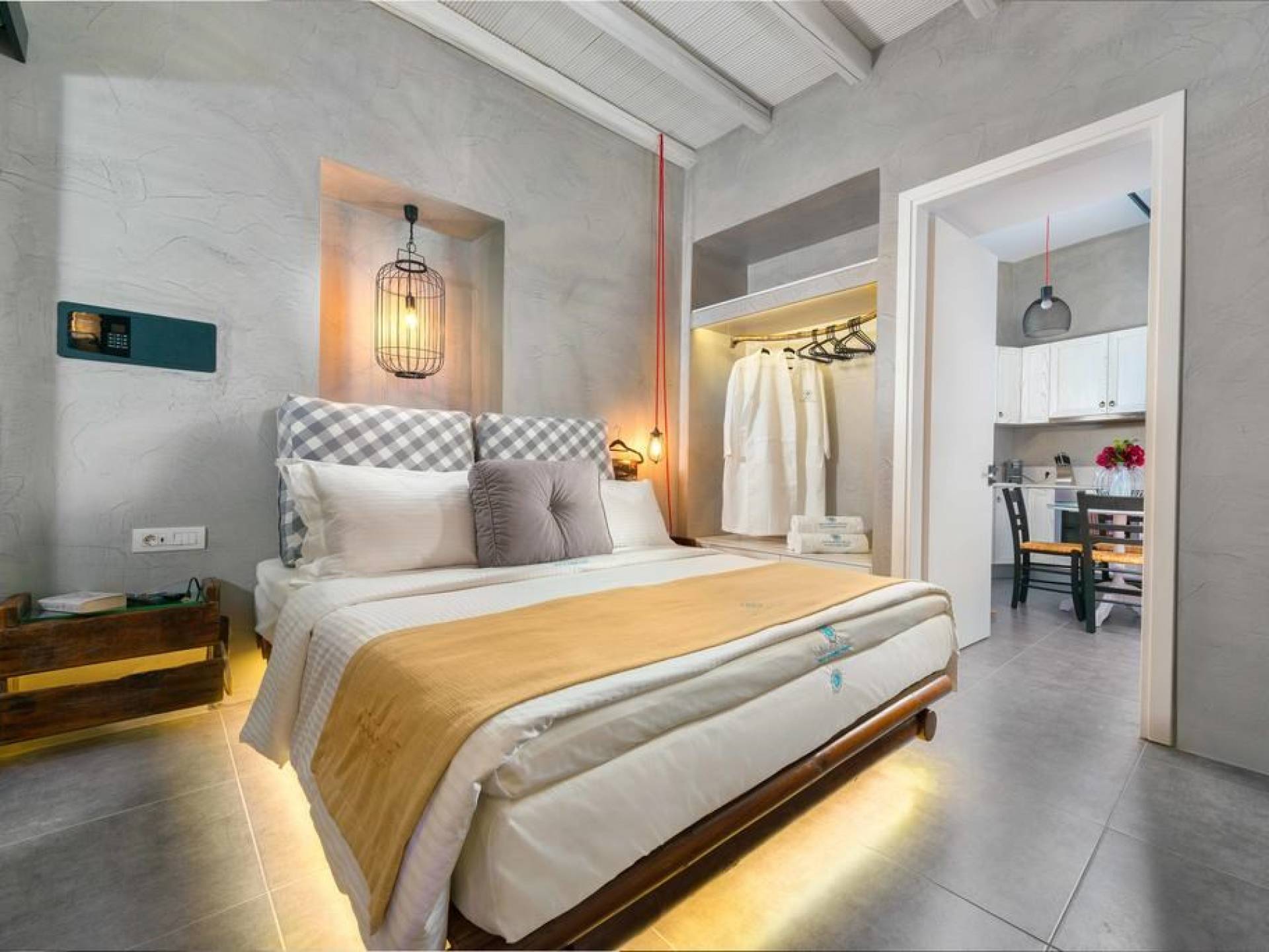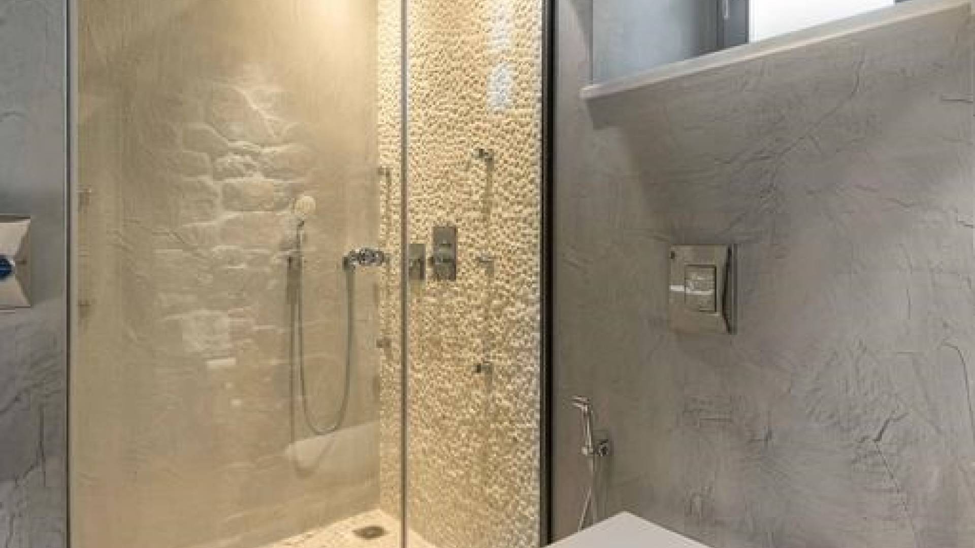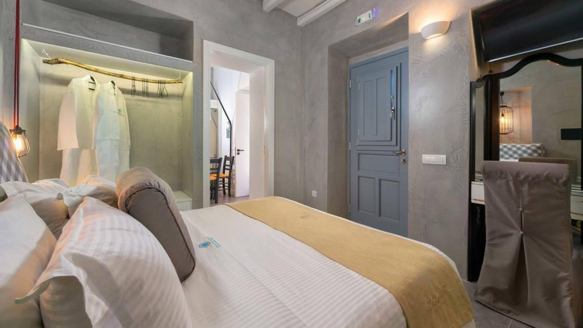 Το χτύπημα είναι τα υπέροχα μπάνια που περιλαμβάνουν μια καμπίνα ντους ελεύθερης τοποθέτησης με ένα σετ πίδακες μασάζ. Προσφέρει βιολογικά προϊόντα μπάνιου Κορρές και πολλά άλλα, όπως στεγνωτήρα μαλλιών, μαλακές βαμβακερές πετσέτες, πετσέτες θαλάσσης επίσης coco-mat. Παρέχονται επίσης μπουρνούζια και παντόφλες. Μια καταπληκτική ξύλινη σκάλα φωτισμένη από led σας οδηγεί στο επάνω επίπεδο όπου υπάρχει ένα δεύτερο μεγάλο υπνοδωμάτιο king-size με δύο παράθυρα με θέα στη θάλασσα και ένα μίνι μπαρ.