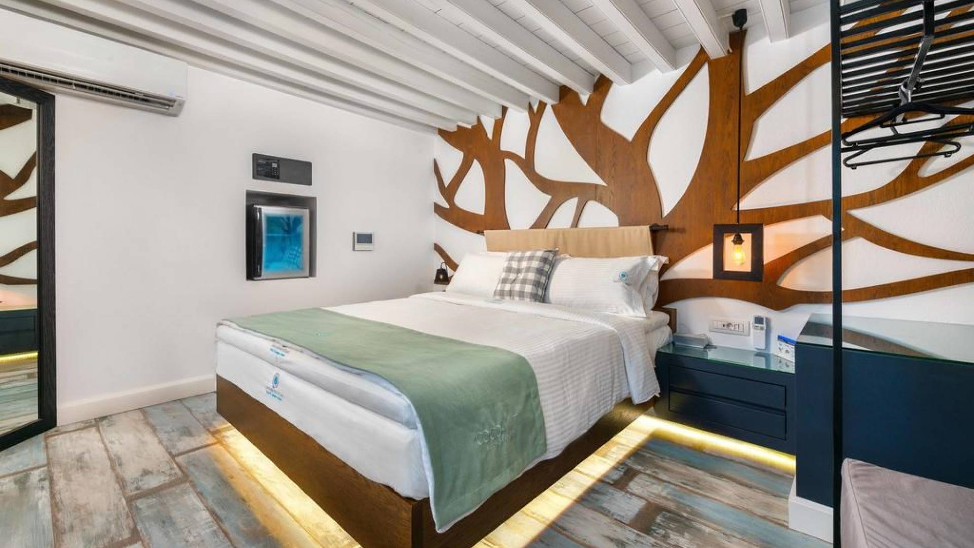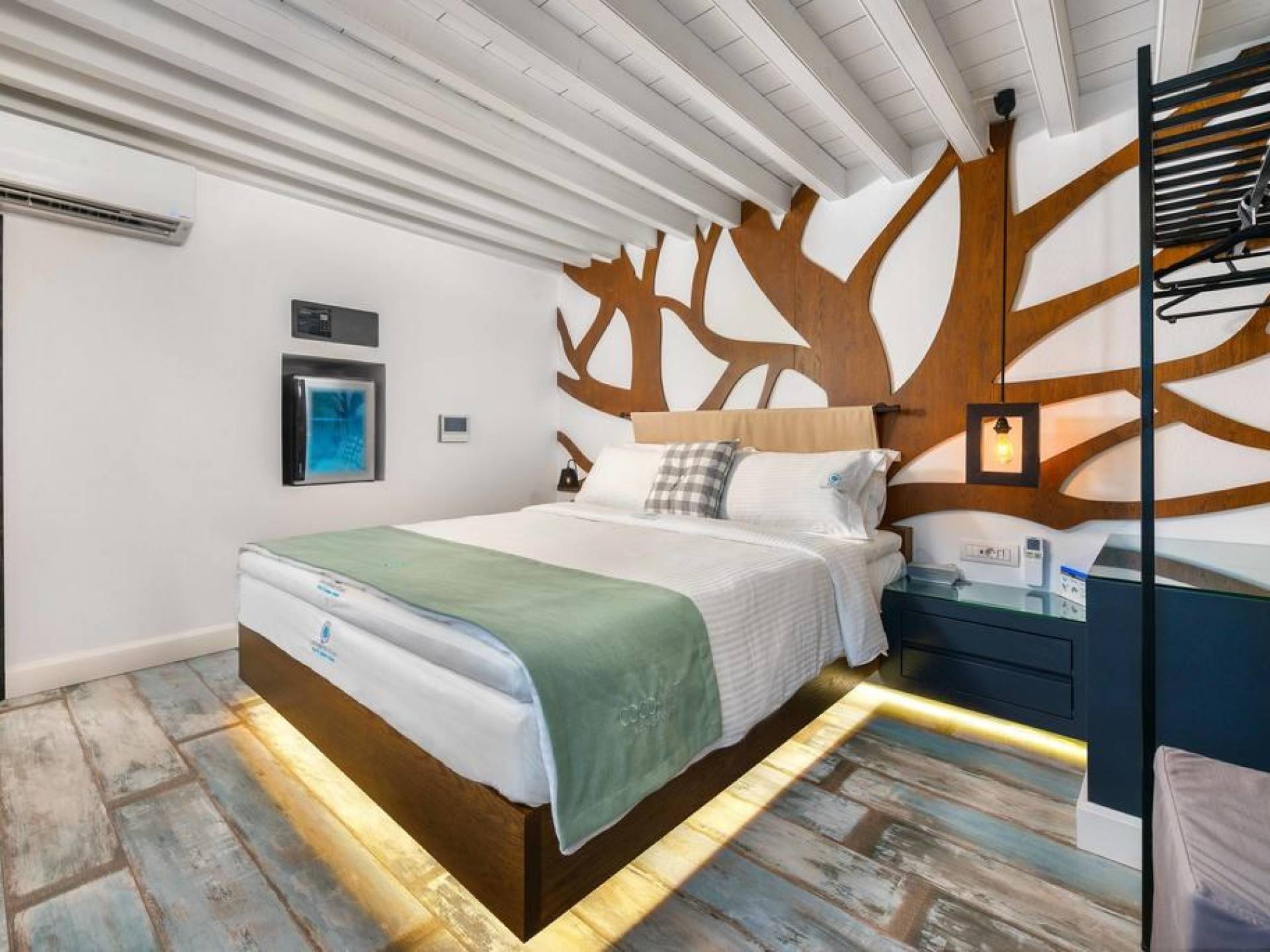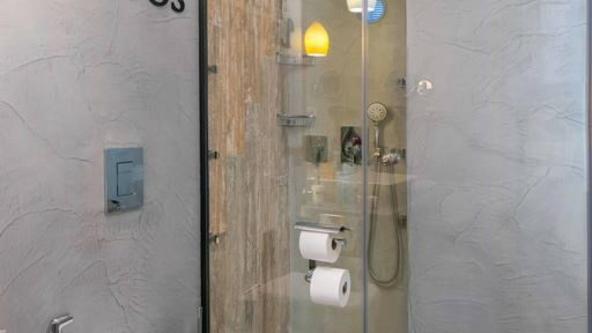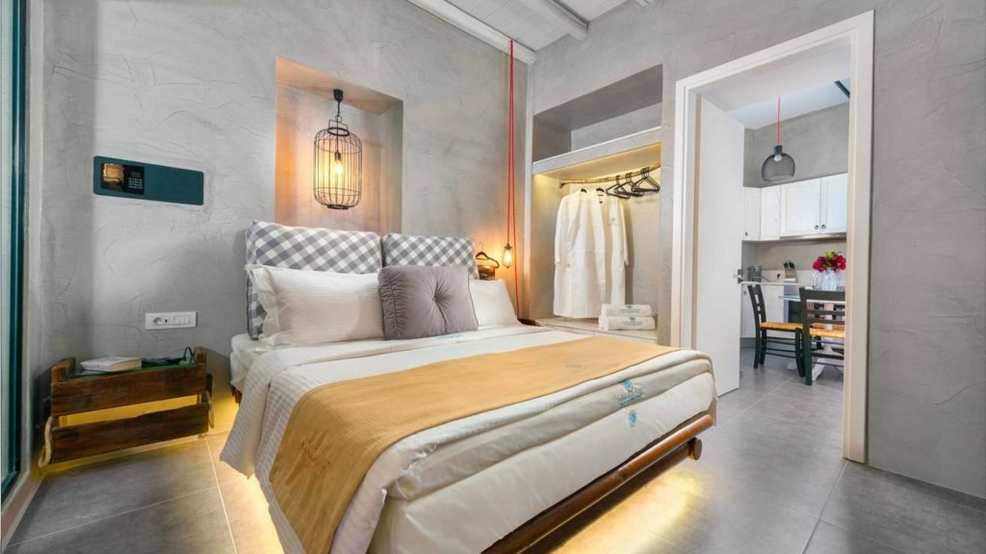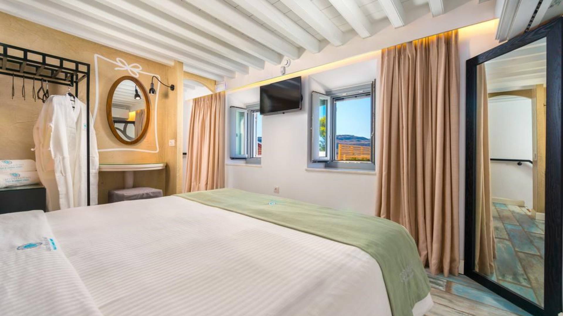Το χτύπημα είναι τα υπέροχα μπάνια που περιλαμβάνουν μια καμπίνα ντους ελεύθερης τοποθέτησης με ένα σετ πίδακες μασάζ. Προσφέρει βιολογικά προϊόντα μπάνιου Κορρές και πολλά άλλα, όπως στεγνωτήρα μαλλιών, μαλακές βαμβακερές πετσέτες, πετσέτες θαλάσσης επίσης coco-mat. Παρέχονται επίσης μπουρνούζια και παντόφλες. Μια καταπληκτική ξύλινη σκάλα φωτισμένη από led σας οδηγεί στο επάνω επίπεδο όπου υπάρχει ένα δεύτερο μεγάλο υπνοδωμάτιο king-size με δύο παράθυρα με θέα στη θάλασσα και ένα μίνι μπαρ.