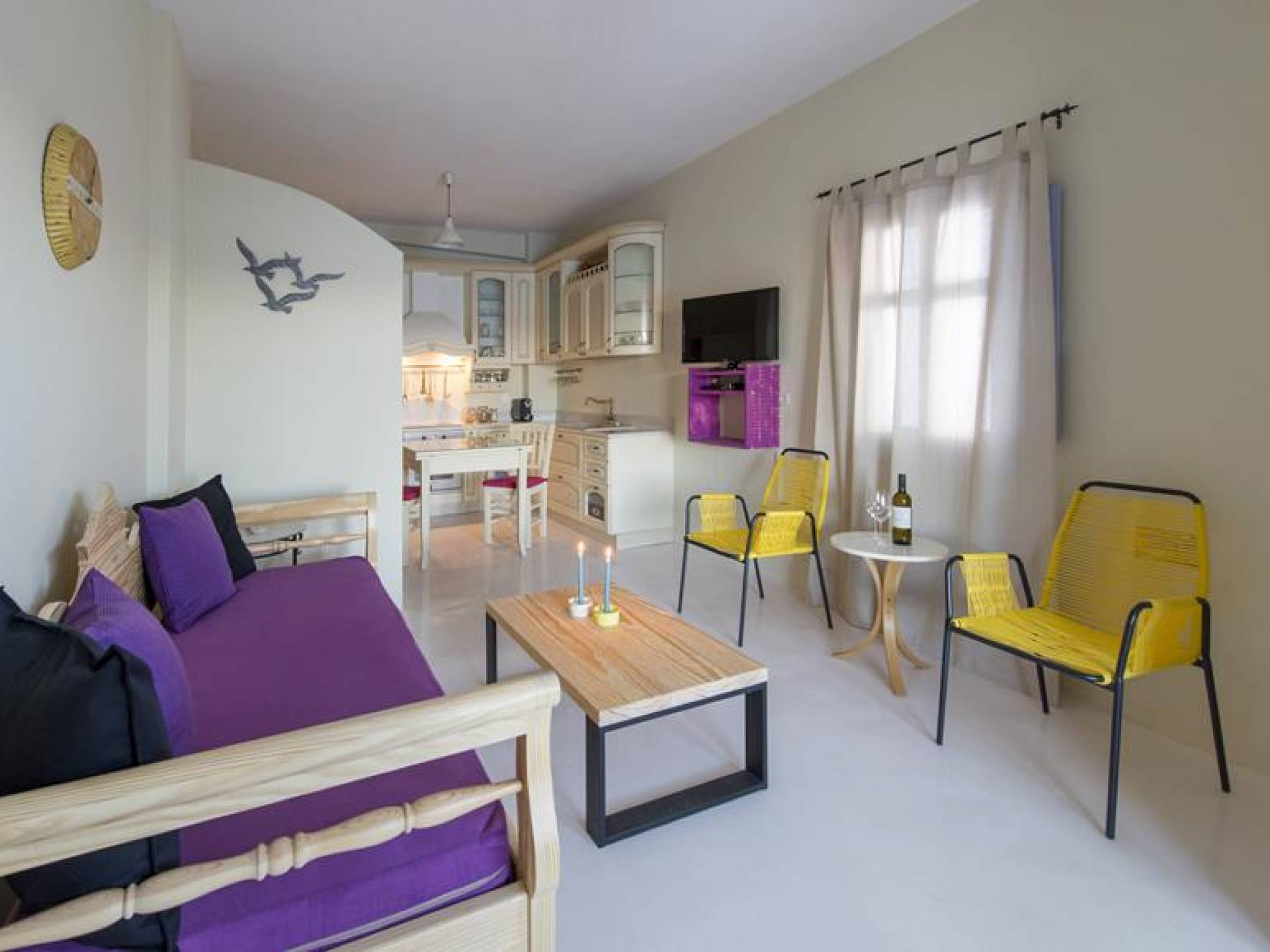 Το εσωτερικό των 50 τ.μ. αποτελείται από ξεχωριστό υπνοδωμάτιο και ενιαία κουζίνα και τραπεζαρία, με σαλόνι με καναπέ -κρεβάτι που μετατρέπεται σε δύο μονά κρεβάτια και ευρύχωρο μπάνιο με ντους.