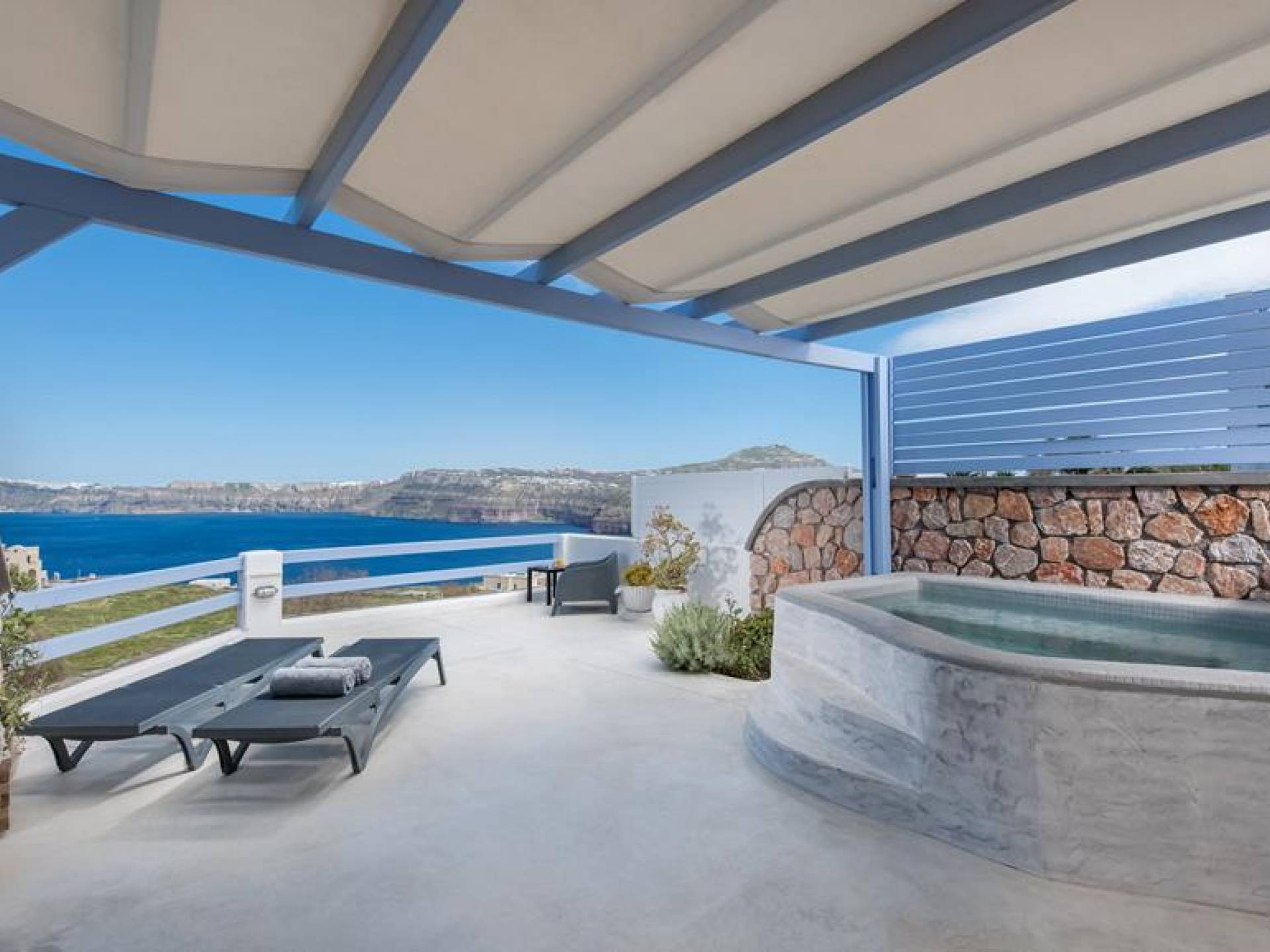 Το Earino Premium Suite είναι μια φιλόξενη σουίτα για όσους εκτιμούν το απόρρητό τους. Η μεγάλη βεράντα προσφέρει σκιά σε μια ζεστή γωνιά, κρατώντας τους επισκέπτες μακριά από τα μάτια. Ενώ η περιοχή προσφέρει εναλλακτικό χώρο για όσους επιθυμούν να χαλαρώσουν στον ήλιο. Είτε βυθίζεστε στην πισίνα είτε ξαπλώνετε στην ξαπλώστρα σας, το βλέμμα της Καλντέρας είναι εκεί για να μείνει στο μυαλό σας για πάντα.