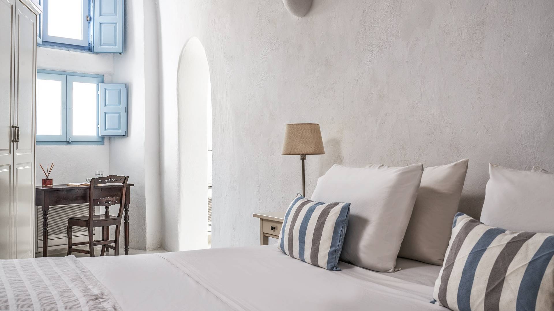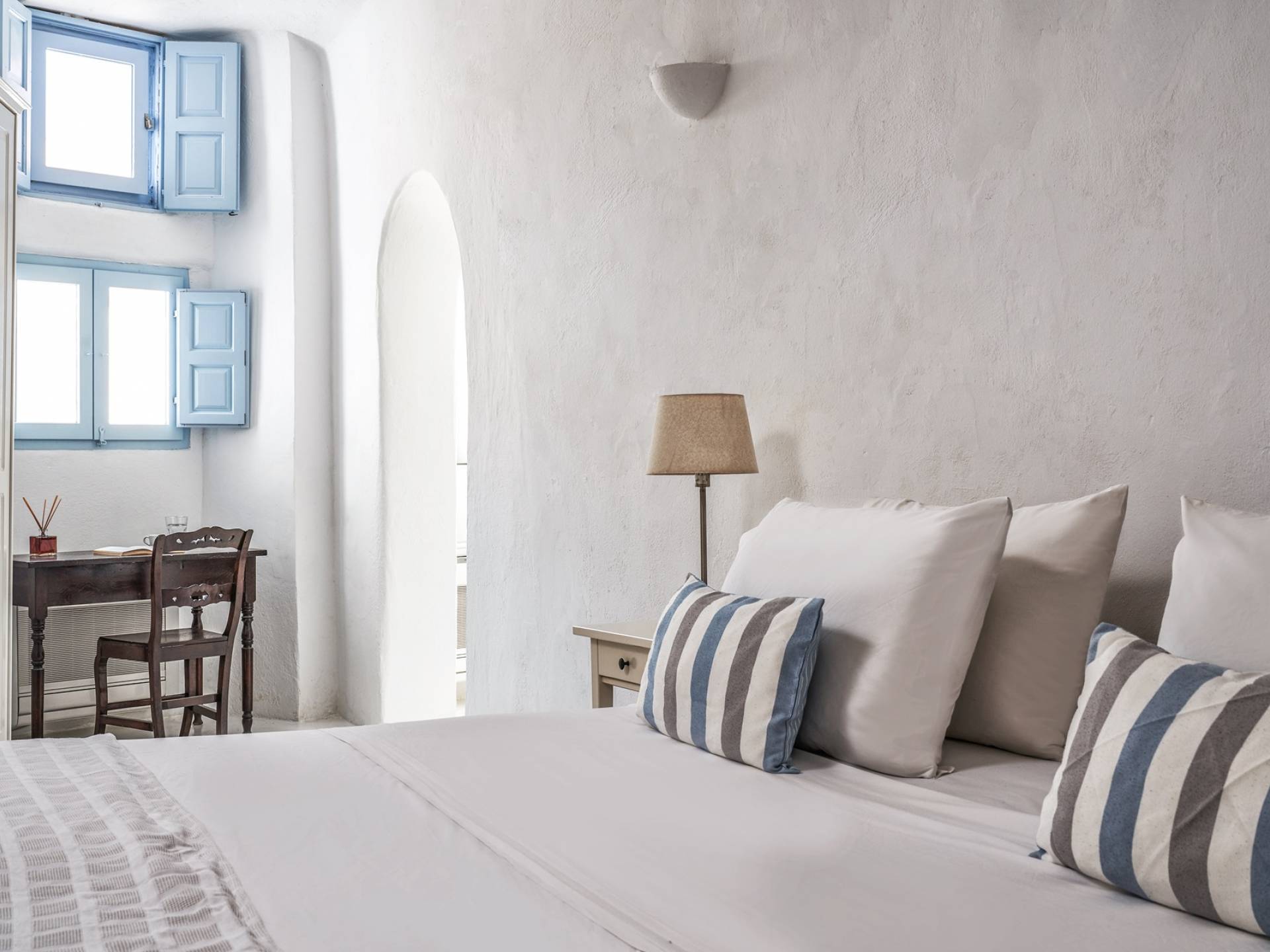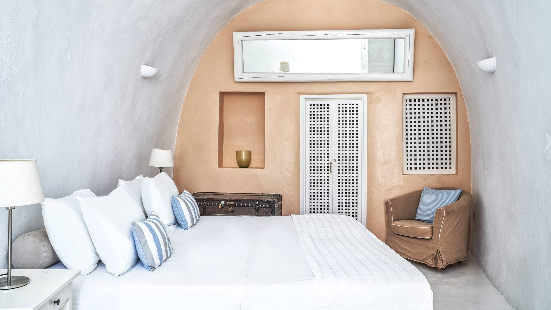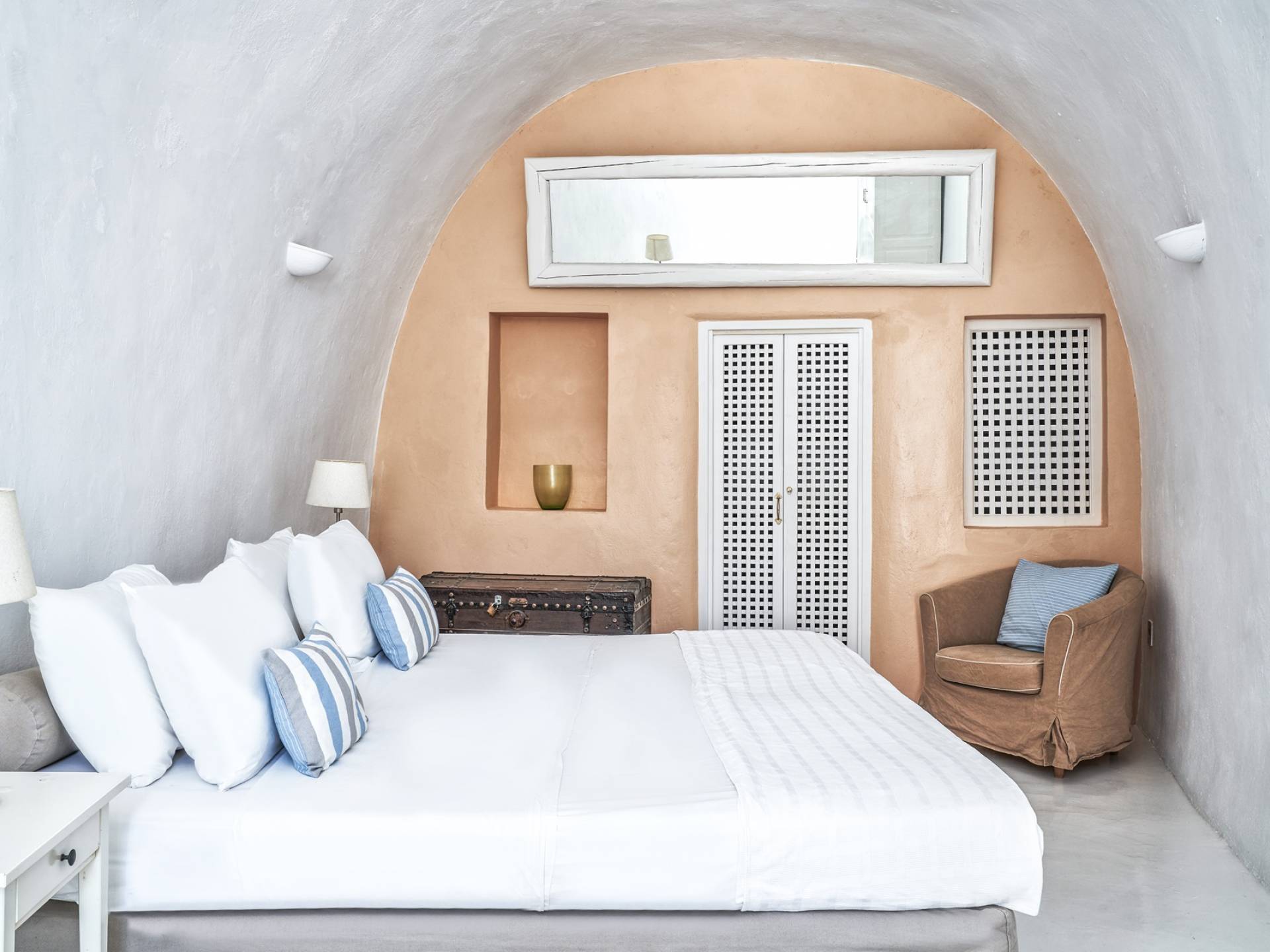 Το ευρύχωρο κυρίως υπνοδωμάτιο, με ψηλή θολωτή οροφή, έχει θέα στην αυλή. Αυτό το υπνοδωμάτιο εξυπηρετεί ένα μεγάλο μπάνιο με σύγχρονες ανέσεις. Το δεύτερο υπνοδωμάτιο είναι ένας ξενώνας που έχει τη δική του είσοδο από την αυλή. Το δίκλινο υπνοδωμάτιο είναι άνετου μεγέθους και μια μικρή σκάλα οδηγεί στο ιδιωτικό μπάνιο με ντους. Αυτή είναι μια υπέροχη βίλα για ένα ή δύο ζευγάρια ή μια μικρή οικογένεια που θέλουν ένα ιδιωτικό καταφύγιο από το οποίο θα εξερευνήσουν το νησί.