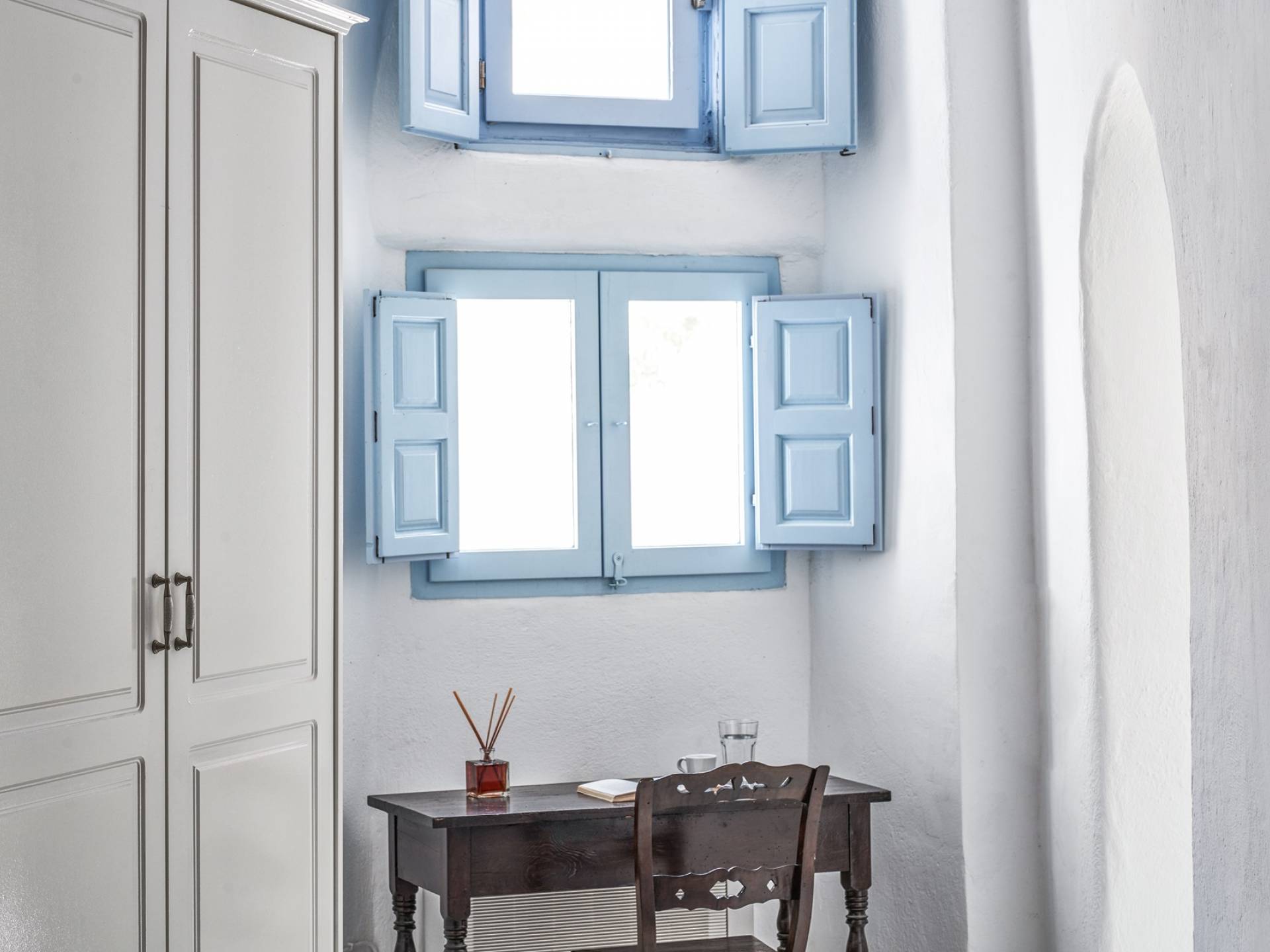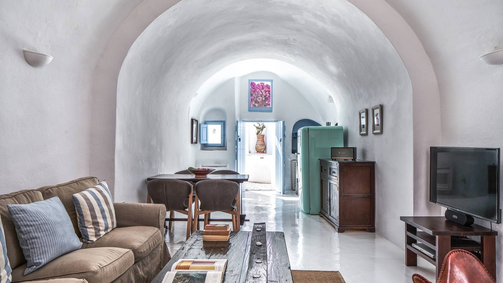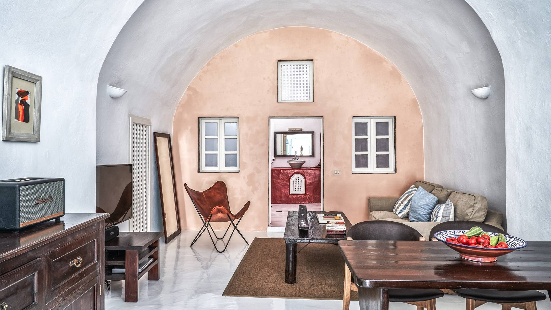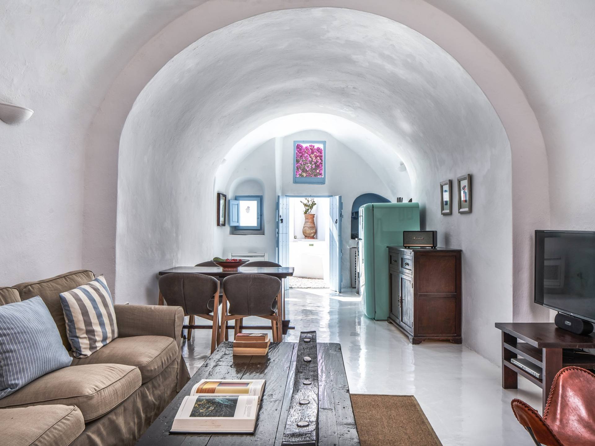 Βρίσκεται κάτω από την εκκλησία των Αγίων Αναργύρων με το υπέροχο καμπαναριό, το Villa Ivi δύο υπνοδωματίων είναι ένα γοητευτικό καταφύγιο από τη φασαρία των Φηρών και της Οίας. Προστατευμένο από τους κυκλαδίτικους ανέμους, το χωριό Μεγαλοχώρι χωρίς κίνηση προσφέρει μια ειρηνική και περιζήτητη εναλλακτική λύση. Η ρομαντική Villa Ivi παρείχε κάποτε στους χωρικούς ένα ασφαλές καταφύγιο από ληστές πειρατές που εισέβαλαν στο νησί.