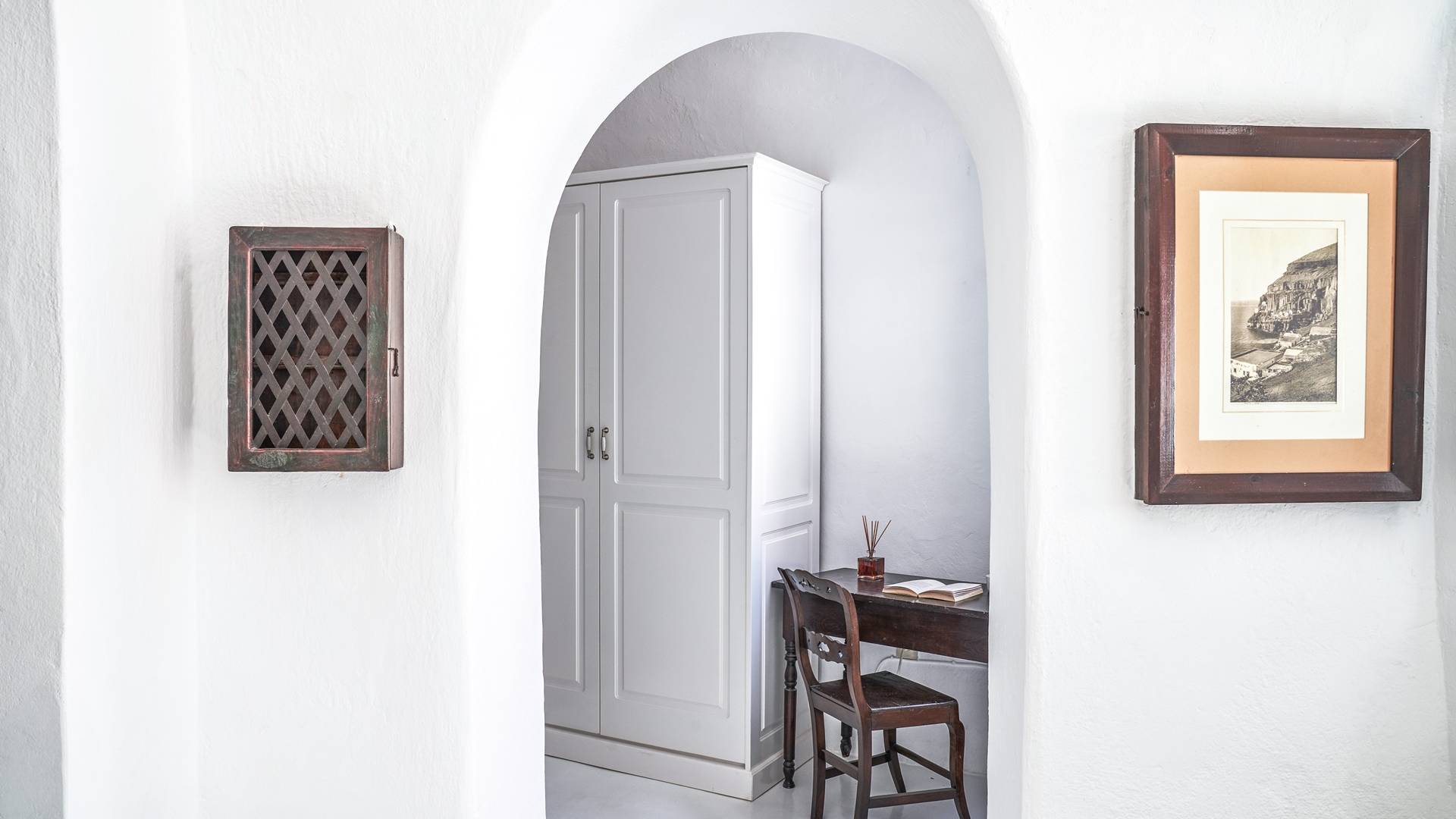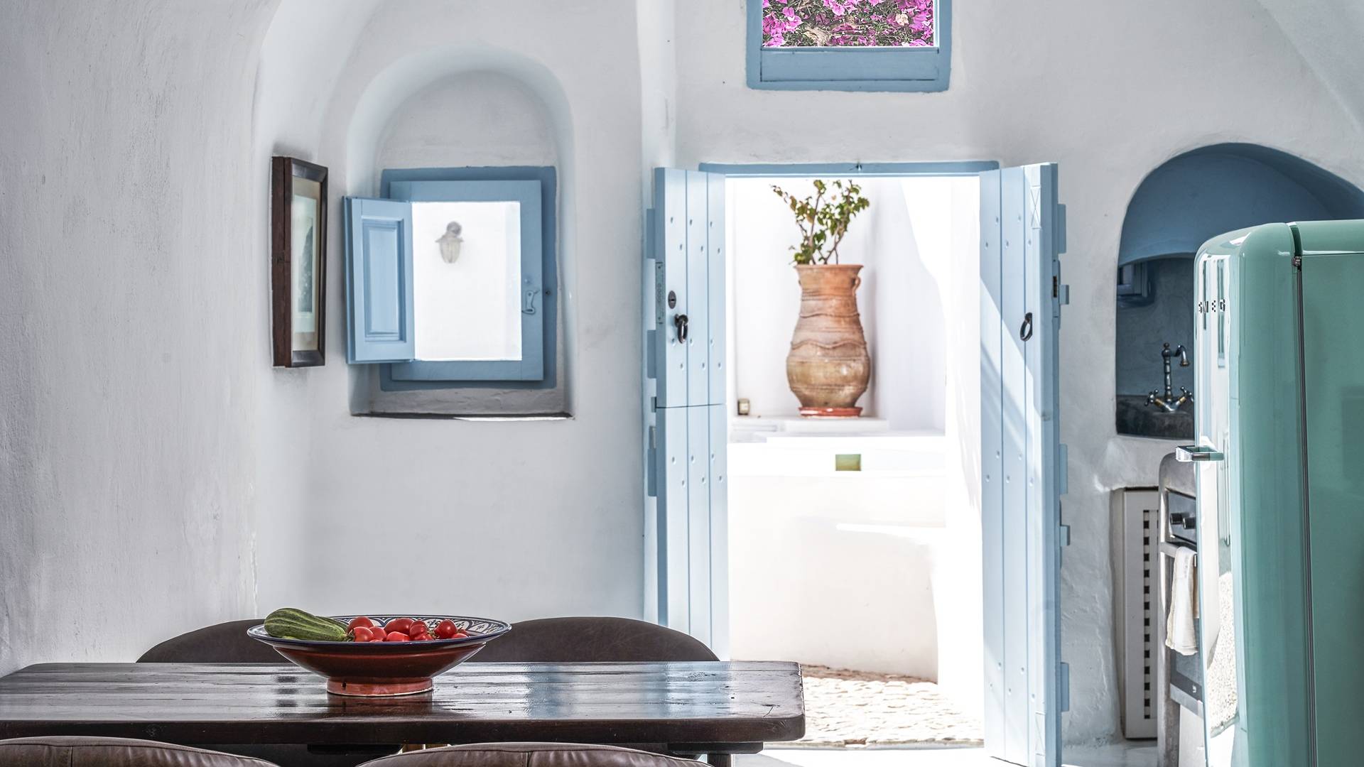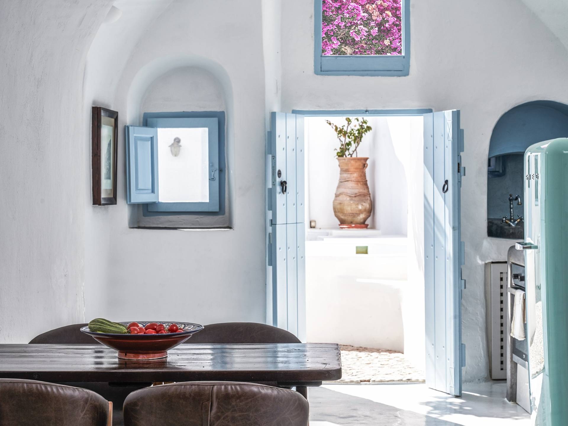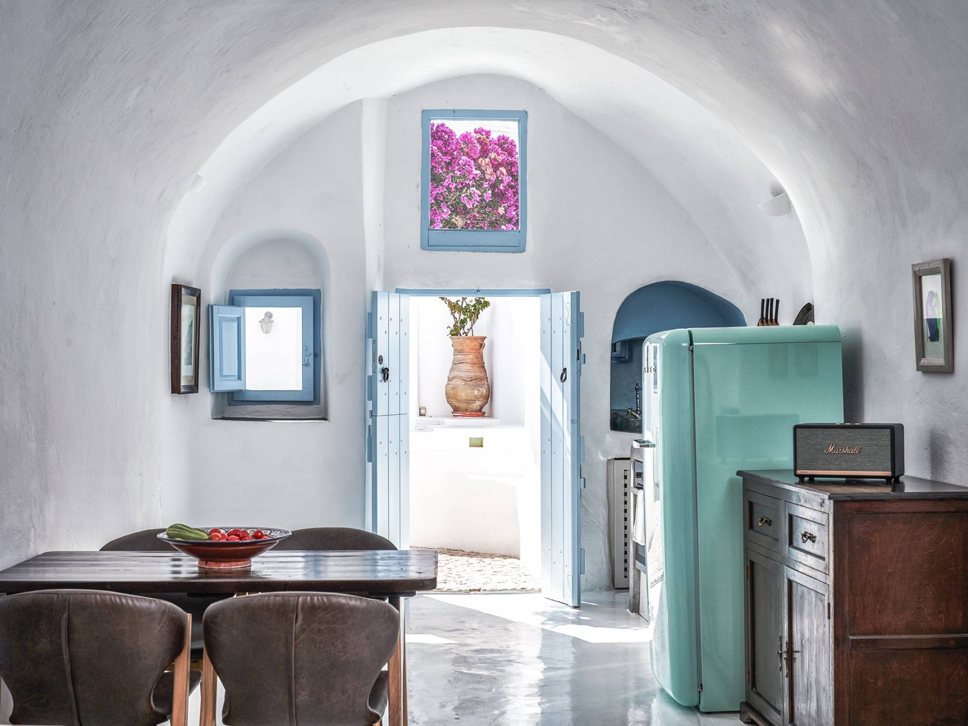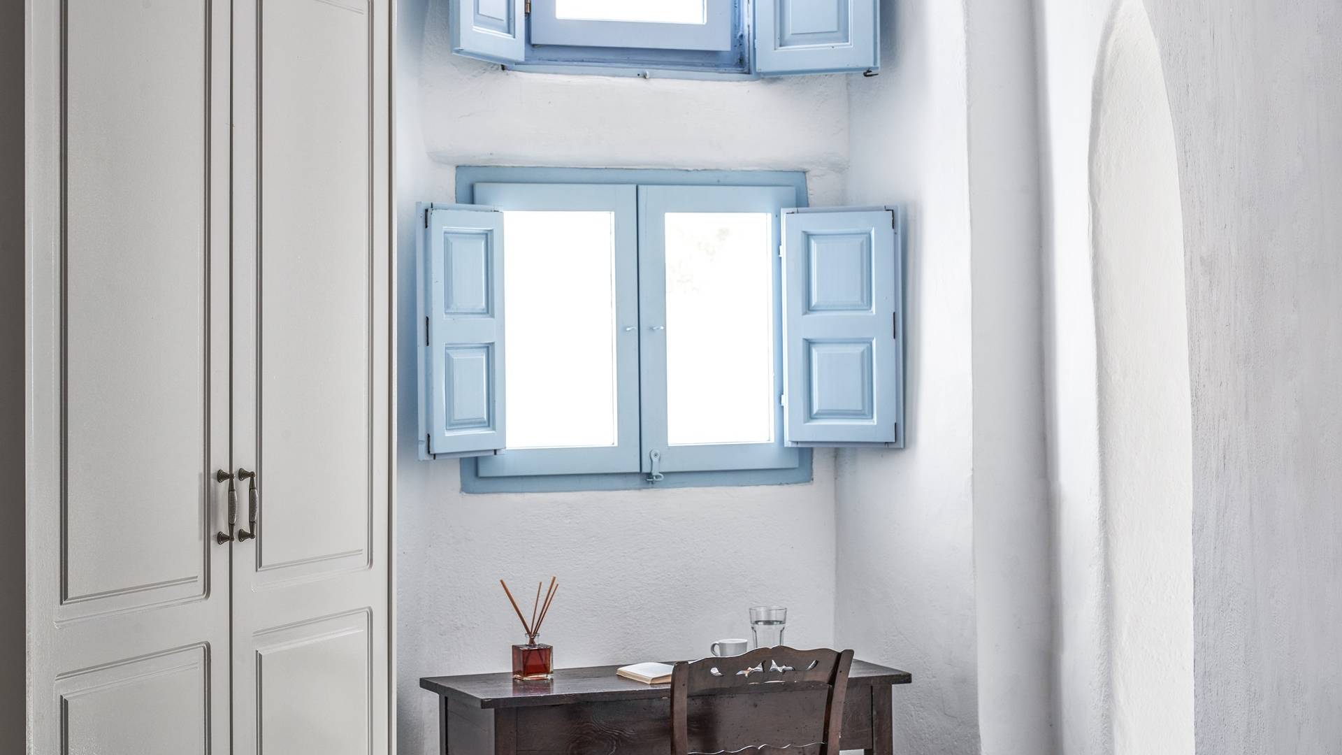 Βρίσκεται κάτω από την εκκλησία των Αγίων Αναργύρων με το υπέροχο καμπαναριό, το Villa Ivi δύο υπνοδωματίων είναι ένα γοητευτικό καταφύγιο από τη φασαρία των Φηρών και της Οίας. Προστατευμένο από τους κυκλαδίτικους ανέμους, το χωριό Μεγαλοχώρι χωρίς κίνηση προσφέρει μια ειρηνική και περιζήτητη εναλλακτική λύση. Η ρομαντική Villa Ivi παρείχε κάποτε στους χωρικούς ένα ασφαλές καταφύγιο από ληστές πειρατές που εισέβαλαν στο νησί.