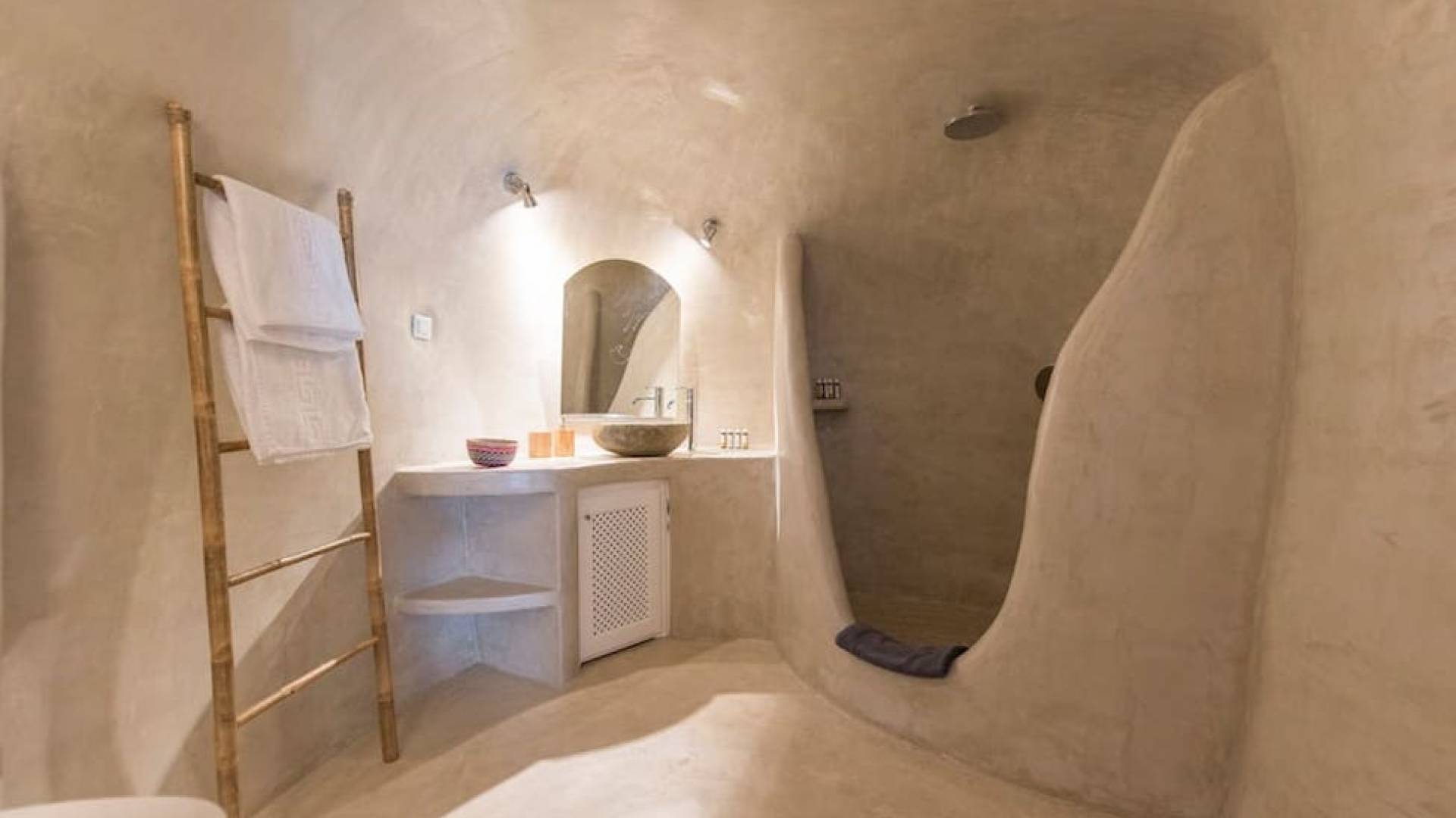 Η κύρια κρεβατοκάμαρα με ιδιωτικό μπάνιο βρίσκεται στο πίσω μέρος της σπηλιάς που συνδέεται με ένα ευρύχωρο σαλόνι με καθιστικό, κουζίνα και δεύτερο πλήρες μπάνιο με θέα στο αίθριο και στο υδρομασάζ κατά παραγγελία.