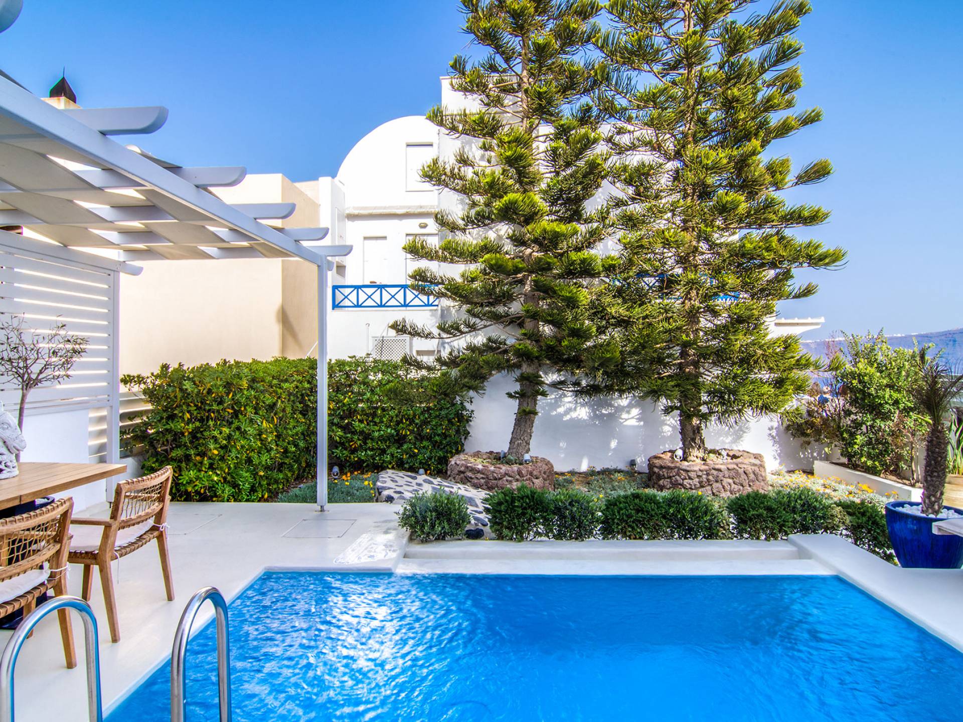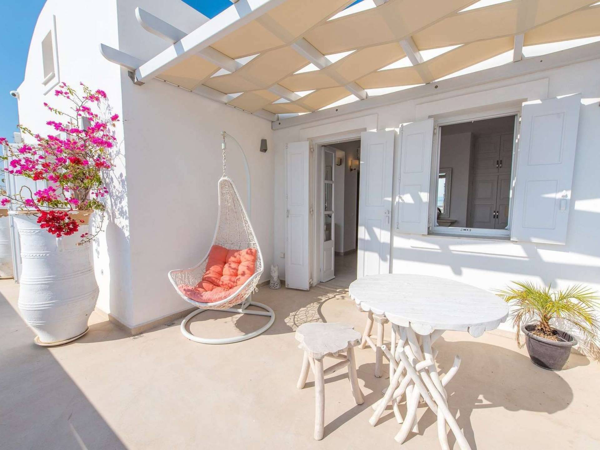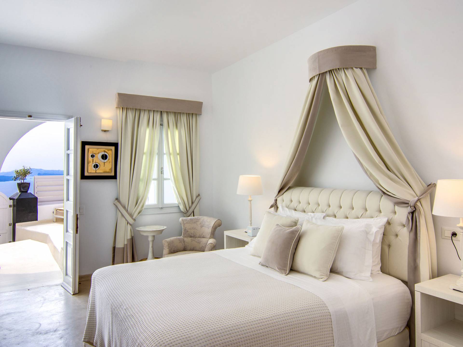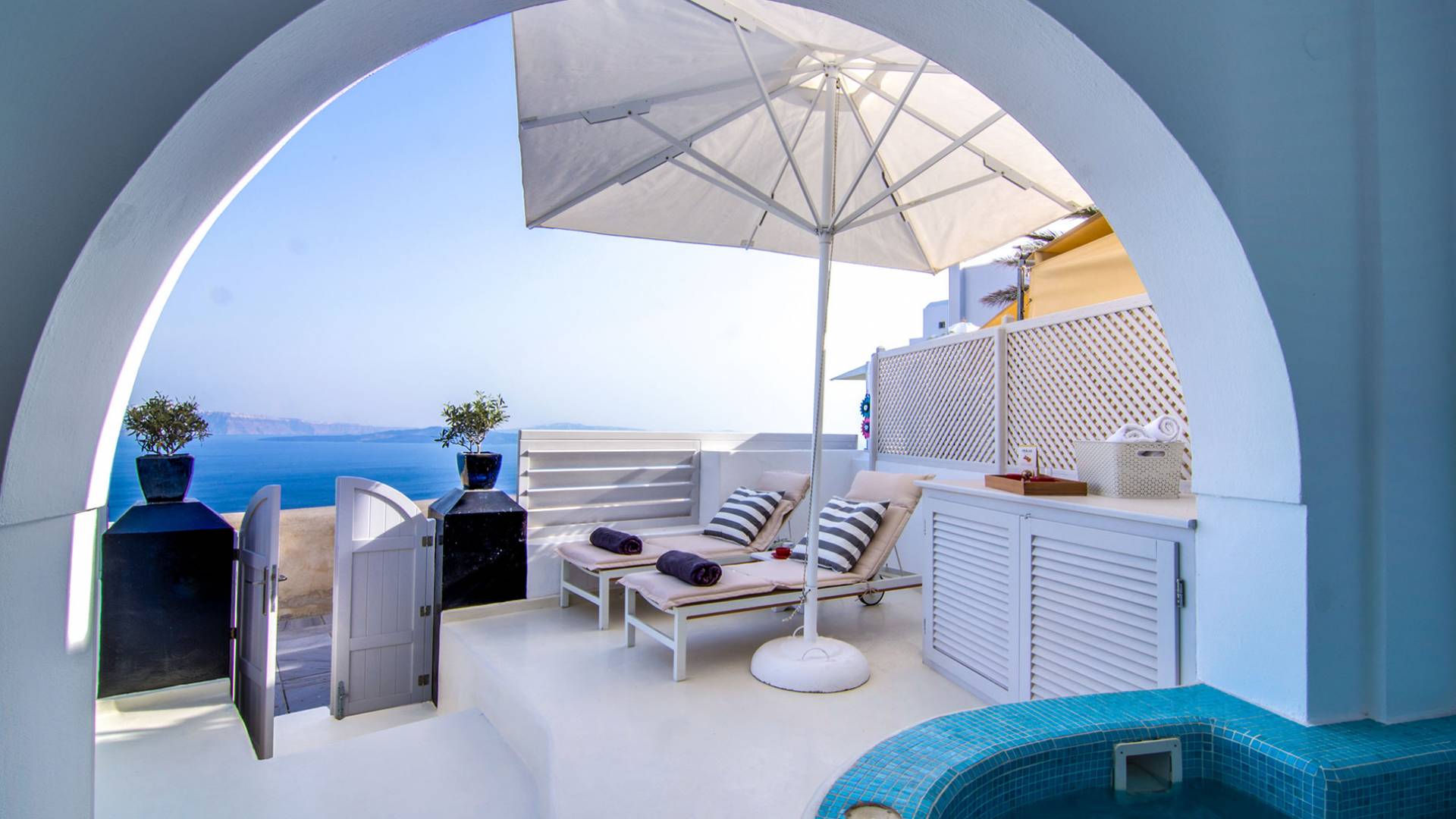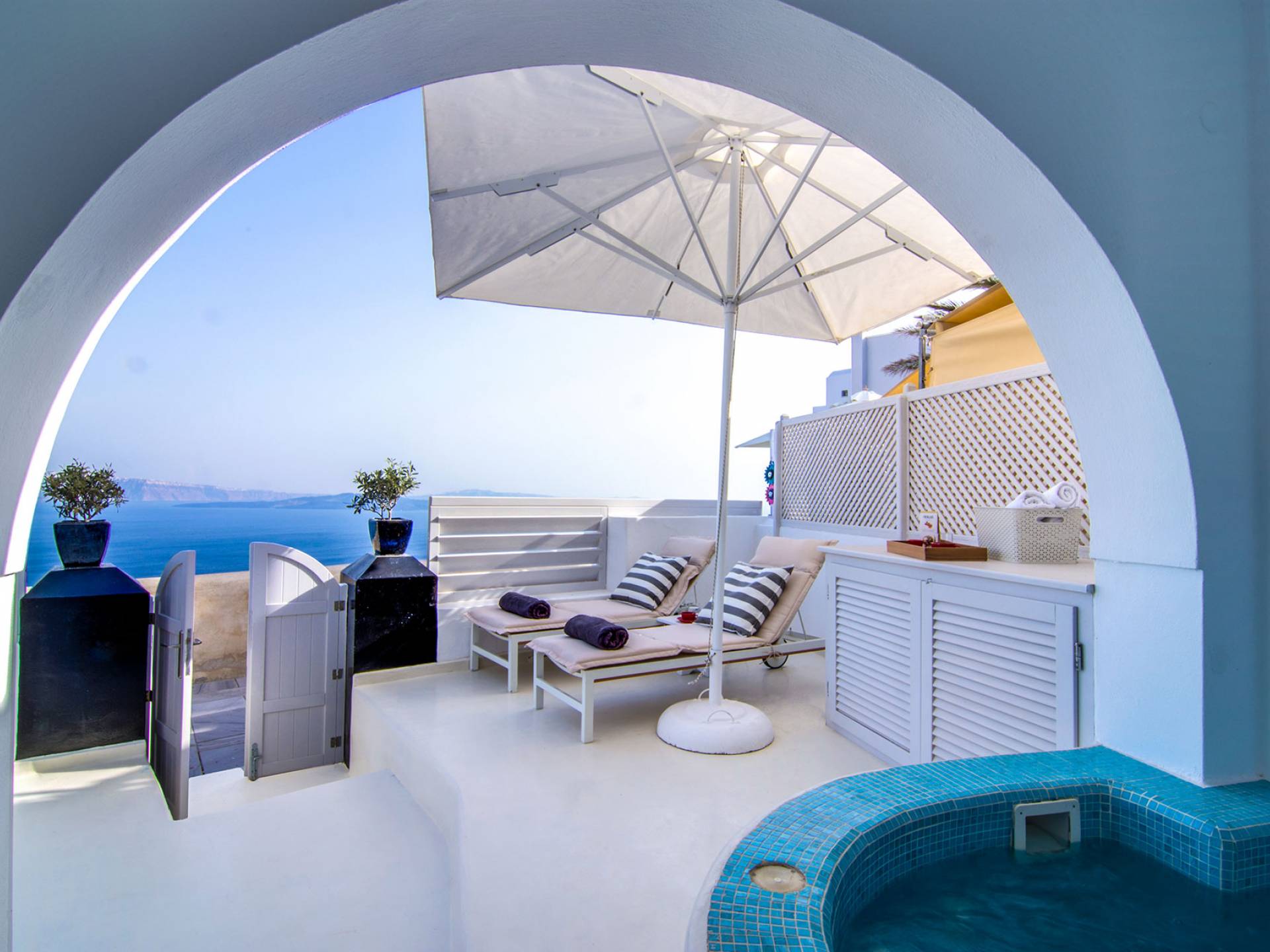 Εξωτερικά: Αίθριο με τραπεζαρία, ξαπλώστρες, υπαίθριο υδρομασάζ, ιδιωτική πισίνα και μερική θέα στη θάλασσα. Ανώτερο επίπεδο: Ευρύχωρο υπνοδωμάτιο με κρεβάτι με ουρανό Queen Size, καθιστικό ενιαίας διαρρύθμισης, ευάερο μπάνιο με Jet Shower. Εξωτερικά: Ευρύχωρη βεράντα με τραπεζαρία, ξαπλώστρες, ιδιωτικό υδρομασάζ και πανοραμική καλντέρα και ανατολική θέα.
