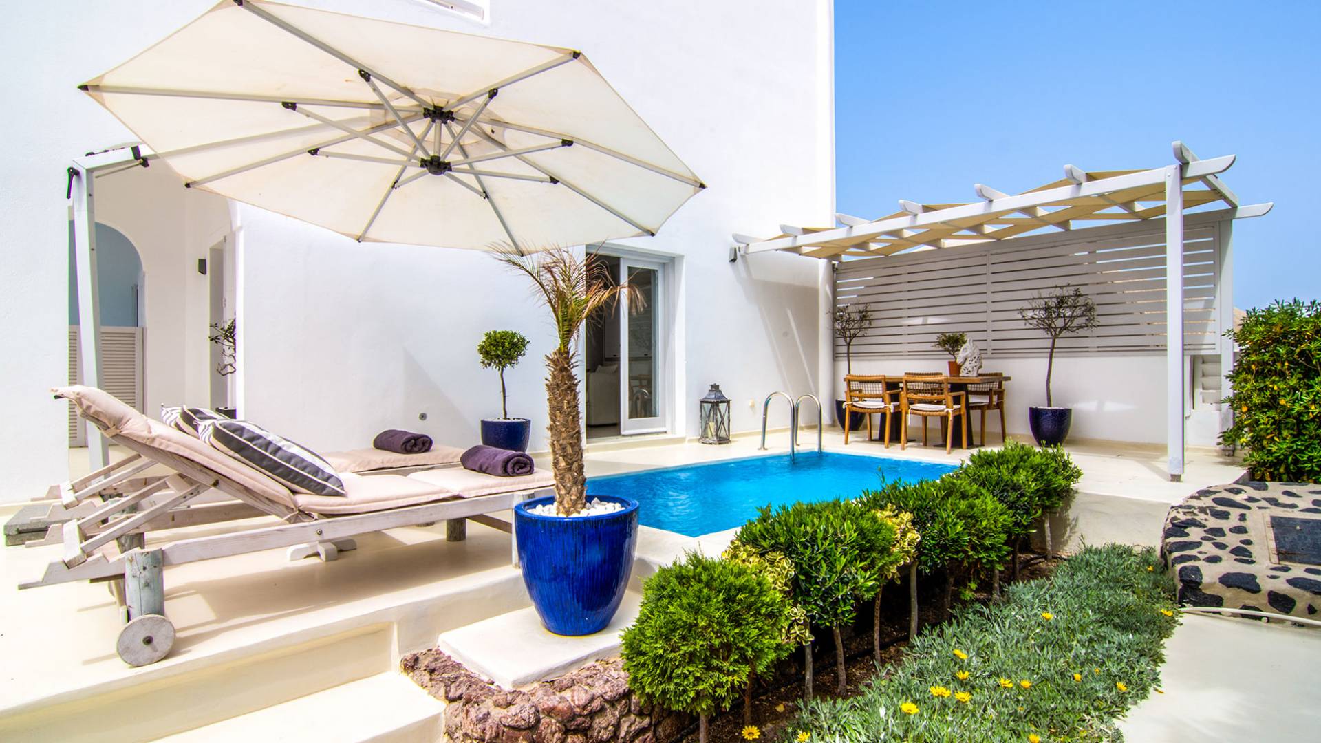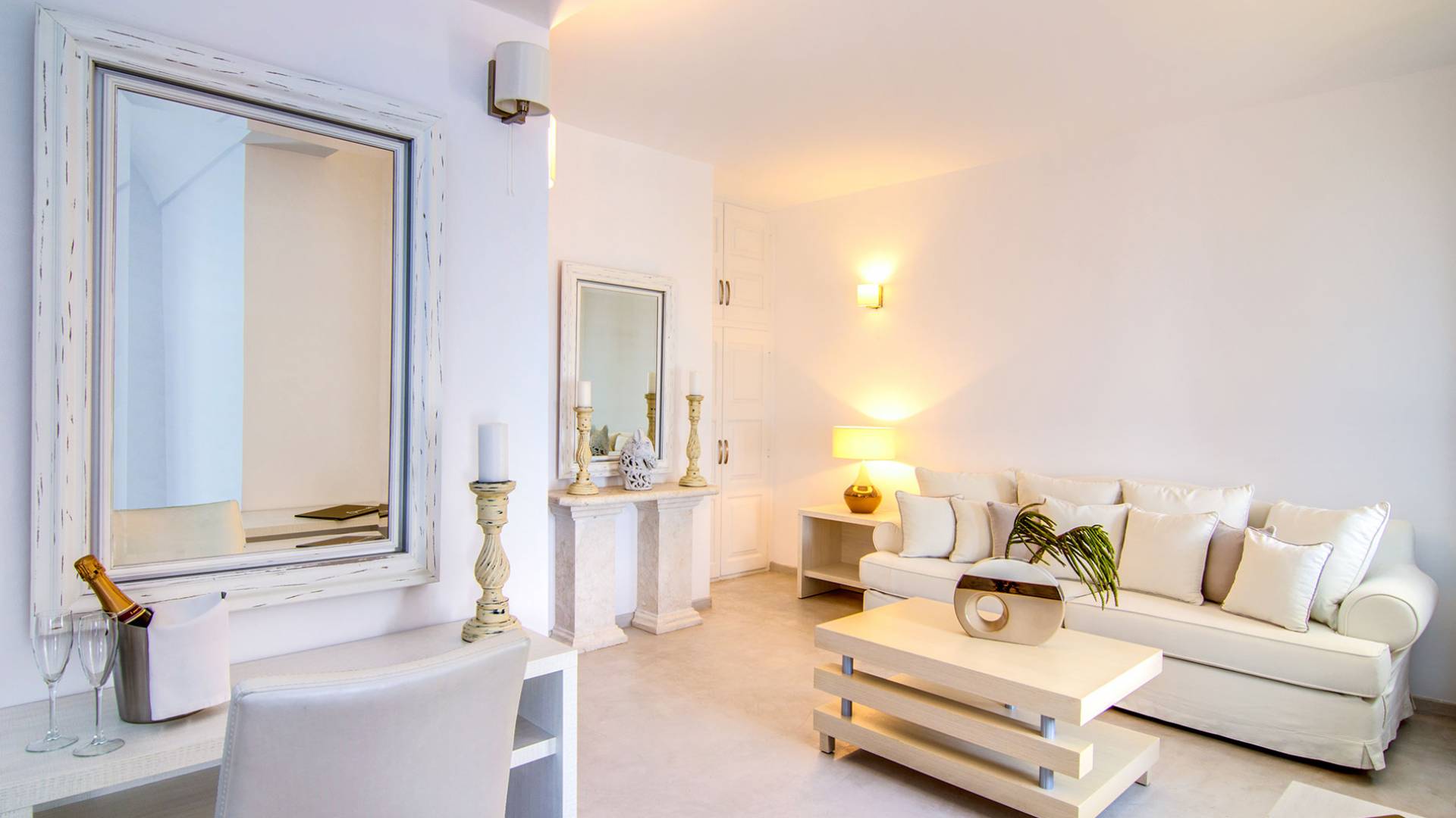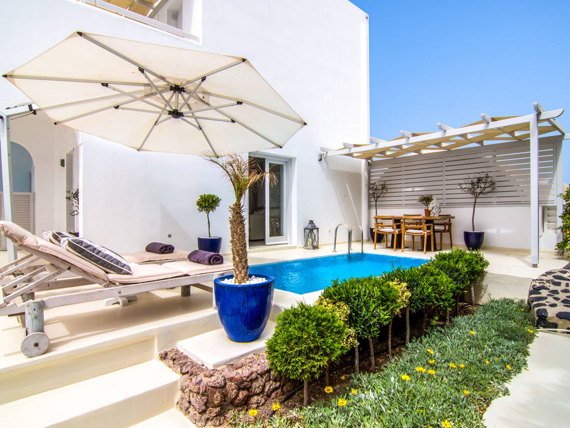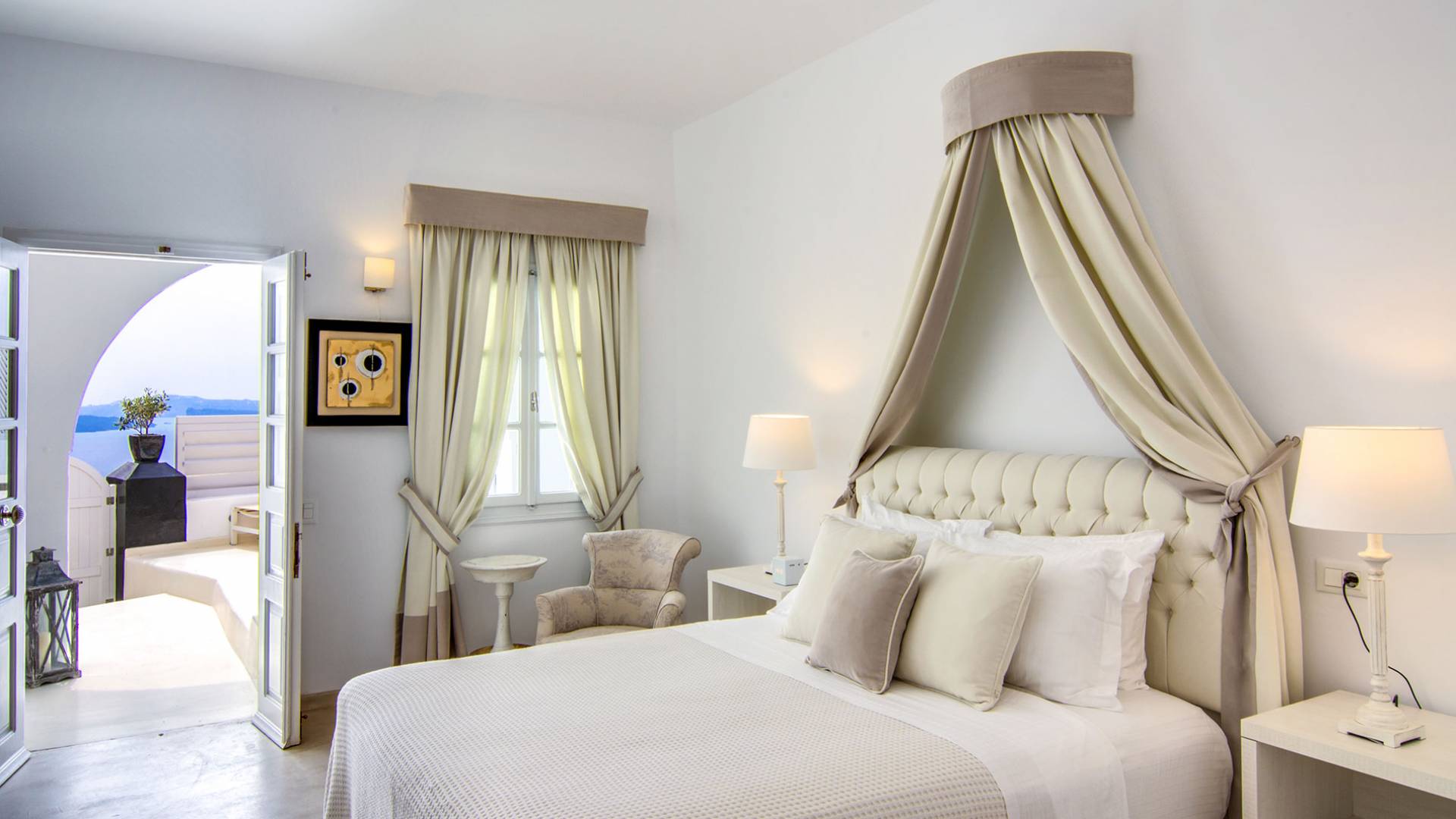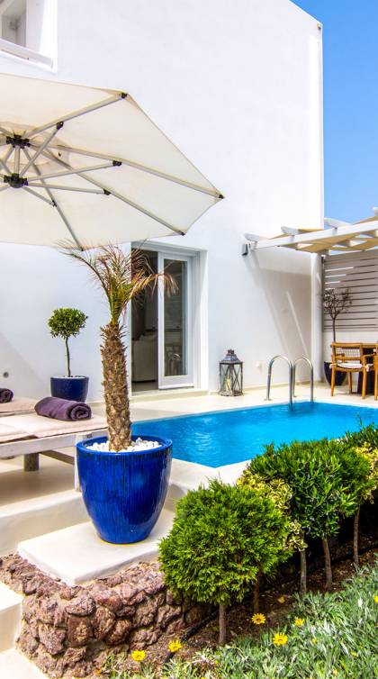 Εξωτερικά: Αίθριο με τραπεζαρία, ξαπλώστρες, υπαίθριο υδρομασάζ, ιδιωτική πισίνα και μερική θέα στη θάλασσα. Ανώτερο επίπεδο: Ευρύχωρο υπνοδωμάτιο με κρεβάτι με ουρανό Queen Size, καθιστικό ενιαίας διαρρύθμισης, ευάερο μπάνιο με Jet Shower. Εξωτερικά: Ευρύχωρη βεράντα με τραπεζαρία, ξαπλώστρες, ιδιωτικό υδρομασάζ και πανοραμική καλντέρα και ανατολική θέα.