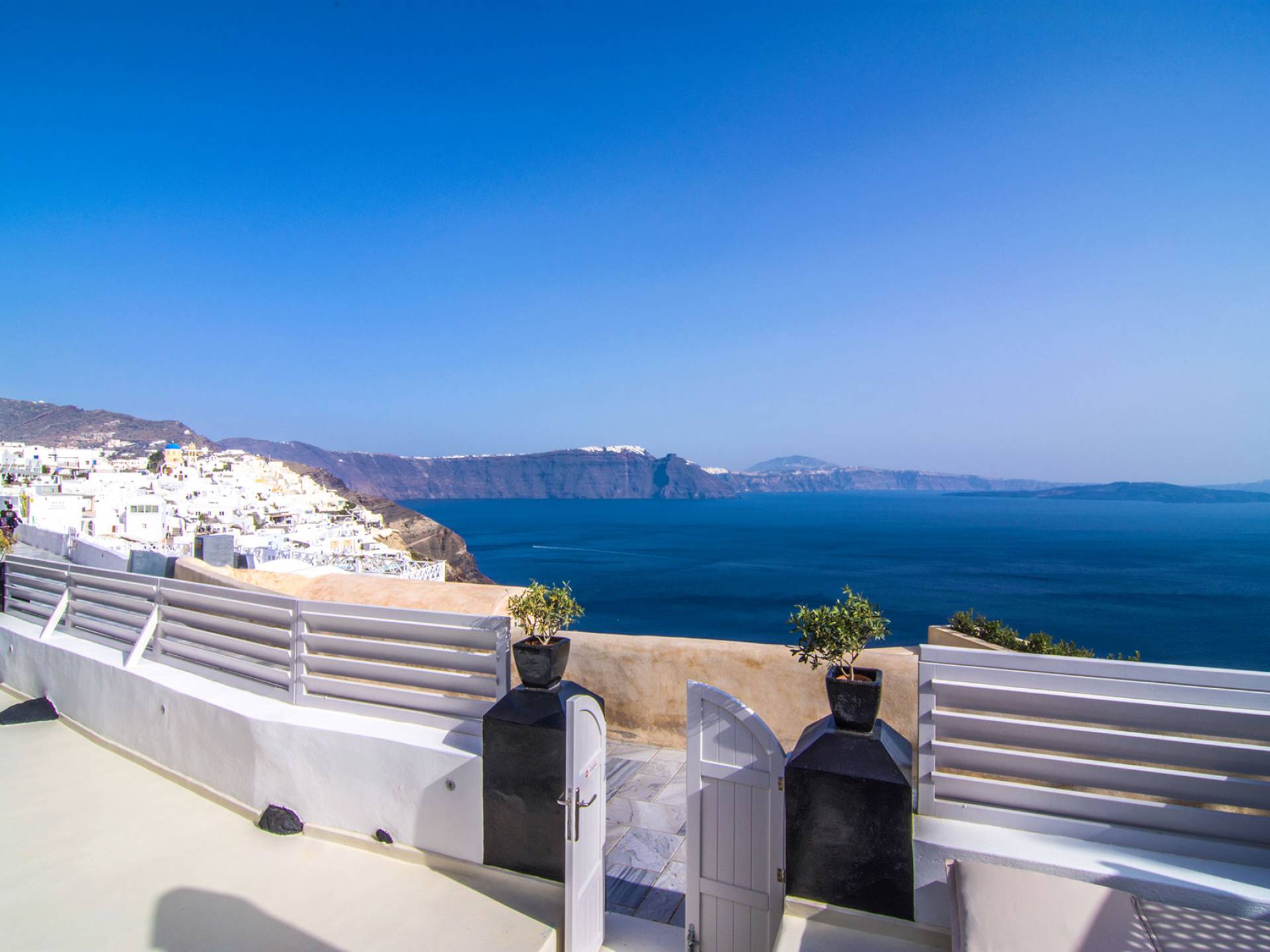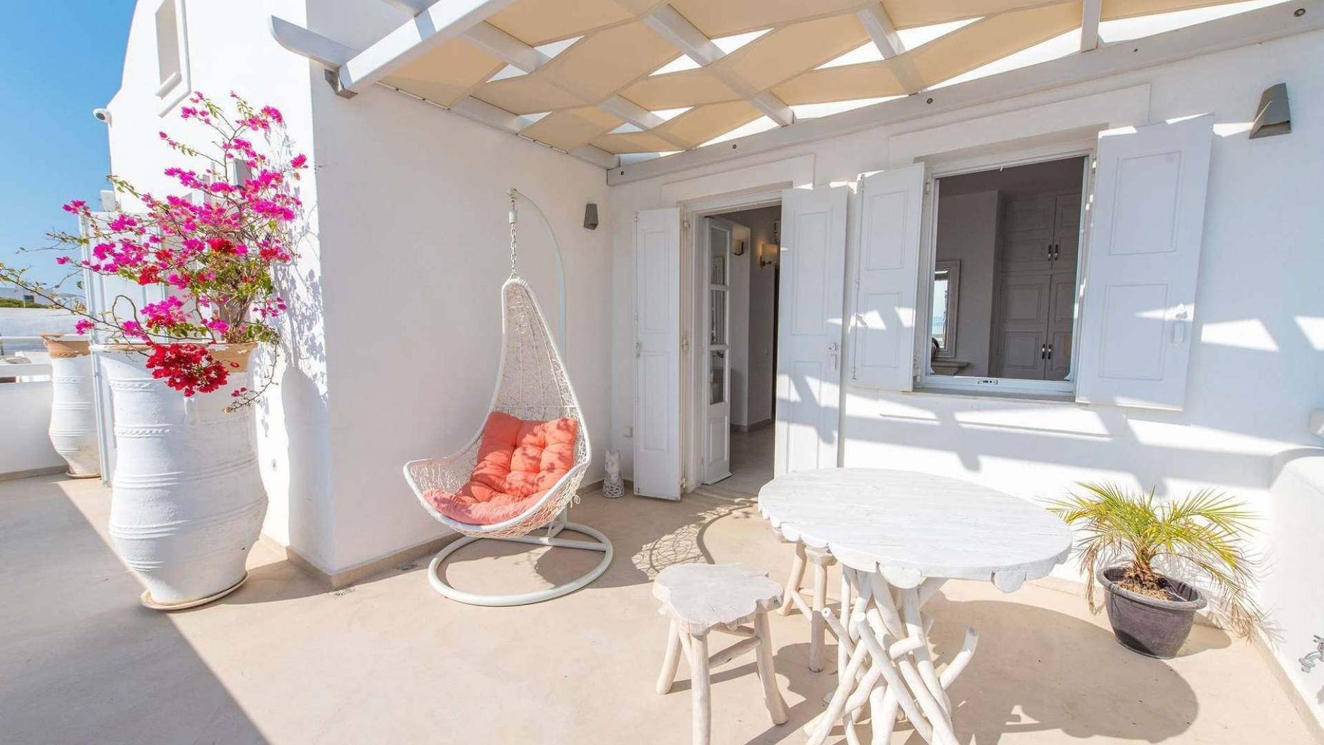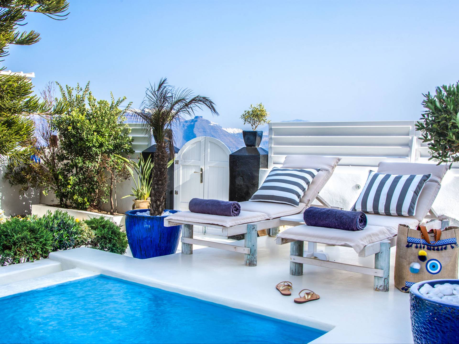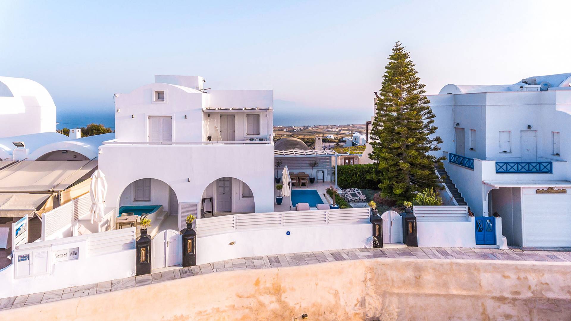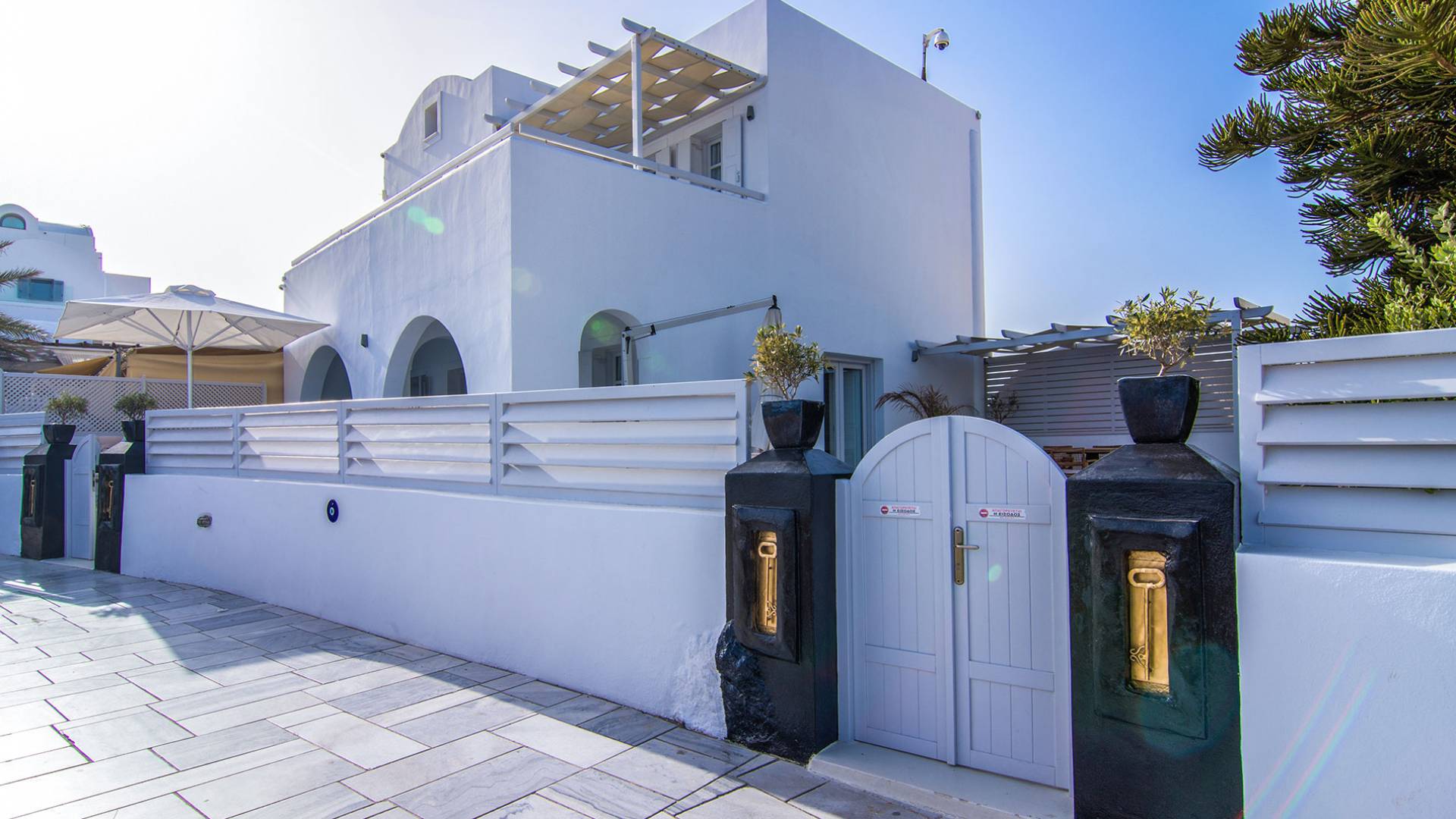 Εξωτερικά: Αίθριο με τραπεζαρία, ξαπλώστρες, υπαίθριο υδρομασάζ, ιδιωτική πισίνα και μερική θέα στη θάλασσα. Ανώτερο επίπεδο: Ευρύχωρο υπνοδωμάτιο με κρεβάτι με ουρανό Queen Size, καθιστικό ενιαίας διαρρύθμισης, ευάερο μπάνιο με Jet Shower. Εξωτερικά: Ευρύχωρη βεράντα με τραπεζαρία, ξαπλώστρες, ιδιωτικό υδρομασάζ και πανοραμική καλντέρα και ανατολική θέα.