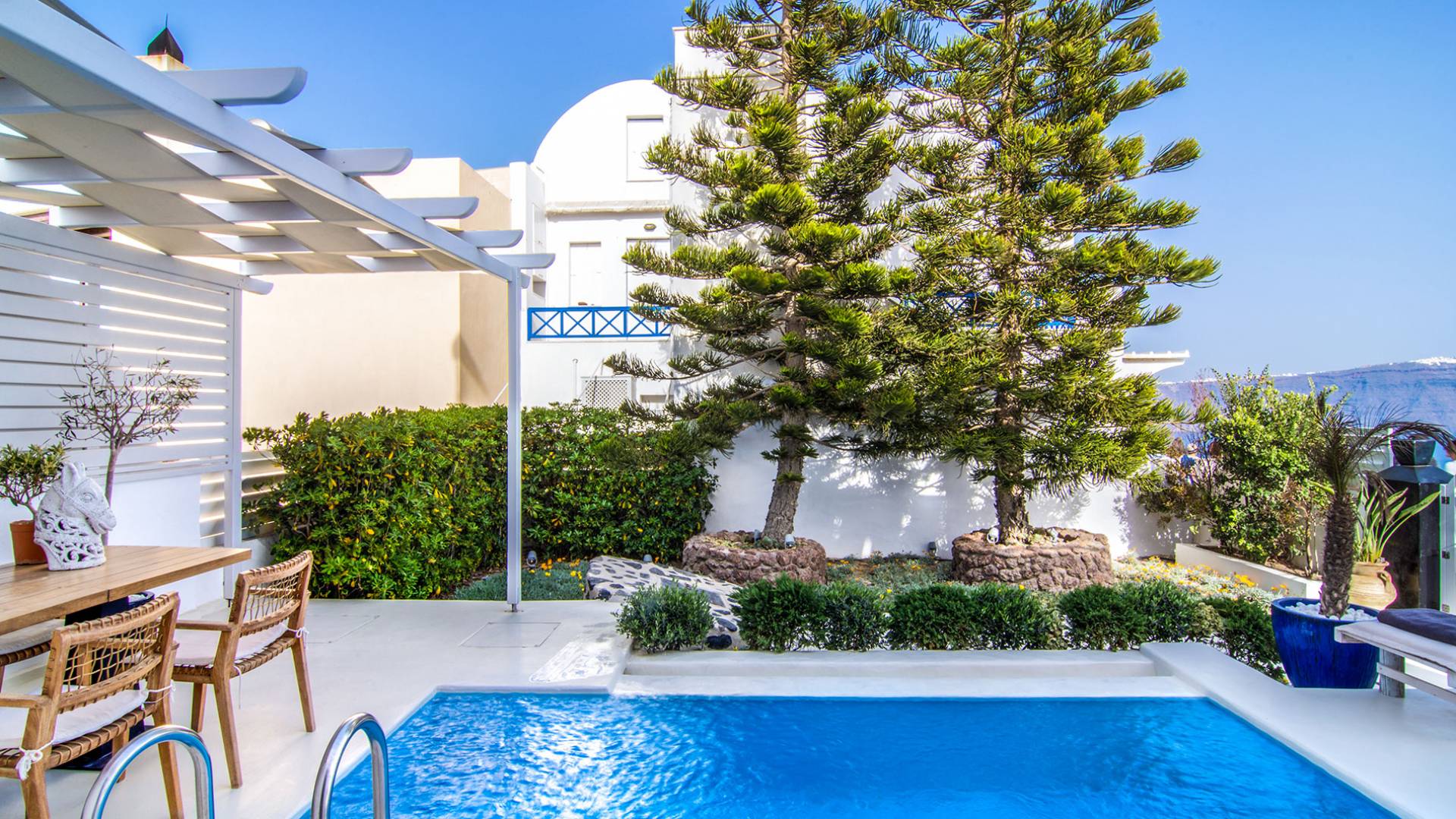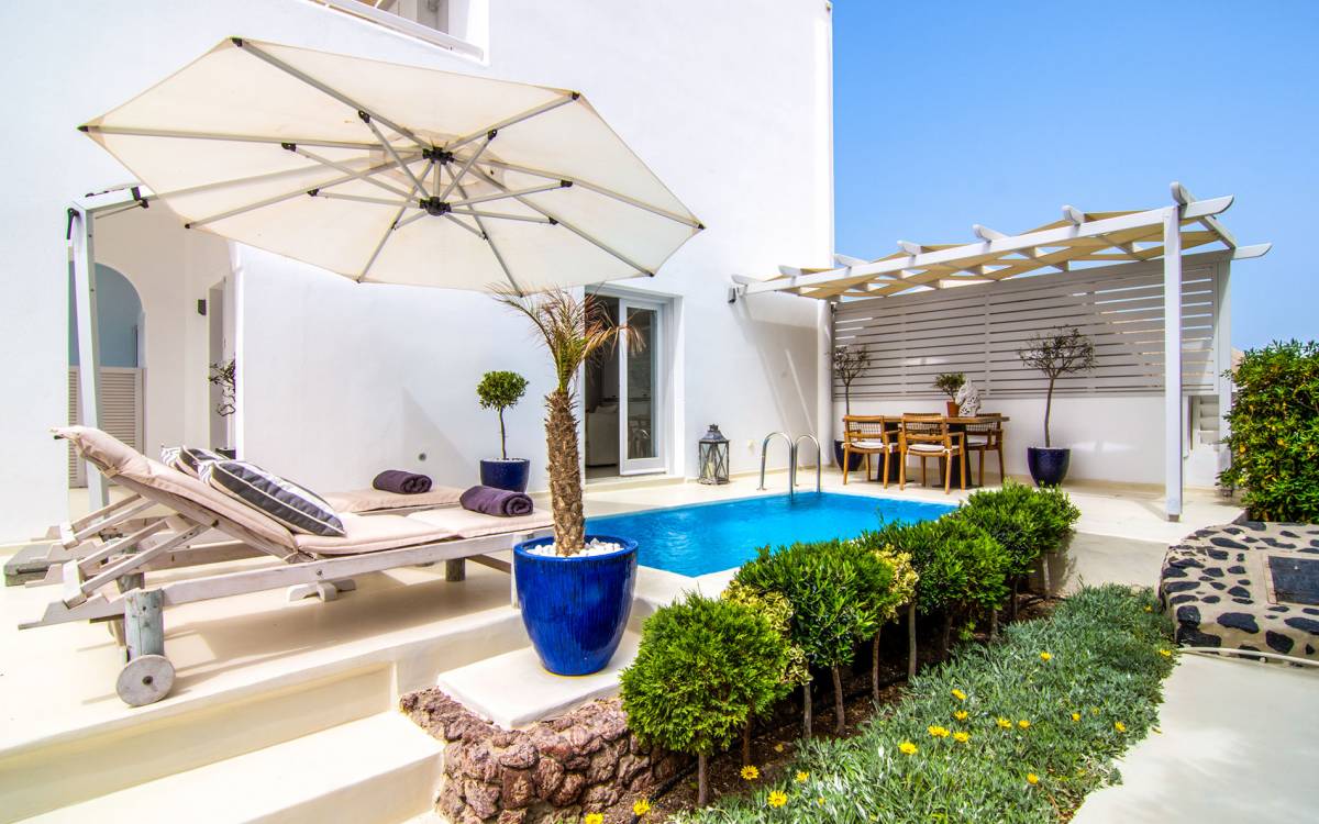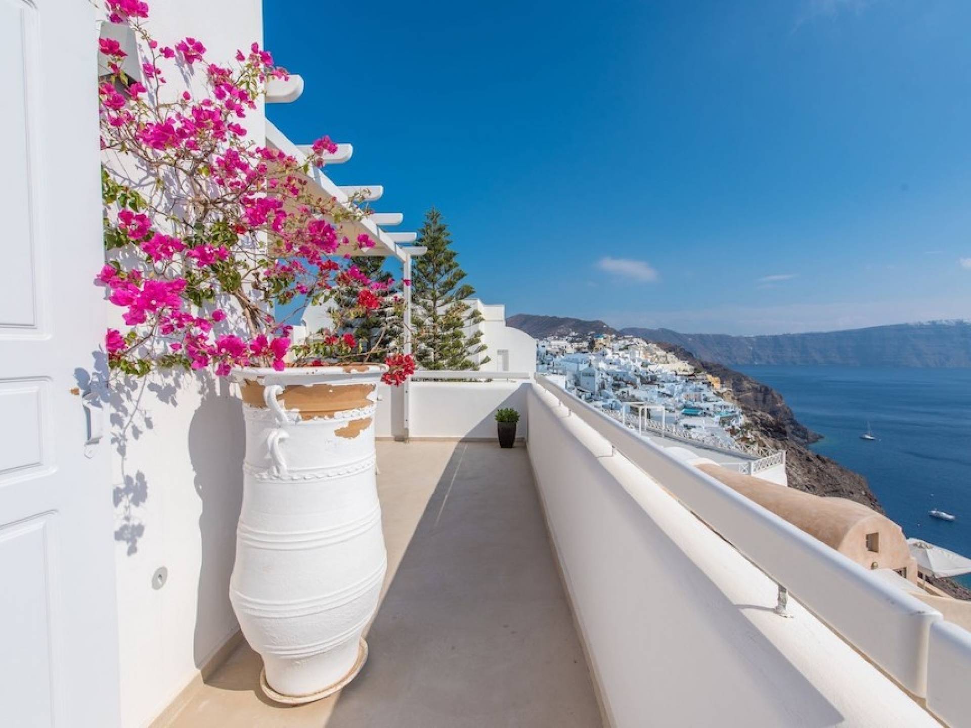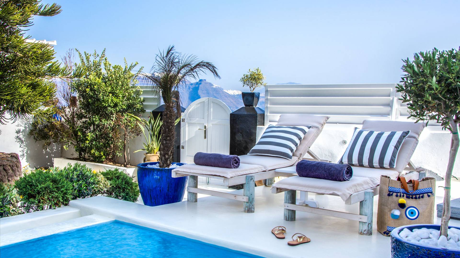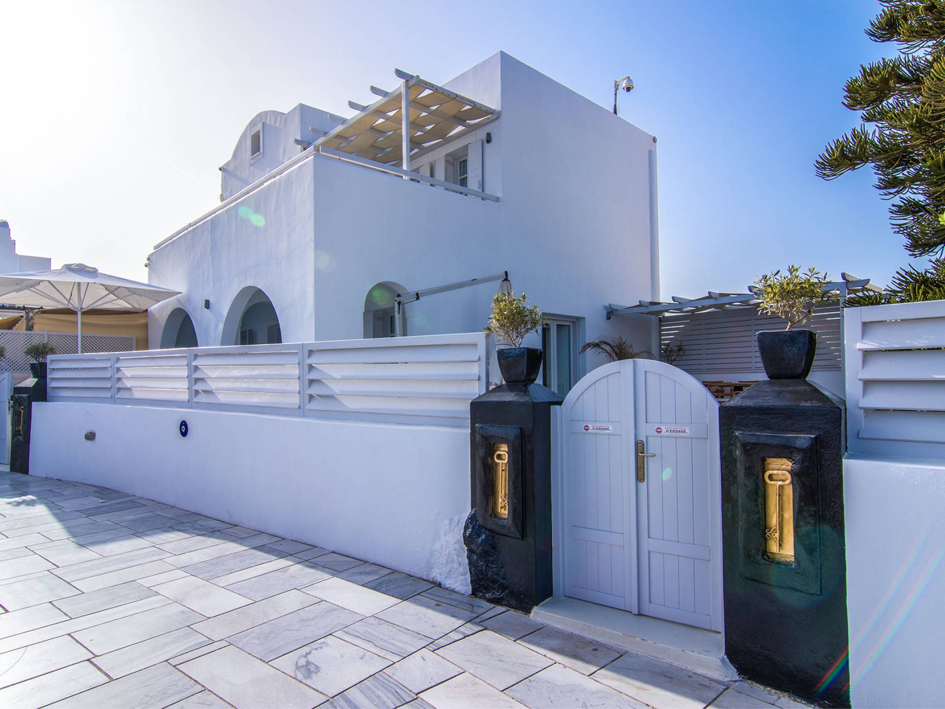 Εξωτερικά: Αίθριο με τραπεζαρία, ξαπλώστρες, υπαίθριο υδρομασάζ, ιδιωτική πισίνα και μερική θέα στη θάλασσα. Ανώτερο επίπεδο: Ευρύχωρο υπνοδωμάτιο με κρεβάτι με ουρανό Queen Size, καθιστικό ενιαίας διαρρύθμισης, ευάερο μπάνιο με Jet Shower. Εξωτερικά: Ευρύχωρη βεράντα με τραπεζαρία, ξαπλώστρες, ιδιωτικό υδρομασάζ και πανοραμική καλντέρα και ανατολική θέα.