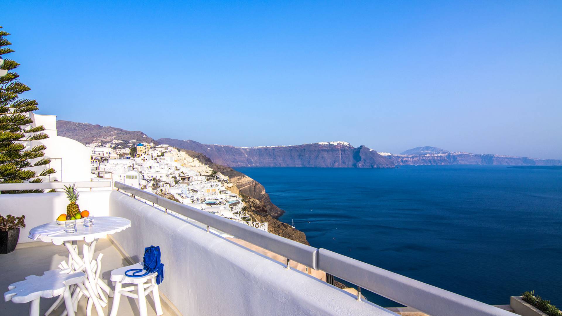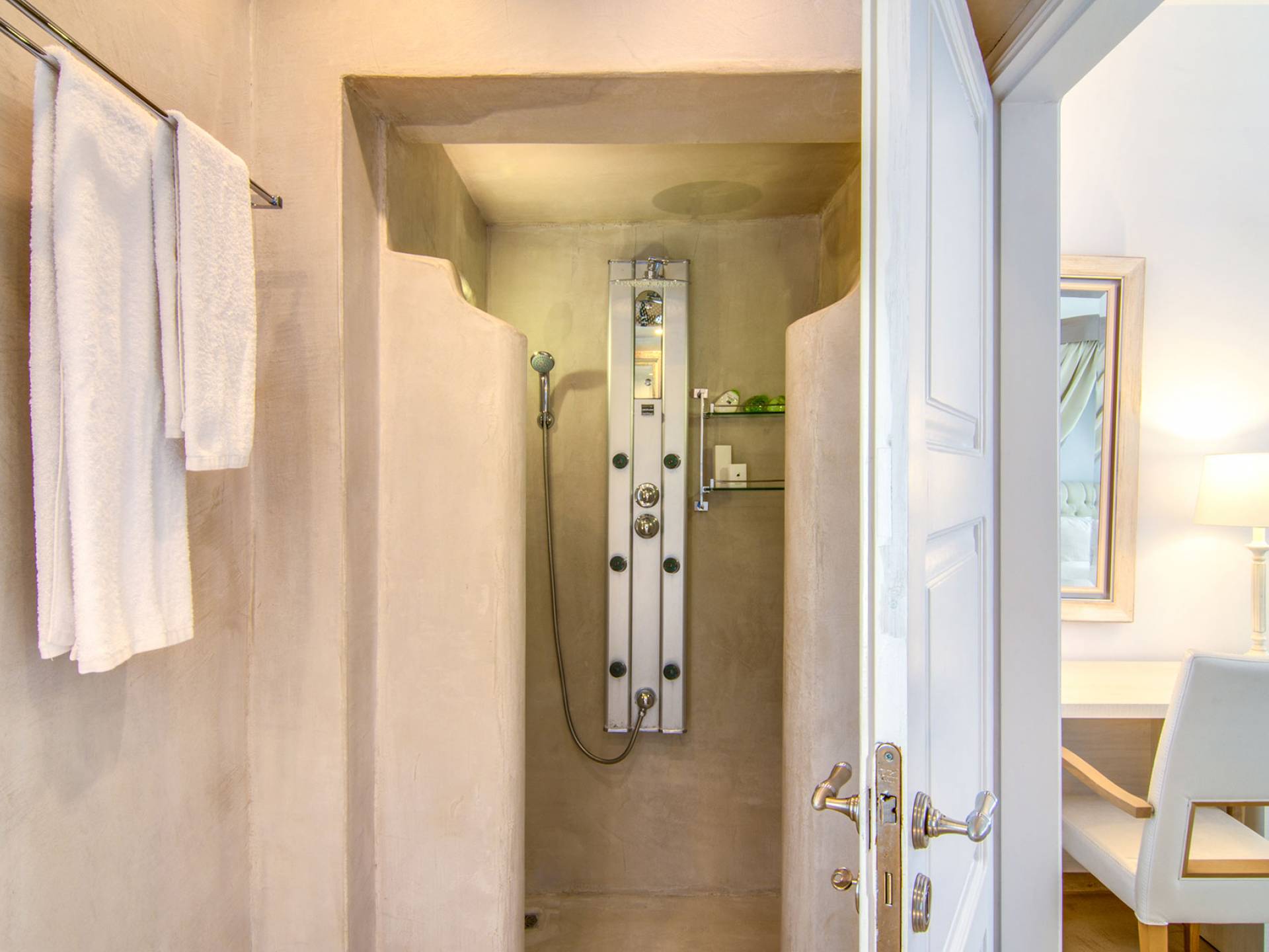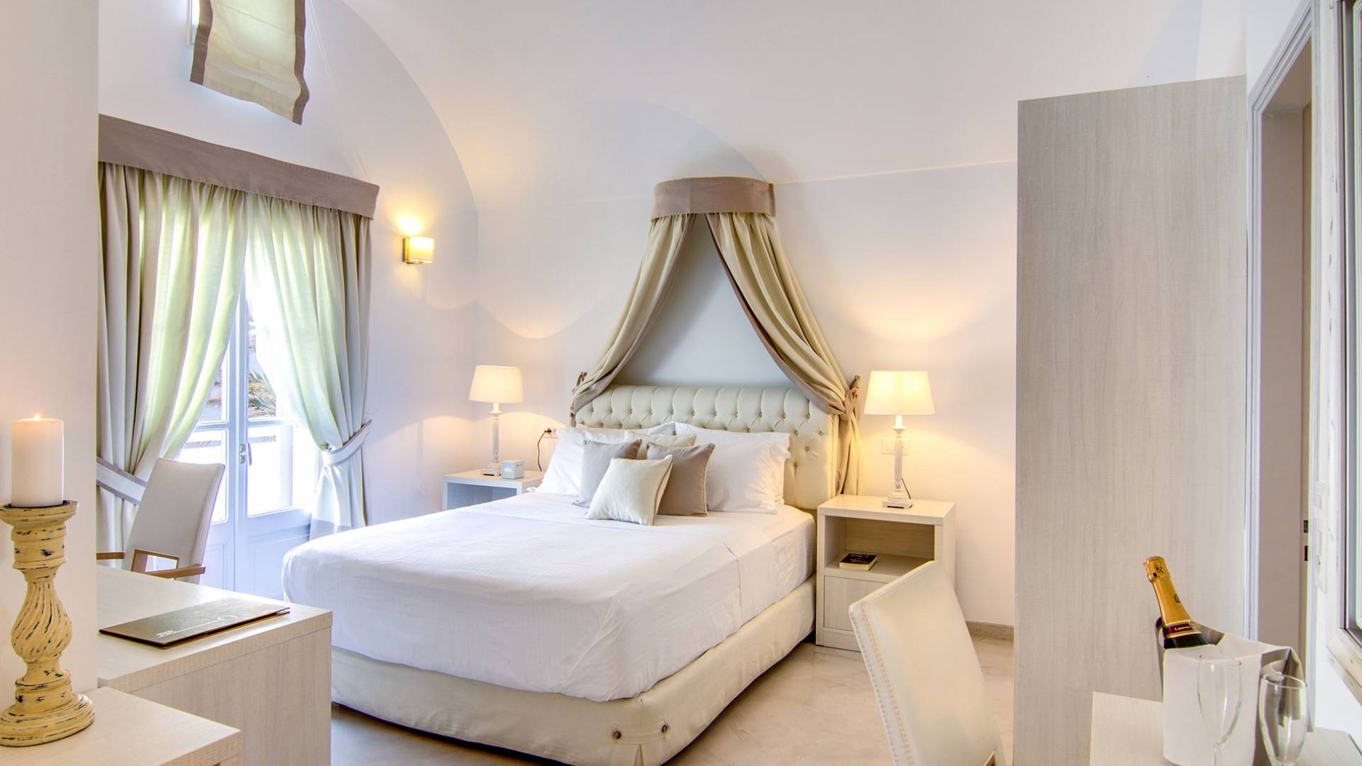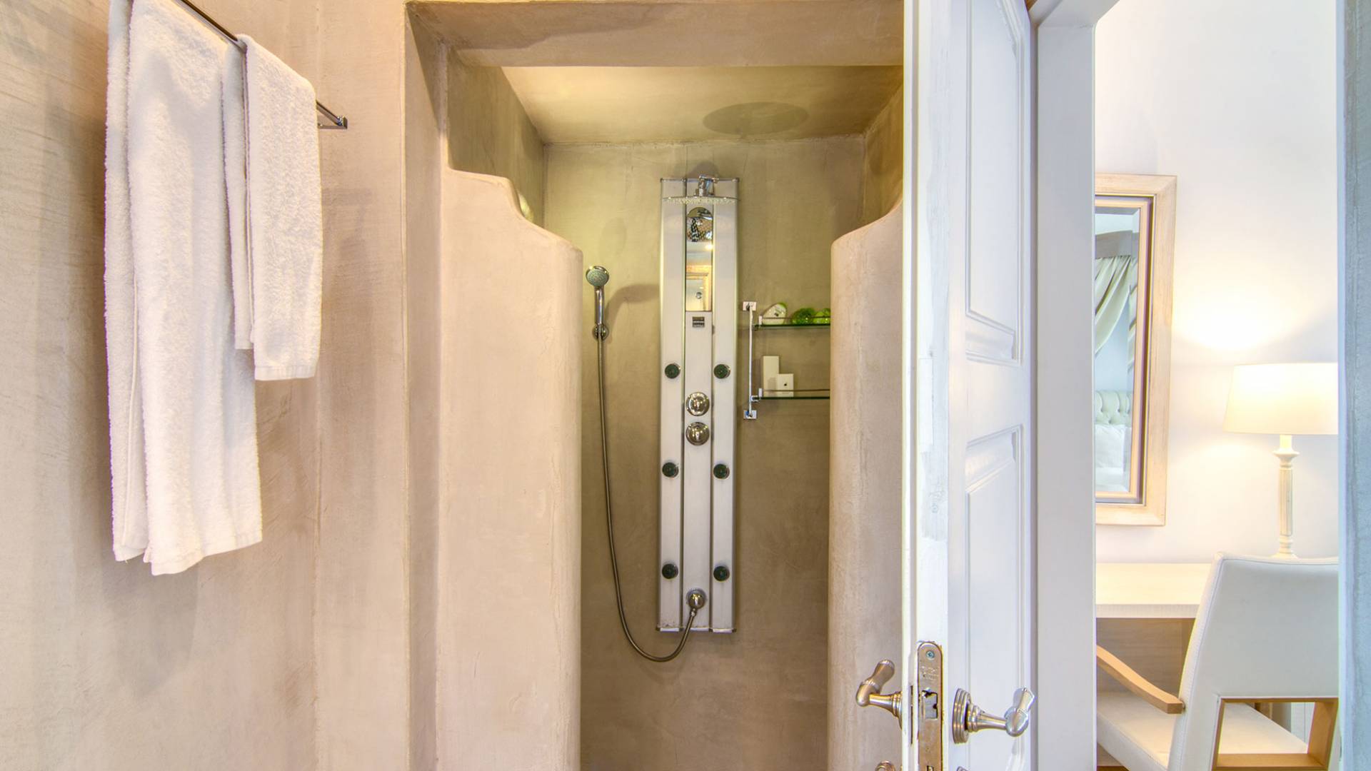 Εξωτερικά: Αίθριο με τραπεζαρία, ξαπλώστρες, υπαίθριο υδρομασάζ, ιδιωτική πισίνα και μερική θέα στη θάλασσα. Ανώτερο επίπεδο: Ευρύχωρο υπνοδωμάτιο με κρεβάτι με ουρανό Queen Size, καθιστικό ενιαίας διαρρύθμισης, ευάερο μπάνιο με Jet Shower. Εξωτερικά: Ευρύχωρη βεράντα με τραπεζαρία, ξαπλώστρες, ιδιωτικό υδρομασάζ και πανοραμική καλντέρα και ανατολική θέα.