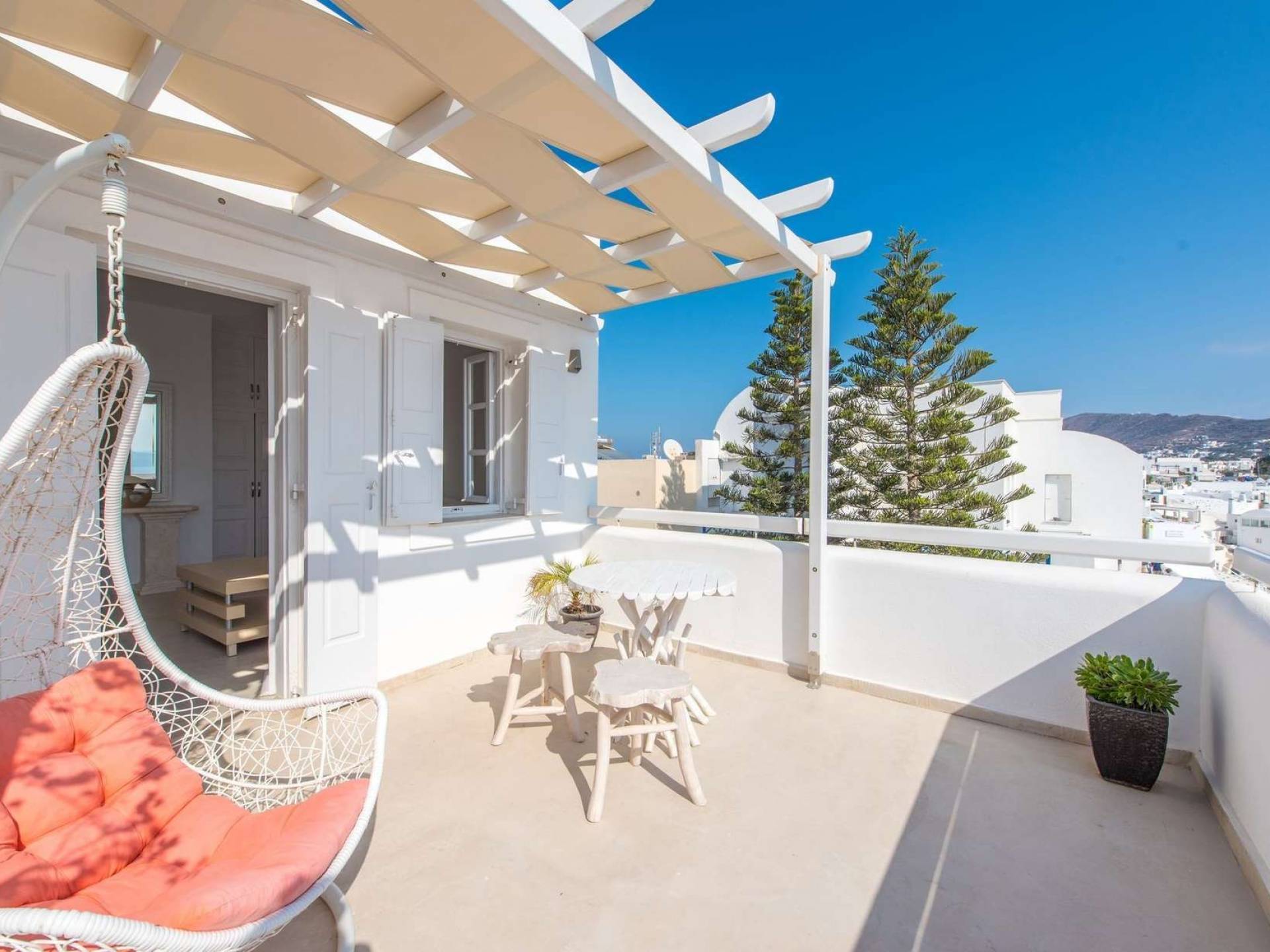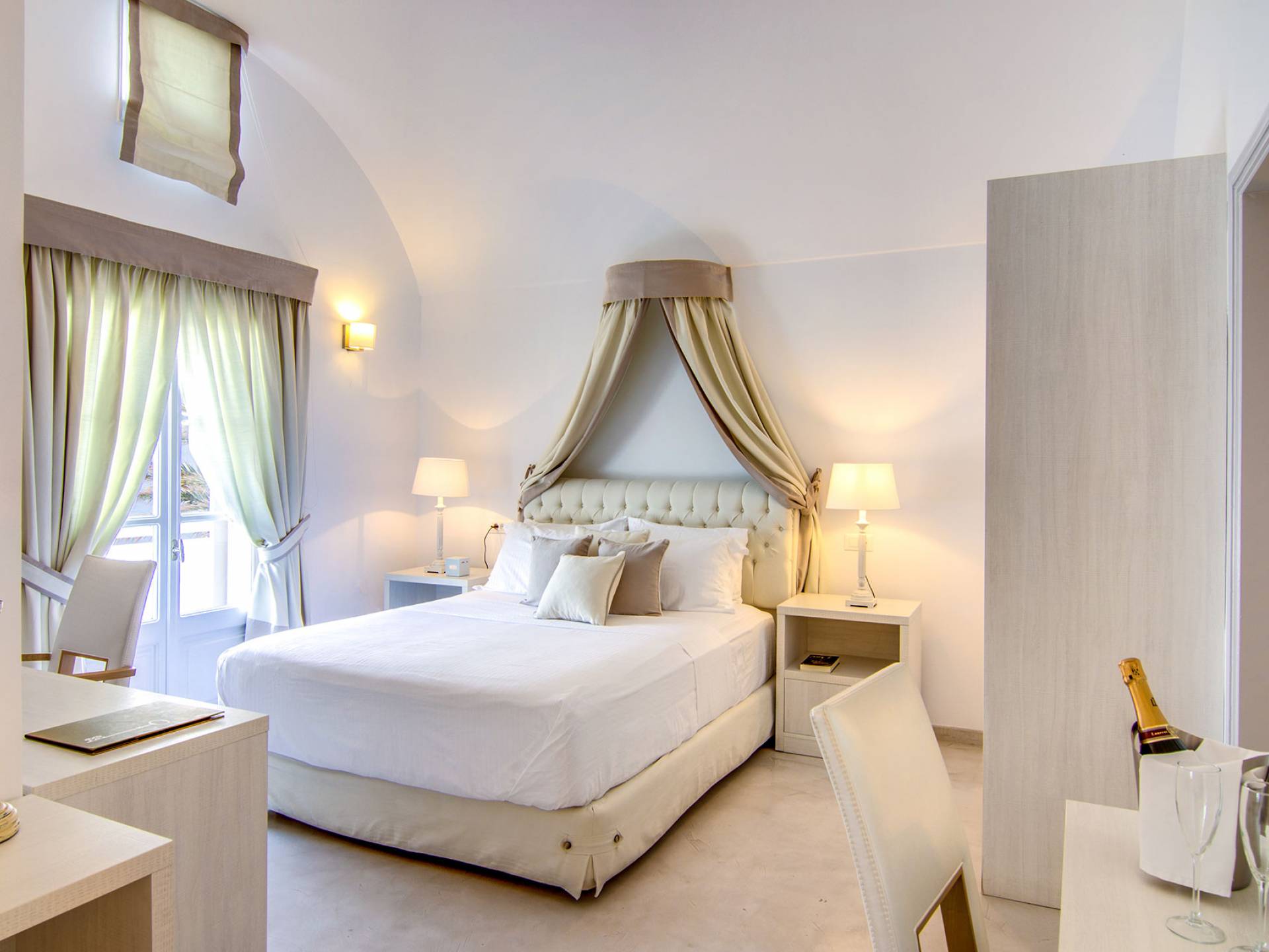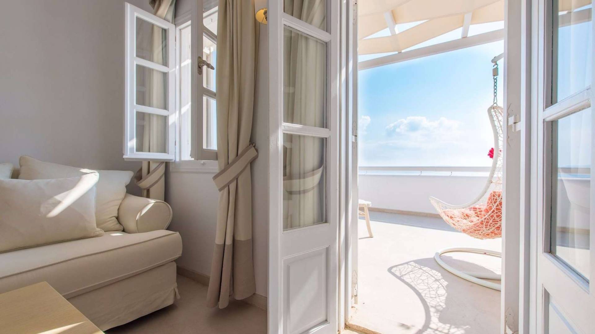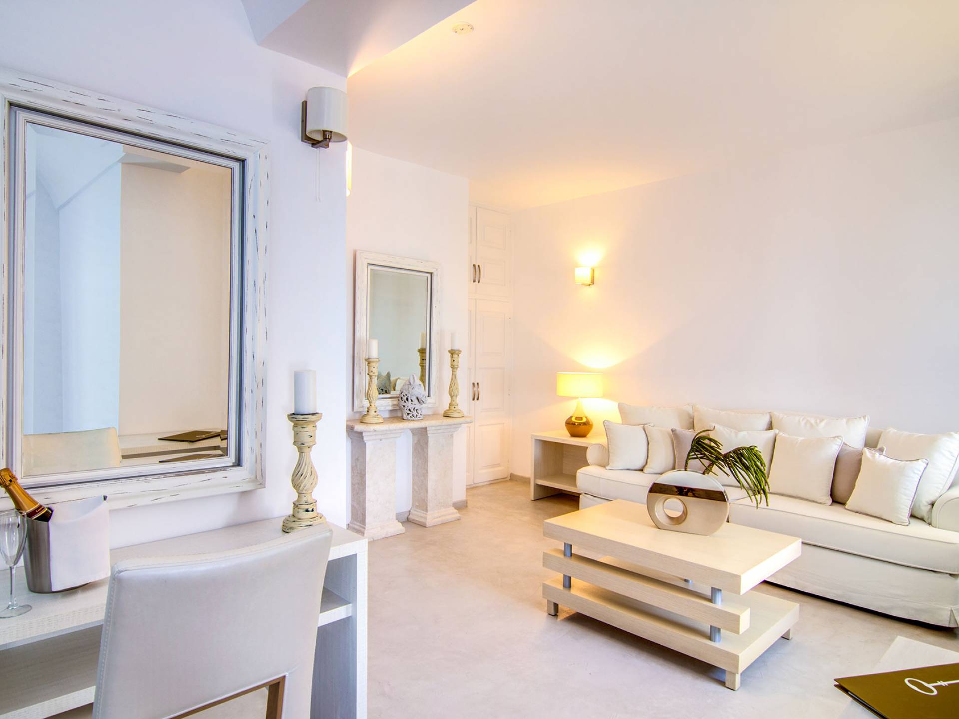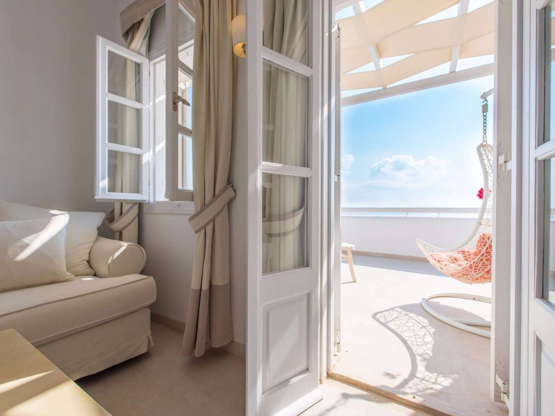 Εξωτερικά: Αίθριο με τραπεζαρία, ξαπλώστρες, υπαίθριο υδρομασάζ, ιδιωτική πισίνα και μερική θέα στη θάλασσα. Ανώτερο επίπεδο: Ευρύχωρο υπνοδωμάτιο με κρεβάτι με ουρανό Queen Size, καθιστικό ενιαίας διαρρύθμισης, ευάερο μπάνιο με Jet Shower. Εξωτερικά: Ευρύχωρη βεράντα με τραπεζαρία, ξαπλώστρες, ιδιωτικό υδρομασάζ και πανοραμική καλντέρα και ανατολική θέα.