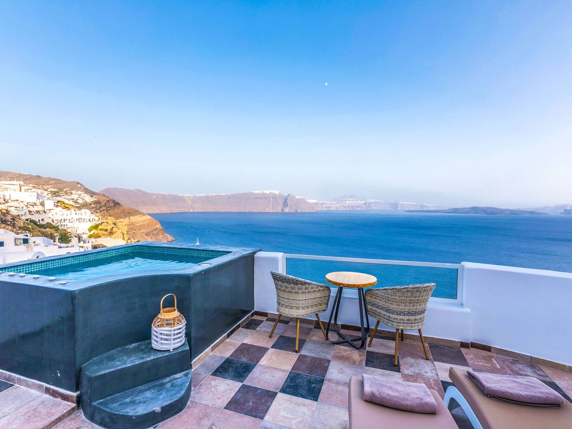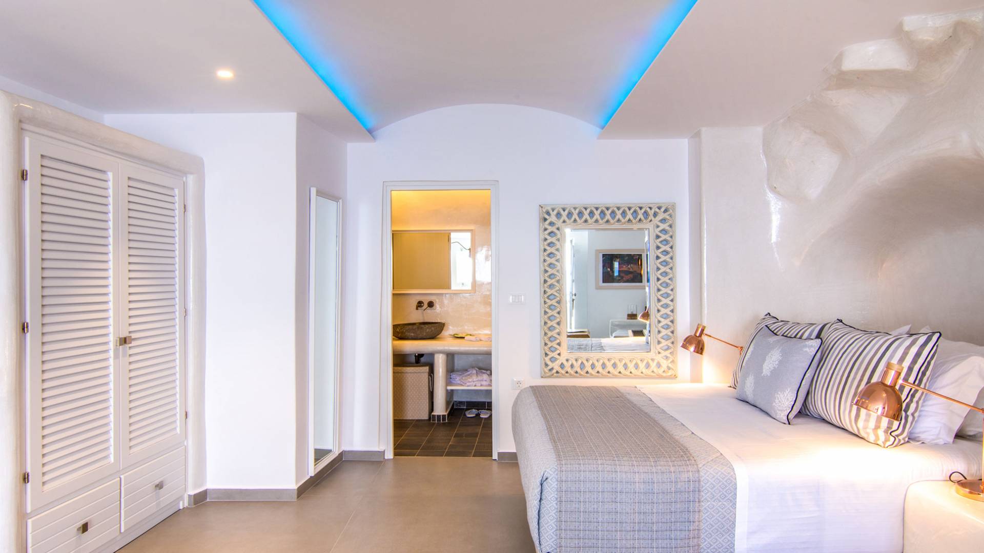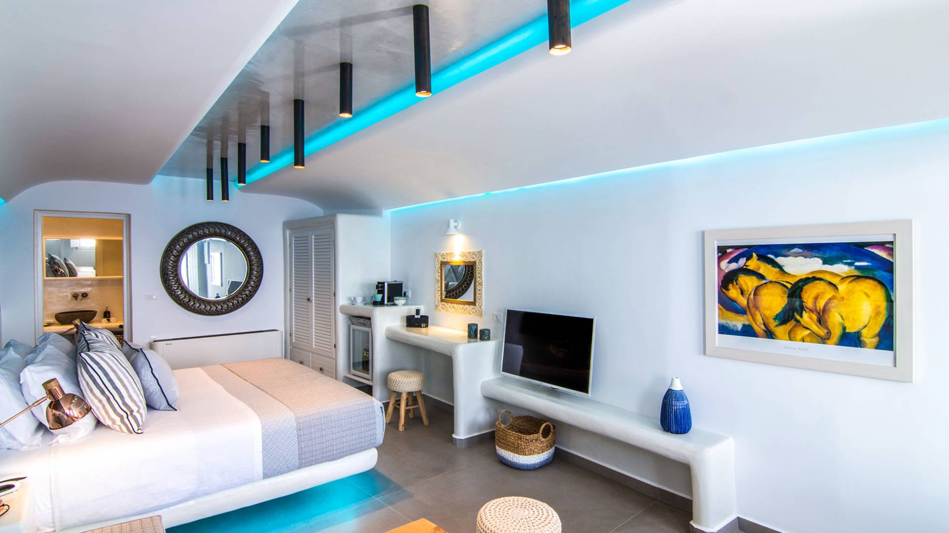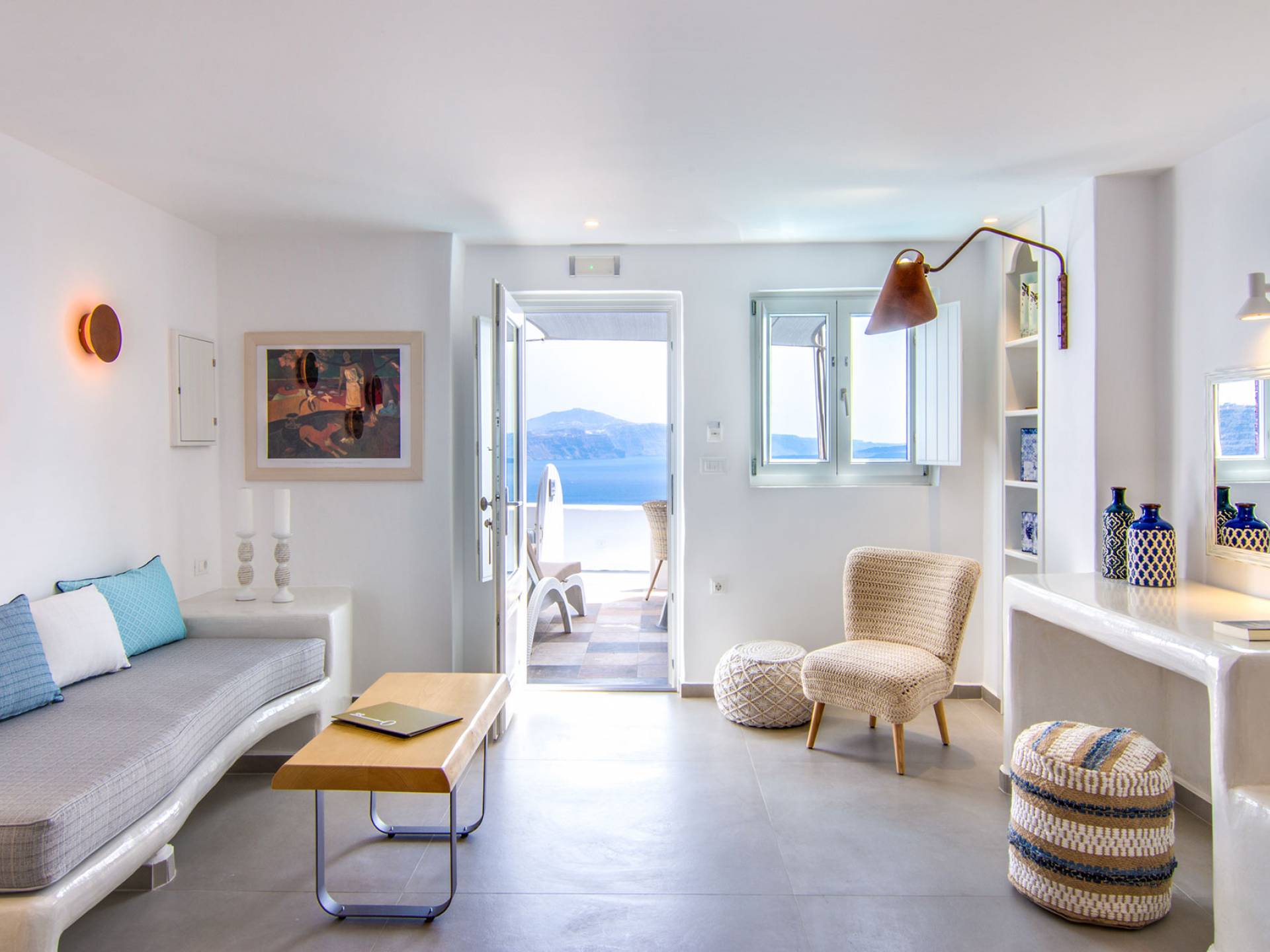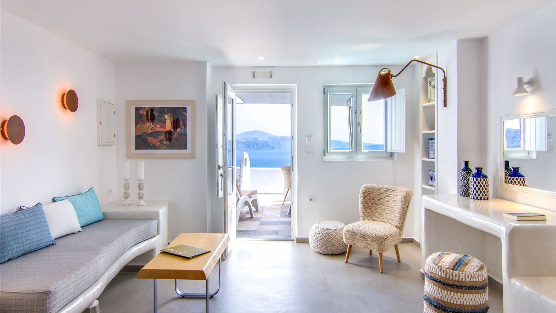Η ηρεμία επιτυγχάνεται εύκολα εδώ. Η απλότητα του σχεδιαστή και οι σύγχρονες ανέσεις σε ένα συγκλονιστικό περιβάλλον δημιουργούν το ιδανικό περιβάλλον για να απολαύσετε πολύτιμες στιγμές χαλάρωσης. Η σουίτα περιλαμβάνει κρεβάτι king-size με επώνυμα λευκά είδη, σαλόνι με όμορφο χτιστό καναπέ. Το μπάνιο είναι χτισμένο με παραδοσιακό τρόπο και διακοσμημένο με εντυπωσιακά, μοναδικά ψηφιδωτά μοτίβα και οι επισκέπτες μπορούν να απολαύσουν ένα ντους ψιλής βροχής με πολυτελή προϊόντα περιποίησης. Για απόλυτη αναζωογόνηση και για άμεση ευεξία, οι επισκέπτες μπορούν να απολαύσουν την εκπληκτική θέα από το εξωτερικό κατάστρωμα που προσφέρει ο εντυπωσιακός βράχος Caldera-meets-sea.