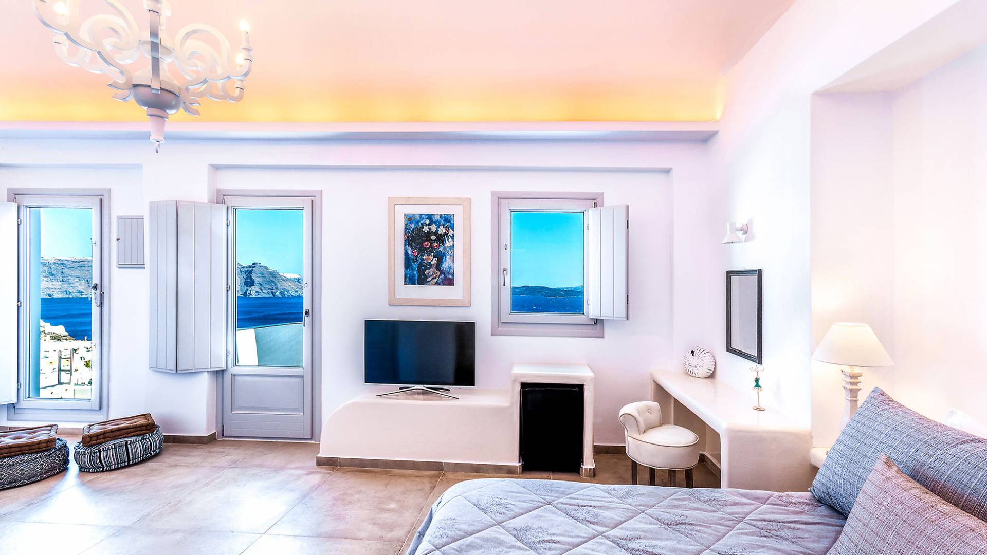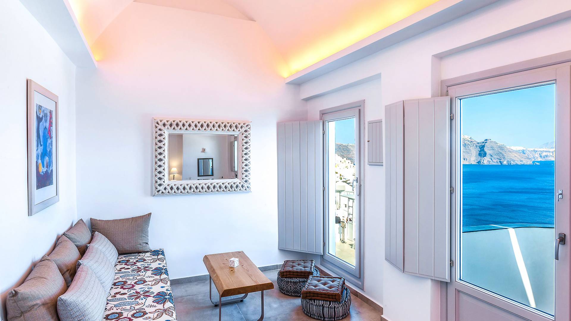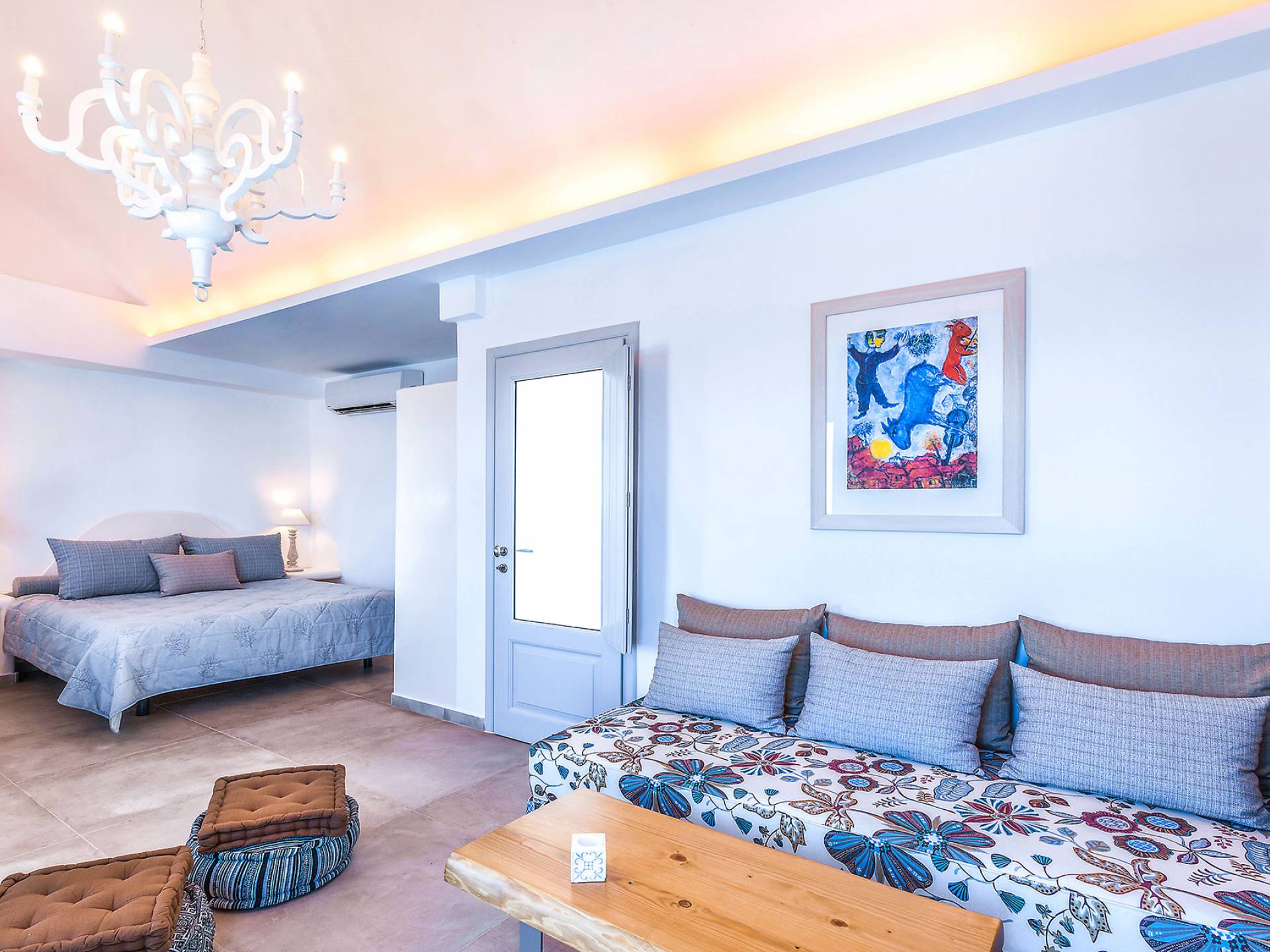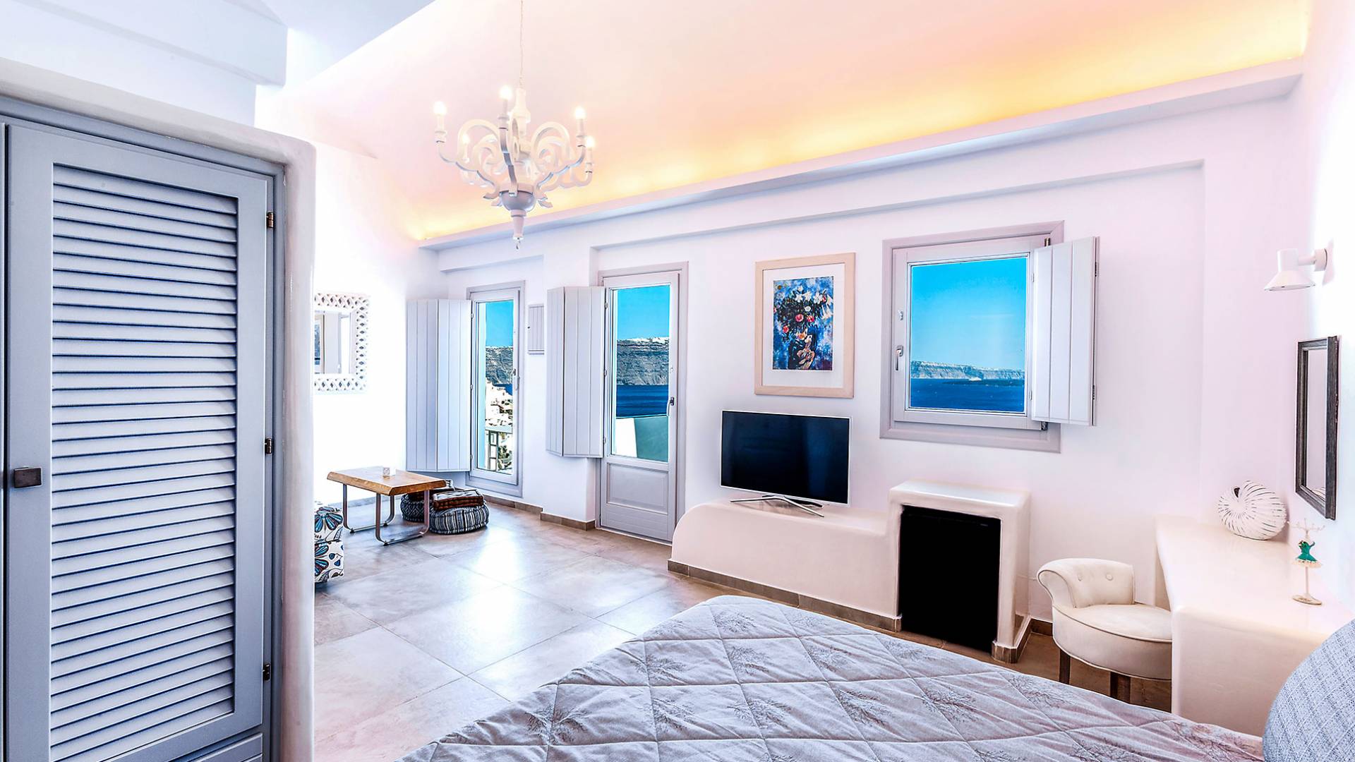 Διαθέτοντας ένα υπερυψωμένο κρεβάτι king size από επώνυμα λευκά είδη και την υπογραφή μας, πάντα άνετο στρώμα "Secret", η σουίτα διαθέτει επίσης lounge για μεγαλύτερη άνεση και όμορφο, παραδοσιακό χτιστό μπάνιο με περίπλοκα μωσαϊκά πλακάκια και πολυτελή προϊόντα περιποίησης . Το να αδράξετε τη μέρα σας έρχεται εύκολα εδώ, καθώς οι επισκέπτες απολαμβάνουν ένα δωρεάν πρωινό στην ιδιωτικότητα αυτής της σουίτας ή στο μπαλκόνι τους, απολαμβάνοντας τις φρέσκες γεύσεις ενός πλούσιου γεύματος και απολαμβάνοντας την τραγανότητα ενός Σαντορινιακού πρωινού.