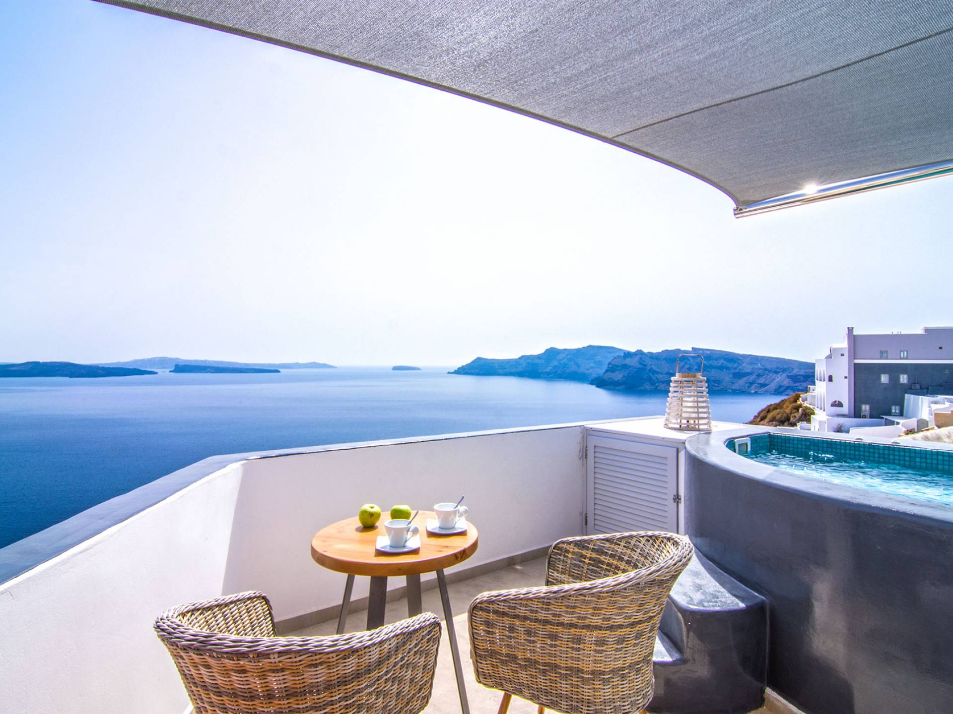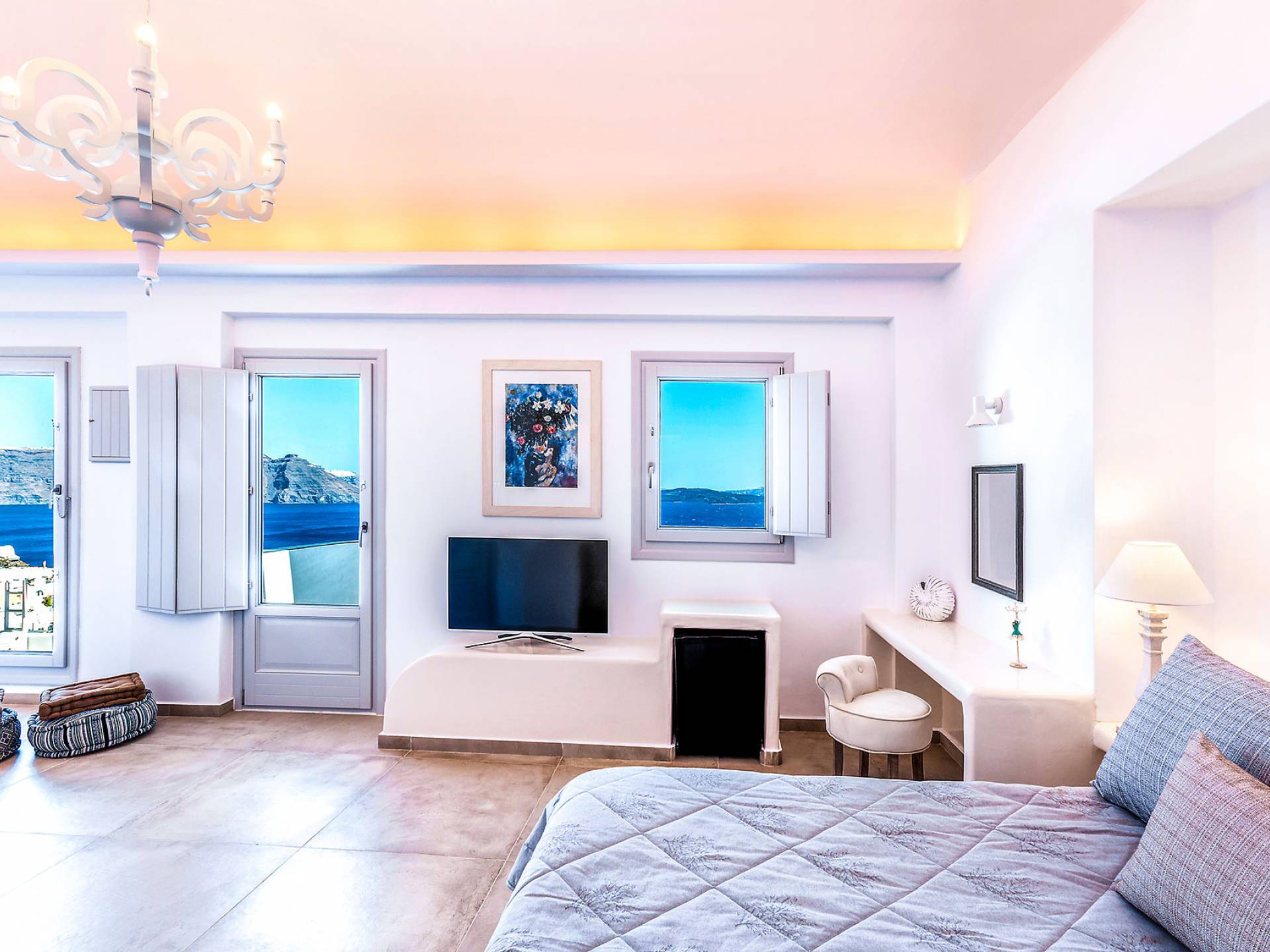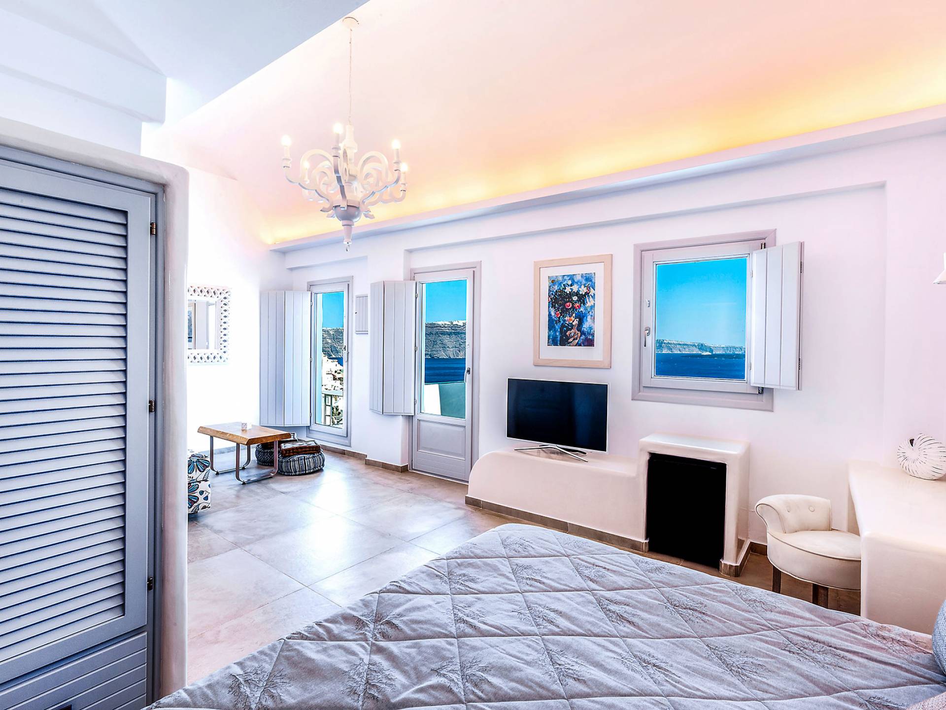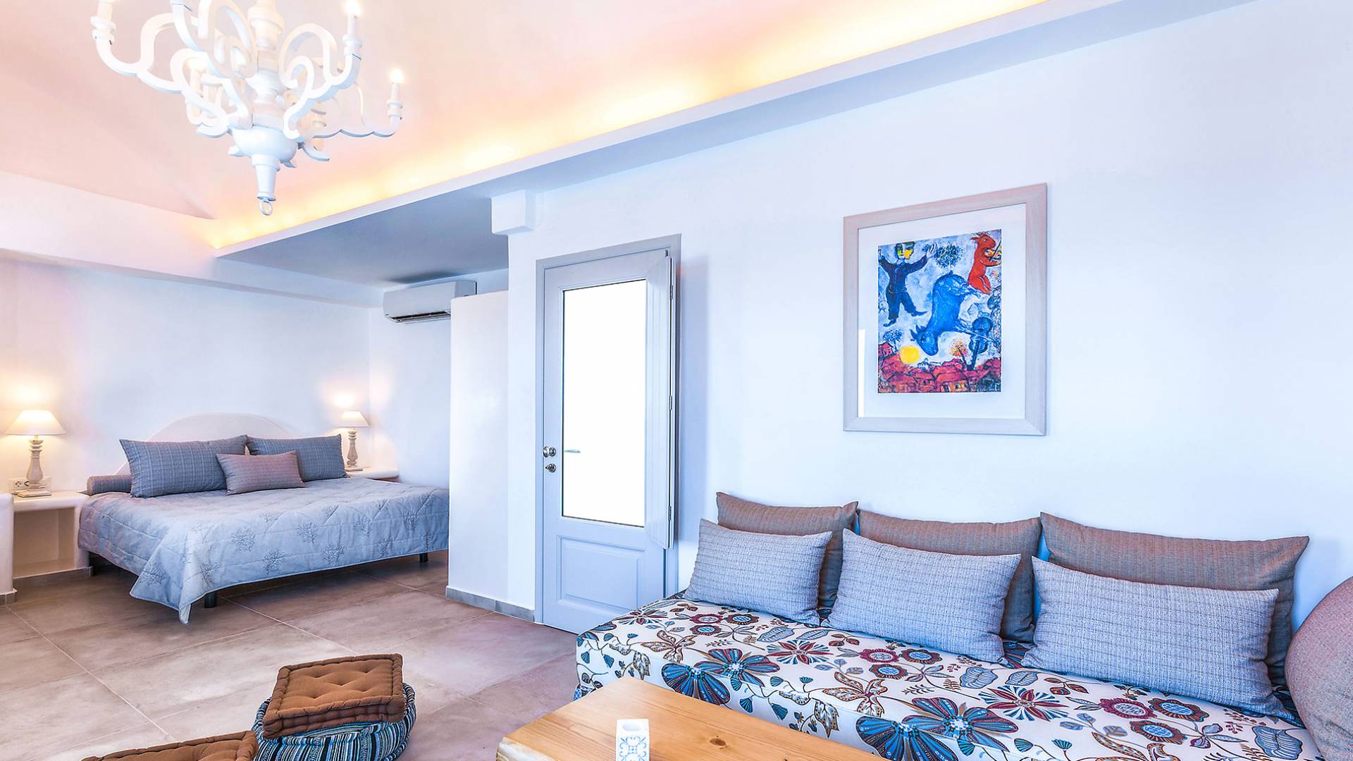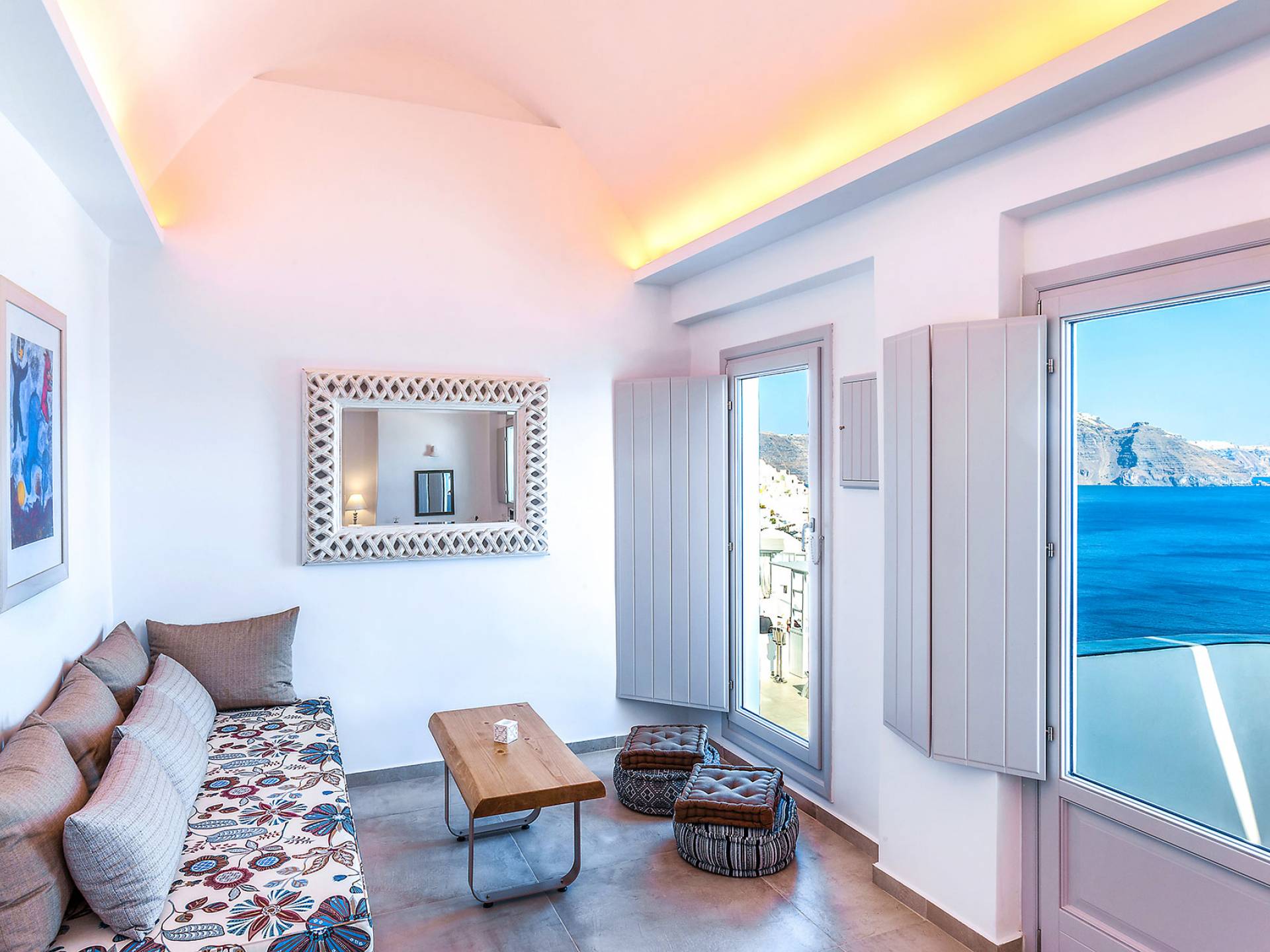 Διαθέτοντας ένα υπερυψωμένο κρεβάτι king size από επώνυμα λευκά είδη και την υπογραφή μας, πάντα άνετο στρώμα "Secret", η σουίτα διαθέτει επίσης lounge για μεγαλύτερη άνεση και όμορφο, παραδοσιακό χτιστό μπάνιο με περίπλοκα μωσαϊκά πλακάκια και πολυτελή προϊόντα περιποίησης . Το να αδράξετε τη μέρα σας έρχεται εύκολα εδώ, καθώς οι επισκέπτες απολαμβάνουν ένα δωρεάν πρωινό στην ιδιωτικότητα αυτής της σουίτας ή στο μπαλκόνι τους, απολαμβάνοντας τις φρέσκες γεύσεις ενός πλούσιου γεύματος και απολαμβάνοντας την τραγανότητα ενός Σαντορινιακού πρωινού.
