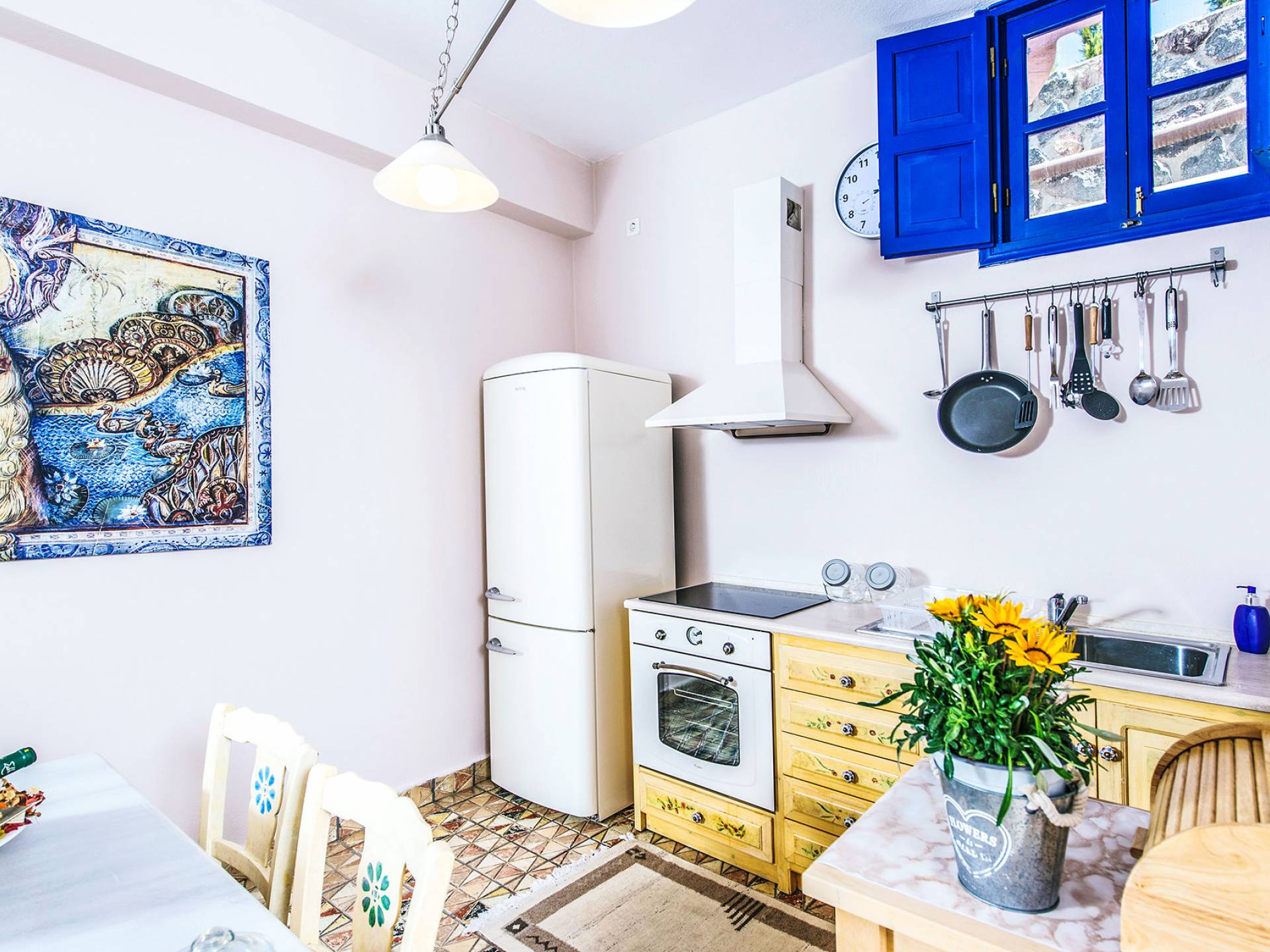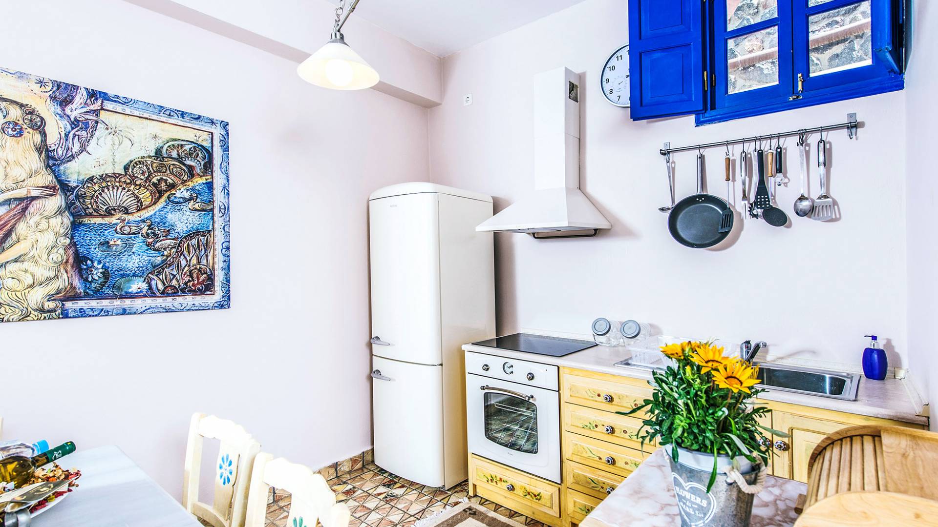 Υπάρχει μια πλήρως εξοπλισμένη κουζίνα με μπλέντερ, ηλεκτρική σχάρα, ηλεκτρική κουζίνα, ψυγείο, τοστιέρα, φίλτρο και καφετιέρα nespresso, βραστήρας, πιάτα, μαγειρικά σκεύη, είδη ντουλάπι και άλλες σύγχρονες ανέσεις, καθώς και μικρή κουζίνα. Επίσης, υπάρχουν δύο τραπεζαρίες, για 6 άτομα το καθένα. Υπάρχει ένα μπάνιο σε κάθε επίπεδο, εξοπλισμένο με τουαλέτα, ντους, πετσέτες μπάνιου, υποαλλεργικό σαμπουάν και αφρόλουτρο, στεγνωτήρα μαλλιών, παροχή 220V σε ξυριστική μηχανή και πλυντήριο ρούχων.