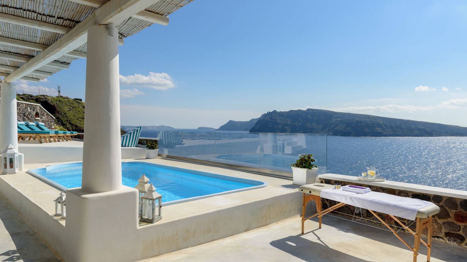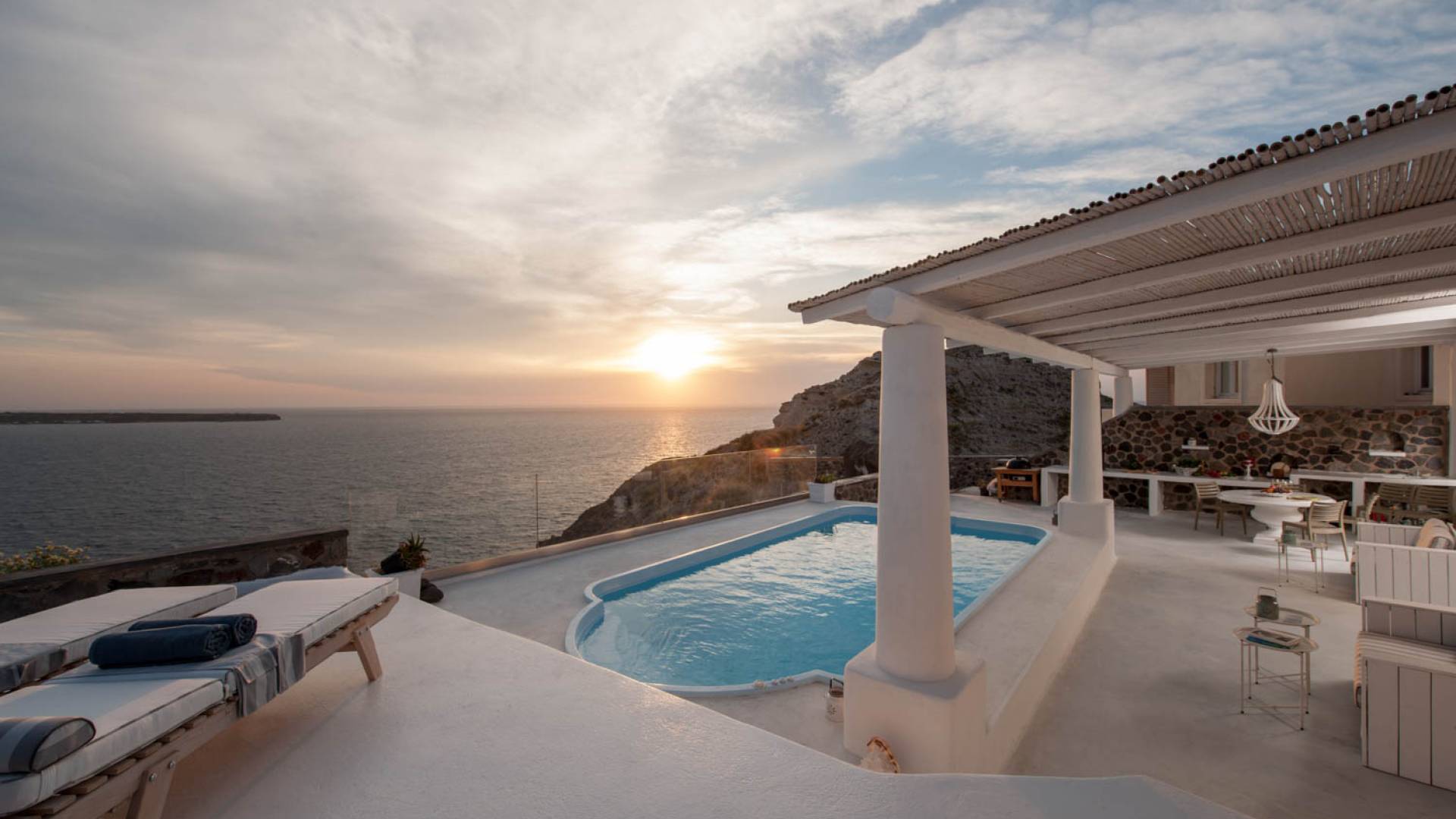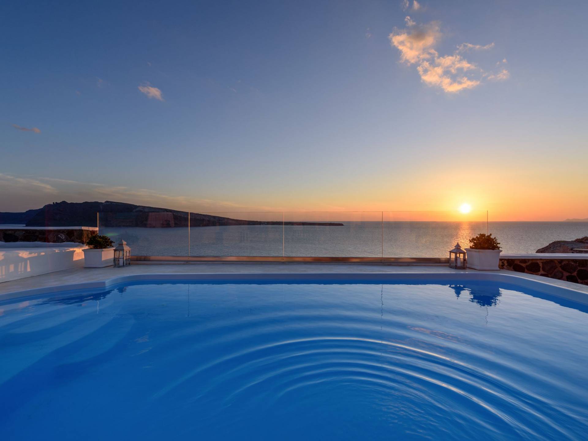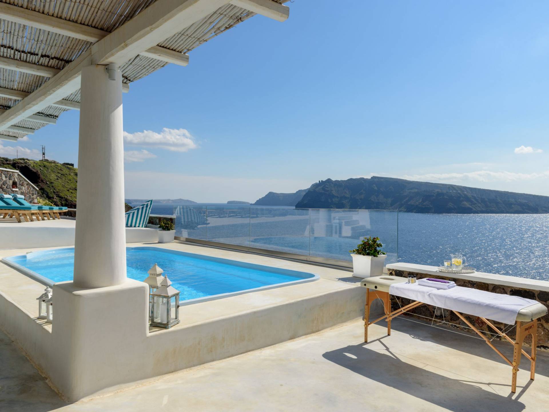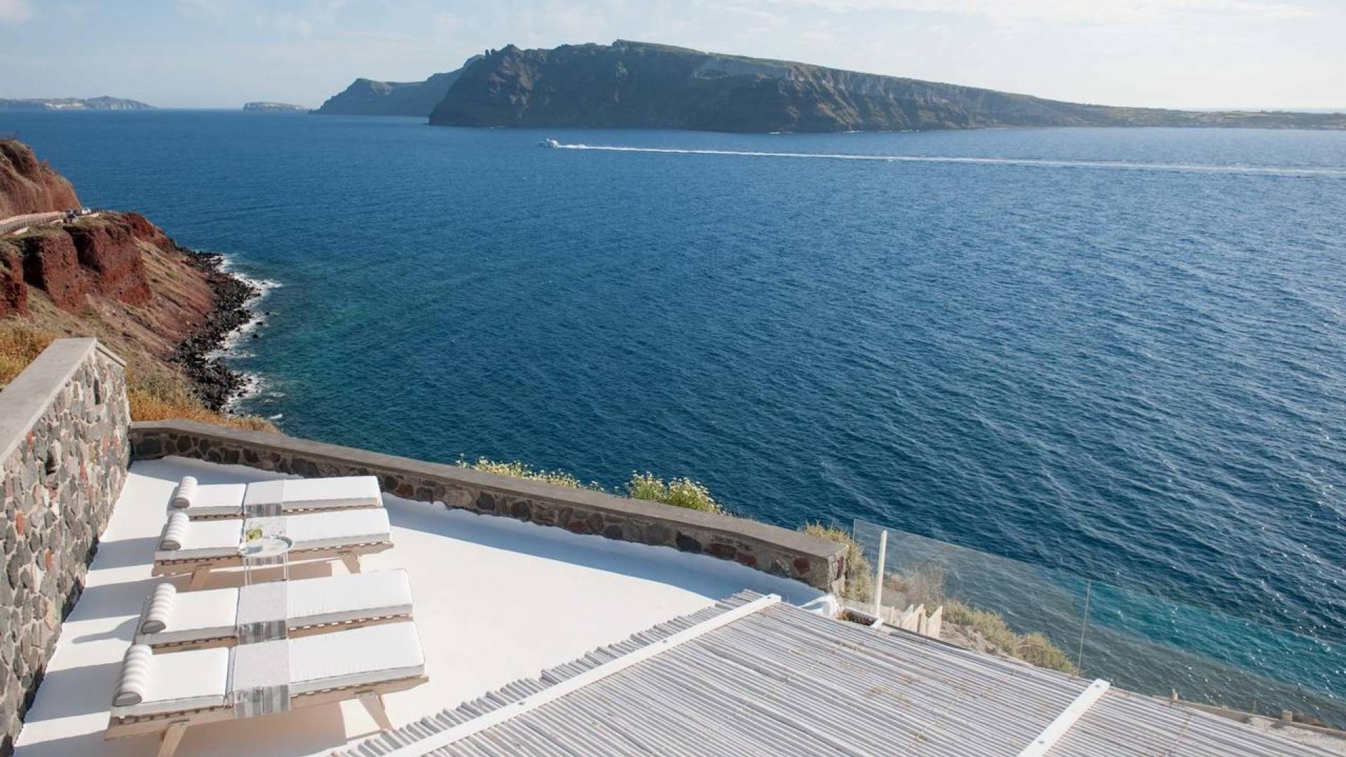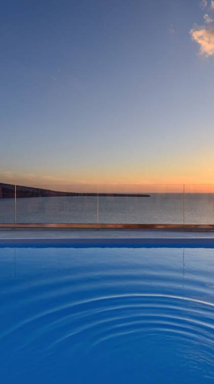 Επιπλέον, μπορείτε να απολαύσετε την όμορφη θέα στη θάλασσα από κάτω, από κάθε σημείο του εσωτερικού. Η γύρω αυλή, ακριβώς πάνω από τον γκρεμό της καλντέρας, με την ιδιωτική πισίνα, προσφέρει πολυτέλεια και άνεση.