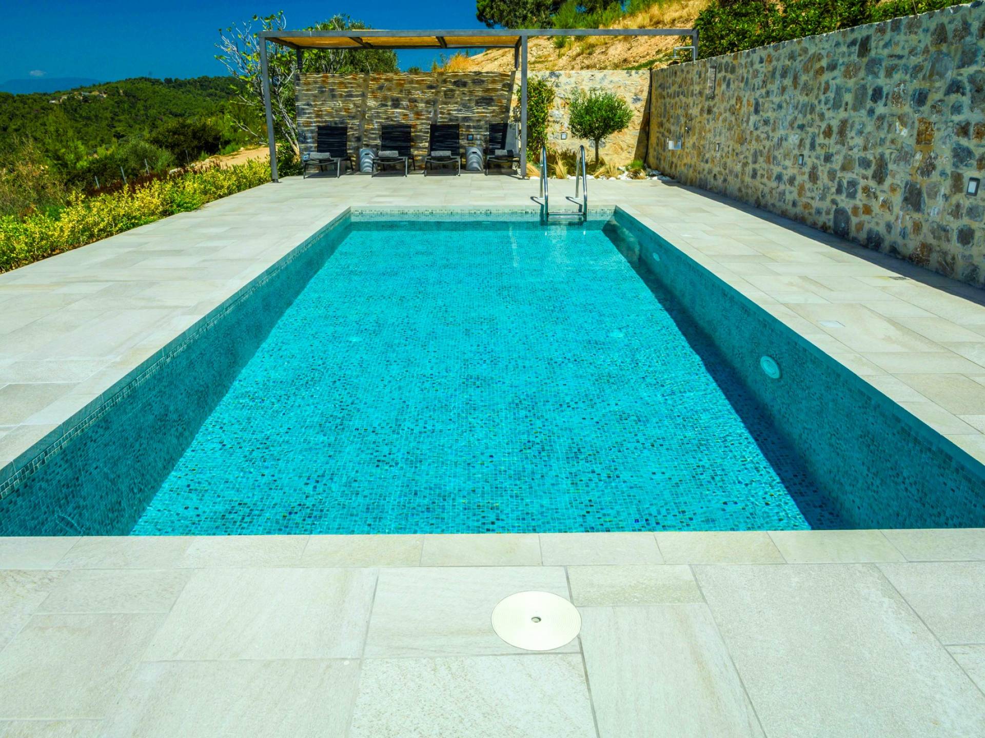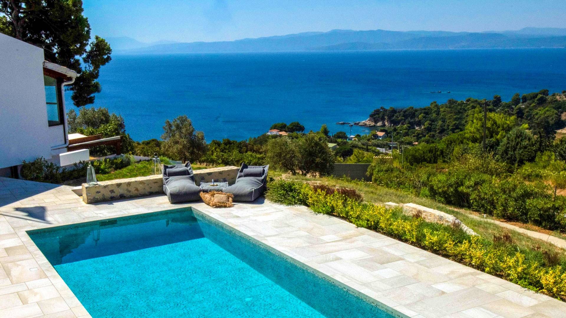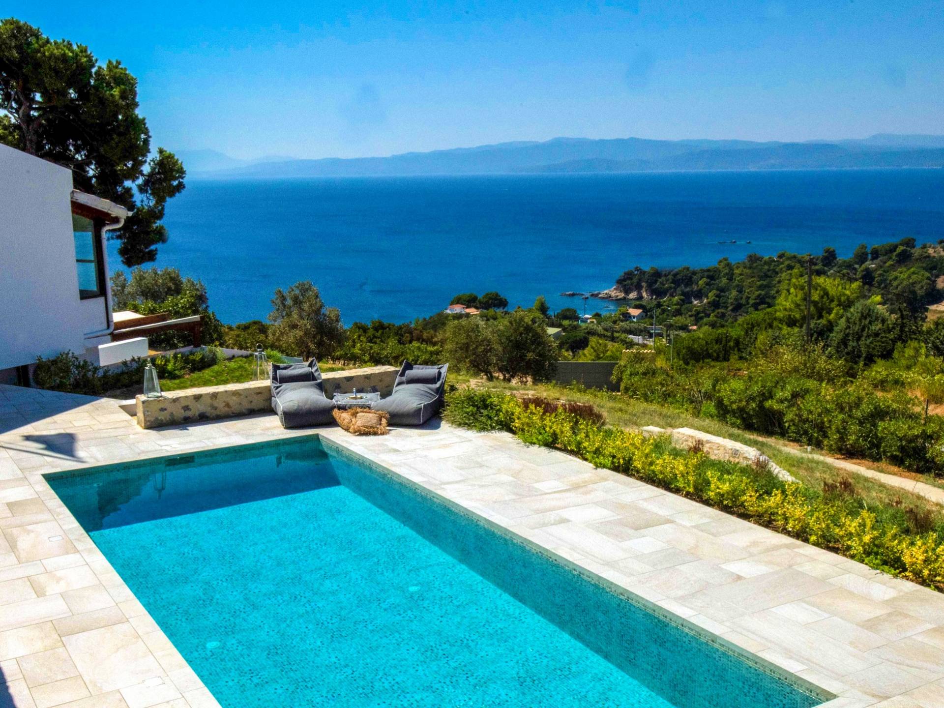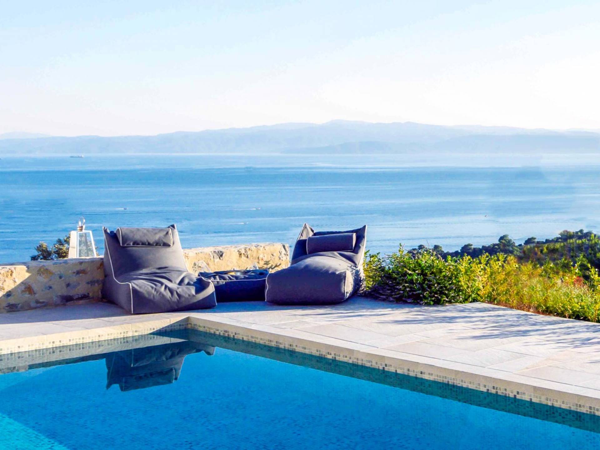 Η ιδιωτική πισίνα βρίσκεται δίπλα στο Skiathea Villa A Skiathos. Το γαλάζιο του κοβαλτίου της πισίνας βλέπει στο απέραντο γαλάζιο του Αιγαίου.