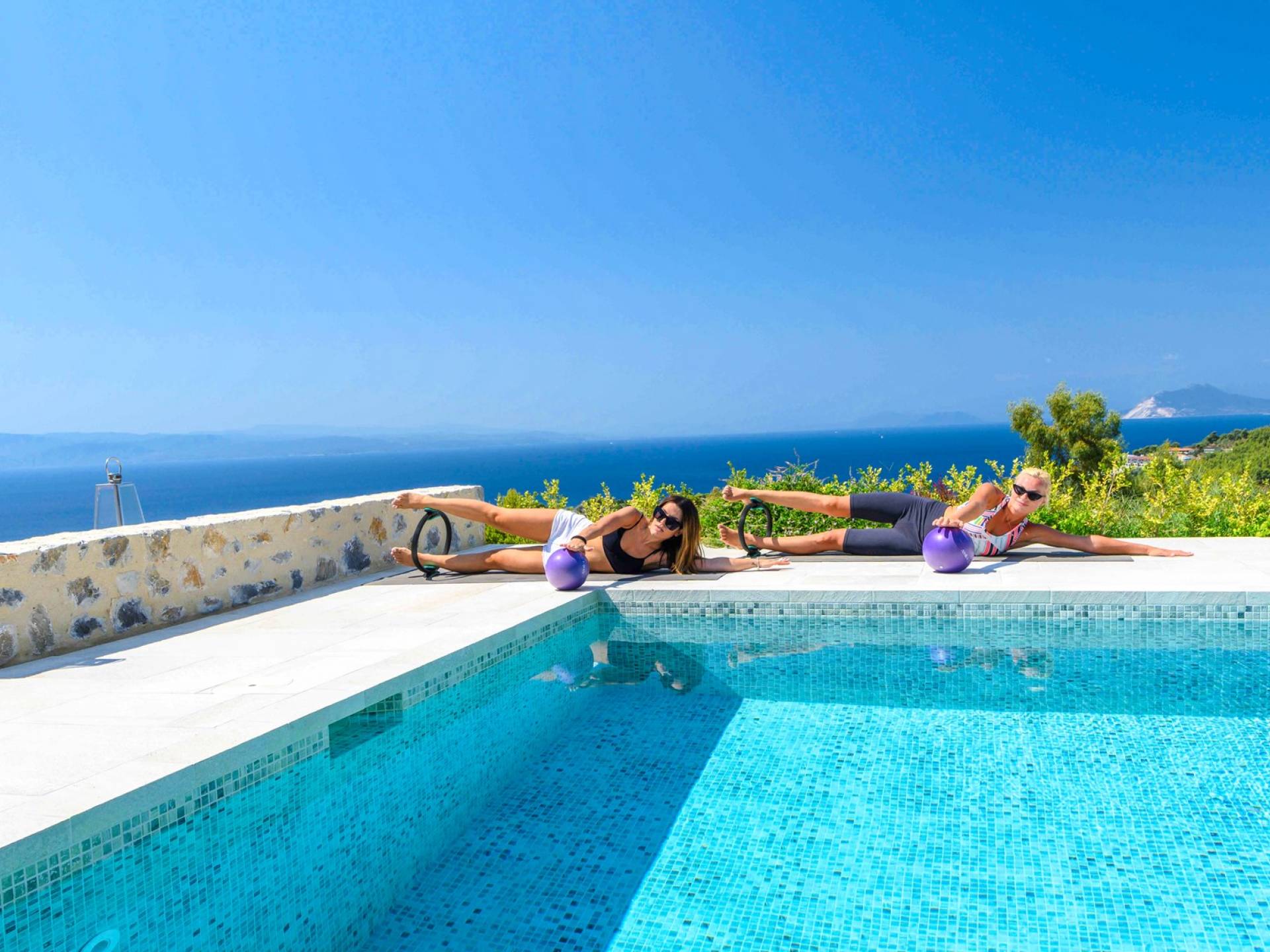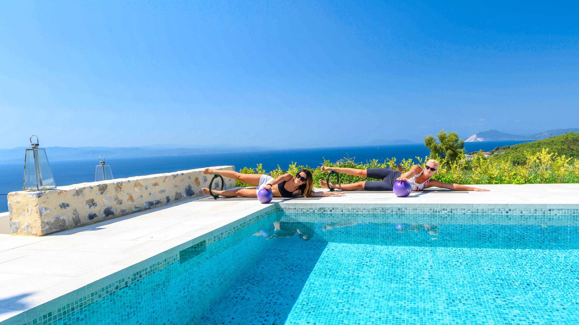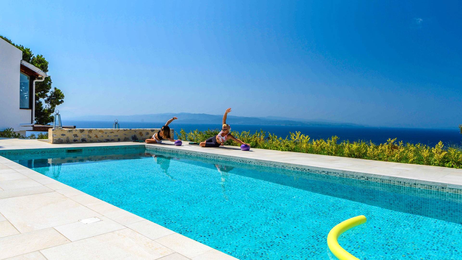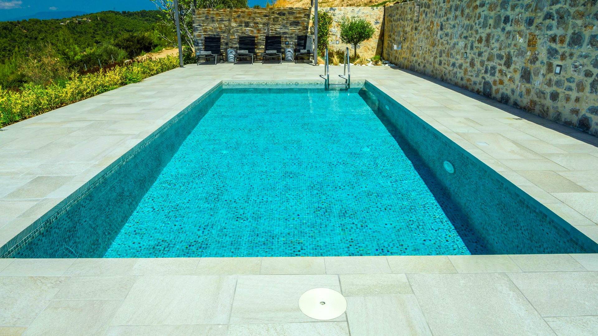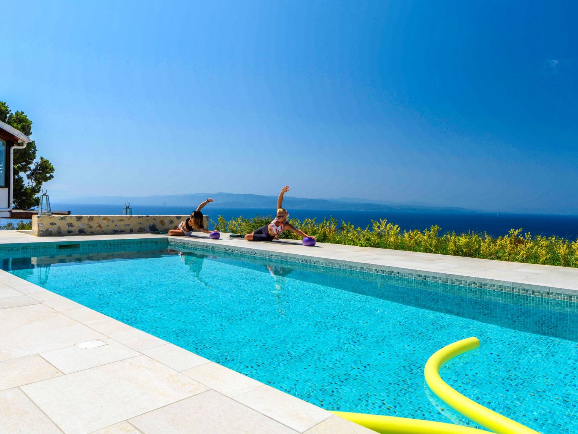 Η ιδιωτική πισίνα βρίσκεται δίπλα στο Skiathea Villa A Skiathos. Το γαλάζιο του κοβαλτίου της πισίνας βλέπει στο απέραντο γαλάζιο του Αιγαίου.