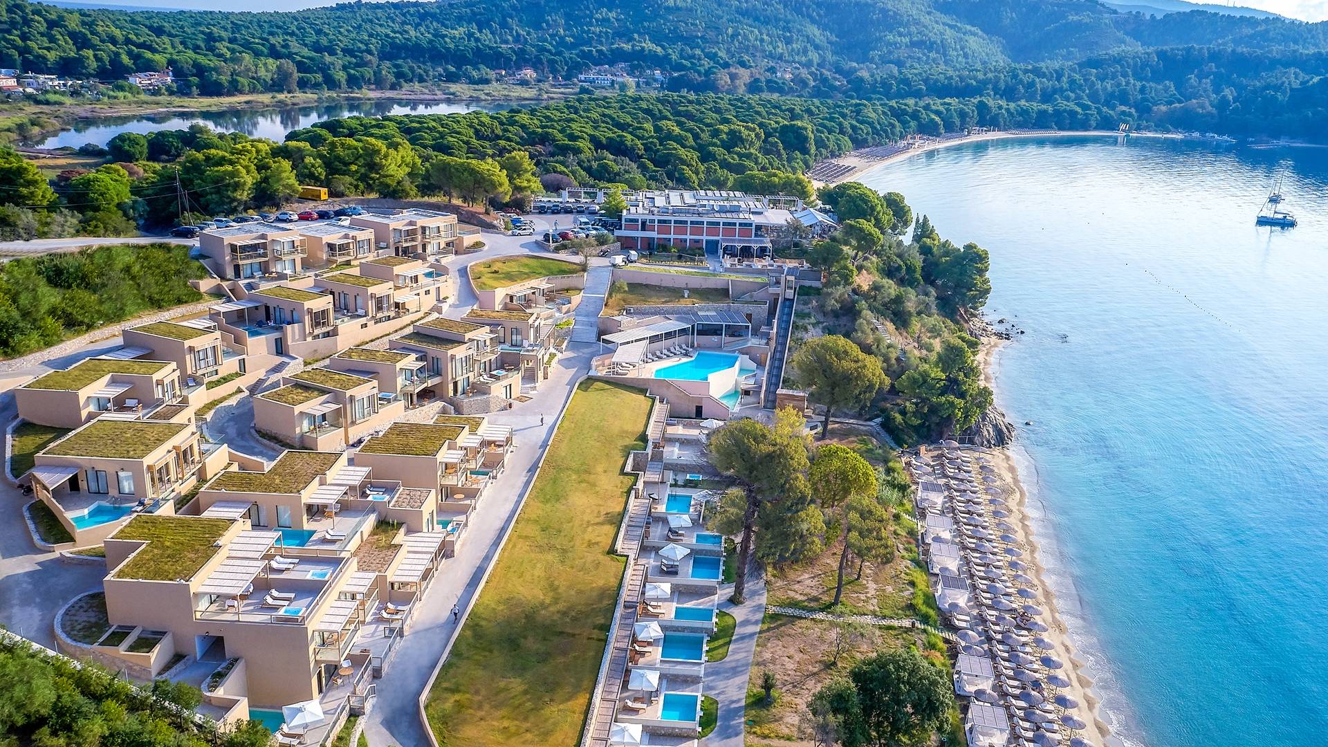 Αυτά τα 67 δωμάτια και οι σουίτες κάθονται χαλαρά βήματα μακριά από τη λευκή άμμο της παραλίας Αμπελάκια, μια προέκταση της διάσημης παραλίας Κουκουναριές, που αγκαλιάζονται από τα κύματα, μέσα σε ένα τοπίο απαράμιλλης φυσικής ομορφιάς. Η αρχιτεκτονική είναι εμπνευσμένη από την κομψότητα και την υπερηφάνεια ενός ντόπιου «επισκέπτη», του μαύρου κύκνου, που αναδύεται συνήθως τις ώρες του ηλιοβασιλέματος, για να μας υπενθυμίσει το μεγαλείο και το μεγαλείο της φύσης.