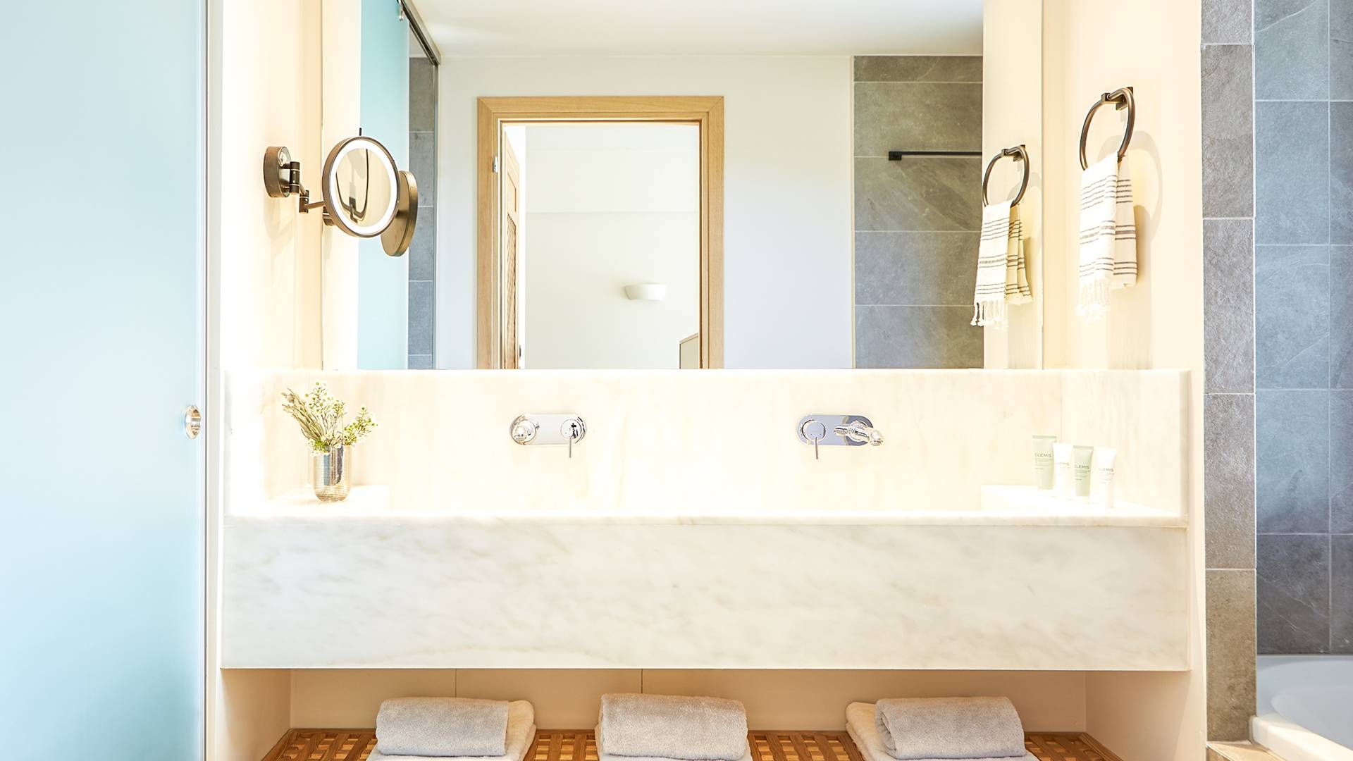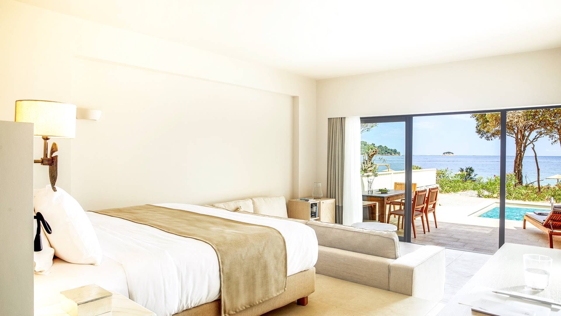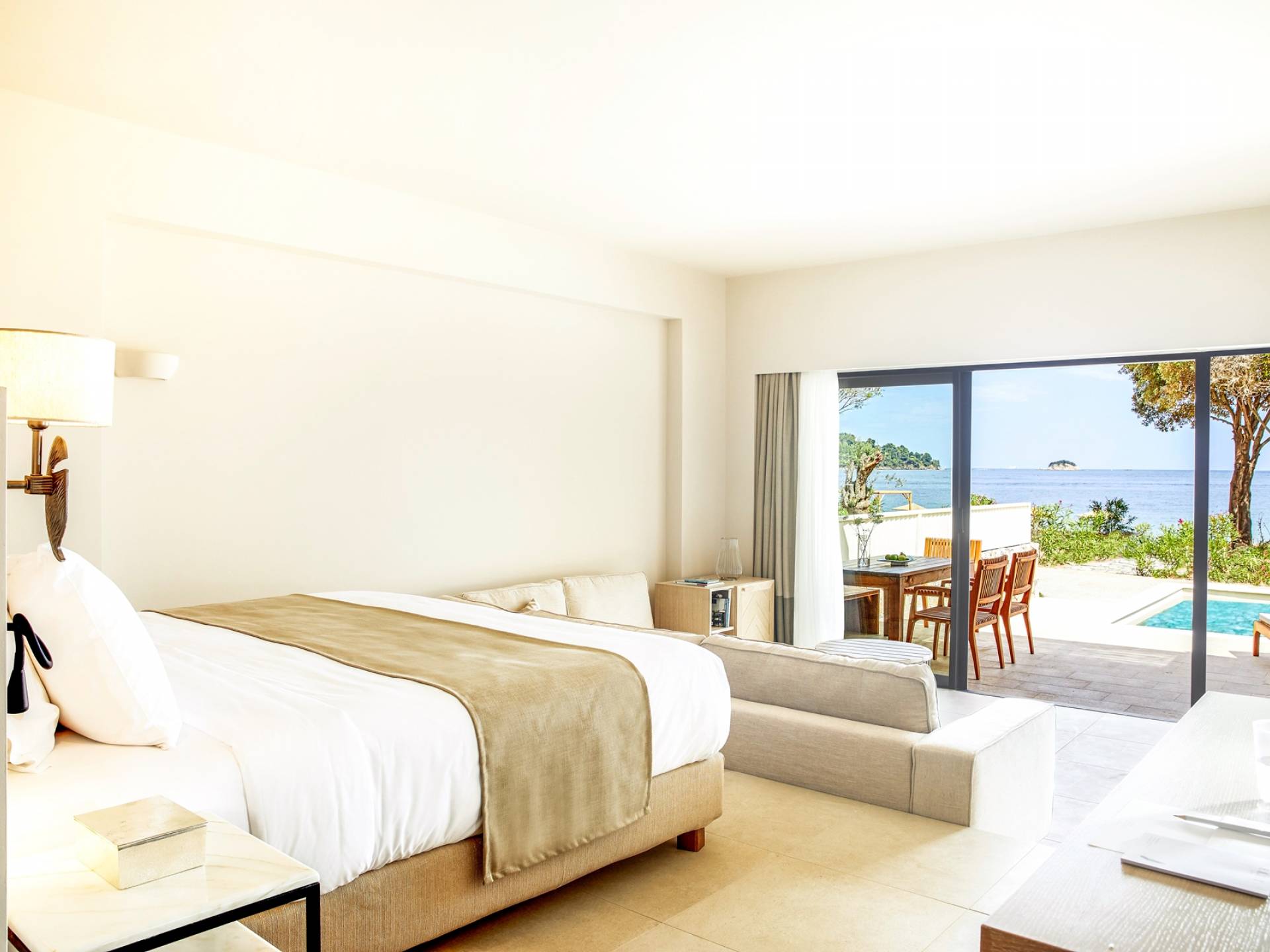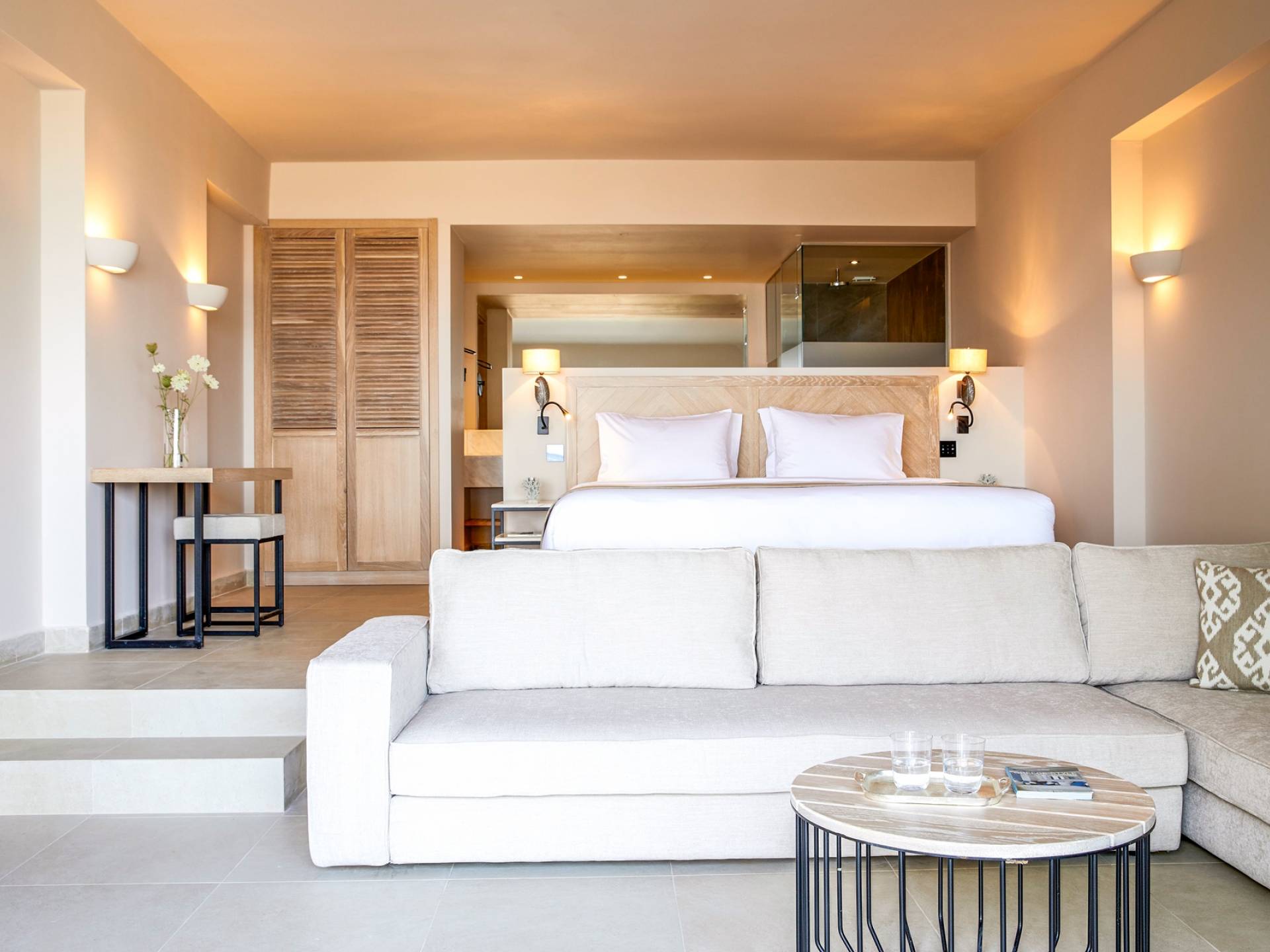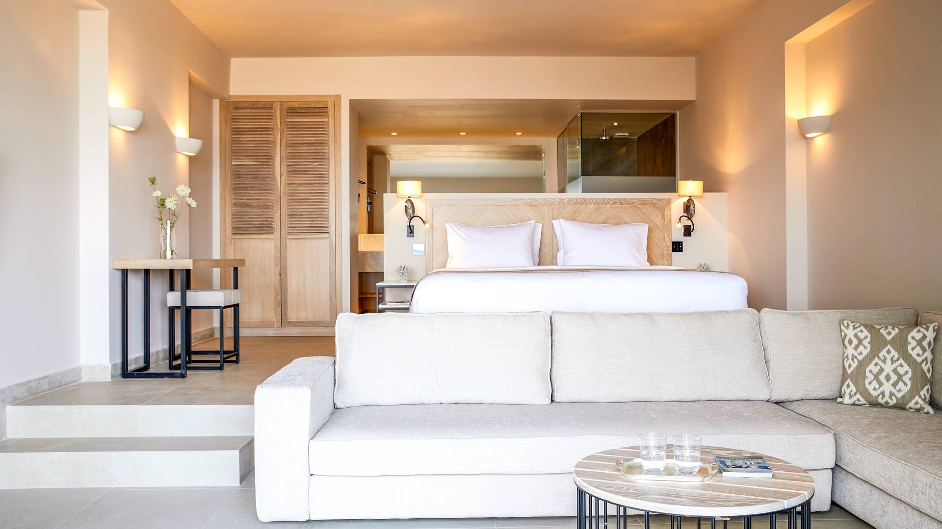 Ευρύχωρο 43 m2. σουίτα με ενιαίο μεγάλο υπνοδωμάτιο και καθιστικό. Η υπαίθρια τραπεζαρία, οι ξαπλώστρες, η μικρή πισίνα και ο κήπος συμπληρώνουν το τοπίο απαράμιλλης ηρεμίας και χαλάρωσης.
