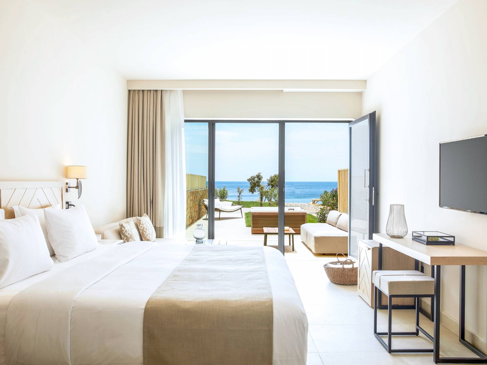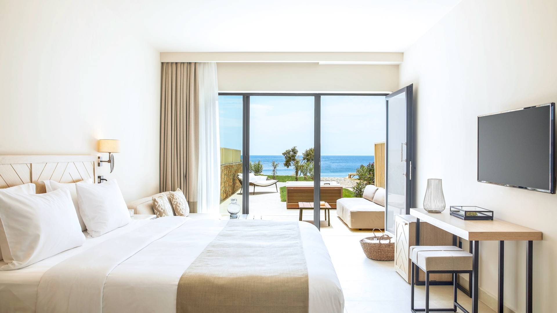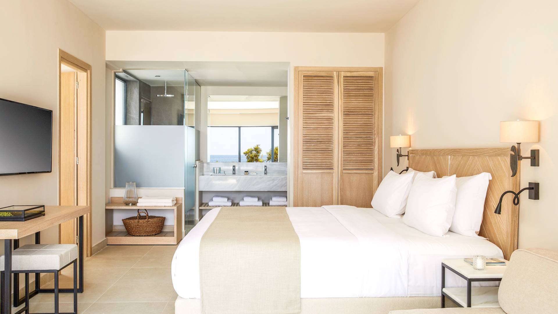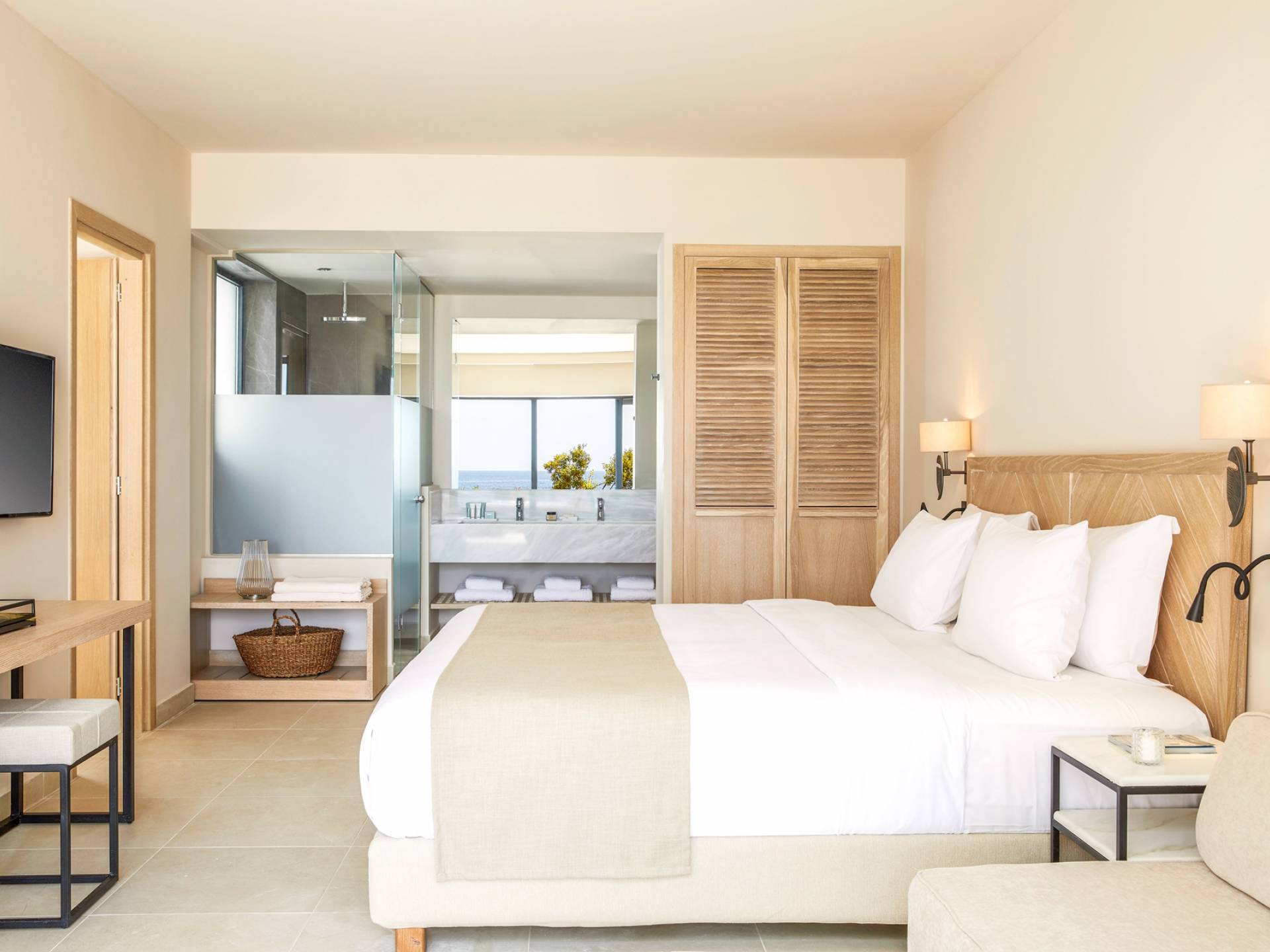 Μια σουίτα 86 m2, ευρύχωρη και πολυτελής, εκλεπτυσμένη και κομψή, μια σπάνια ταίριασμα υψηλής αισθητικής και λειτουργικότητας, με έμφαση στις ευθείες γραμμές, το λευκό χρώμα, τα ανοίγματα του ηλιακού φωτός, τις χρωματικές αποχρώσεις και μια επιλογή από υφάσματα και έργα τέχνης. Οι εξωτερικοί και εσωτερικοί χώροι της σουίτας αλληλοσυμπληρώνονται παρέχοντας ένα αξιοσημείωτο περιβάλλον ευεξίας και χαλάρωσης.