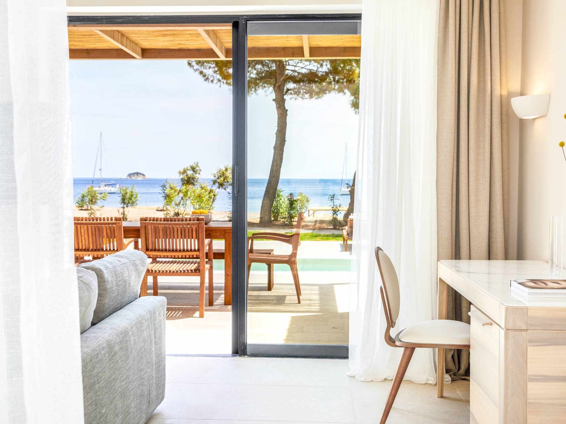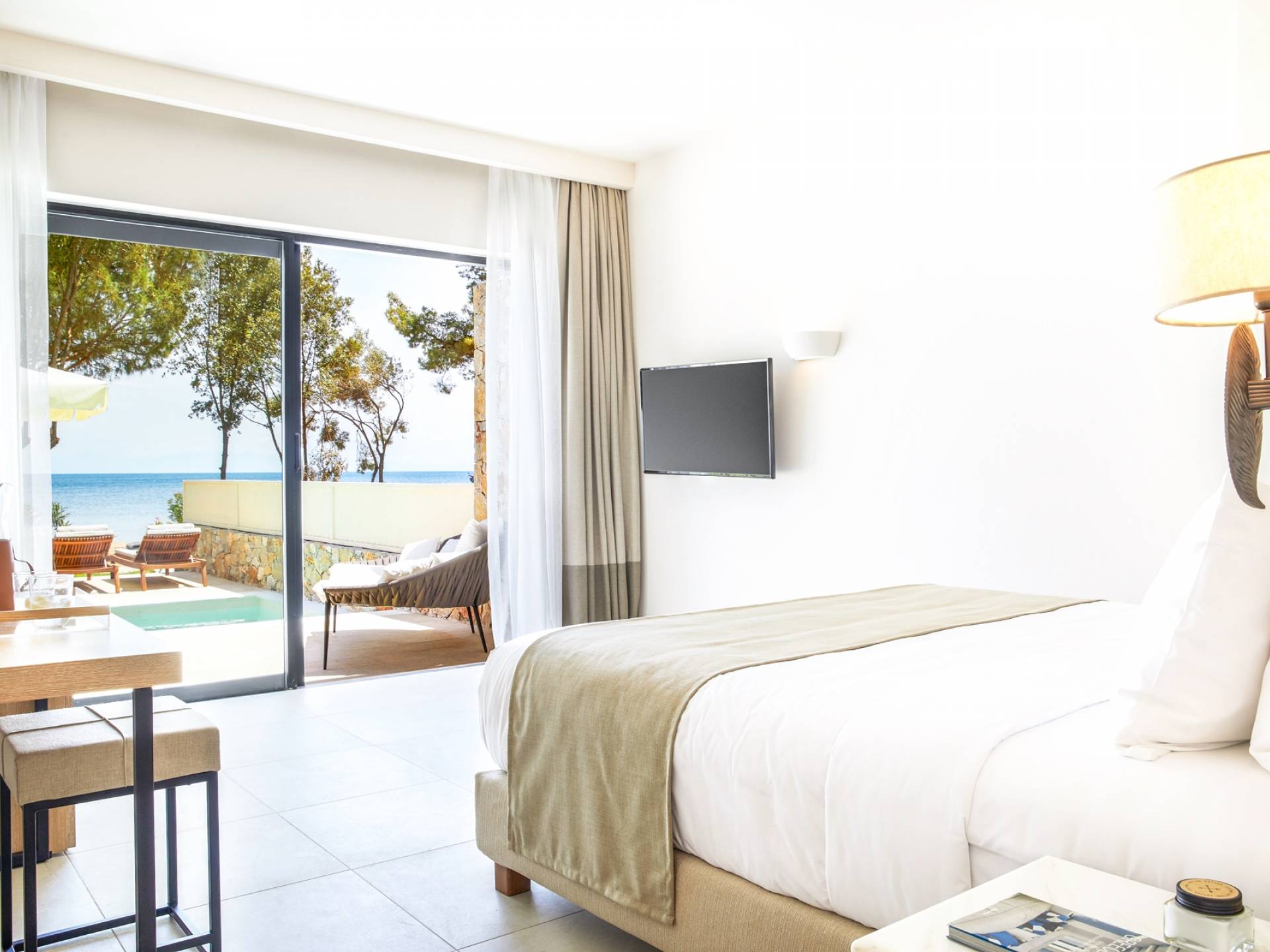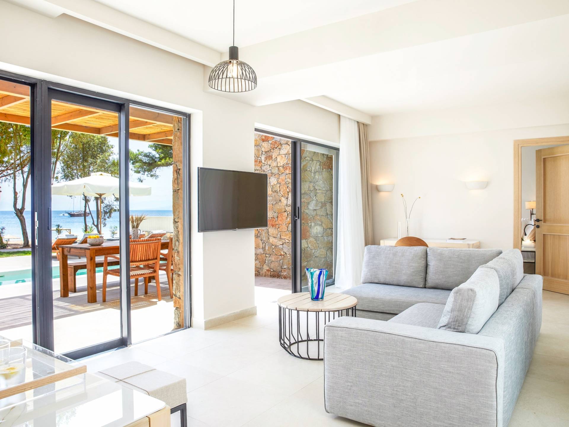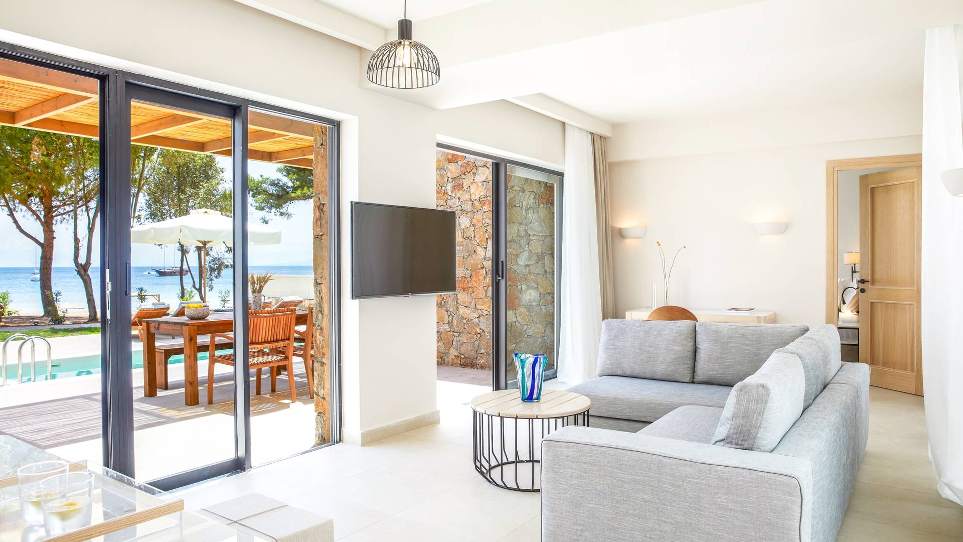 Μια σουίτα 86 m2, ευρύχωρη και πολυτελής, εκλεπτυσμένη και κομψή, μια σπάνια ταίριασμα υψηλής αισθητικής και λειτουργικότητας, με έμφαση στις ευθείες γραμμές, το λευκό χρώμα, τα ανοίγματα του ηλιακού φωτός, τις χρωματικές αποχρώσεις και μια επιλογή από υφάσματα και έργα τέχνης. Οι εξωτερικοί και εσωτερικοί χώροι της σουίτας αλληλοσυμπληρώνονται παρέχοντας ένα αξιοσημείωτο περιβάλλον ευεξίας και χαλάρωσης.