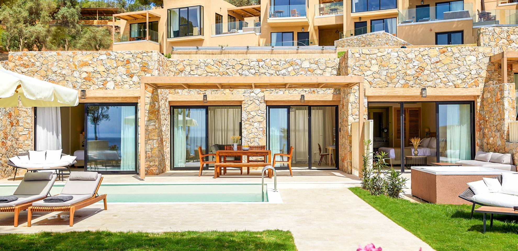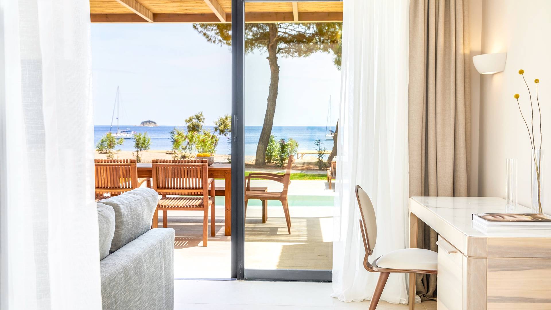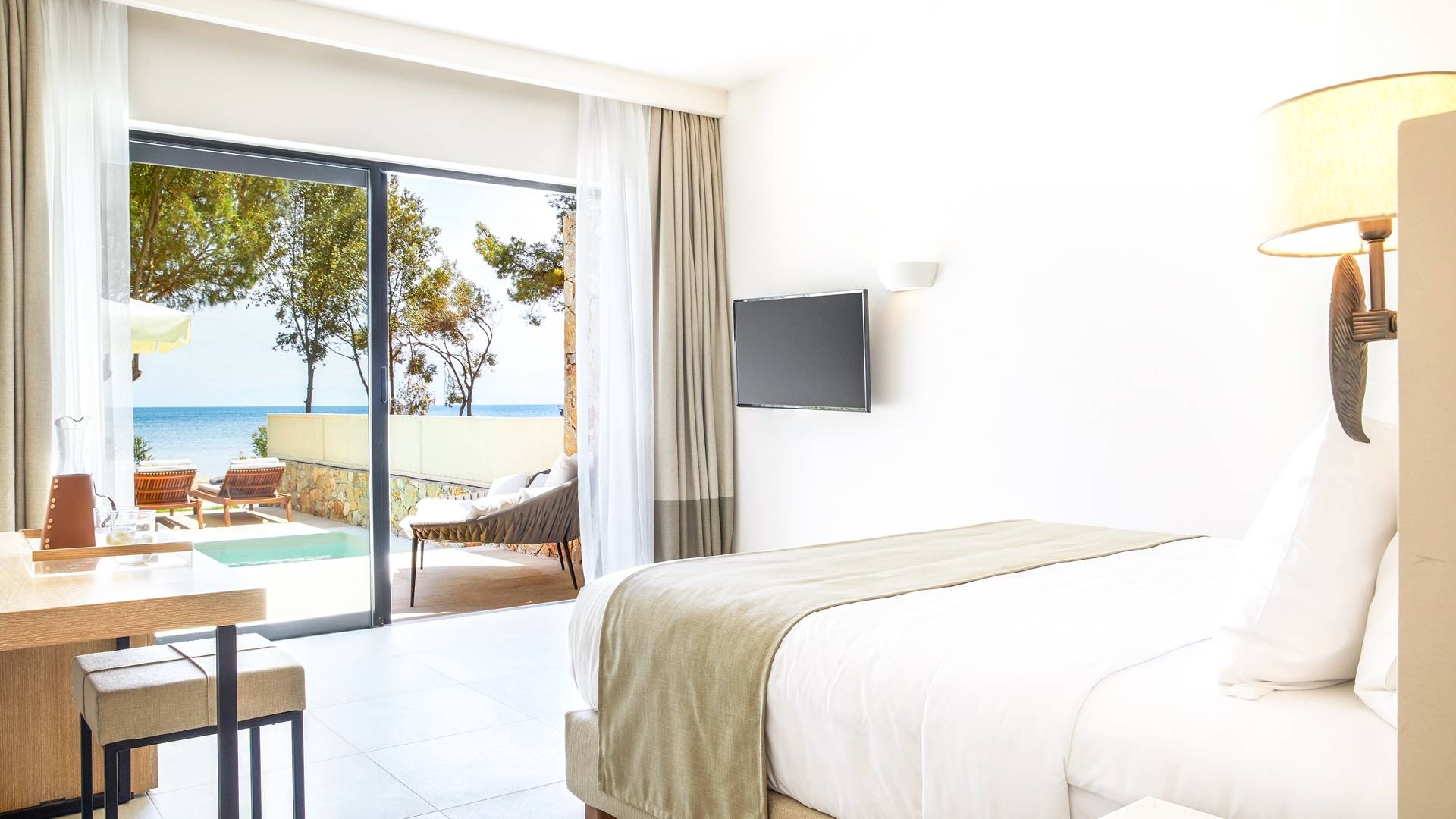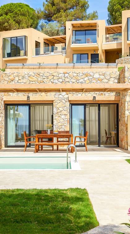 Μια σουίτα 86 m2, ευρύχωρη και πολυτελής, εκλεπτυσμένη και κομψή, μια σπάνια ταίριασμα υψηλής αισθητικής και λειτουργικότητας, με έμφαση στις ευθείες γραμμές, το λευκό χρώμα, τα ανοίγματα του ηλιακού φωτός, τις χρωματικές αποχρώσεις και μια επιλογή από υφάσματα και έργα τέχνης. Οι εξωτερικοί και εσωτερικοί χώροι της σουίτας αλληλοσυμπληρώνονται παρέχοντας ένα αξιοσημείωτο περιβάλλον ευεξίας και χαλάρωσης.