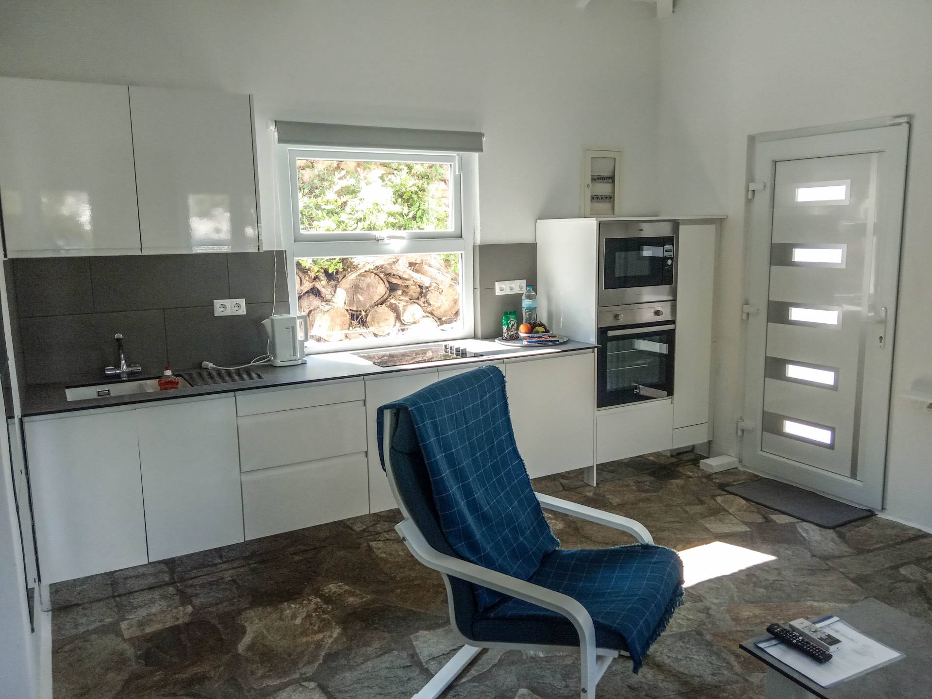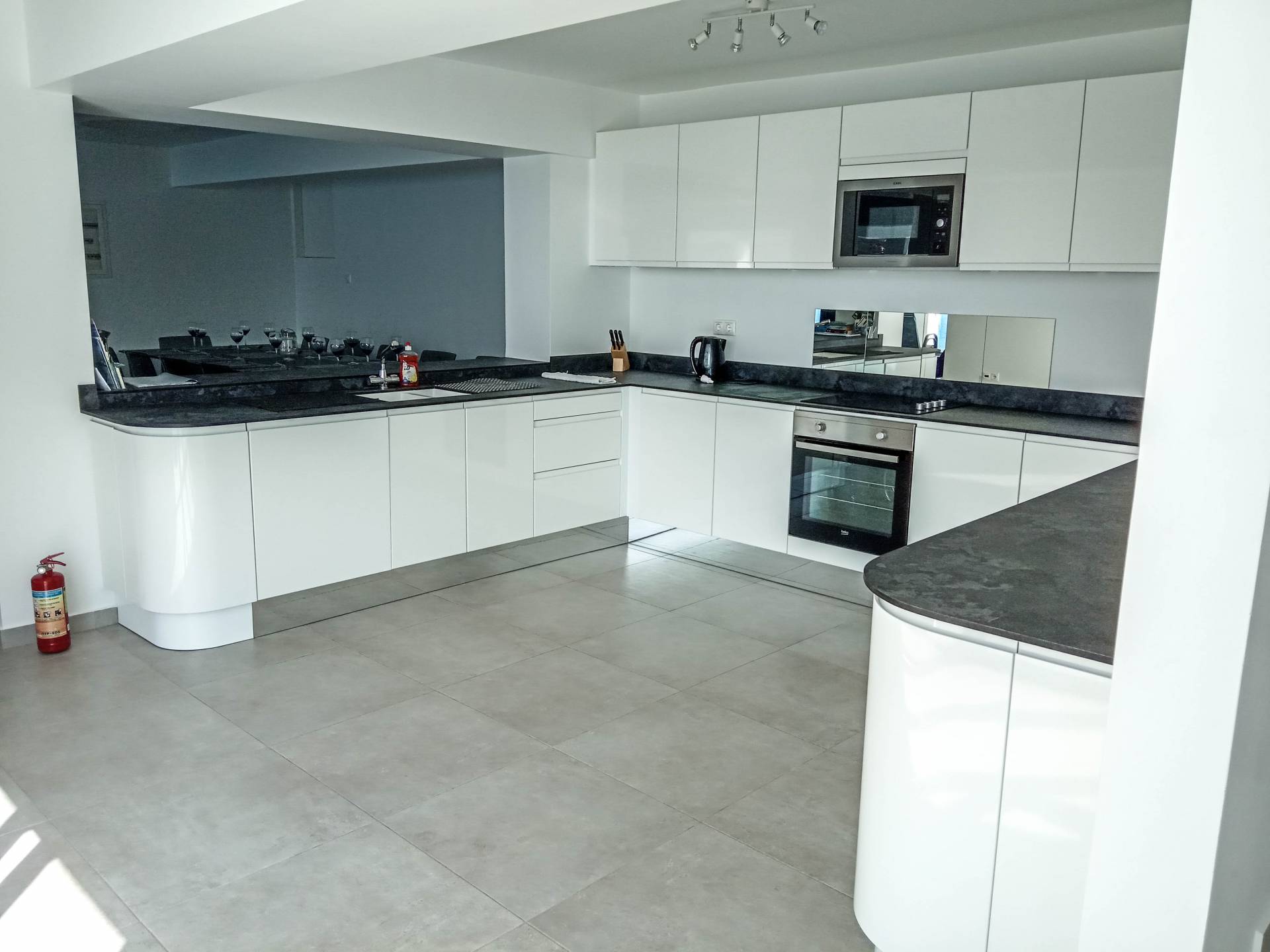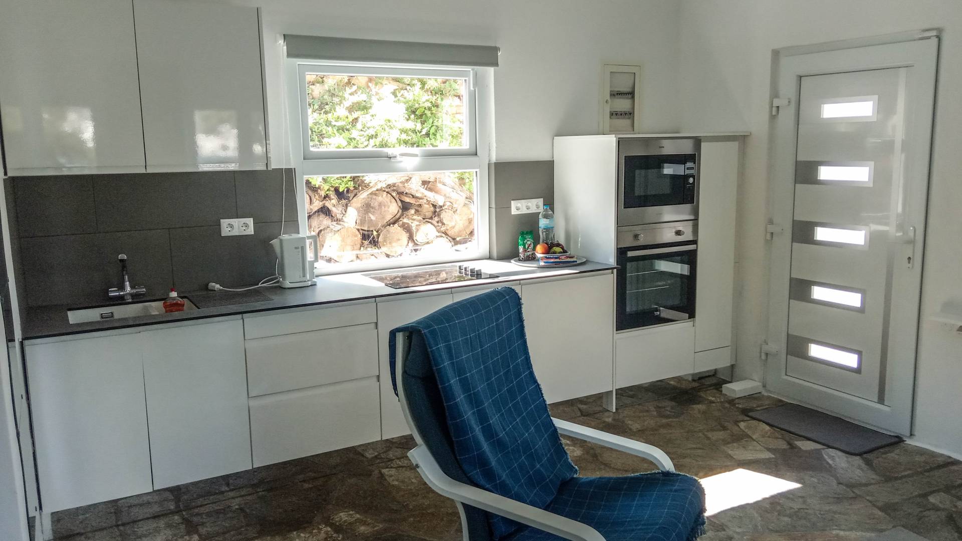Στο ισόγειο, θα βρείτε μια κουζίνα που είναι σε μεγάλο βαθμό μοντέρνα και μινιμαλιστική, εξοπλισμένη με συμπαγείς πάγκους 12 mm τελευταίας τεχνολογίας και γυαλιστερά λευκά ντουλάπια. Οι συσκευές περιλαμβάνουν 2 ψυγεία Whirlpool, καταψύκτη υδρομασάζ, πλυντήριο πιάτων υδρομασάζ, φούρνο μικροκυμάτων AEG, κεραμικές εστίες Beko και φούρνο. Η τραπεζαρία βρίσκεται δίπλα στην κουζίνα και έχει μια μεγάλη τραπεζαρία που μπορεί να φιλοξενήσει 12 άτομα. Το σαλόνι είναι ανοιχτό, υπάρχουν 2 μεγάλοι μοντέρνοι καναπέδες και αναπαυτικές καρέκλες στο σαλόνι, για να χαλαρώσετε και να προσέχετε στον κόλπο προς την πόλη της Σκιάθου. Υπάρχει μια μεγάλη Smart TV 49 ιντσών και πυρκαγιά για το χειμώνα. Το υπνοδωμάτιο #5 είναι μια άλλη σουίτα που περιλαμβάνει κρεβάτι king size, ένα μεγάλο ιδιωτικό μπάνιο και έναν επιπλέον διπλό καναπέ-κρεβάτι ή χώρο γραφείου και το υπνοδωμάτιο #6 είναι ένα διπλό, με ιδιωτικό μπάνιο, ντους, ντουλάπες κ.λπ.