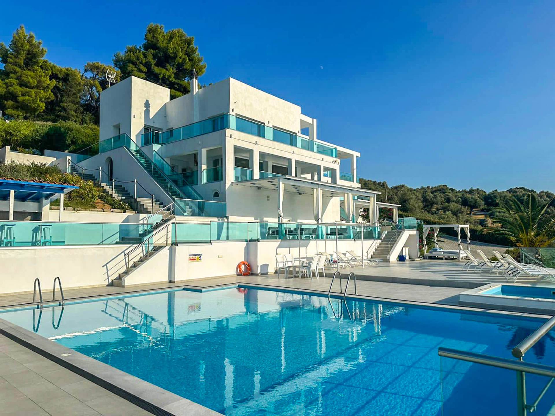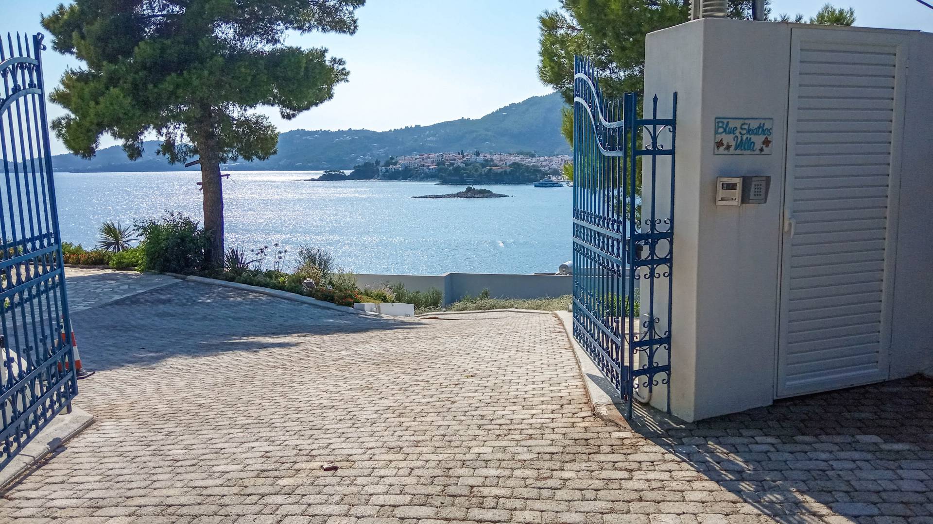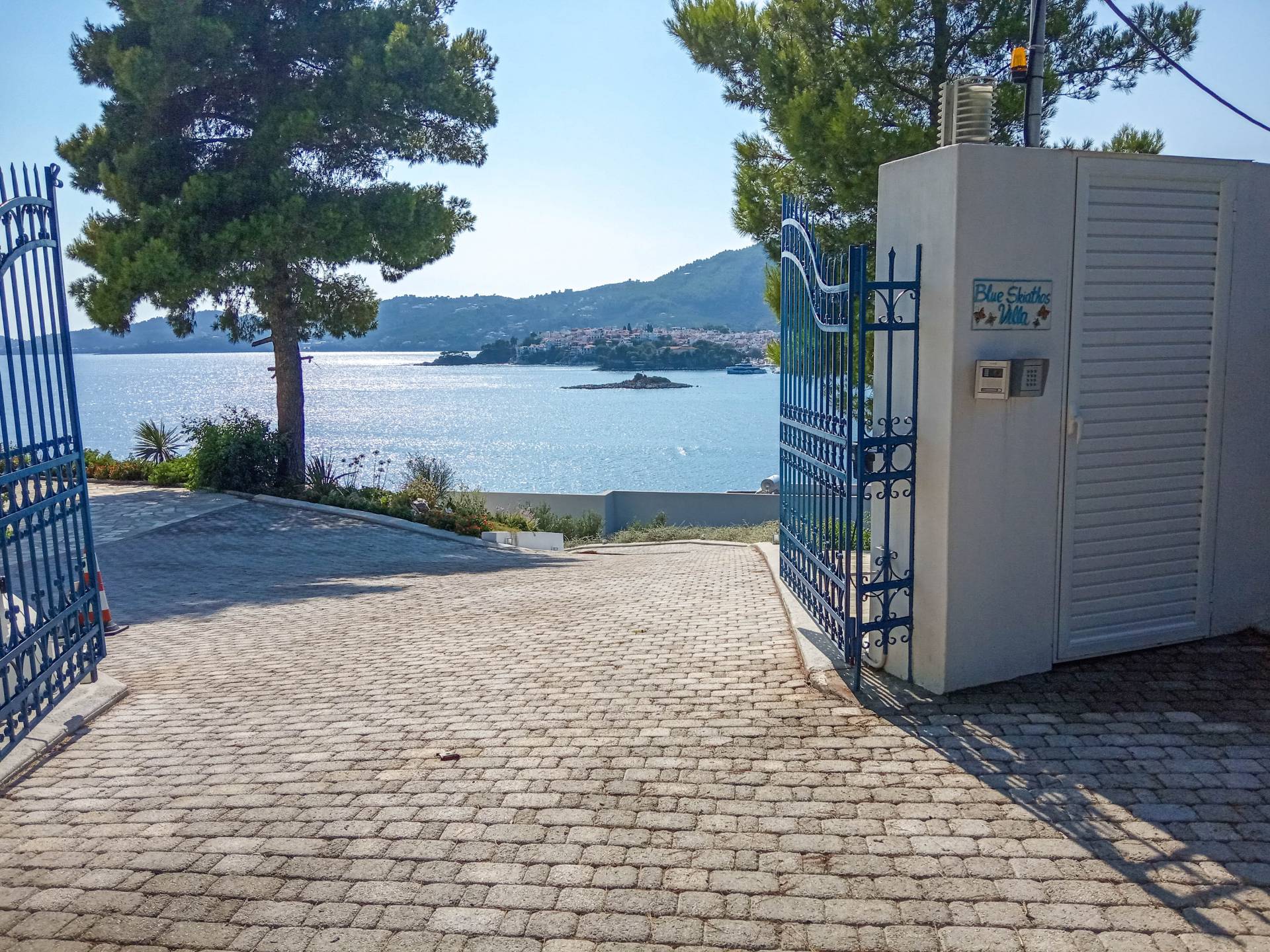 Το Blue Skiathos Villa είναι μια πολυτελής βίλα που ενοικιάζεται με 6 υπνοδωμάτια και ιδιωτική πισίνα. Η βίλα βρίσκεται σε οικόπεδο περίπου 4.200 τετραγωνικών μέτρων και μπορεί να φιλοξενήσει 12 άτομα. Το έδαφος κατηφορίζει από τις κύριες πύλες προς το Αιγαίο Πέλαγος και τη δική του ιδιωτική προβλήτα. Το εσωτερικό κατάλυμα είναι περίπου 300 τετραγωνικά μέτρα χωρισμένο σε 2 ορόφους. Υπάρχουν επίσης 2 πέργκολες για εξωτερική τραπεζαρία (28 τετραγωνικά μέτρα) και ένα εξωτερικό σαλόνι (30 τετραγωνικά μέτρα).