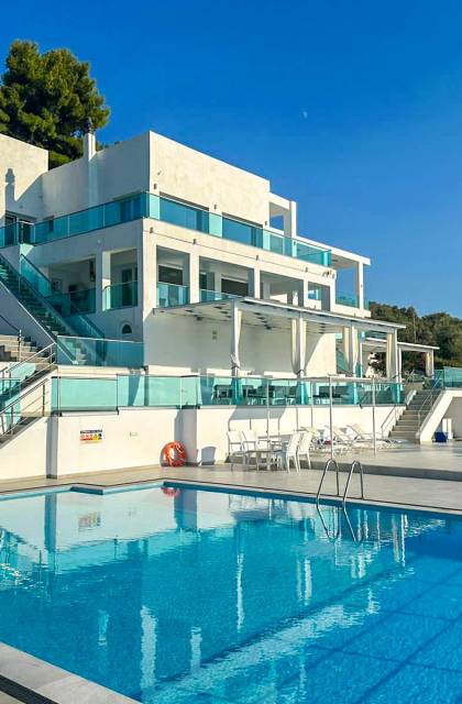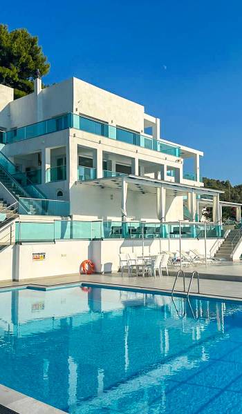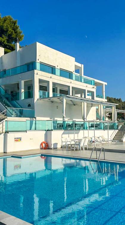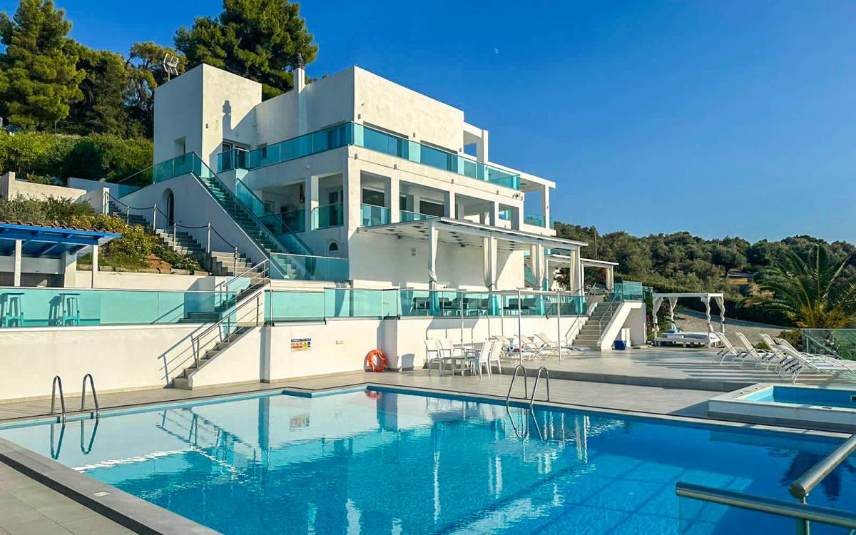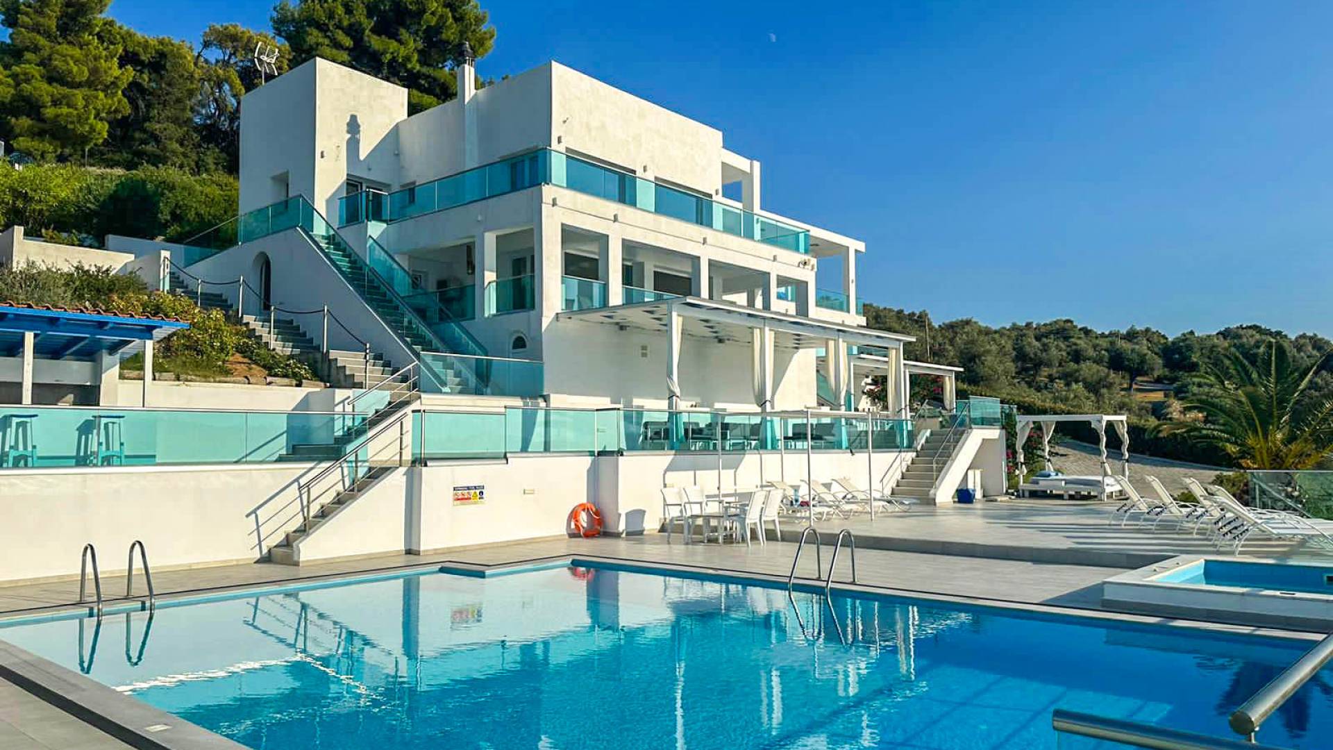 Το Blue Skiathos Villa είναι μια πολυτελής βίλα που ενοικιάζεται με 6 υπνοδωμάτια και ιδιωτική πισίνα. Η βίλα βρίσκεται σε οικόπεδο περίπου 4.200 τετραγωνικών μέτρων και μπορεί να φιλοξενήσει 12 άτομα. Το έδαφος κατηφορίζει από τις κύριες πύλες προς το Αιγαίο Πέλαγος και τη δική του ιδιωτική προβλήτα. Το εσωτερικό κατάλυμα είναι περίπου 300 τετραγωνικά μέτρα χωρισμένο σε 2 ορόφους. Υπάρχουν επίσης 2 πέργκολες για εξωτερική τραπεζαρία (28 τετραγωνικά μέτρα) και ένα εξωτερικό σαλόνι (30 τετραγωνικά μέτρα).
