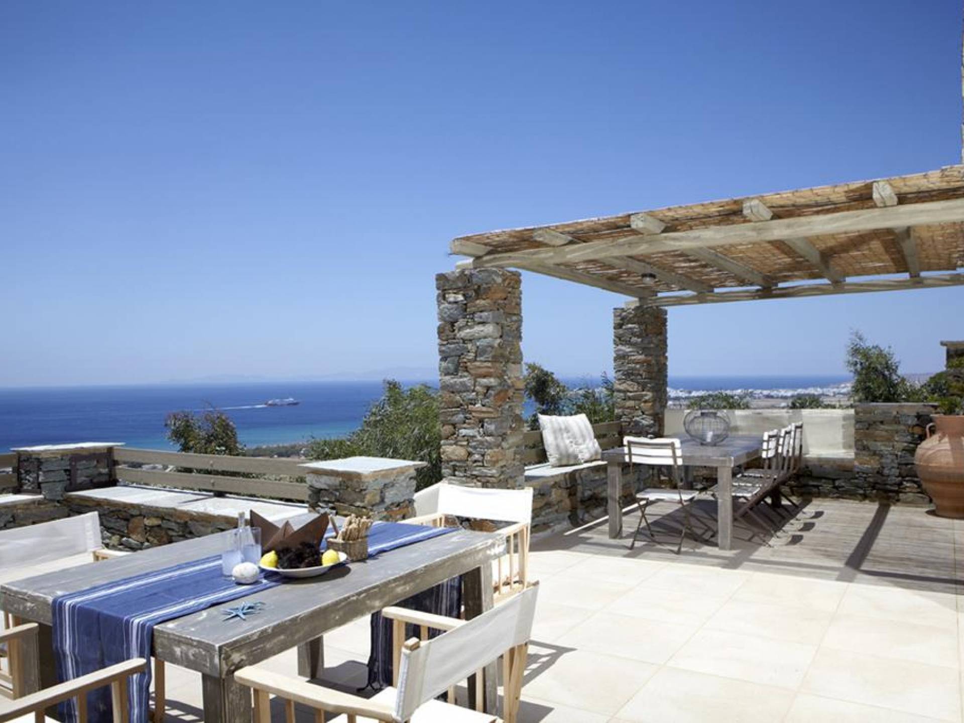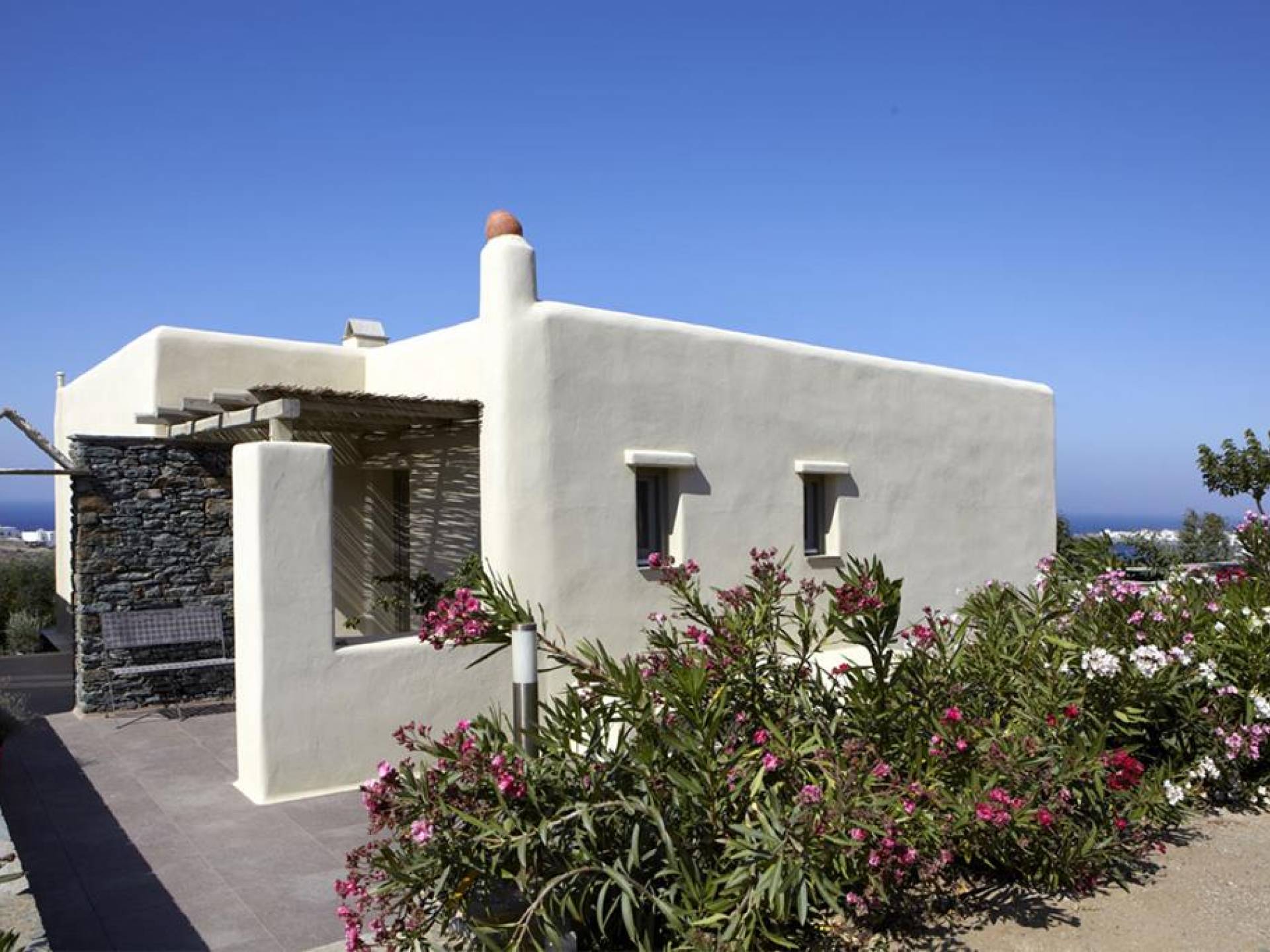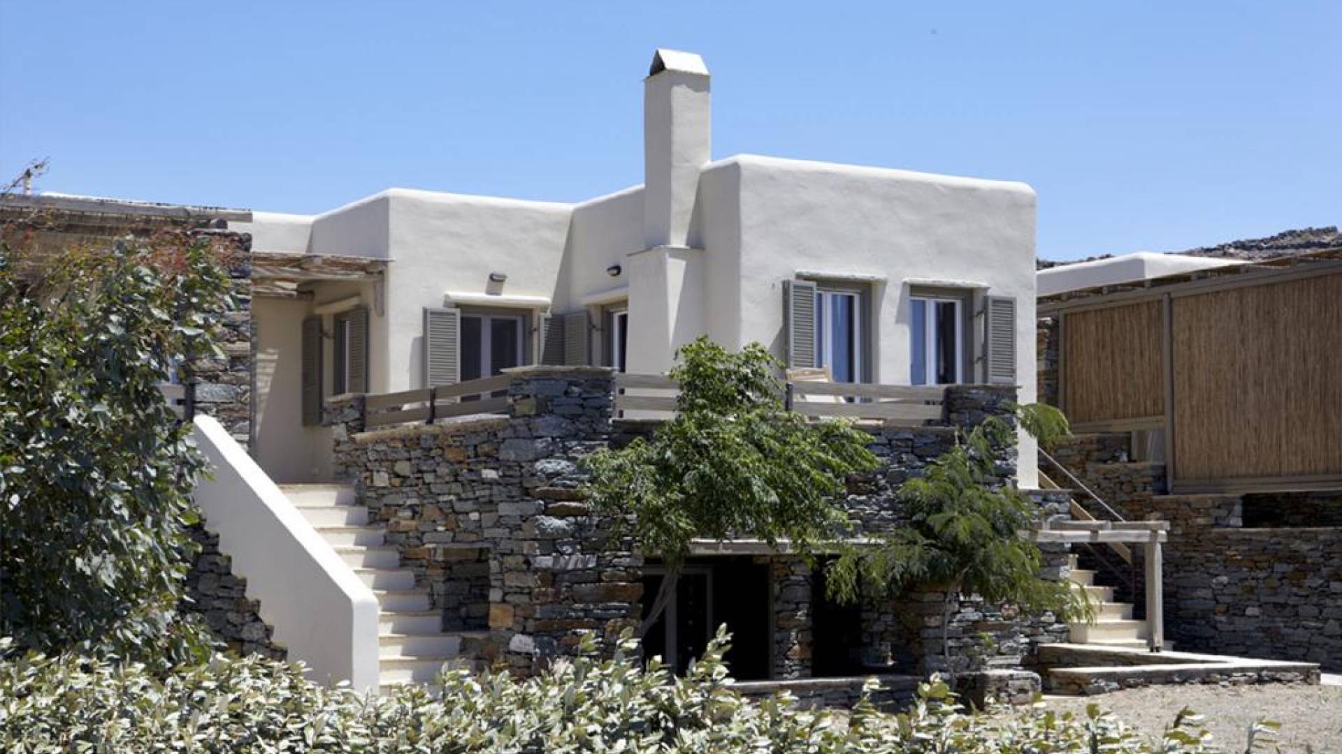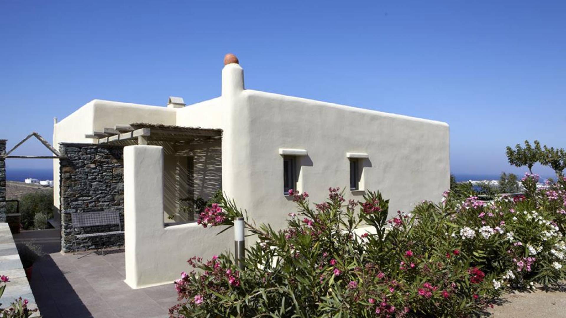 Η Grande Villa στο Diles & Rinies Villas, είναι 180 m2 και διαθέτει ιδιωτικό κήπο, 4 υπνοδωμάτια, 3 μπάνια και 1 WC. Αυτή η πολυτελής ενοικίαση μπορεί να φιλοξενήσει 10-11 άτομα και είναι ιδανική για οικογένειες, φίλους ή ζευγάρια. Με εκπληκτική θέα στο Αιγαίο και στα κοντινά νησιά της Μυκόνου, της Δήλου (ένας από τους σημαντικότερους αρχαιολογικούς χώρους της Ελλάδας), της Ρήνιας και της Σύρου.