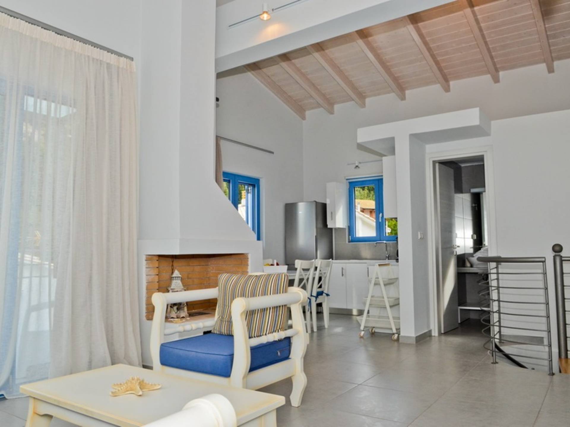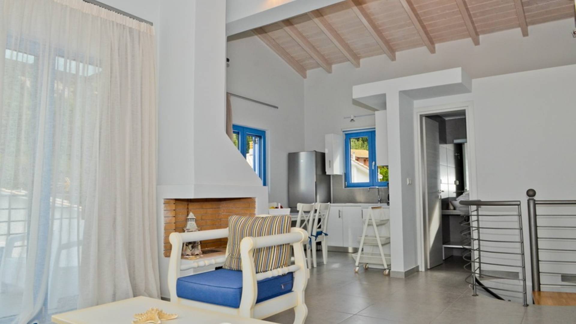 Ο επάνω όροφος είναι ένα ευρύχωρο σαλόνι - κουζίνα: Σαλόνι με τζάκι και άνετος καναπές/κρεβάτι που μετατρέπεται εύκολα σε δύο άνετα μονά κρεβάτια, μεγάλη πολυθρόνα, τηλεόραση Smart TV 40" και κουζίνα με τραπεζαρία, πλήρως εξοπλισμένη. Κάθε όροφος έχει ξεχωριστό μπάνιο με ντουζιέρα, μεγάλα μπαλκόνια πλήρως επιπλωμένα, με υπέροχη θέα στο βουνό και τη θάλασσα. Το ισόγειο συνδέεται με τον επάνω όροφο με εσωτερική και εξωτερική σκάλα.