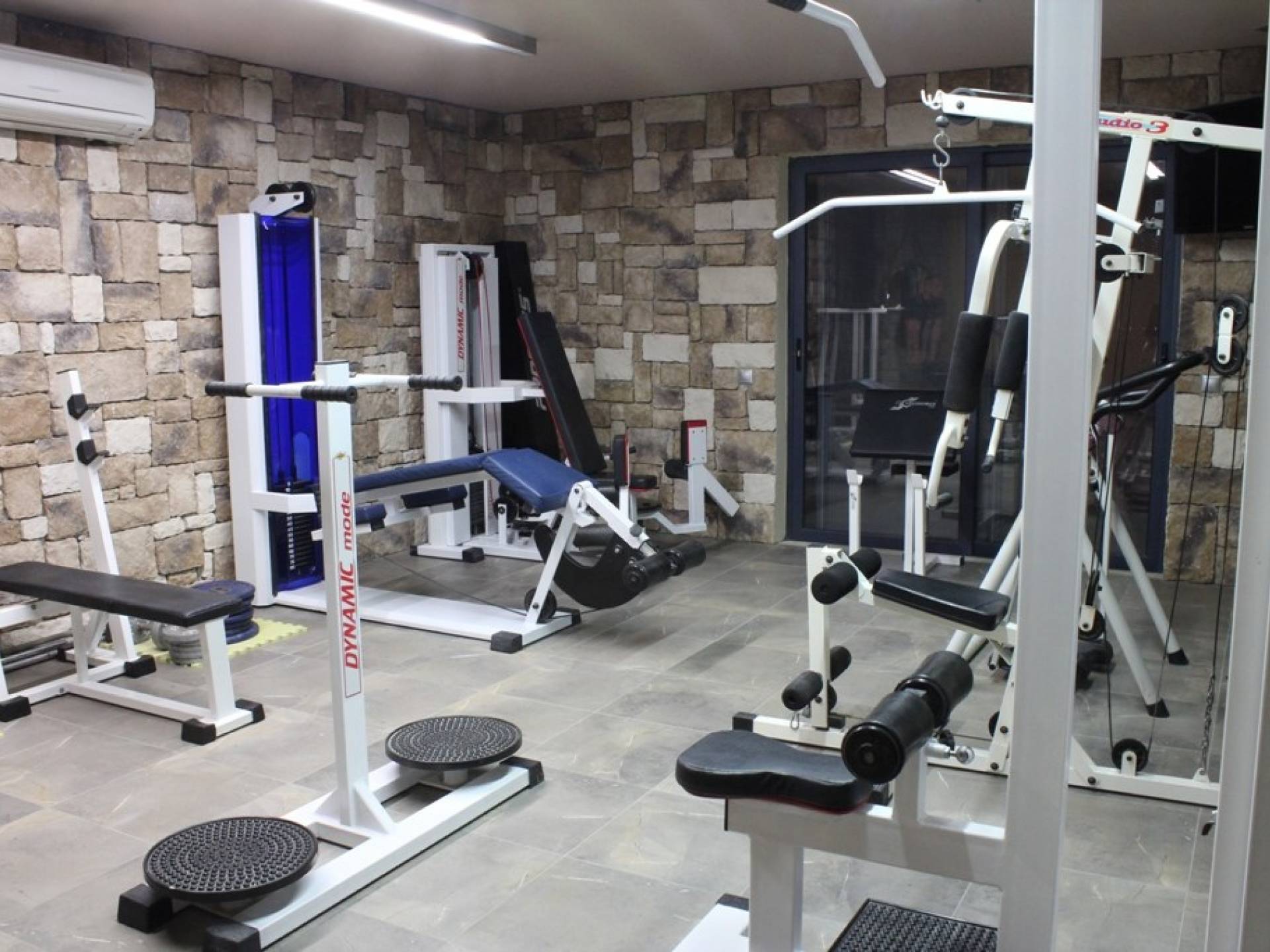 Υπάρχει ένας καλυμμένος χώρος 75 m2 γεμάτος επαγγελματικά μηχανήματα γυμναστικής για φυσική κατάσταση και διασκέδαση.