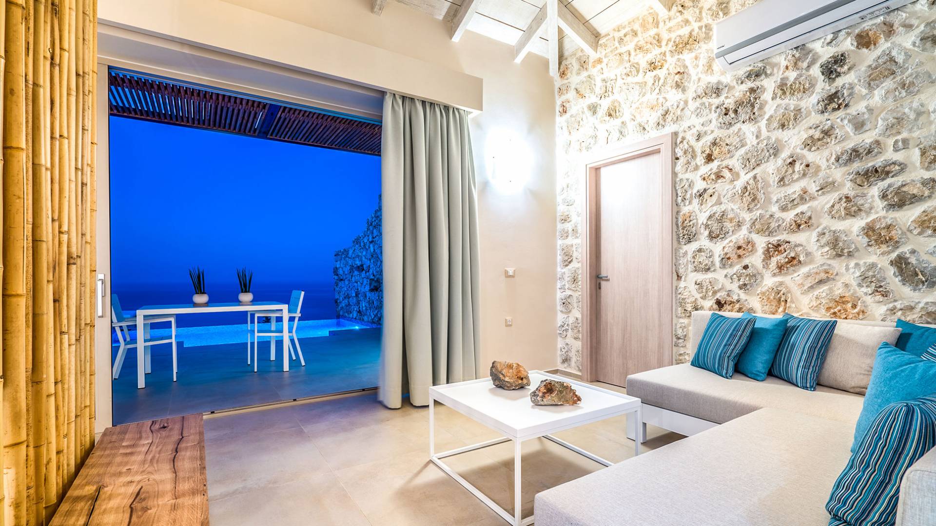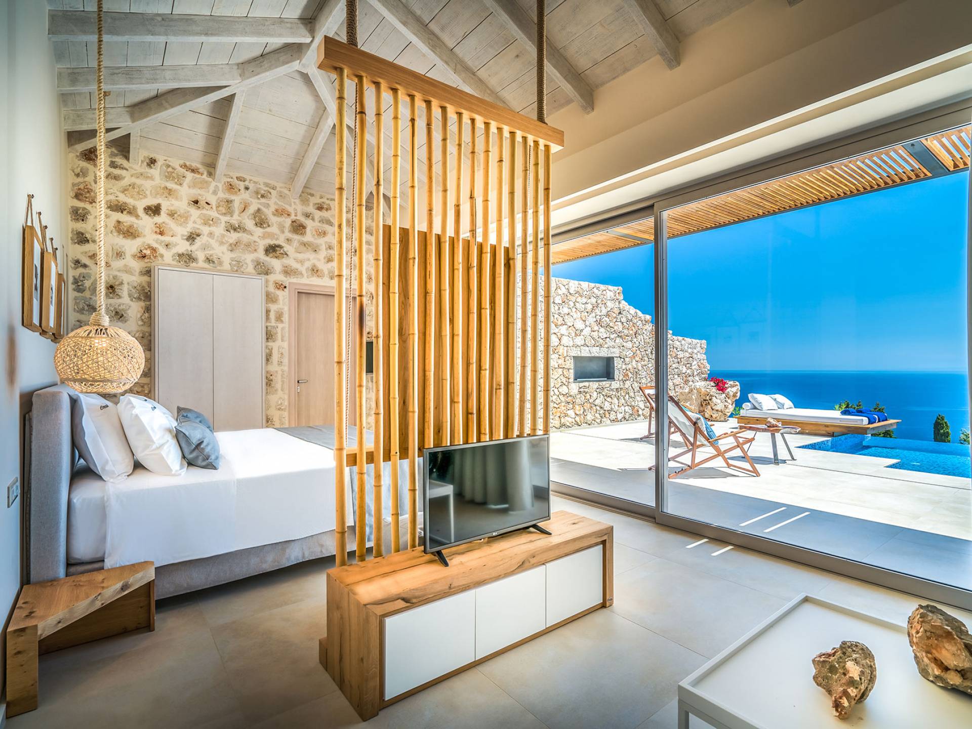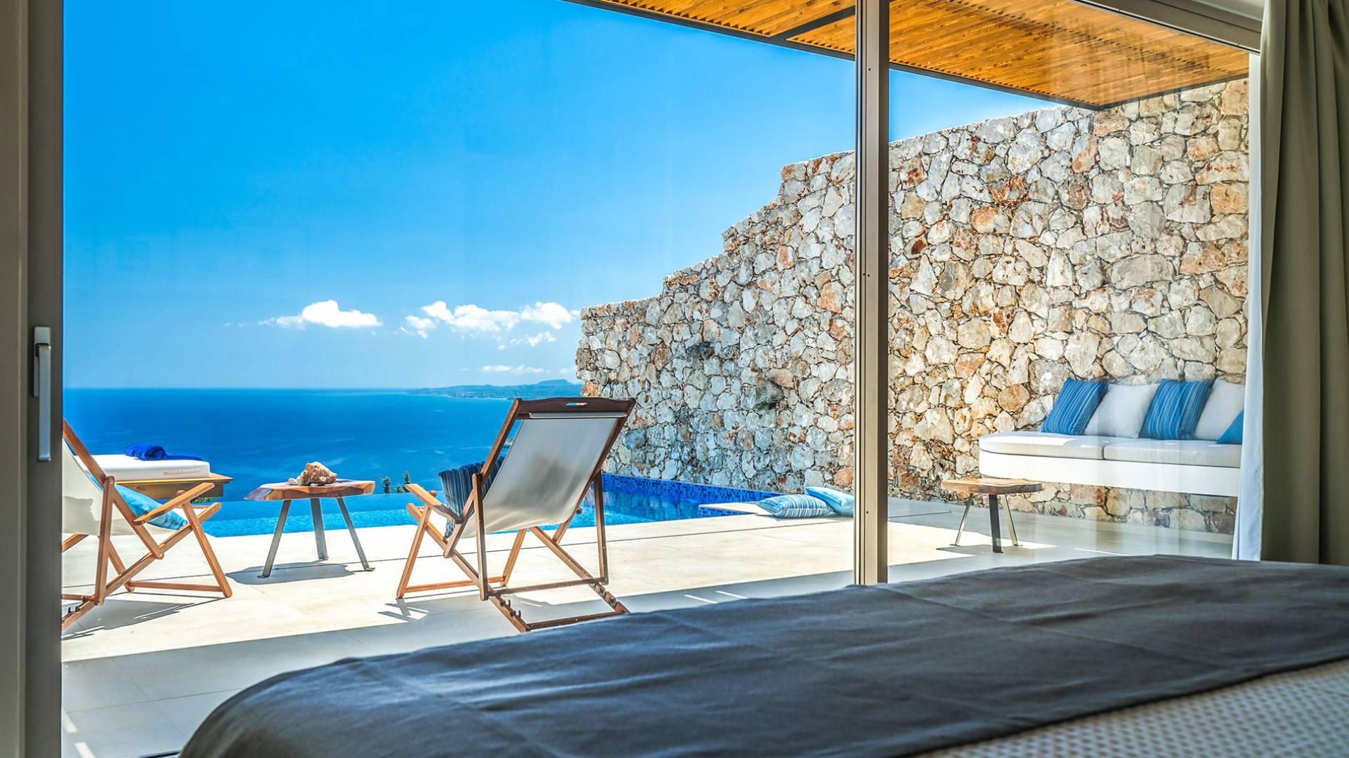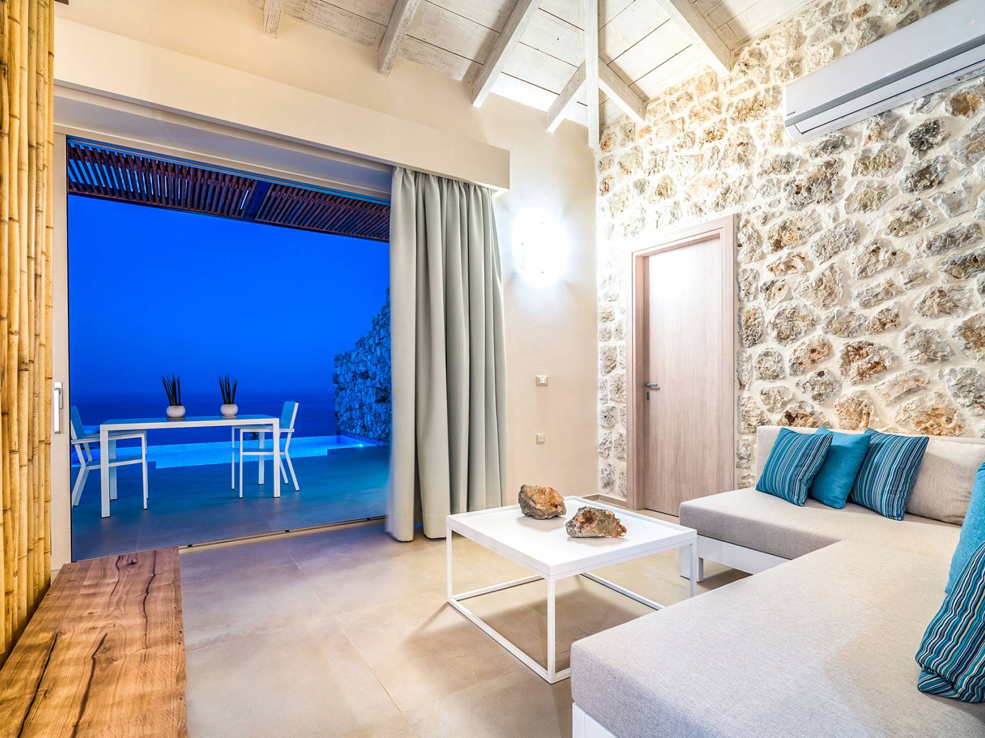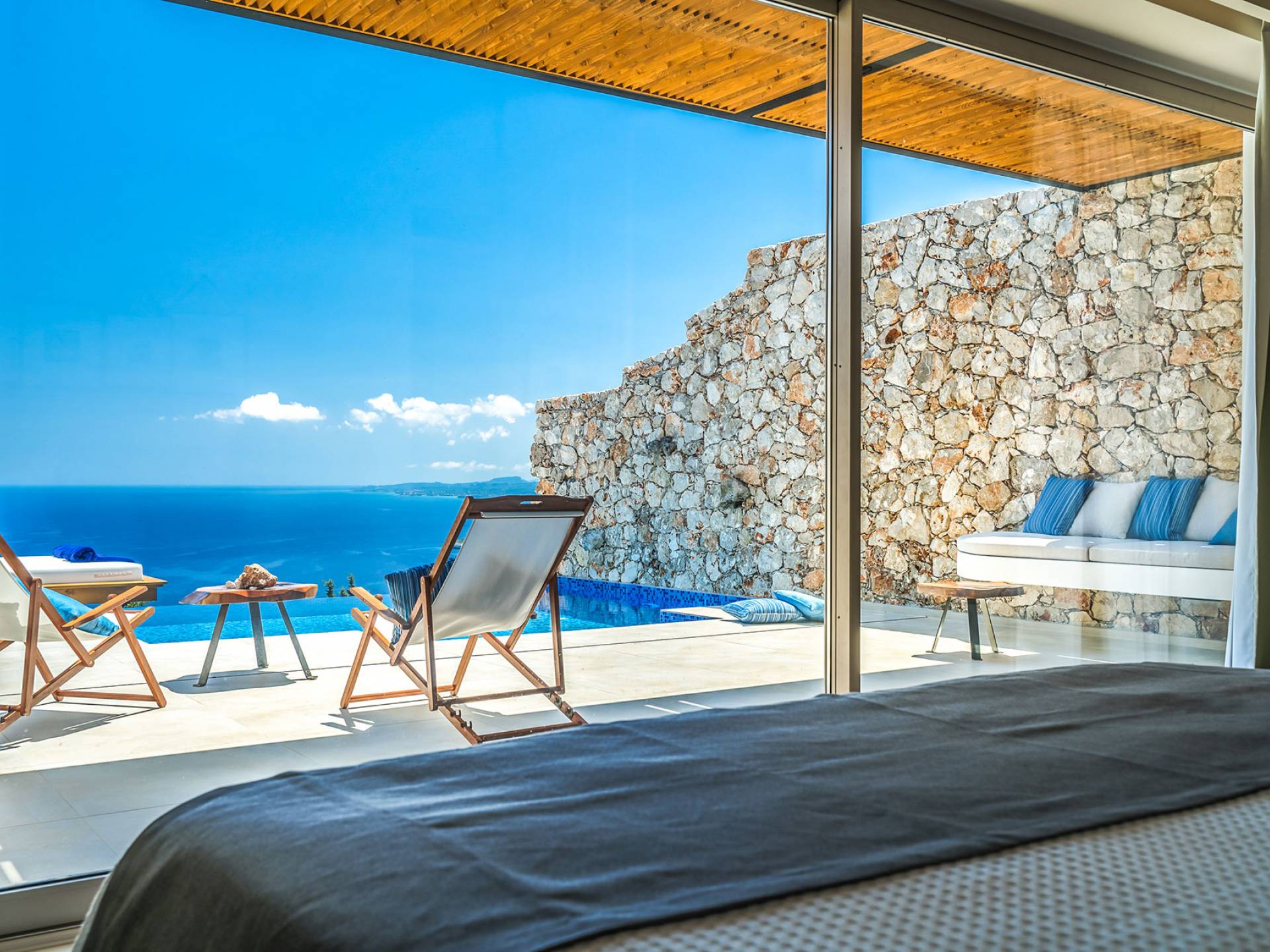 Οι συρόμενες γυάλινες πόρτες από το δάπεδο μέχρι την οροφή επιτρέπουν την ηλιοφάνεια σε όλη τη σουίτα σας και ανοίγουν σε μια ιδιωτική βεράντα με πισίνα υπερχείλισης με θαλασσινό νερό, ξαπλώστρες, σαλόνι και πανοραμική θέα στο Ιόνιο Πέλαγος.