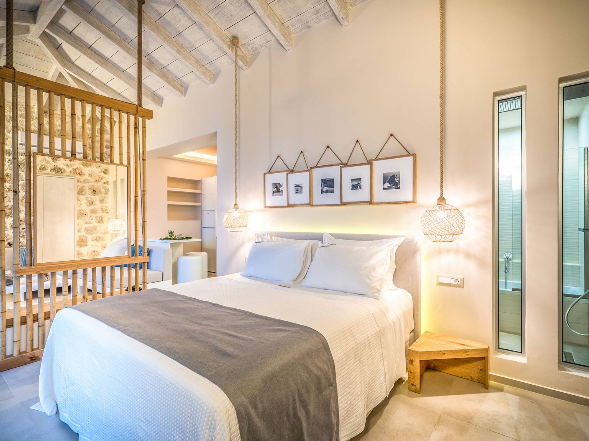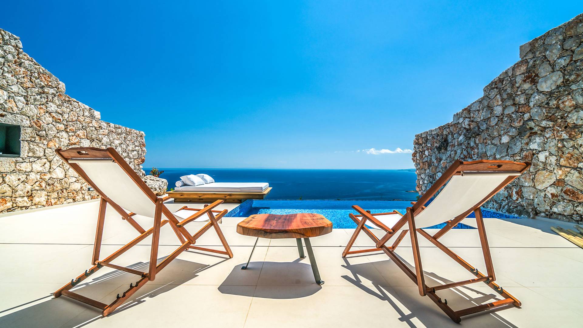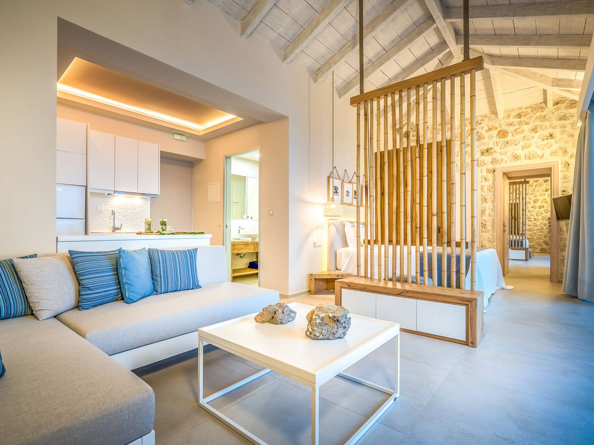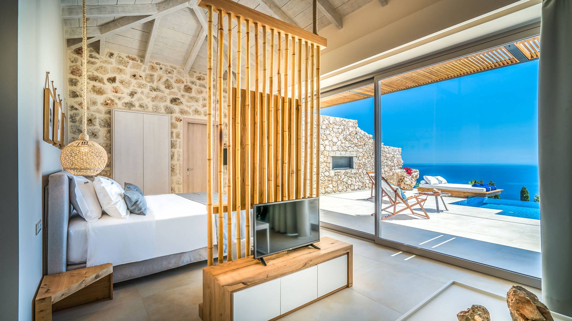 Οι συρόμενες γυάλινες πόρτες από το δάπεδο μέχρι την οροφή επιτρέπουν την ηλιοφάνεια σε όλη τη σουίτα σας και ανοίγουν σε μια ιδιωτική βεράντα με πισίνα υπερχείλισης με θαλασσινό νερό, ξαπλώστρες, σαλόνι και πανοραμική θέα στο Ιόνιο Πέλαγος.