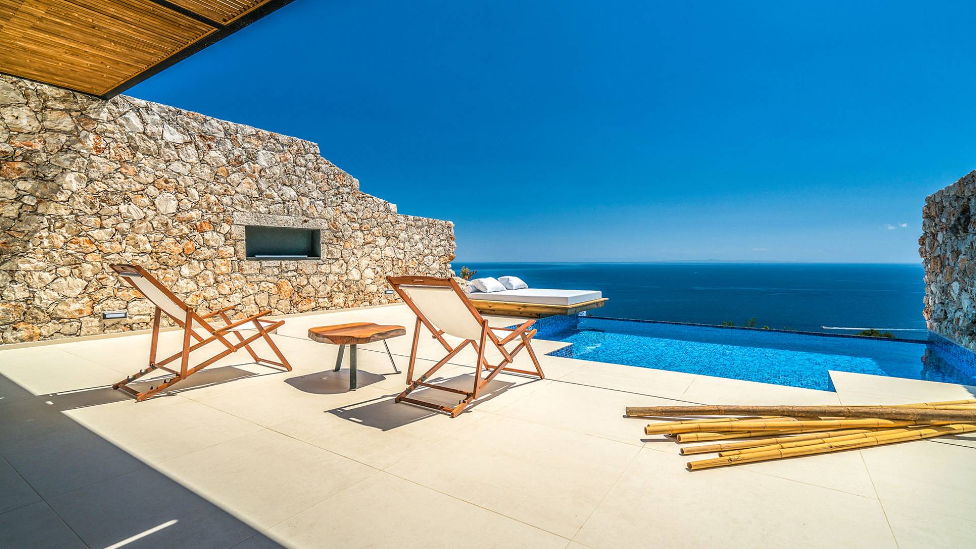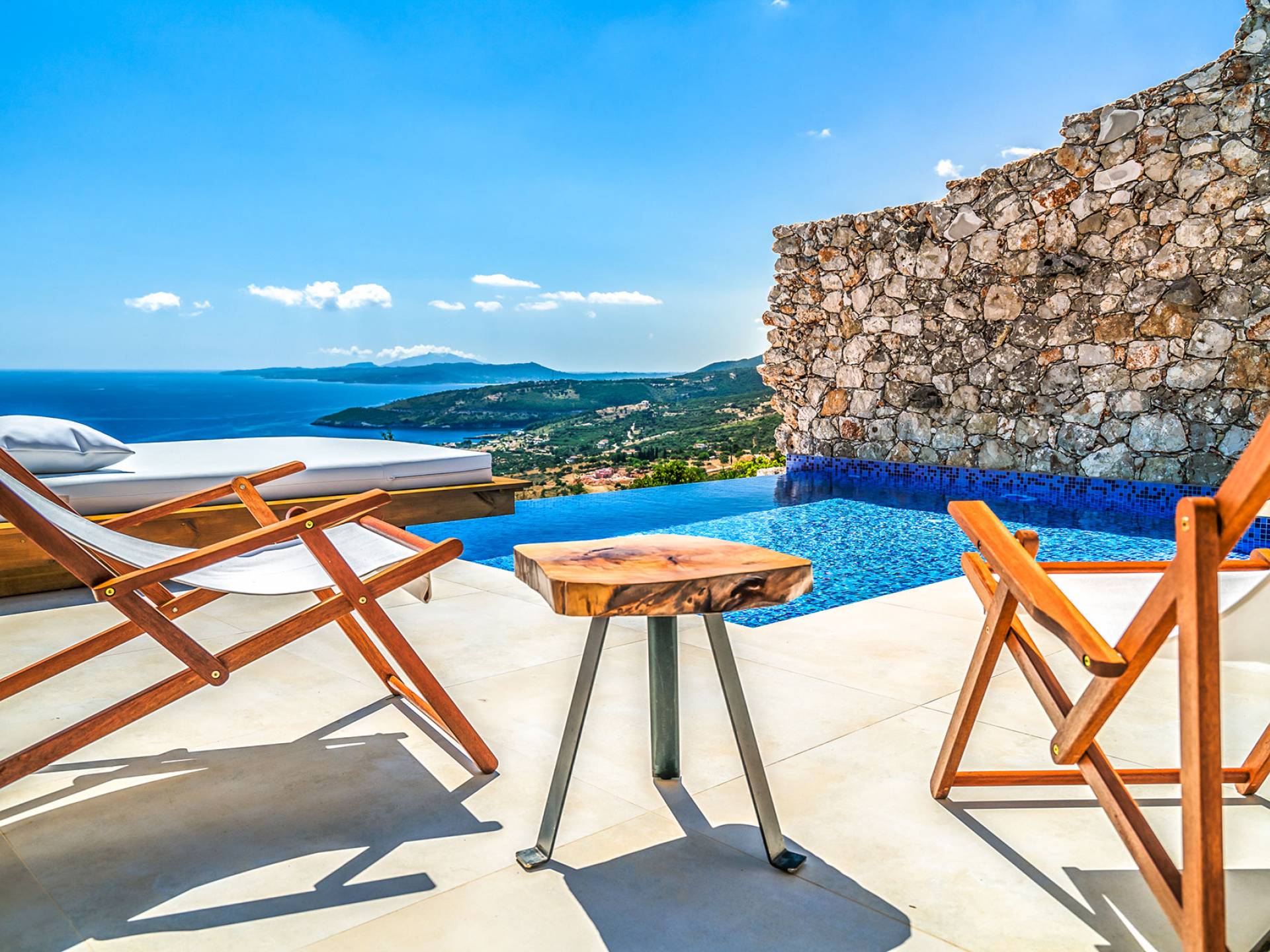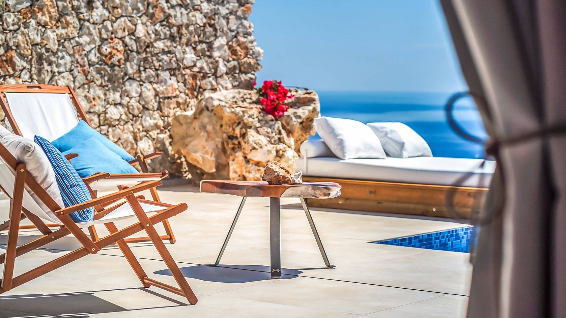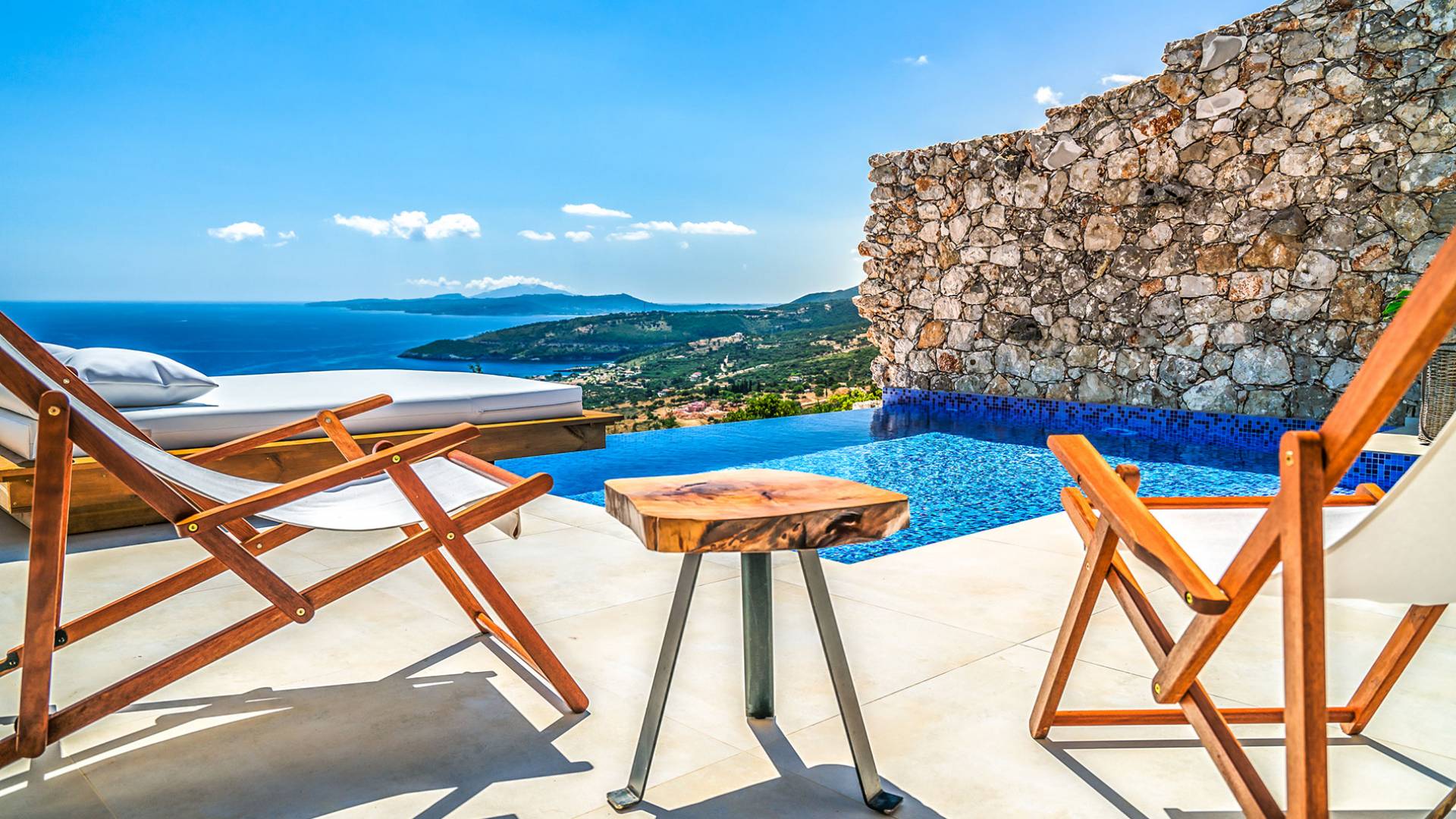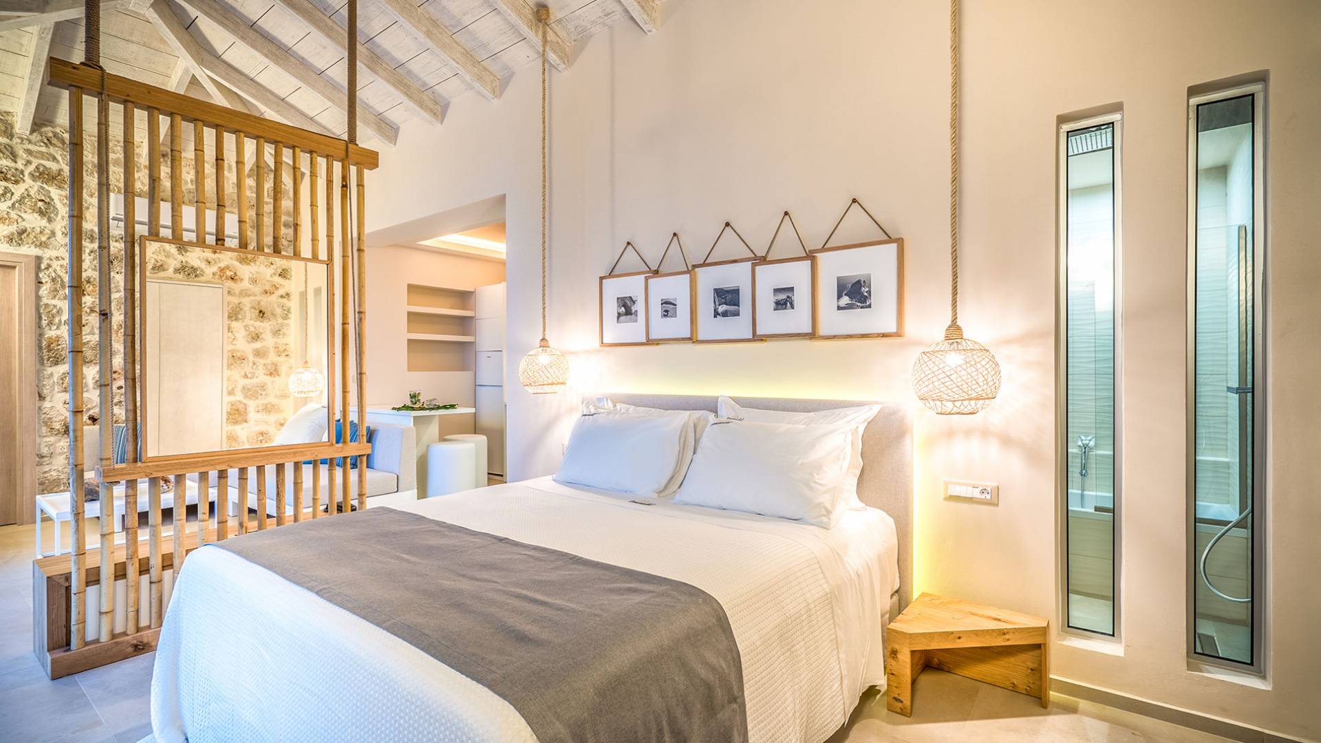 Οι συρόμενες γυάλινες πόρτες από το δάπεδο μέχρι την οροφή επιτρέπουν την ηλιοφάνεια σε όλη τη σουίτα σας και ανοίγουν σε μια ιδιωτική βεράντα με πισίνα υπερχείλισης με θαλασσινό νερό, ξαπλώστρες, σαλόνι και πανοραμική θέα στο Ιόνιο Πέλαγος.