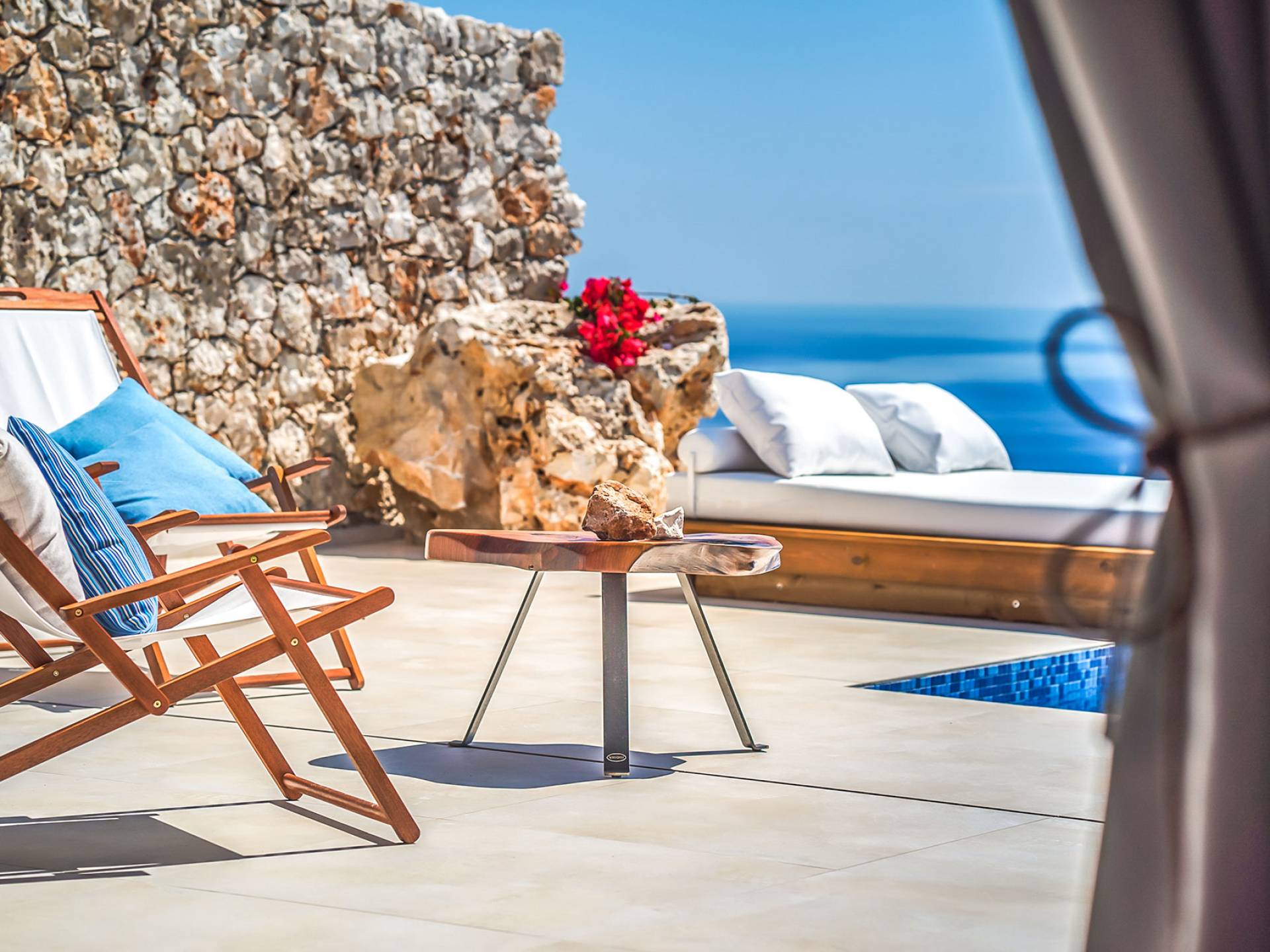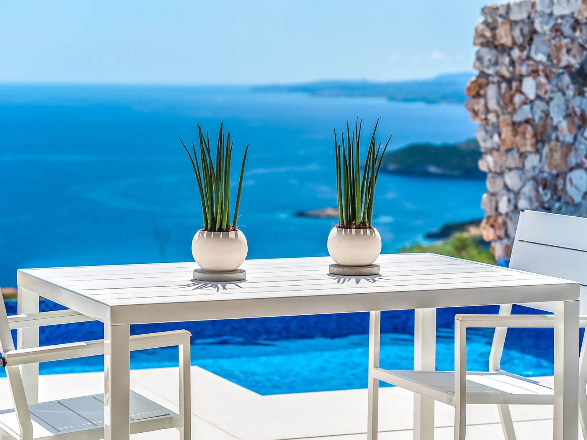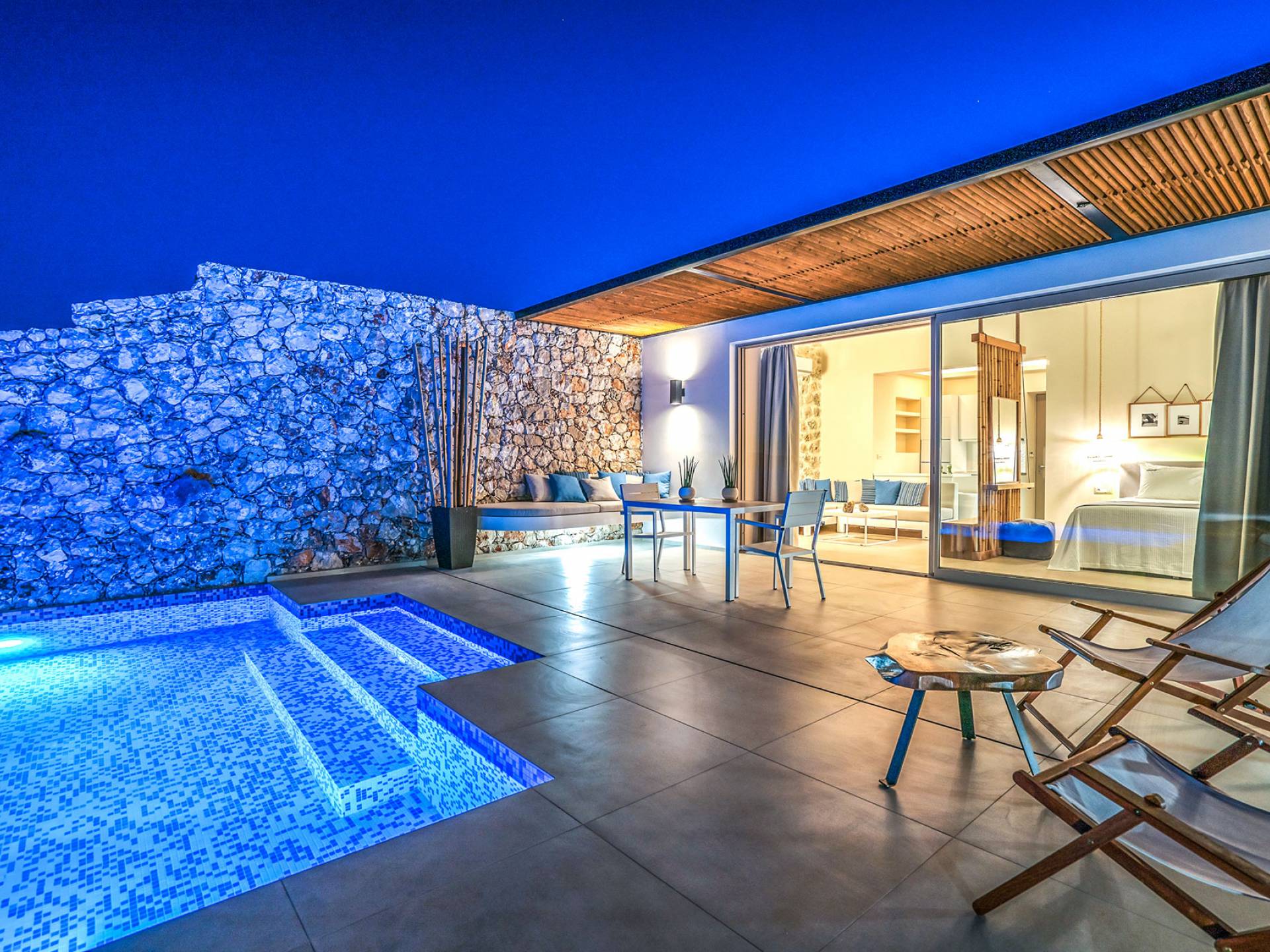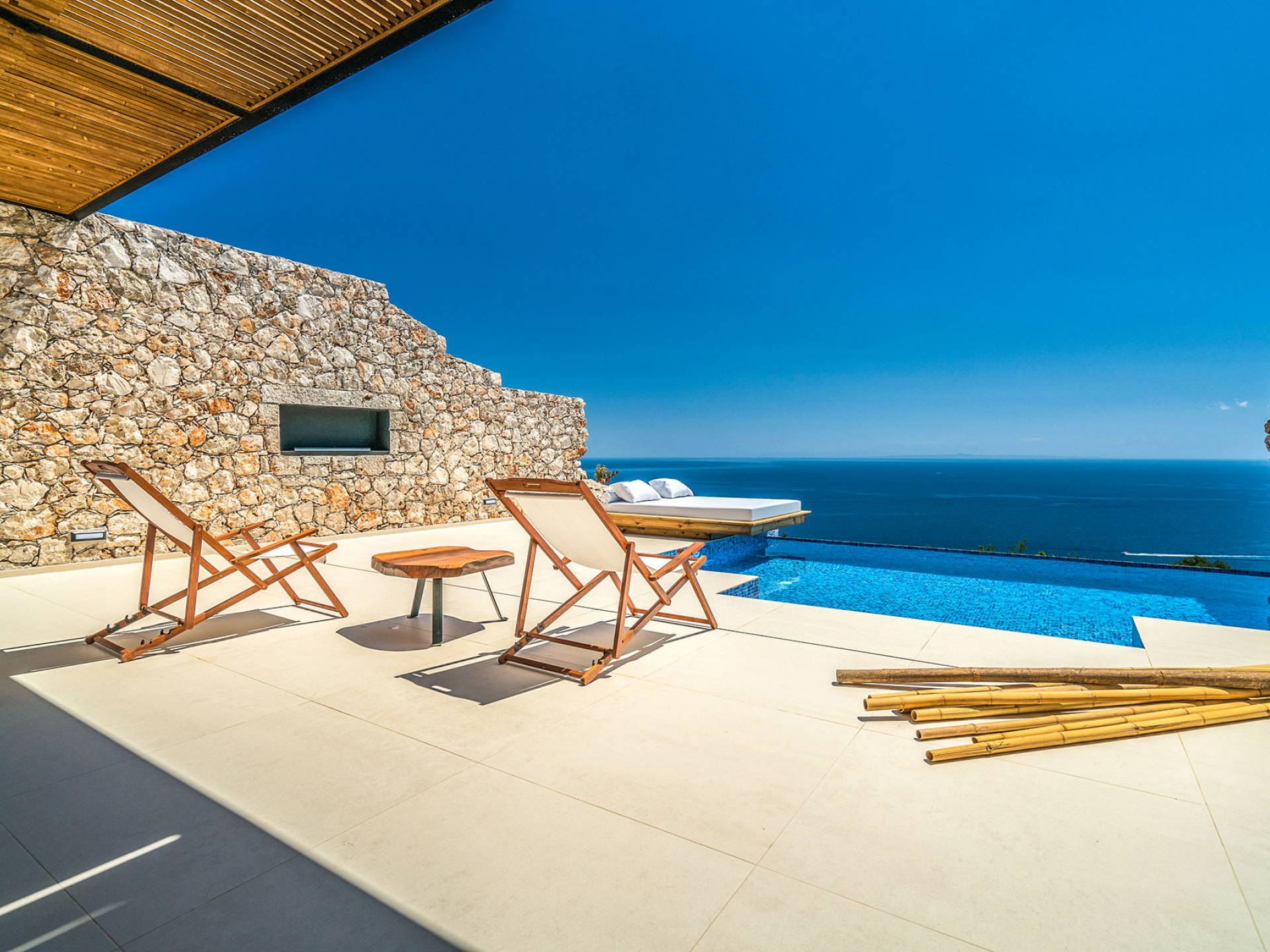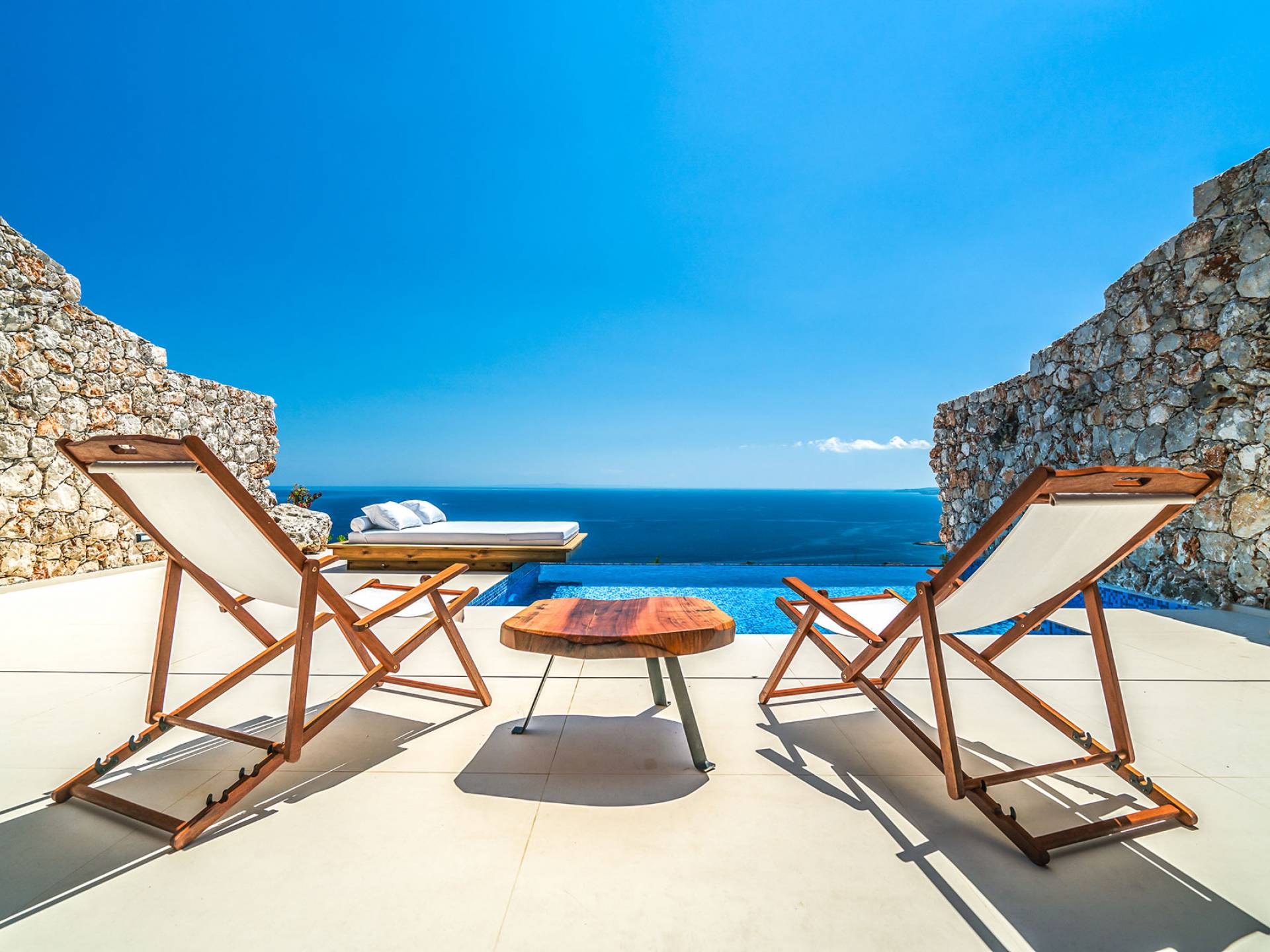 Οι συρόμενες γυάλινες πόρτες από το δάπεδο μέχρι την οροφή επιτρέπουν την ηλιοφάνεια σε όλη τη σουίτα σας και ανοίγουν σε μια ιδιωτική βεράντα με πισίνα υπερχείλισης με θαλασσινό νερό, ξαπλώστρες, σαλόνι και πανοραμική θέα στο Ιόνιο Πέλαγος.