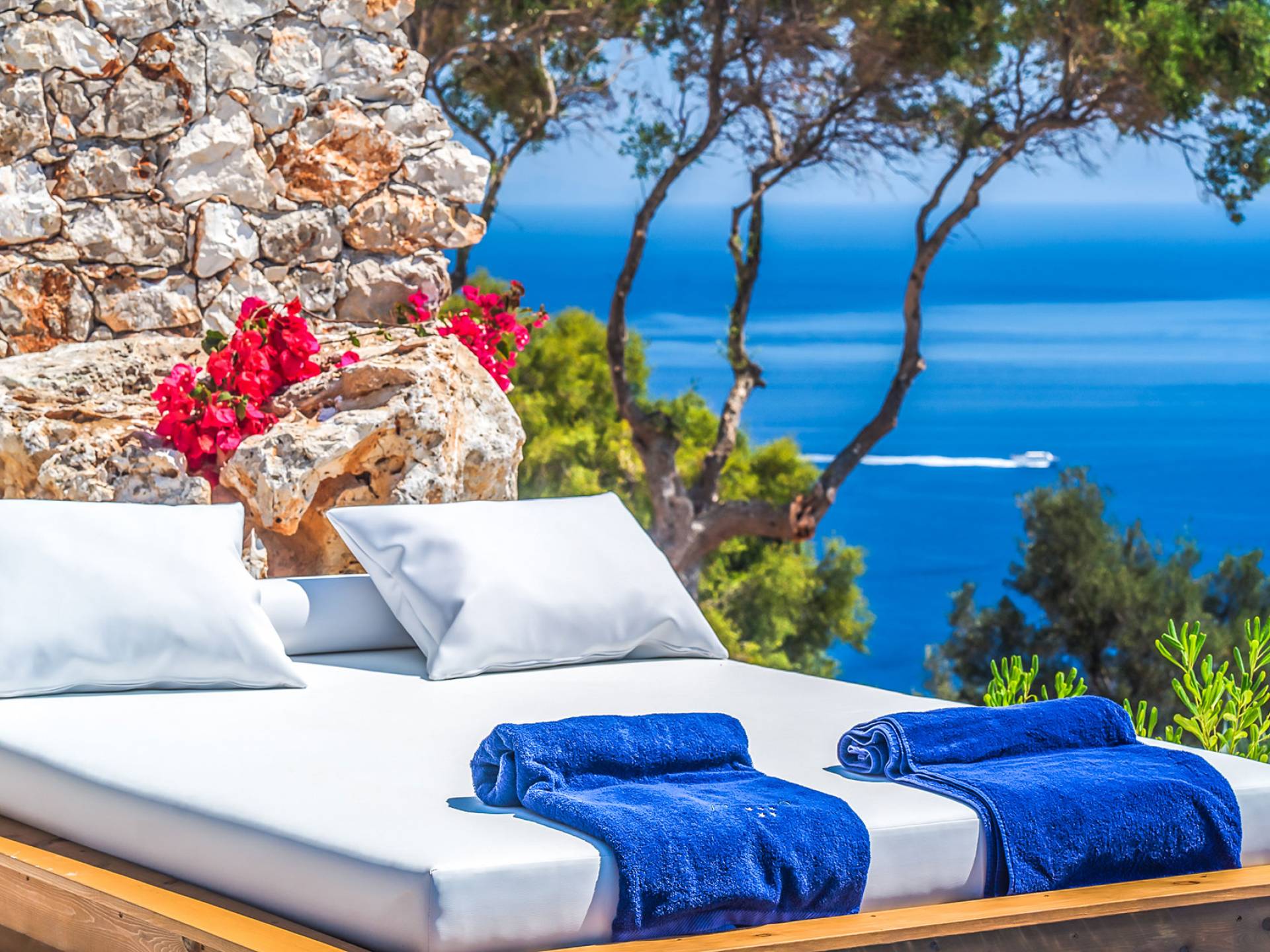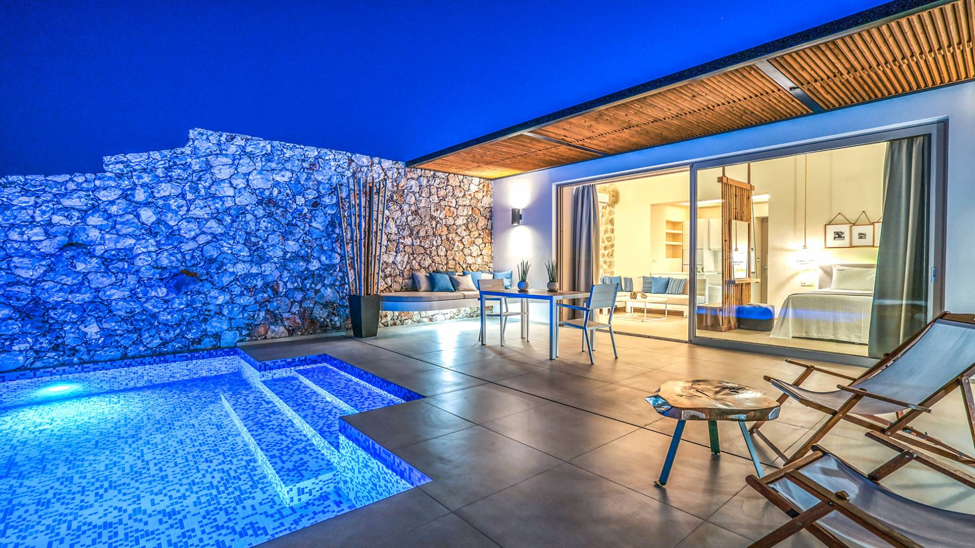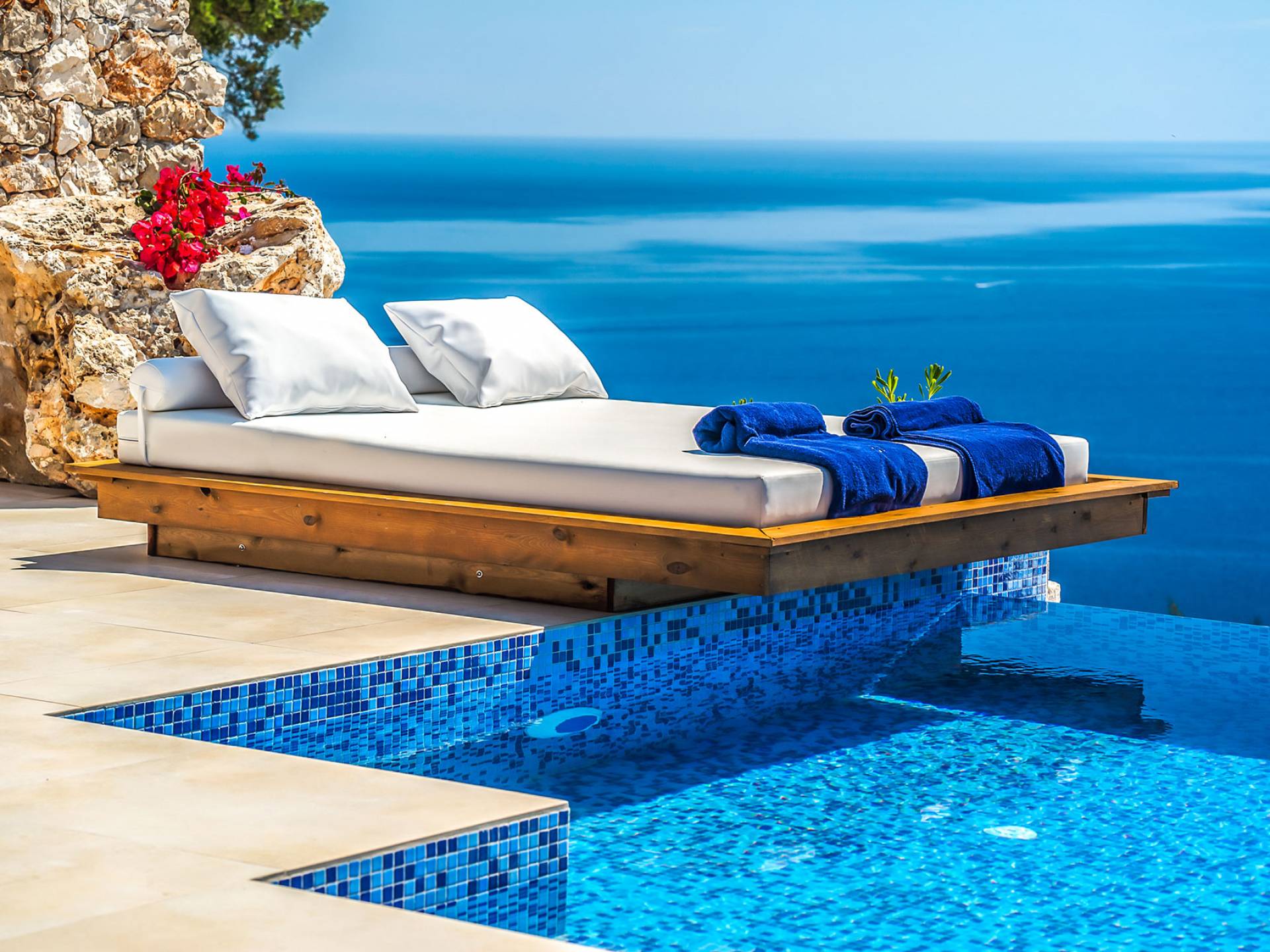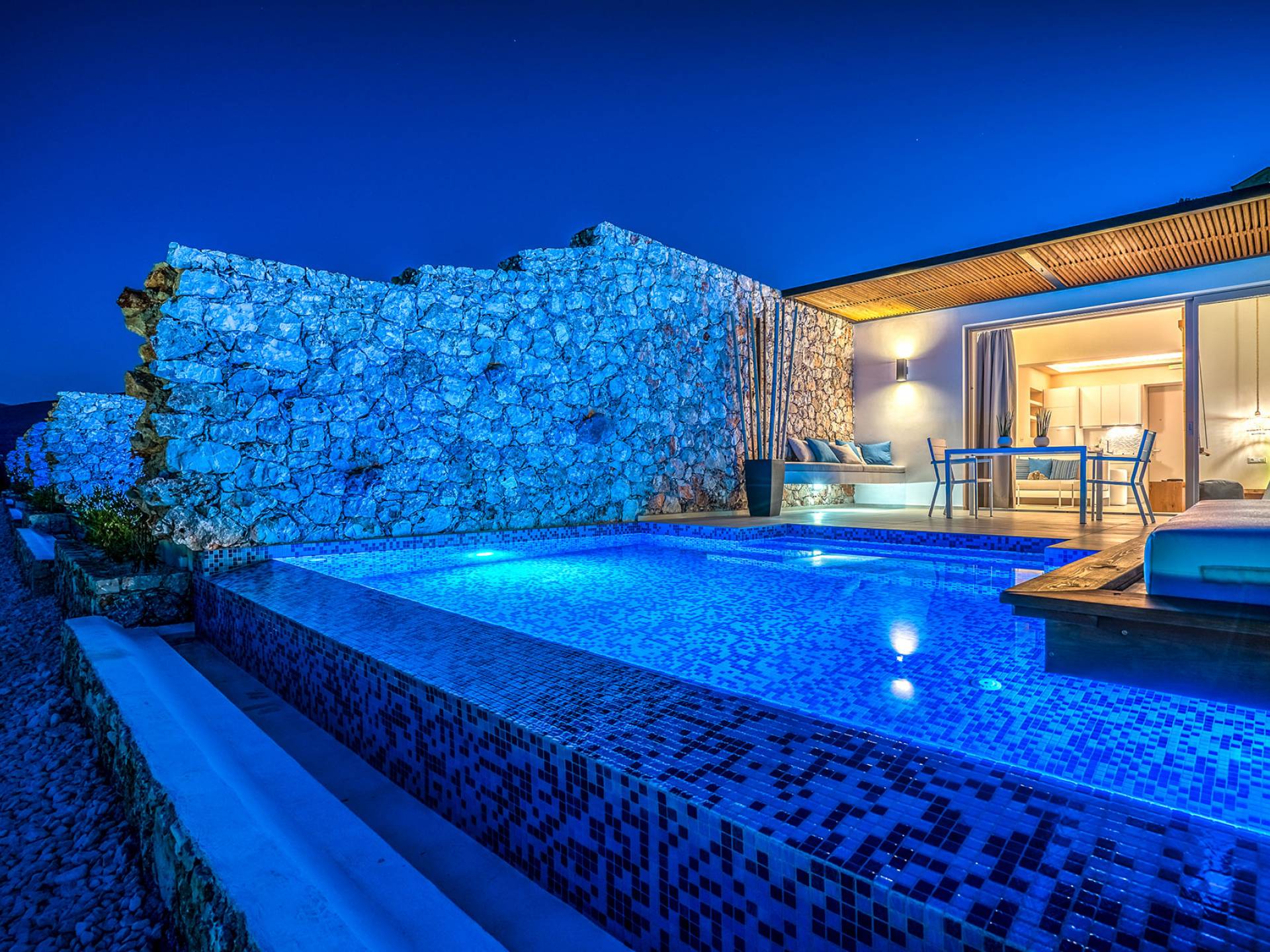 Οι συρόμενες γυάλινες πόρτες από το δάπεδο μέχρι την οροφή επιτρέπουν την ηλιοφάνεια σε όλη τη σουίτα σας και ανοίγουν σε μια ιδιωτική βεράντα με πισίνα υπερχείλισης με θαλασσινό νερό, ξαπλώστρες, σαλόνι και πανοραμική θέα στο Ιόνιο Πέλαγος.