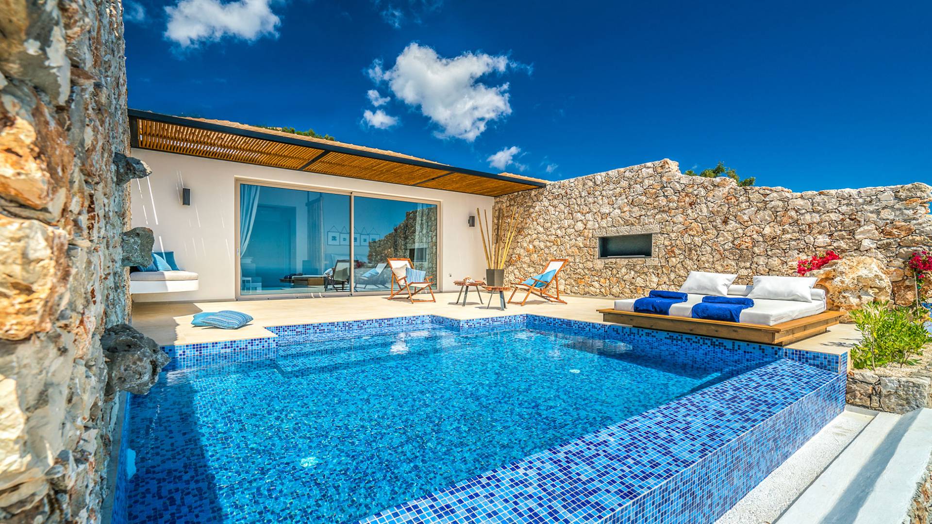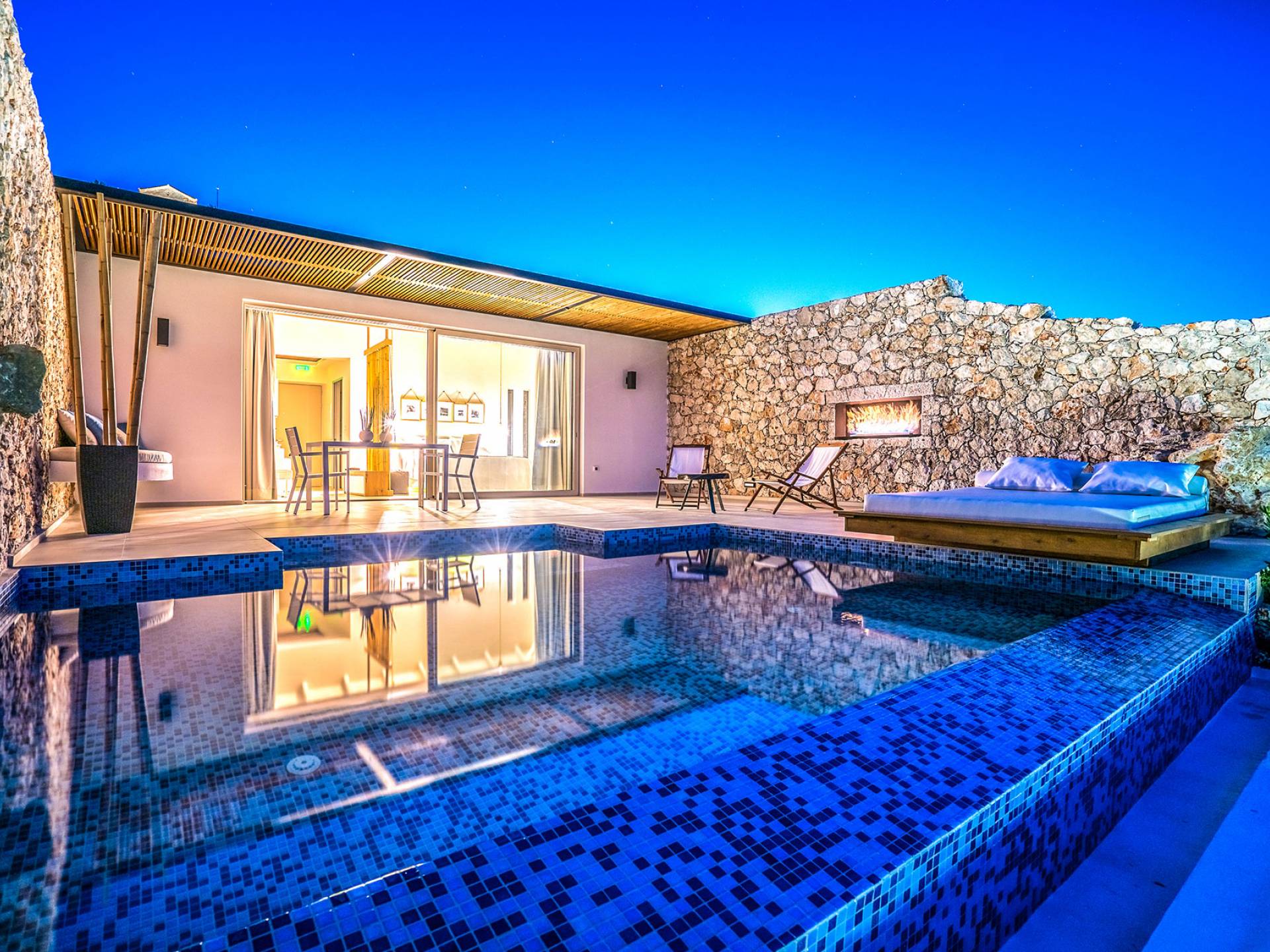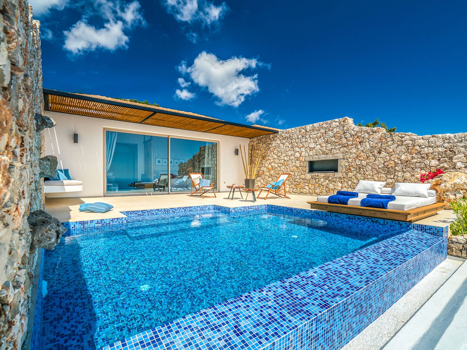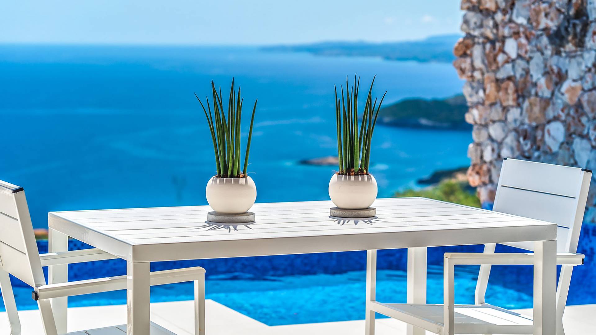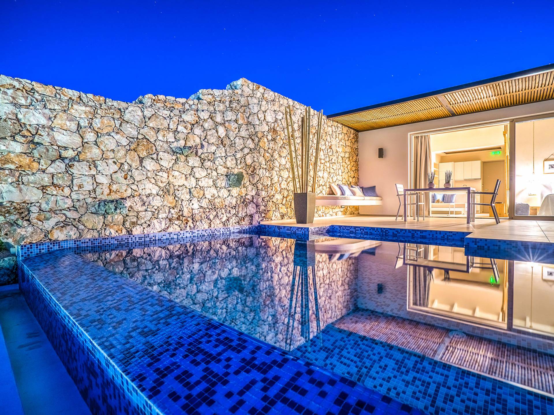 Οι συρόμενες γυάλινες πόρτες από το δάπεδο μέχρι την οροφή επιτρέπουν την ηλιοφάνεια σε όλη τη σουίτα σας και ανοίγουν σε μια ιδιωτική βεράντα με πισίνα υπερχείλισης με θαλασσινό νερό, ξαπλώστρες, σαλόνι και πανοραμική θέα στο Ιόνιο Πέλαγος.