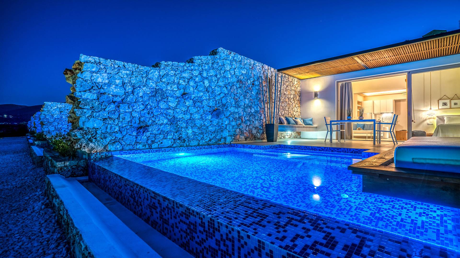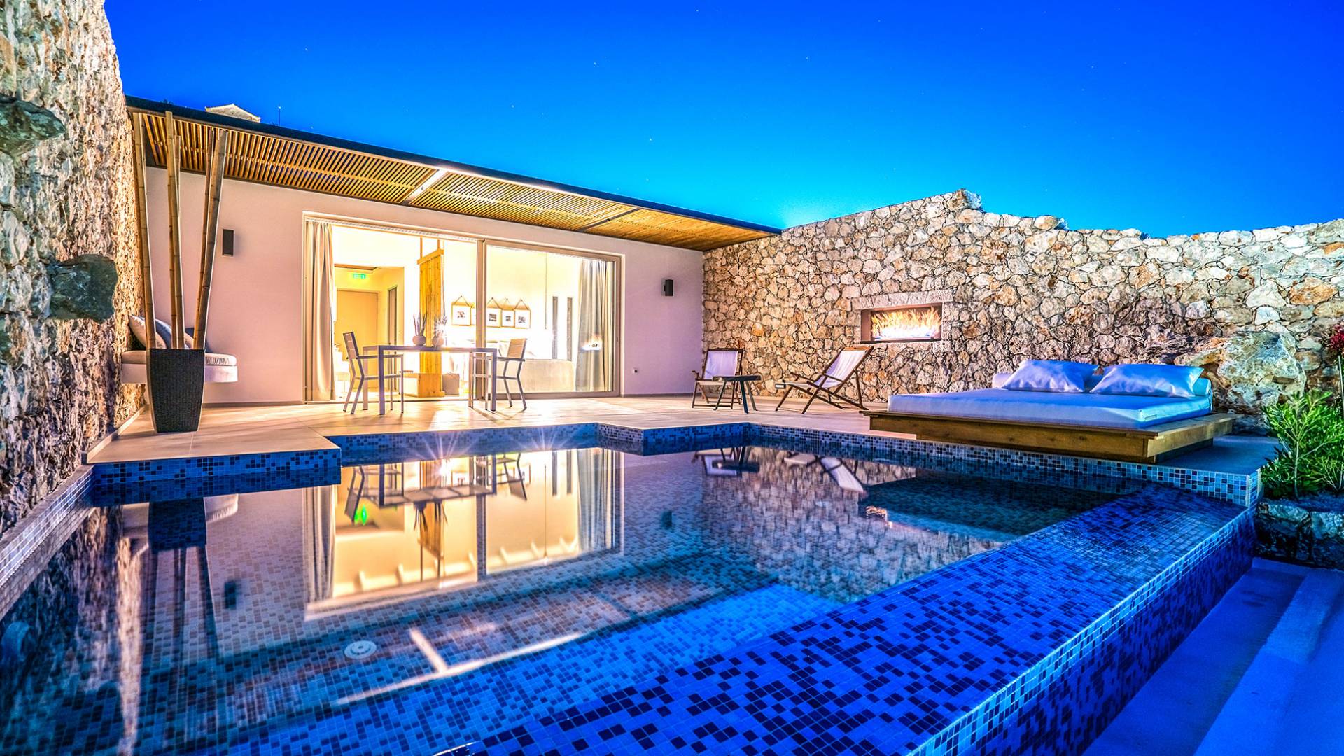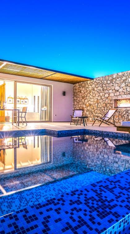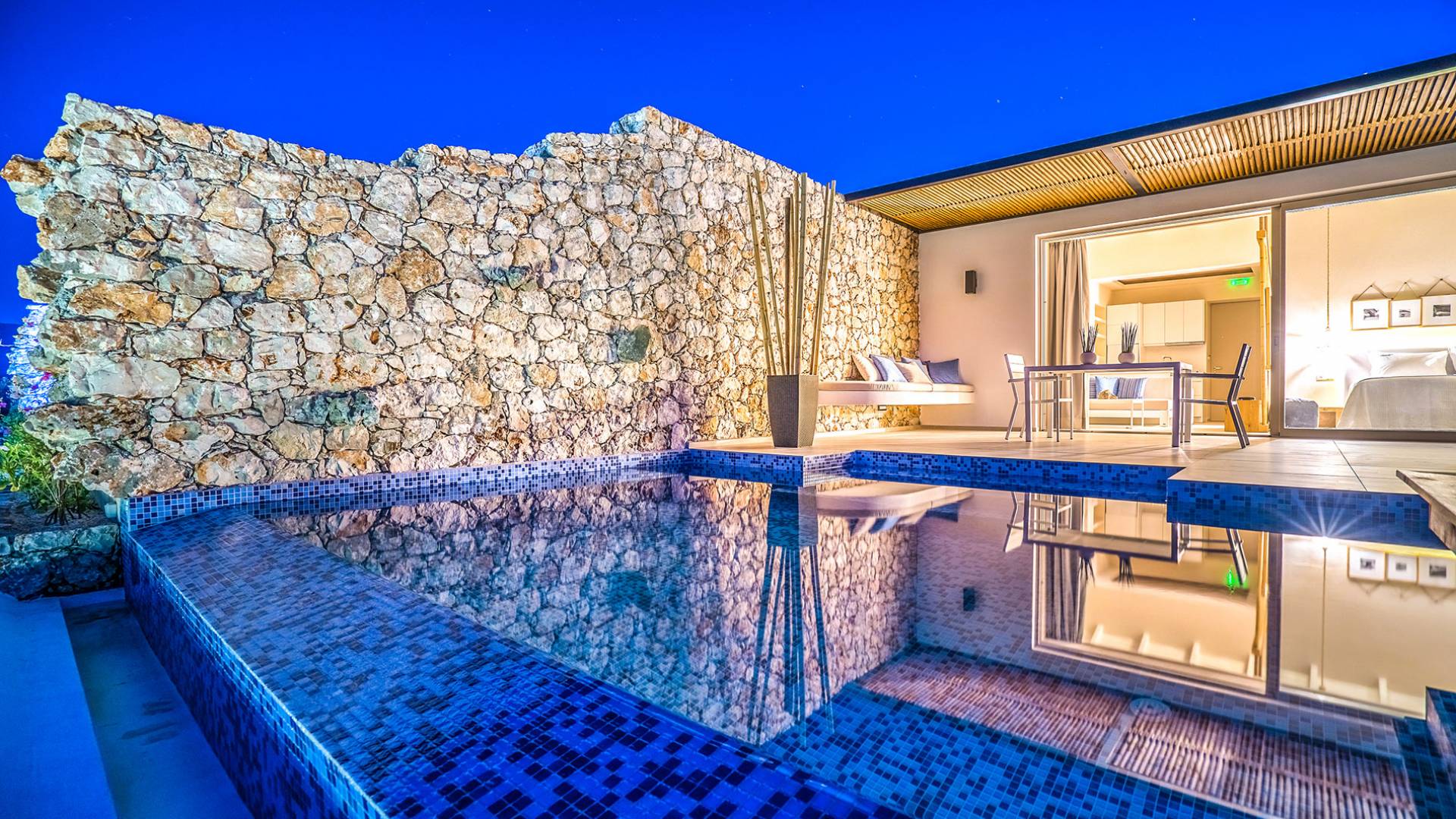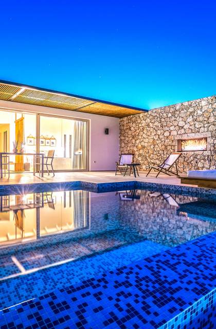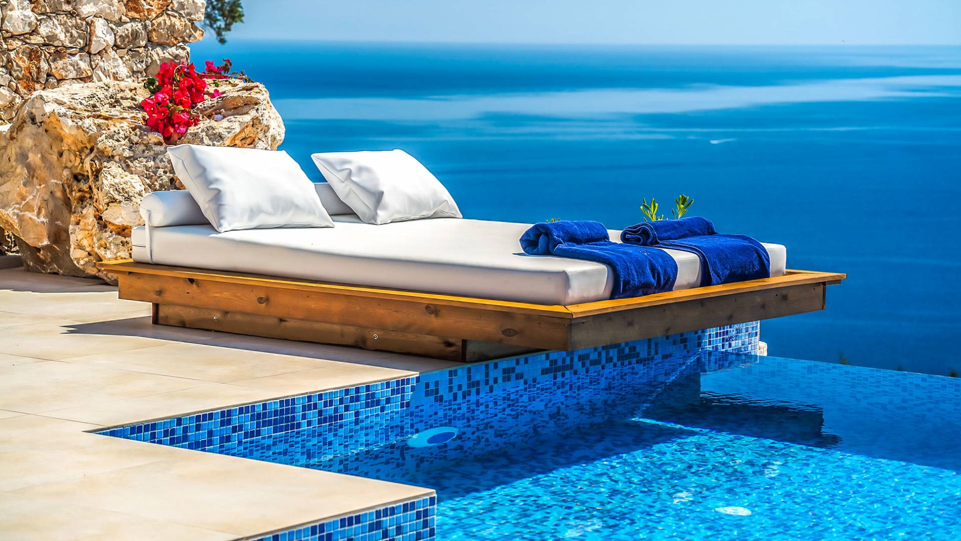Οι συρόμενες γυάλινες πόρτες από το δάπεδο μέχρι την οροφή επιτρέπουν την ηλιοφάνεια σε όλη τη σουίτα σας και ανοίγουν σε μια ιδιωτική βεράντα με πισίνα υπερχείλισης με θαλασσινό νερό, ξαπλώστρες, σαλόνι και πανοραμική θέα στο Ιόνιο Πέλαγος.