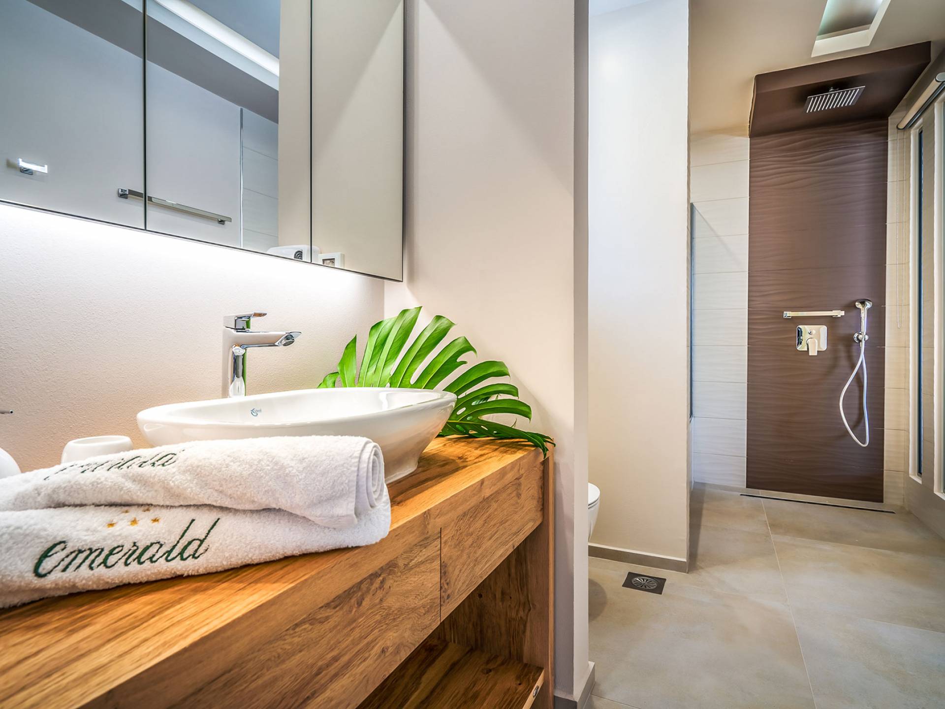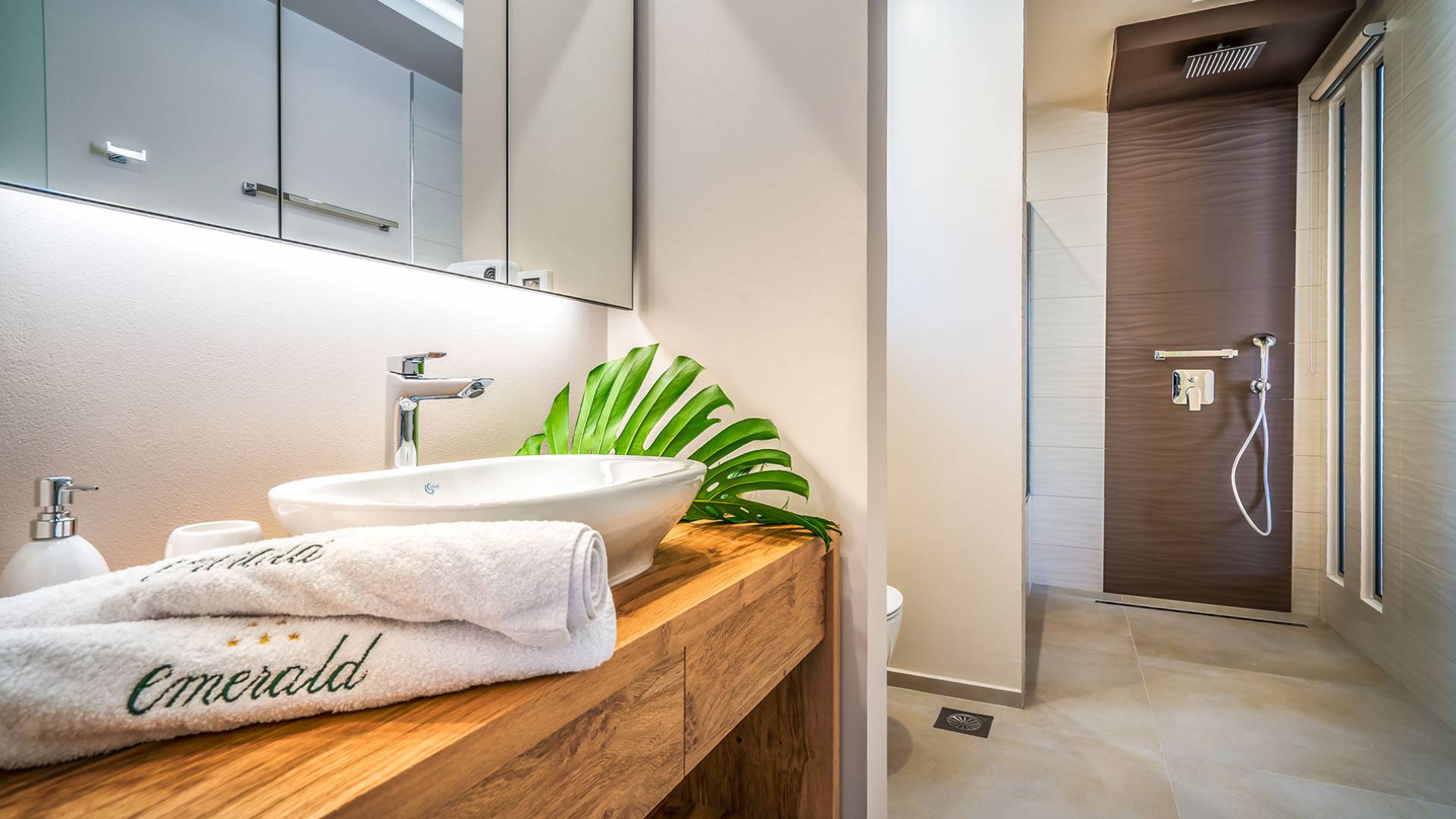 Κάθε Emerald Σουίτα προσφέρει ευρύχωρο σαλόνι με πλήρως εξοπλισμένη μικρή κουζίνα και τραπεζαρία, υπνοδωμάτιο με ενιαία διαρρύθμιση με κρεβάτι king size και άνετο μπάνιο με μπανιέρα και ξεχωριστή καμπίνα ντους.