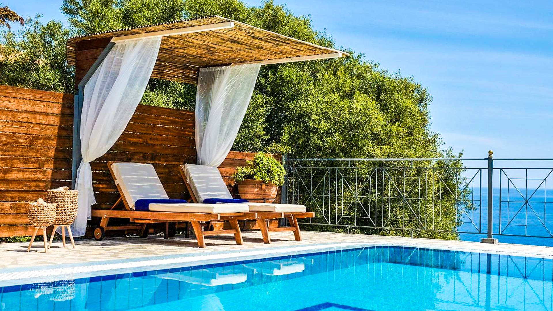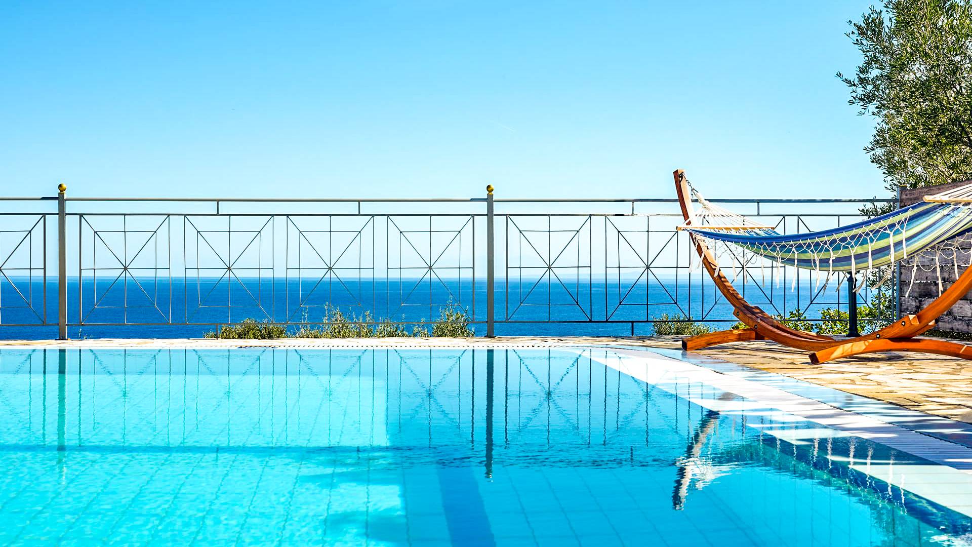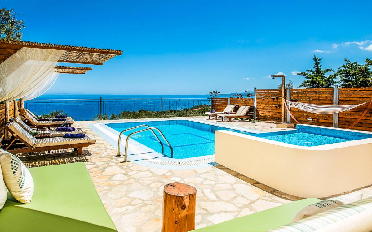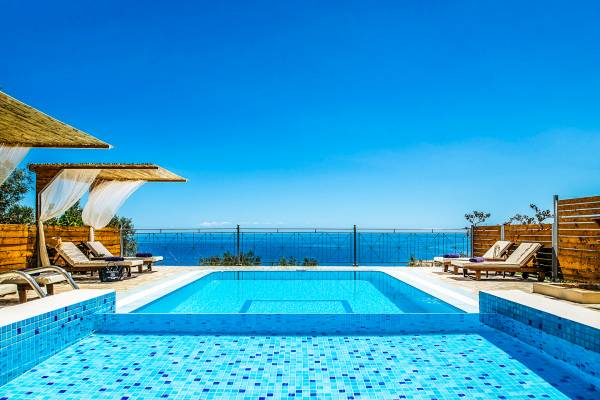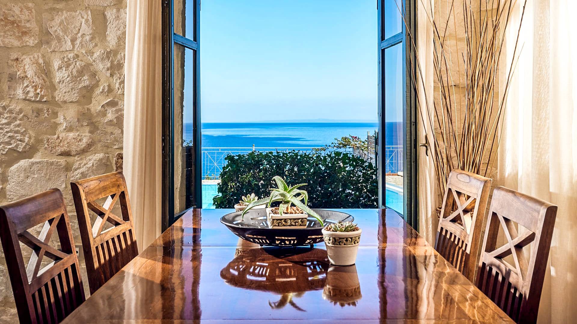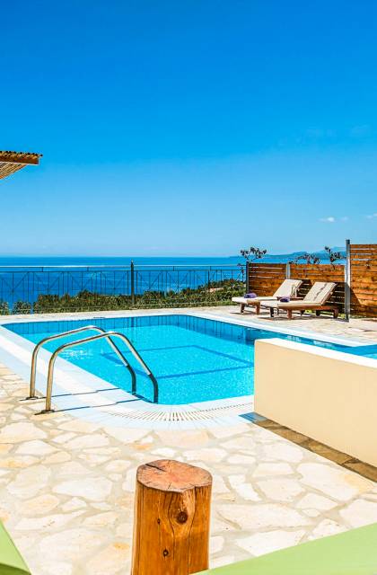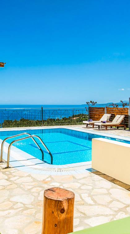 Outside, a private fenced area offers a swimming pool and lounge space, perfect for unwinding while taking in the breathtaking panoramic views of the Ionian Sea.