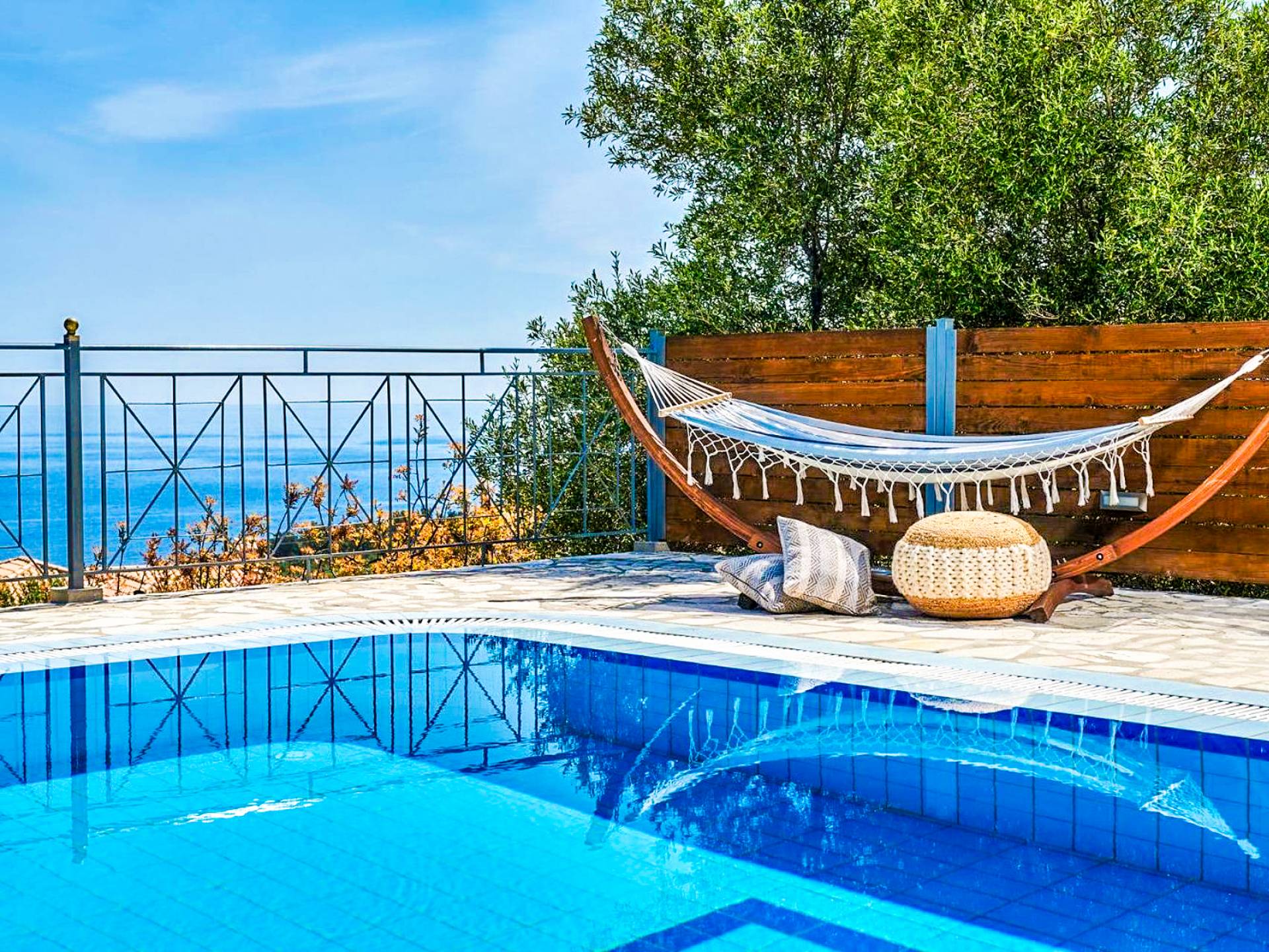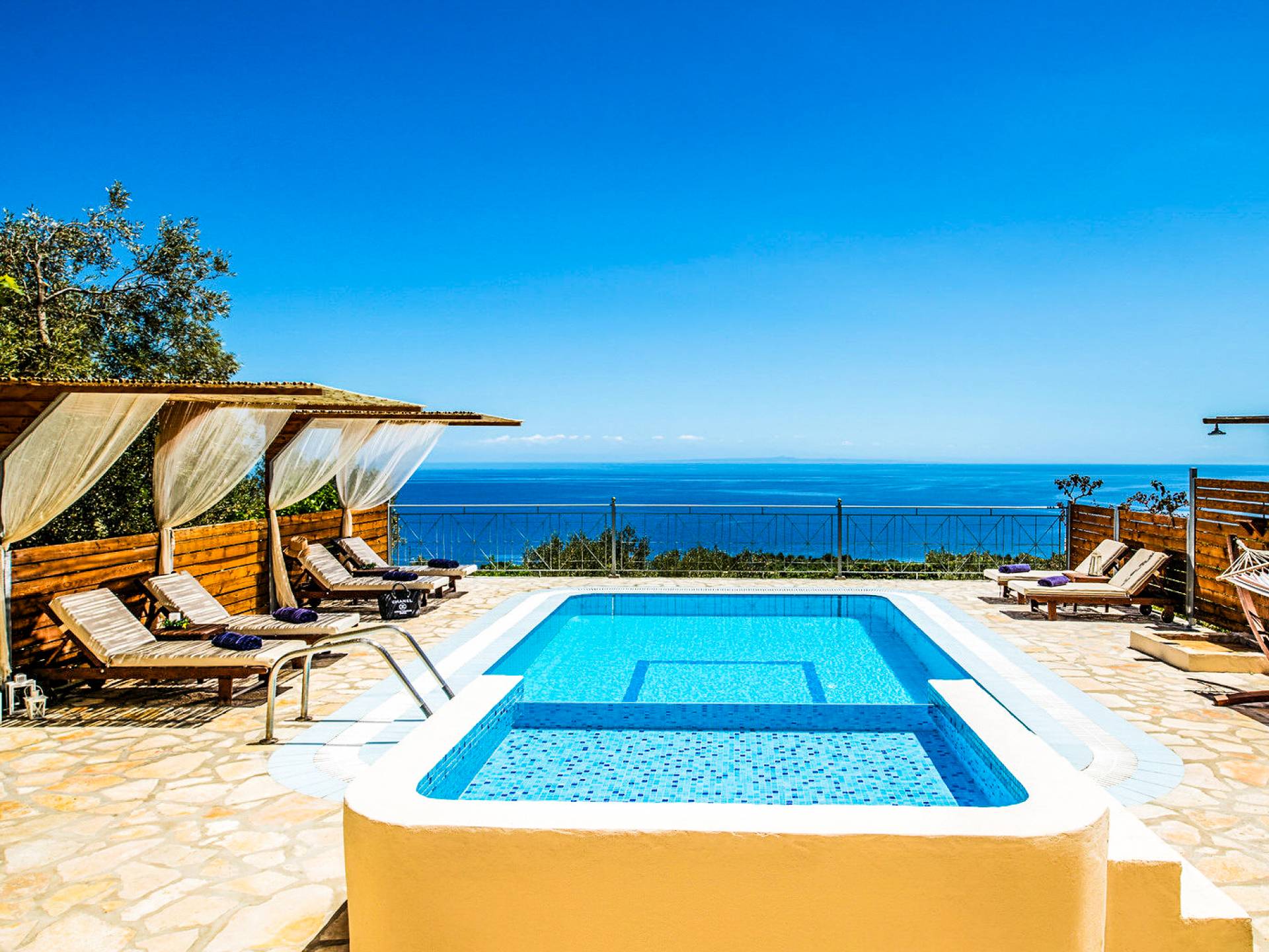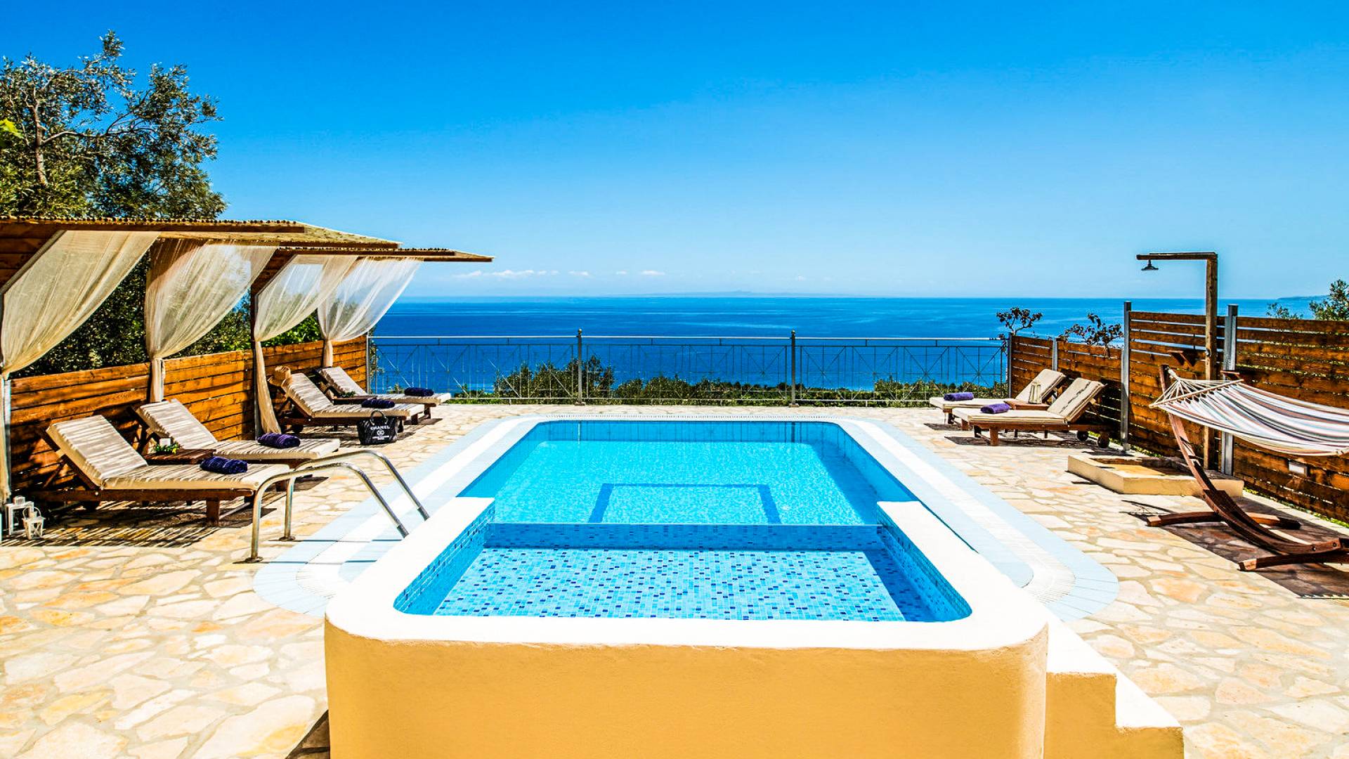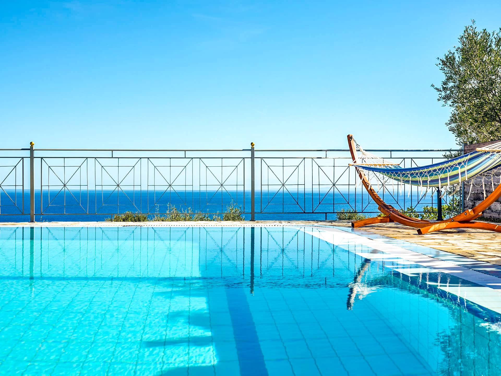 Outside, a private fenced area offers a swimming pool and lounge space, perfect for unwinding while taking in the breathtaking panoramic views of the Ionian Sea.