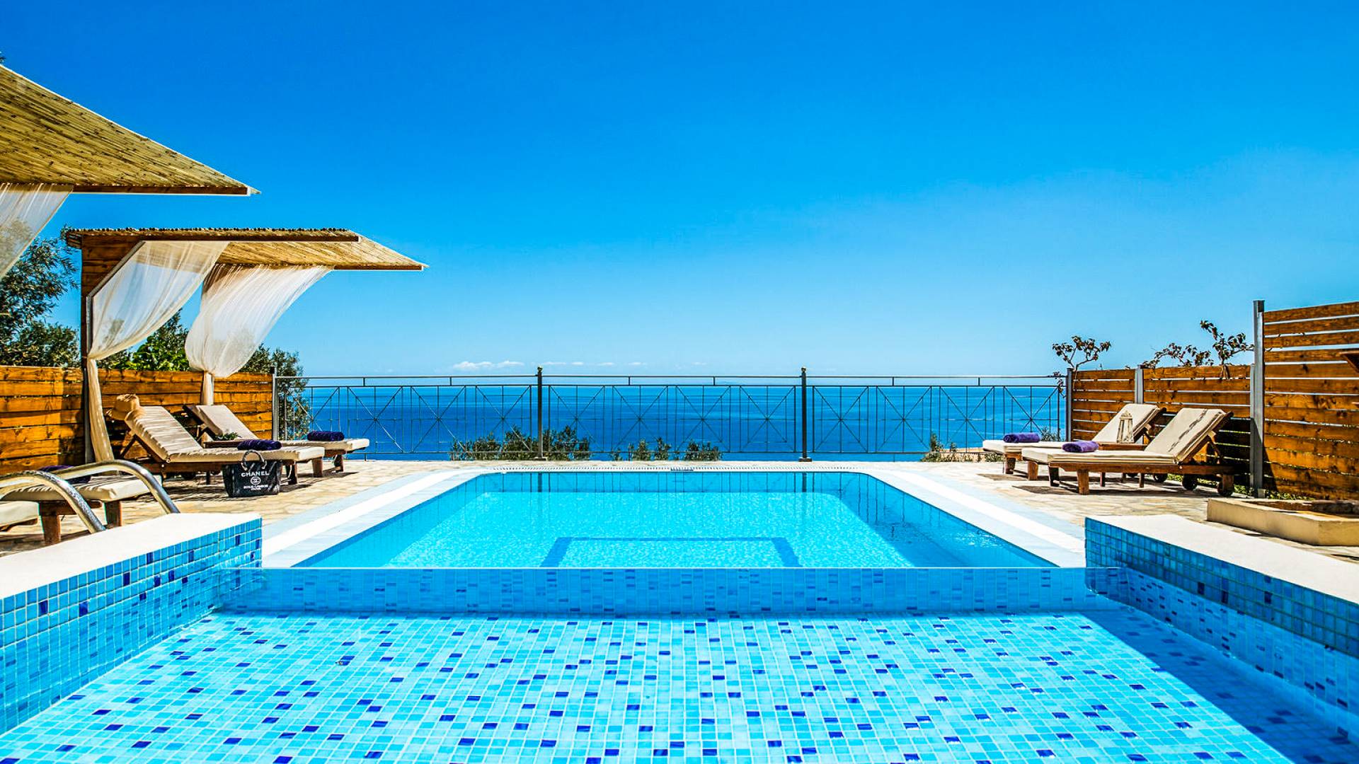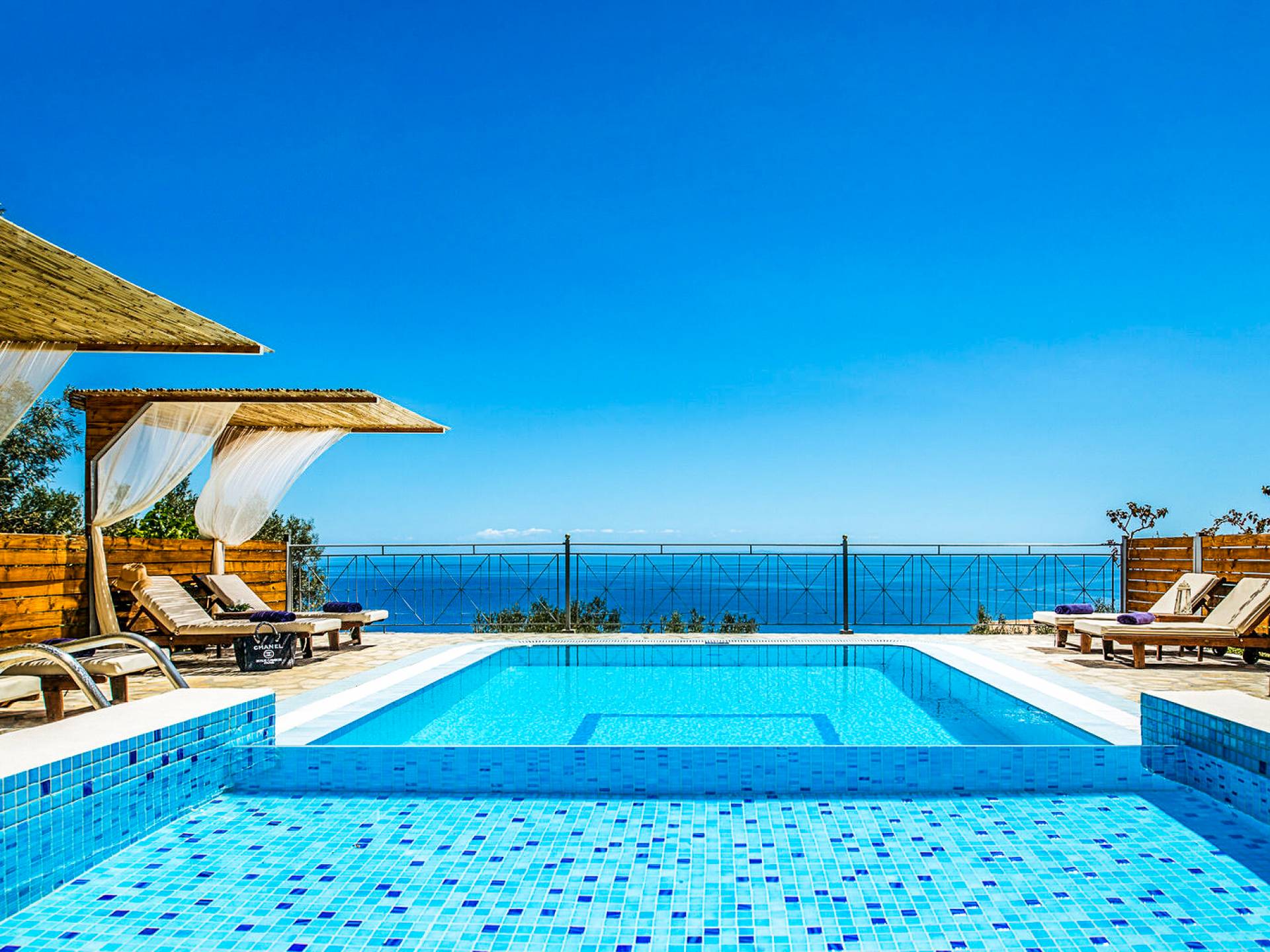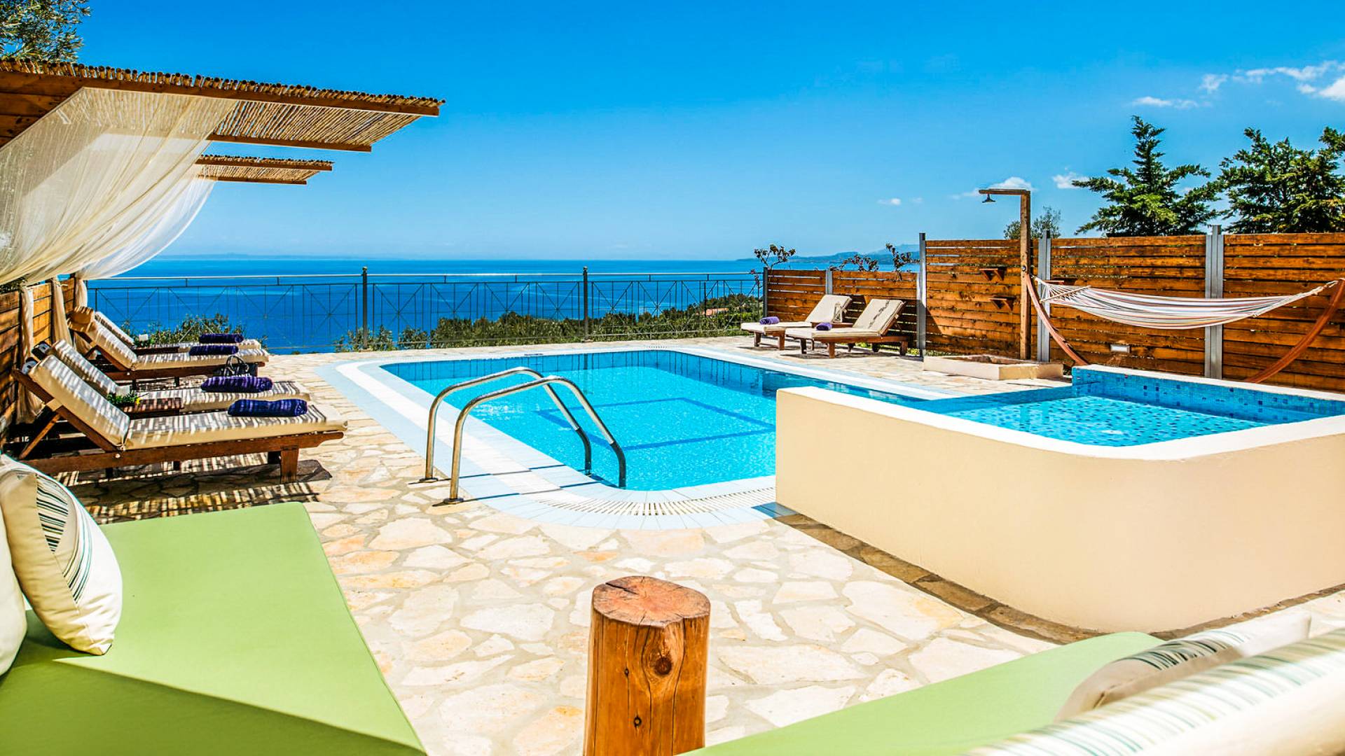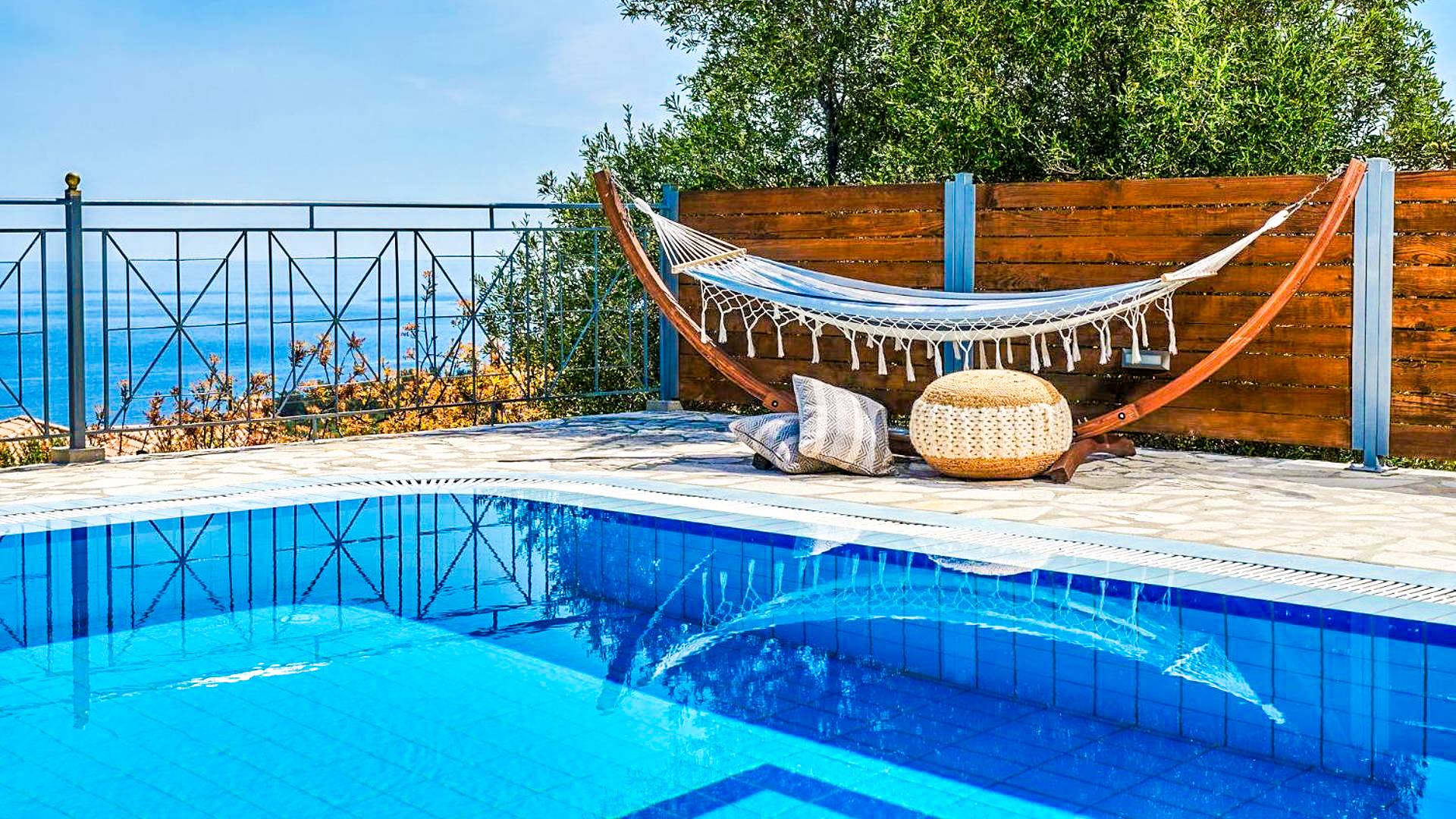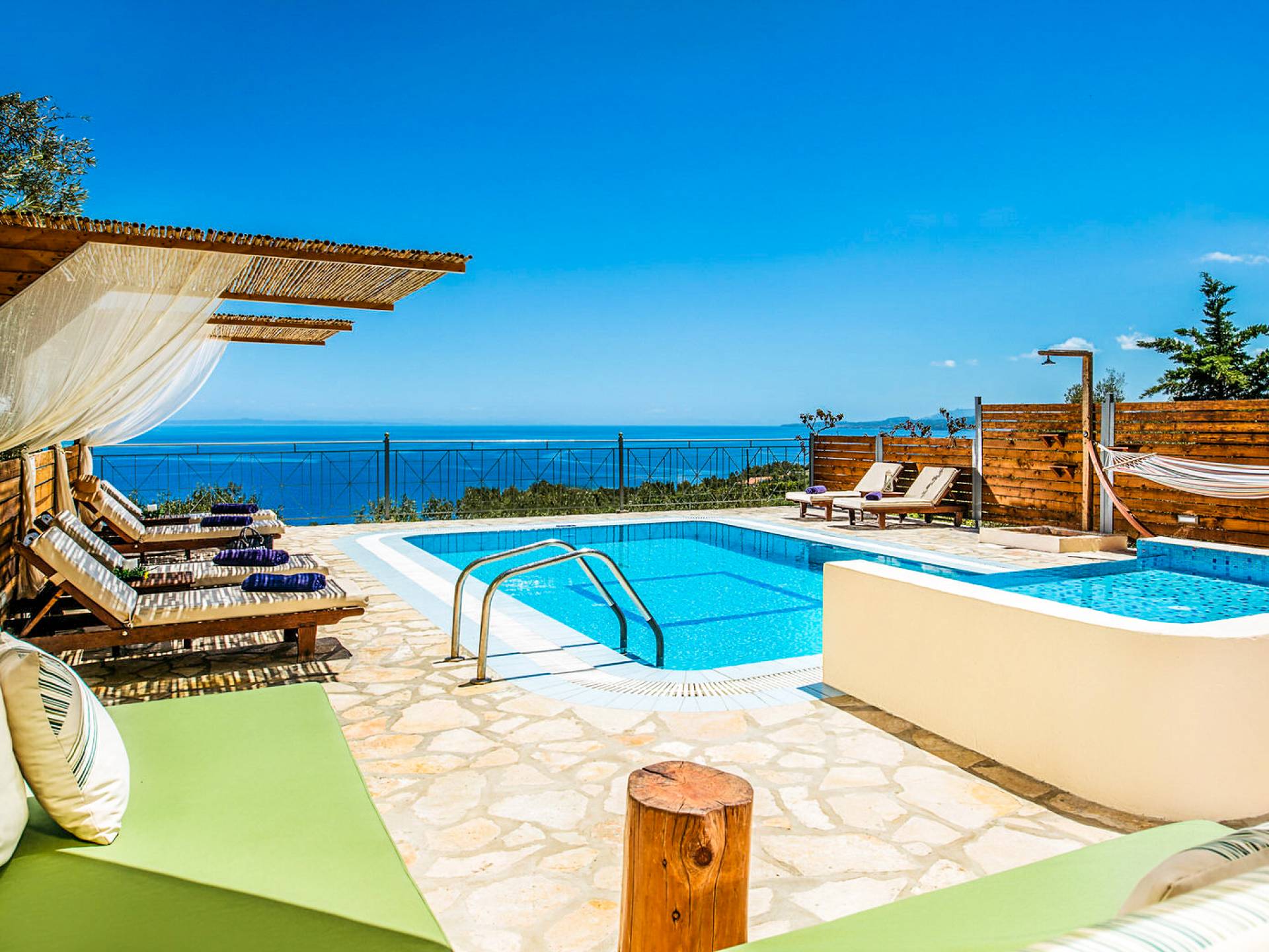 Outside, a private fenced area offers a swimming pool and lounge space, perfect for unwinding while taking in the breathtaking panoramic views of the Ionian Sea.