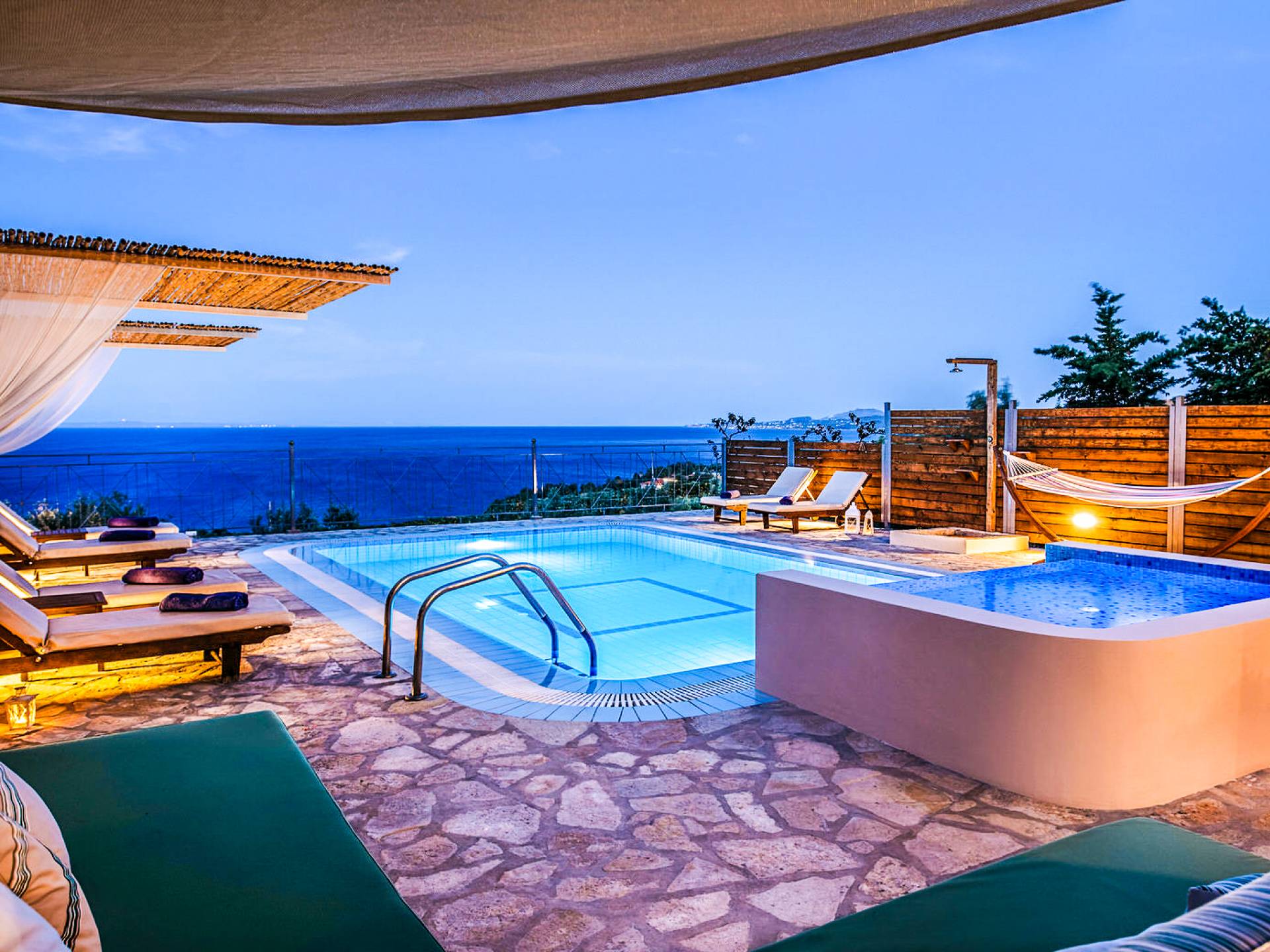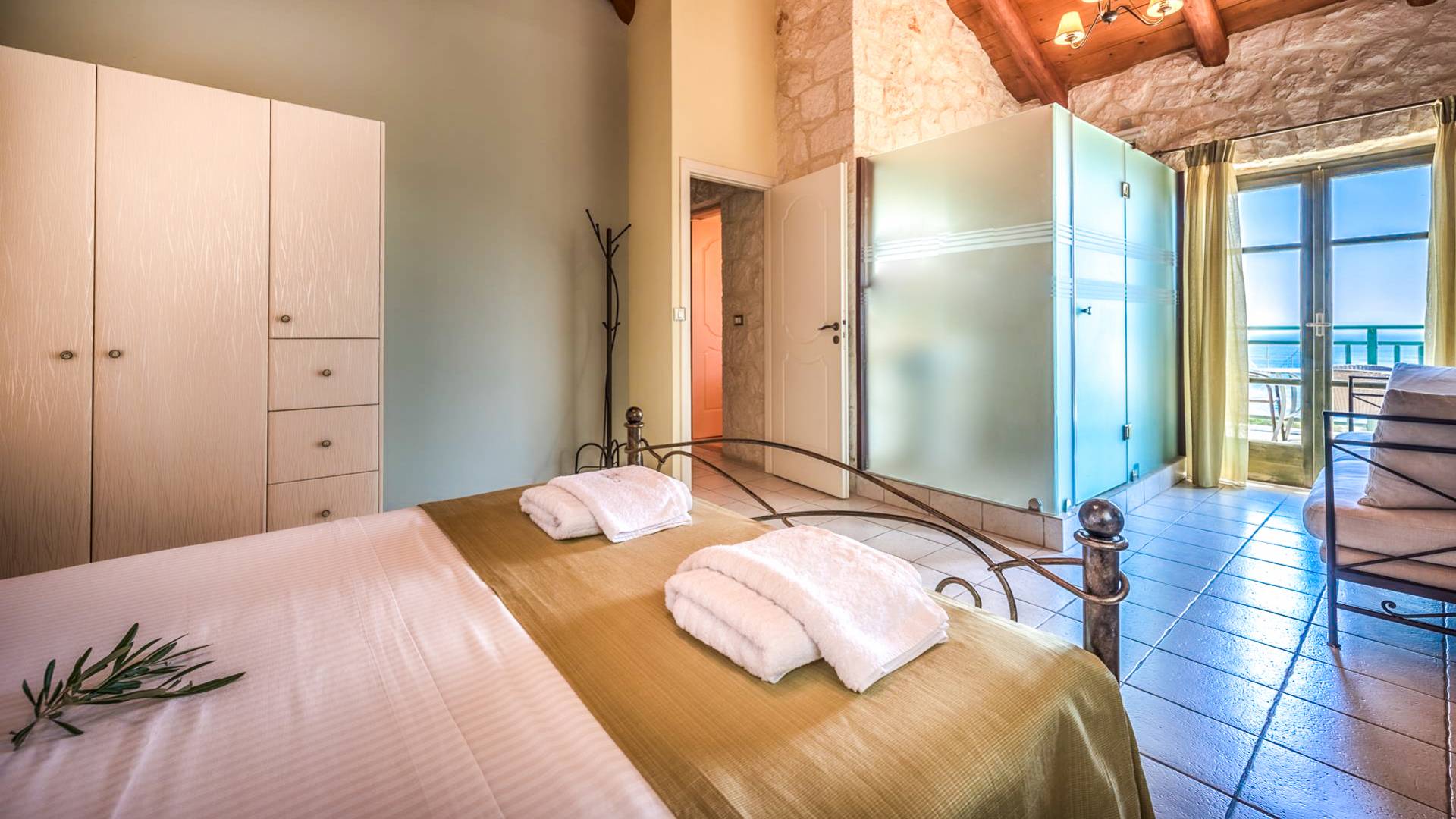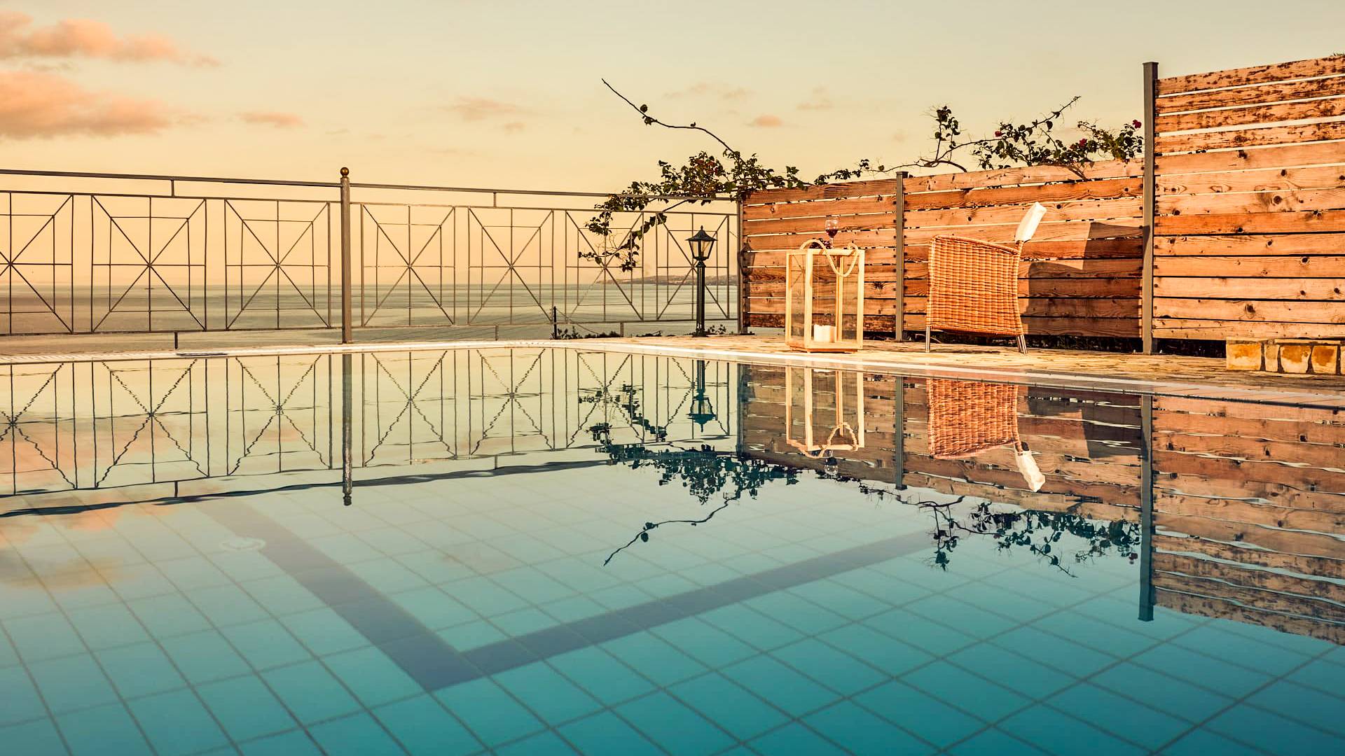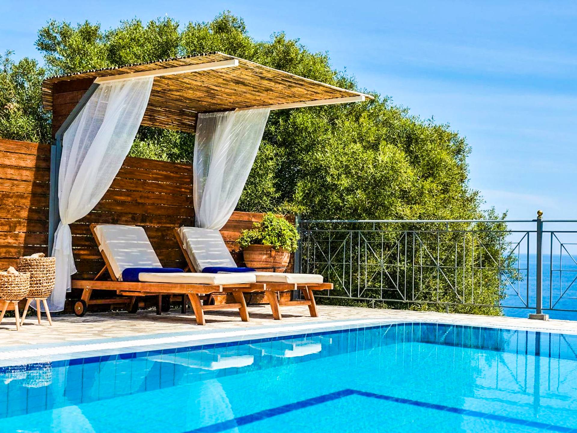 Outside, a private fenced area offers a swimming pool and lounge space, perfect for unwinding while taking in the breathtaking panoramic views of the Ionian Sea.
