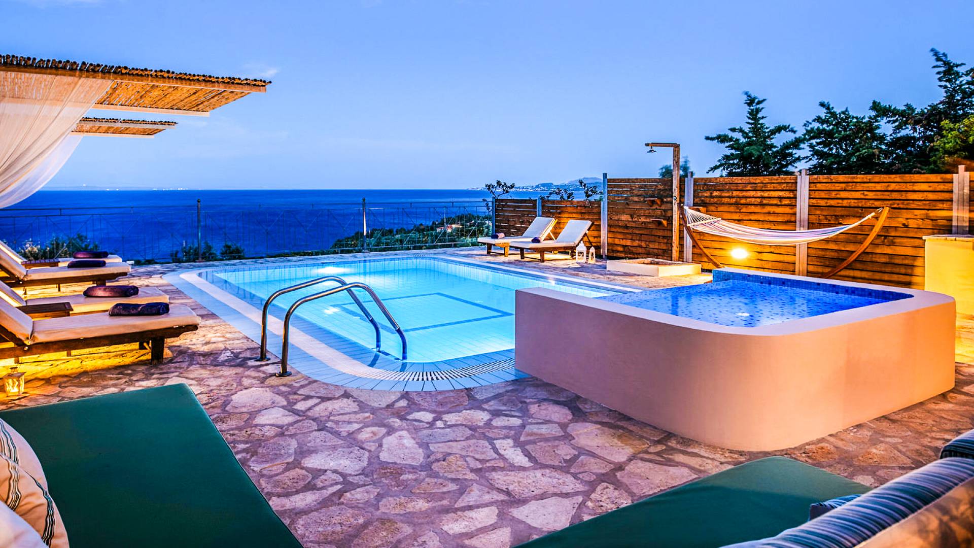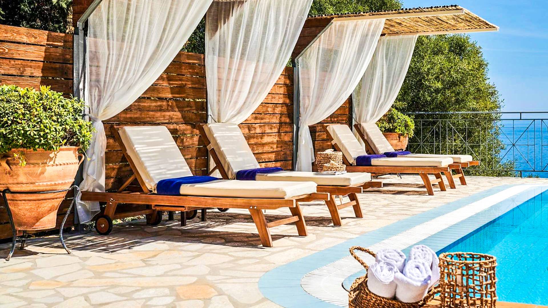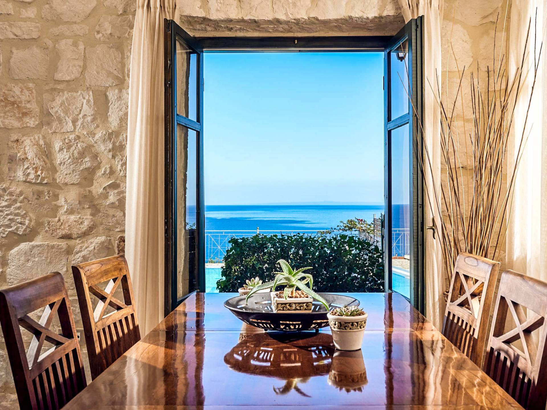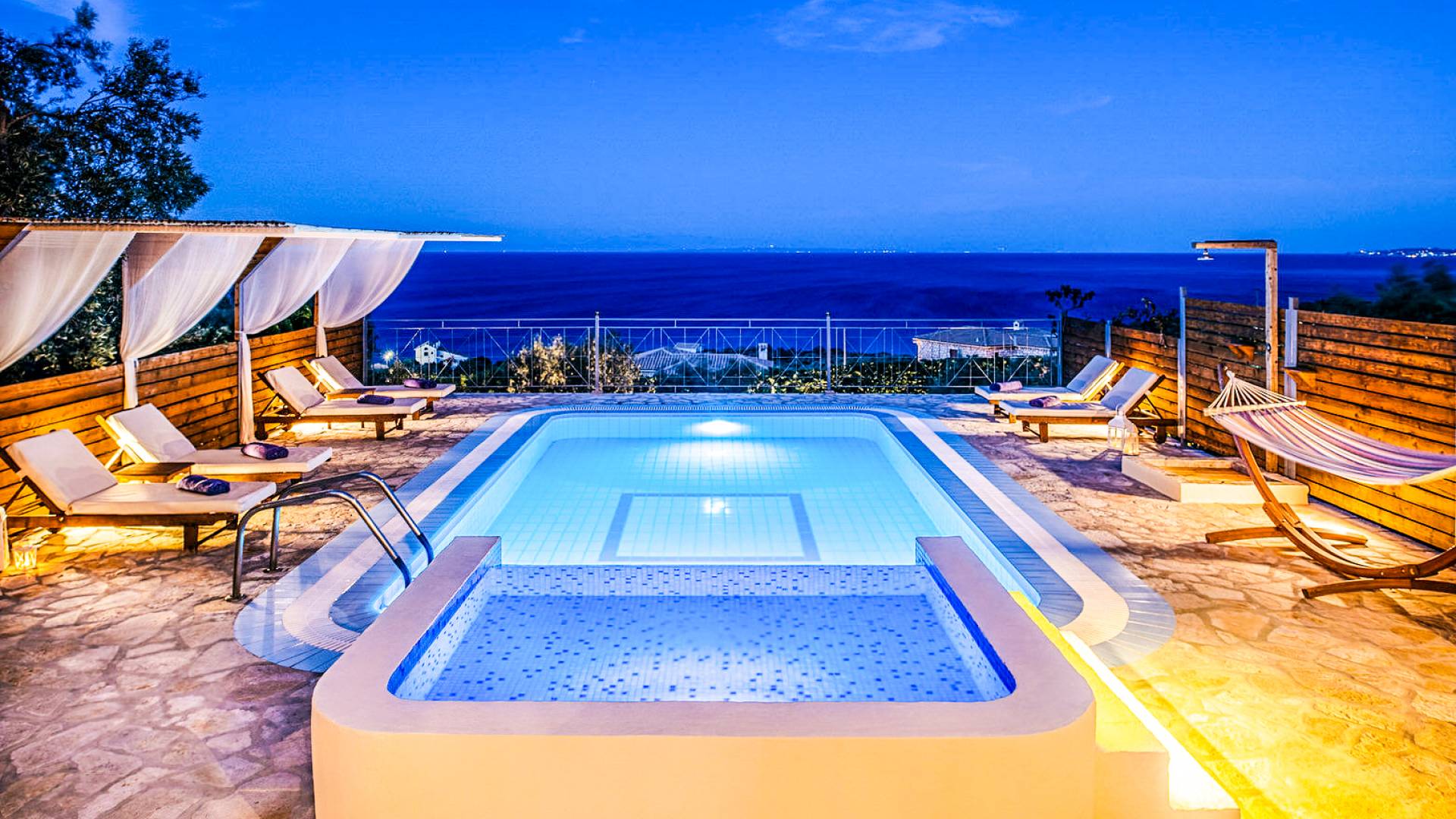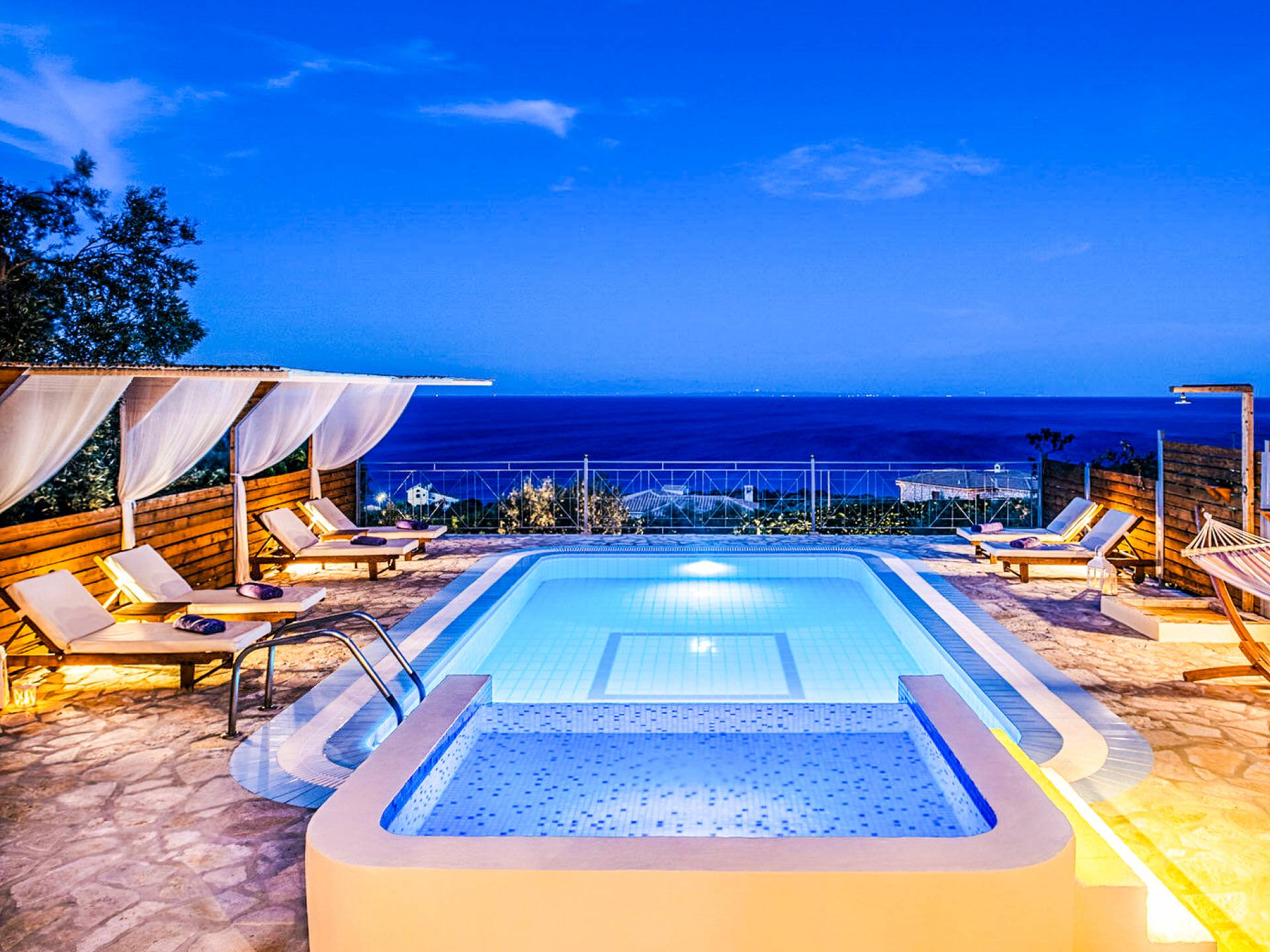 Outside, a private fenced area offers a swimming pool and lounge space, perfect for unwinding while taking in the breathtaking panoramic views of the Ionian Sea.
