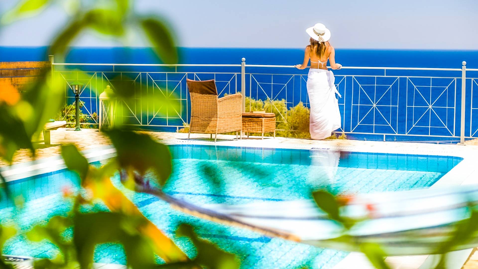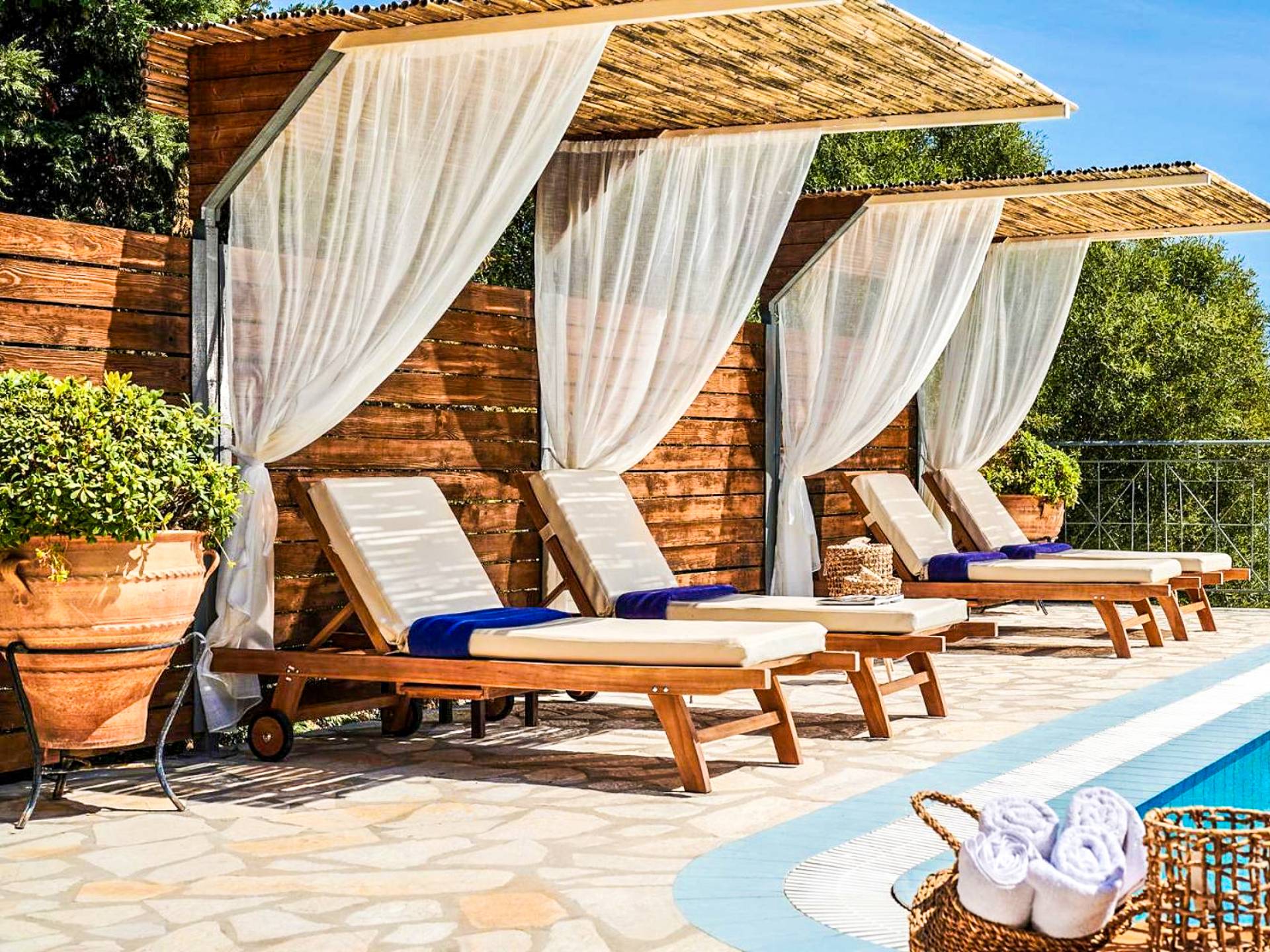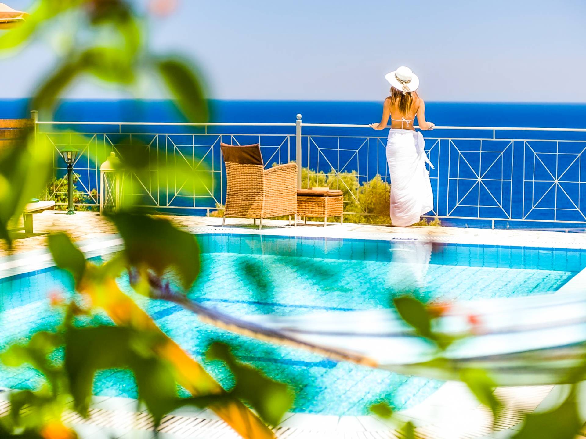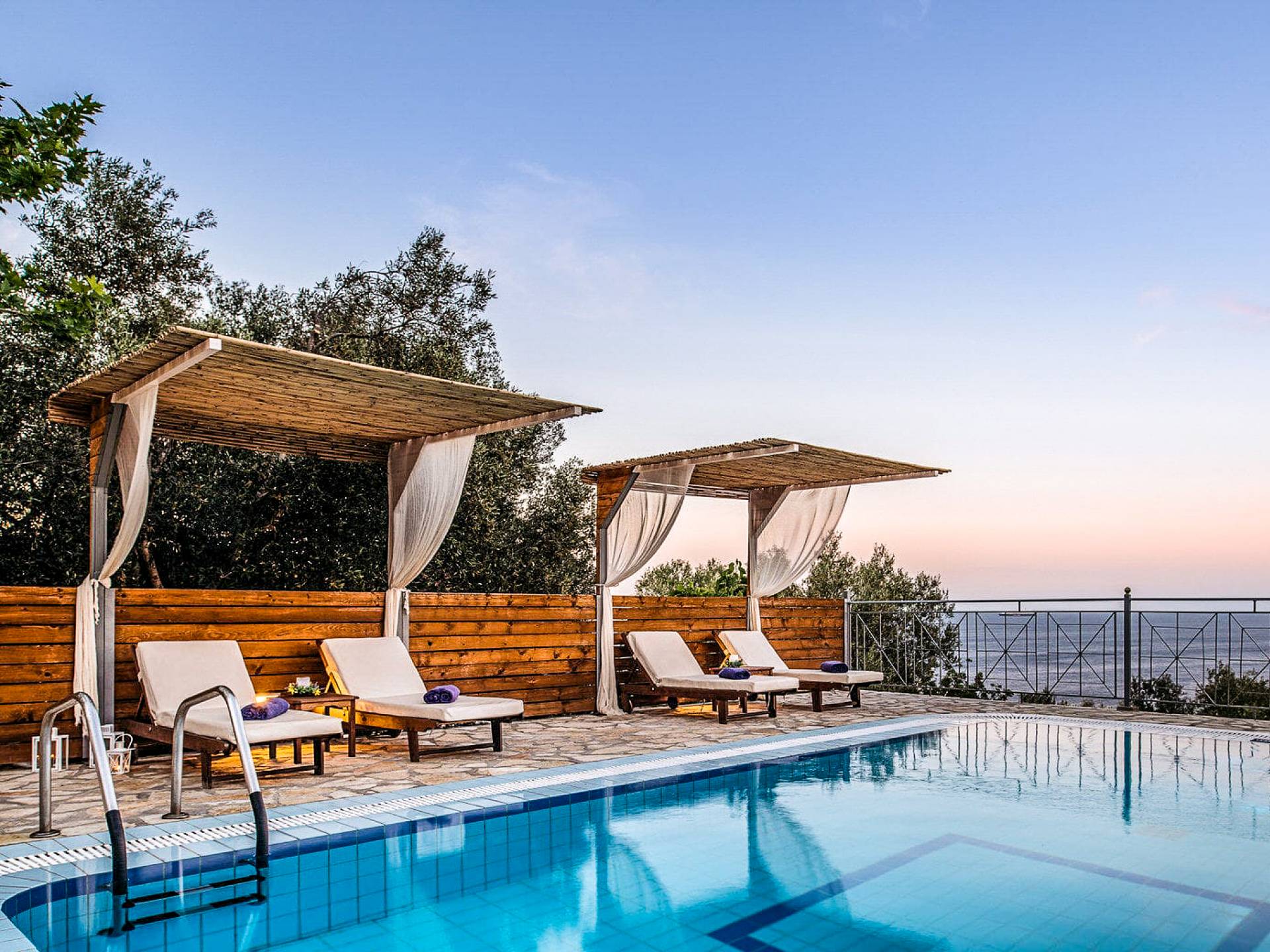 Outside, a private fenced area offers a swimming pool and lounge space, perfect for unwinding while taking in the breathtaking panoramic views of the Ionian Sea.